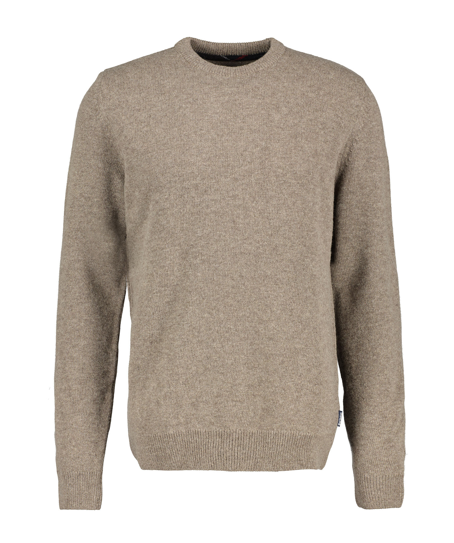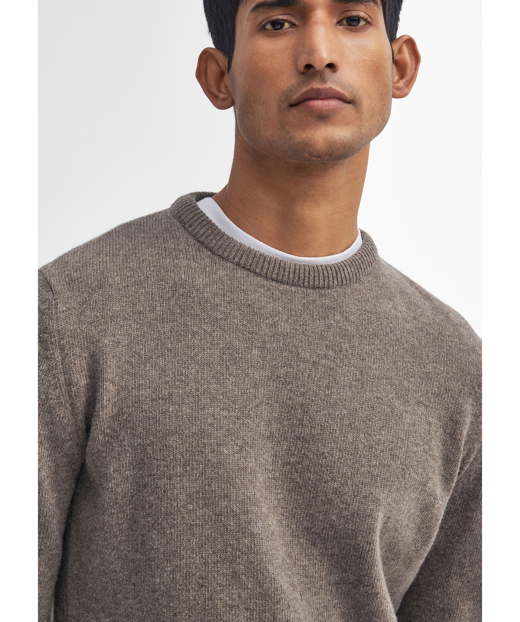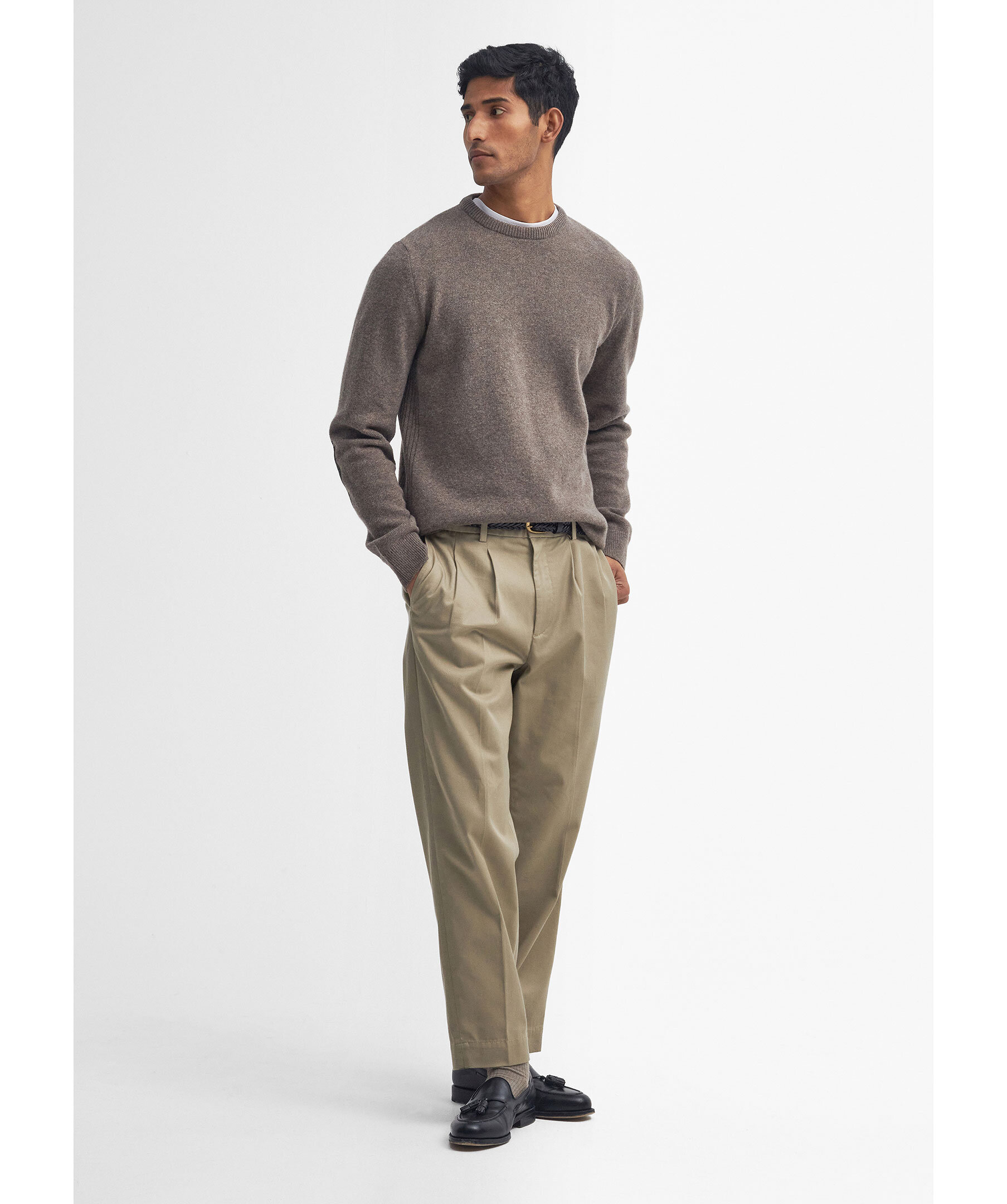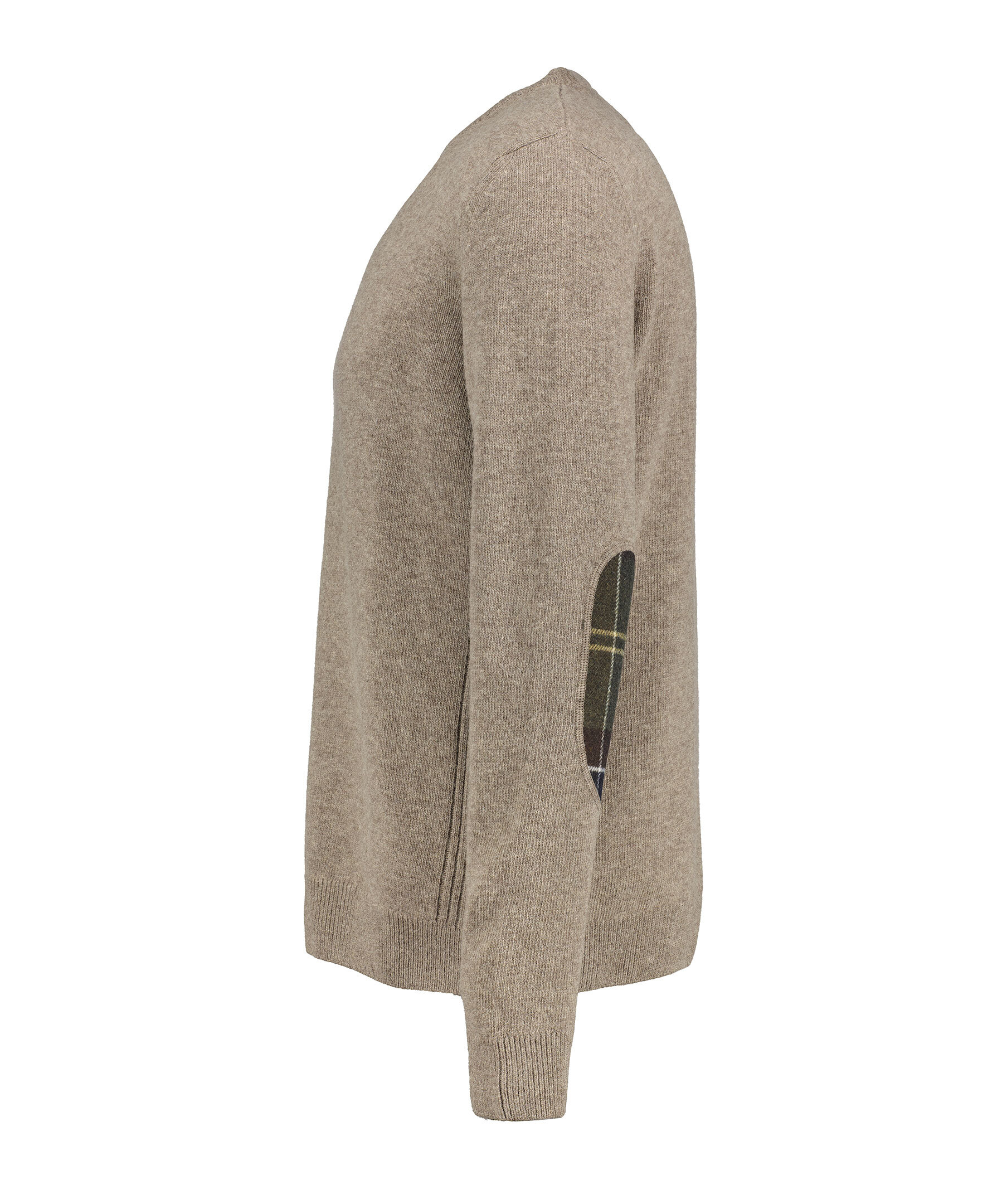Grönbrun, stickad tröja från Barbour. Tröjan har ribbstickad och rundad halsringning samt ribbstickade muddar vid ärm- och plaggslut. Tygpatch vid armbåge. Tillverkad i en ullblandning.