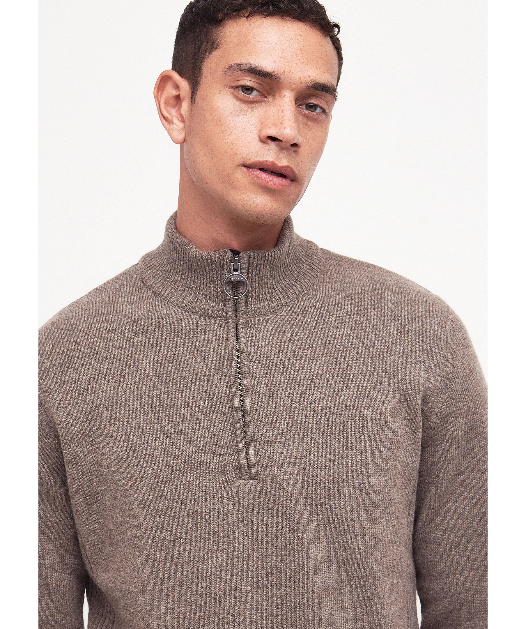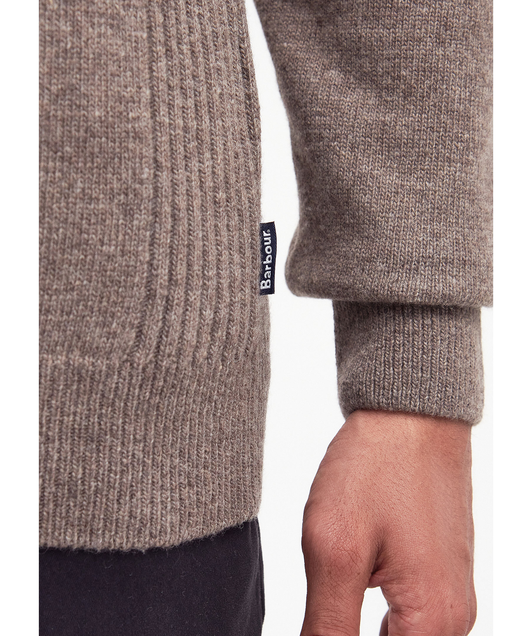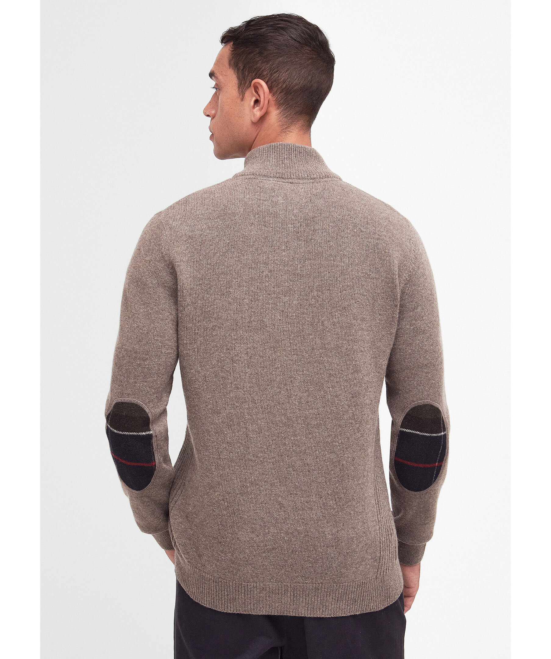 Beige stickad half-zip tröja från Barbour. Tröjan har en hög krage med dragkedja, stretchiga muddar vid ärm och plaggslut. Tygpatch vid armbåge. Tillverkad i 100% ull.