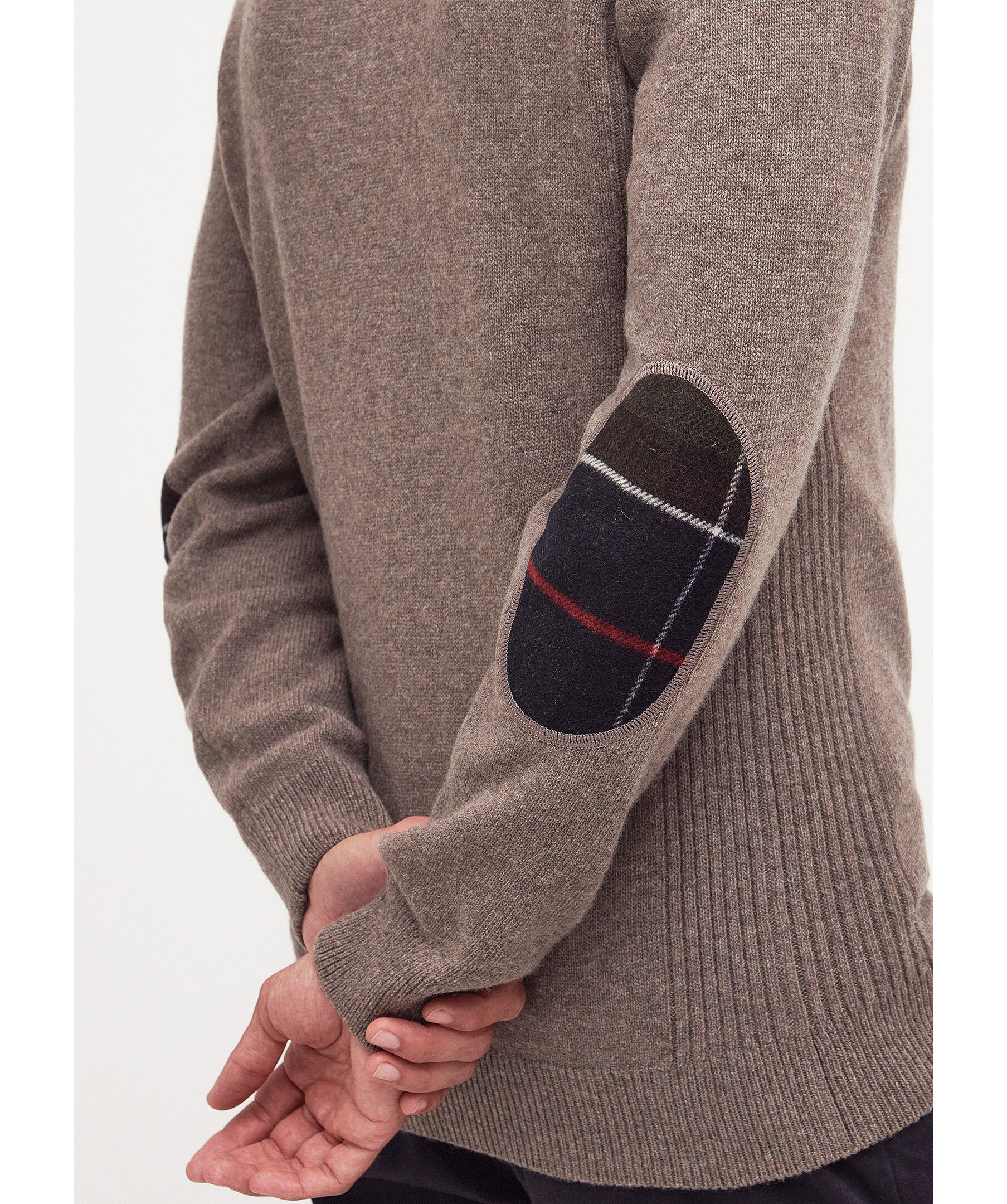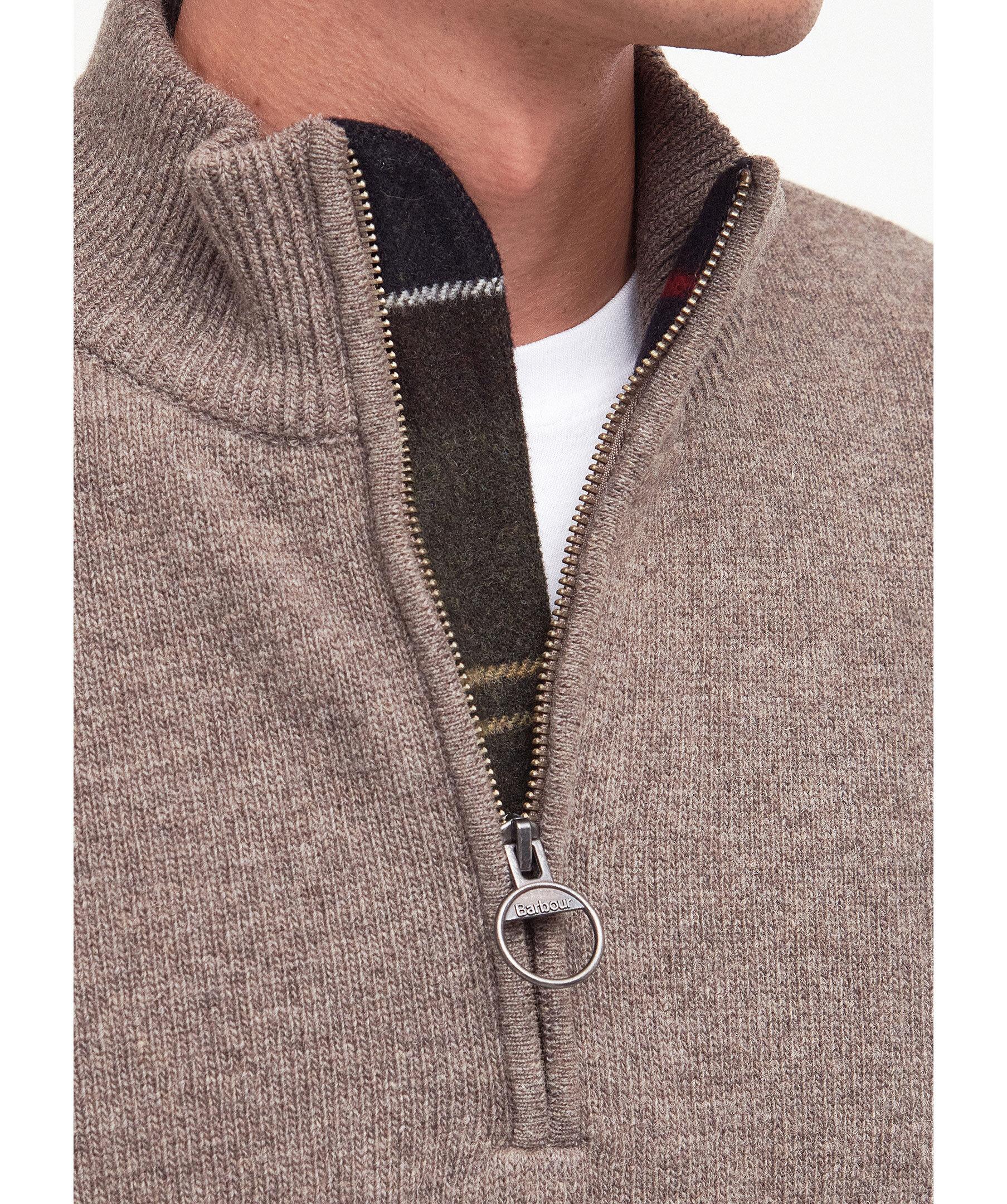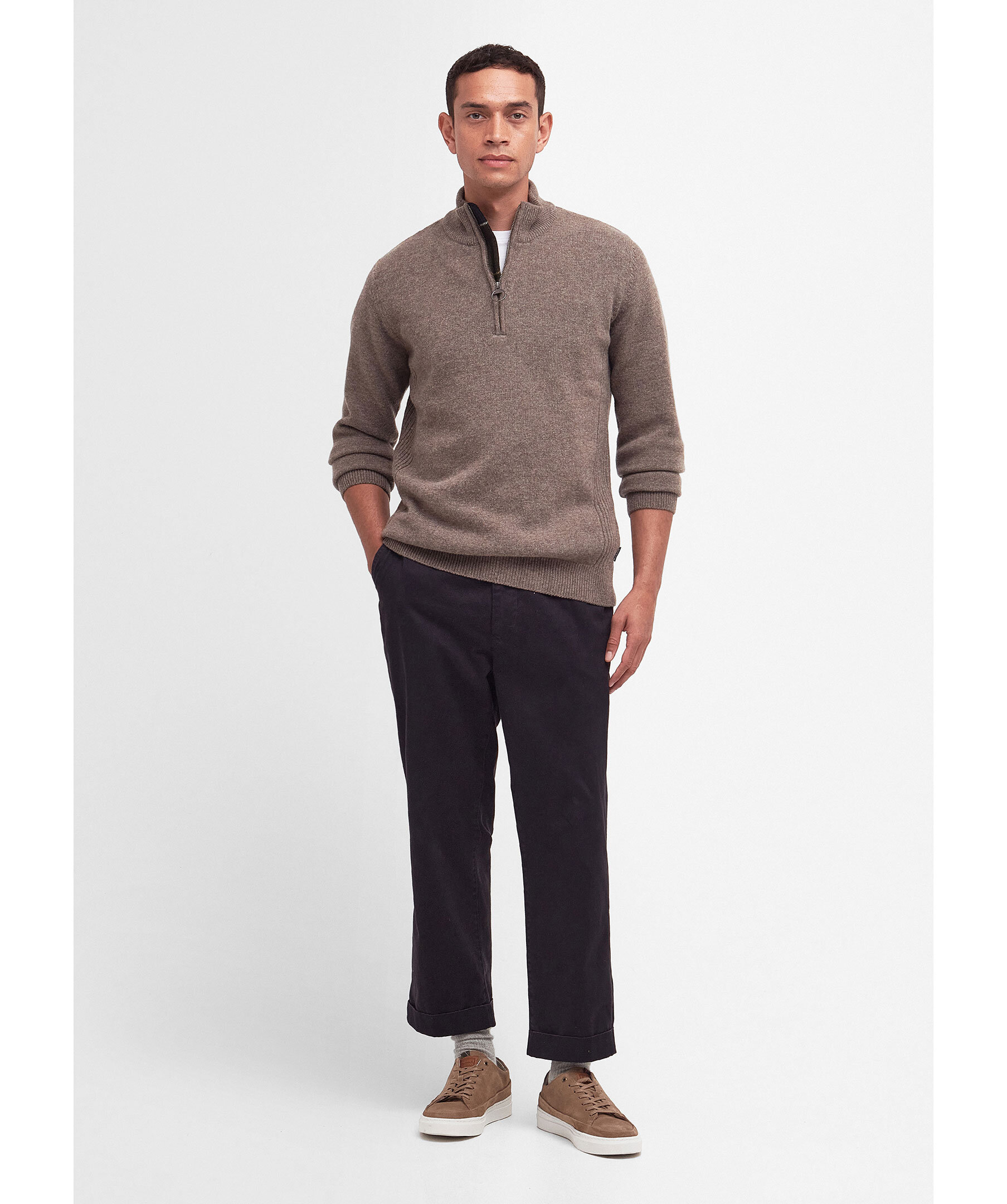 Beige stickad half-zip tröja från Barbour. Tröjan har en hög krage med dragkedja, stretchiga muddar vid ärm och plaggslut. Tygpatch vid armbåge. Tillverkad i 100% ull.