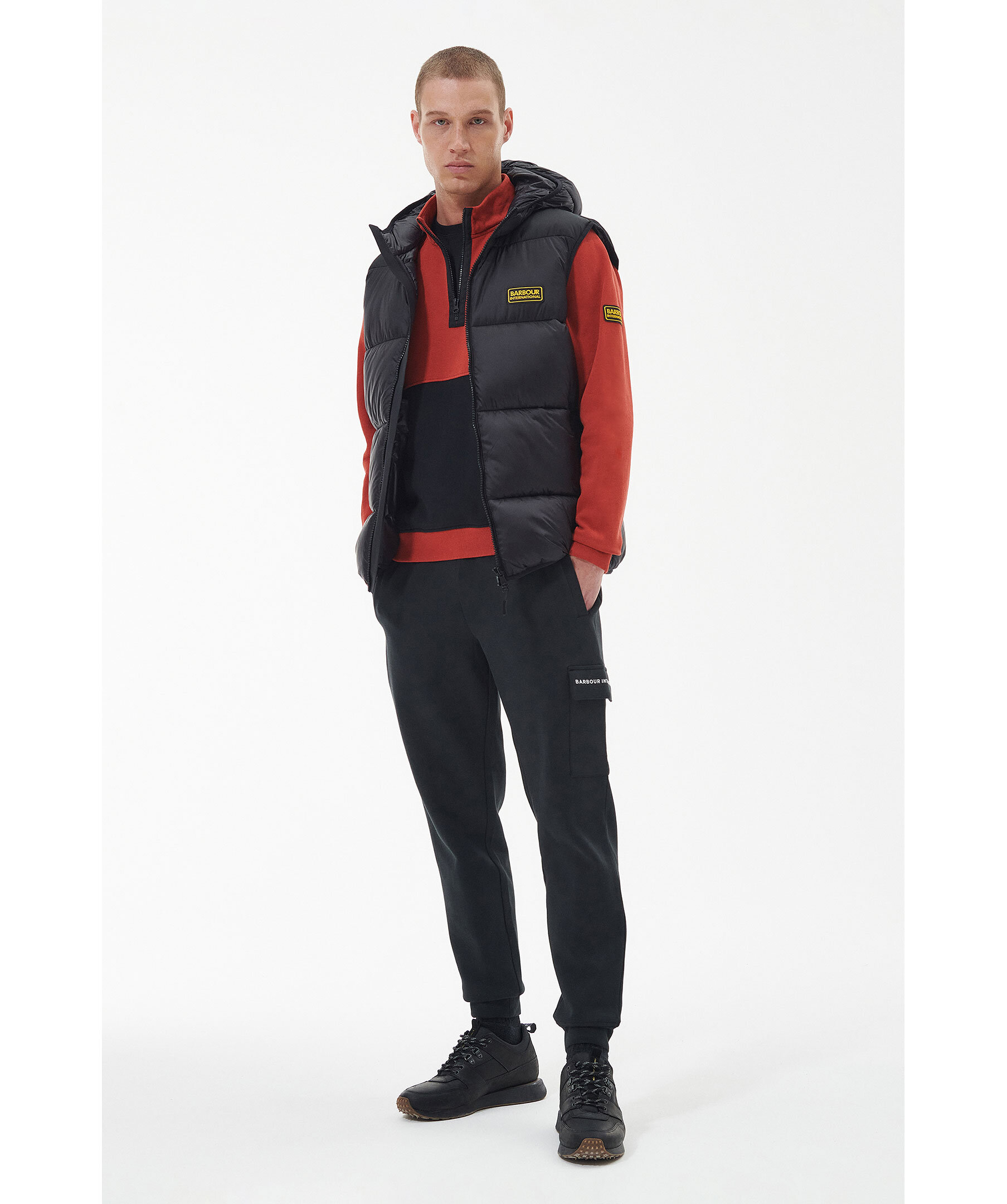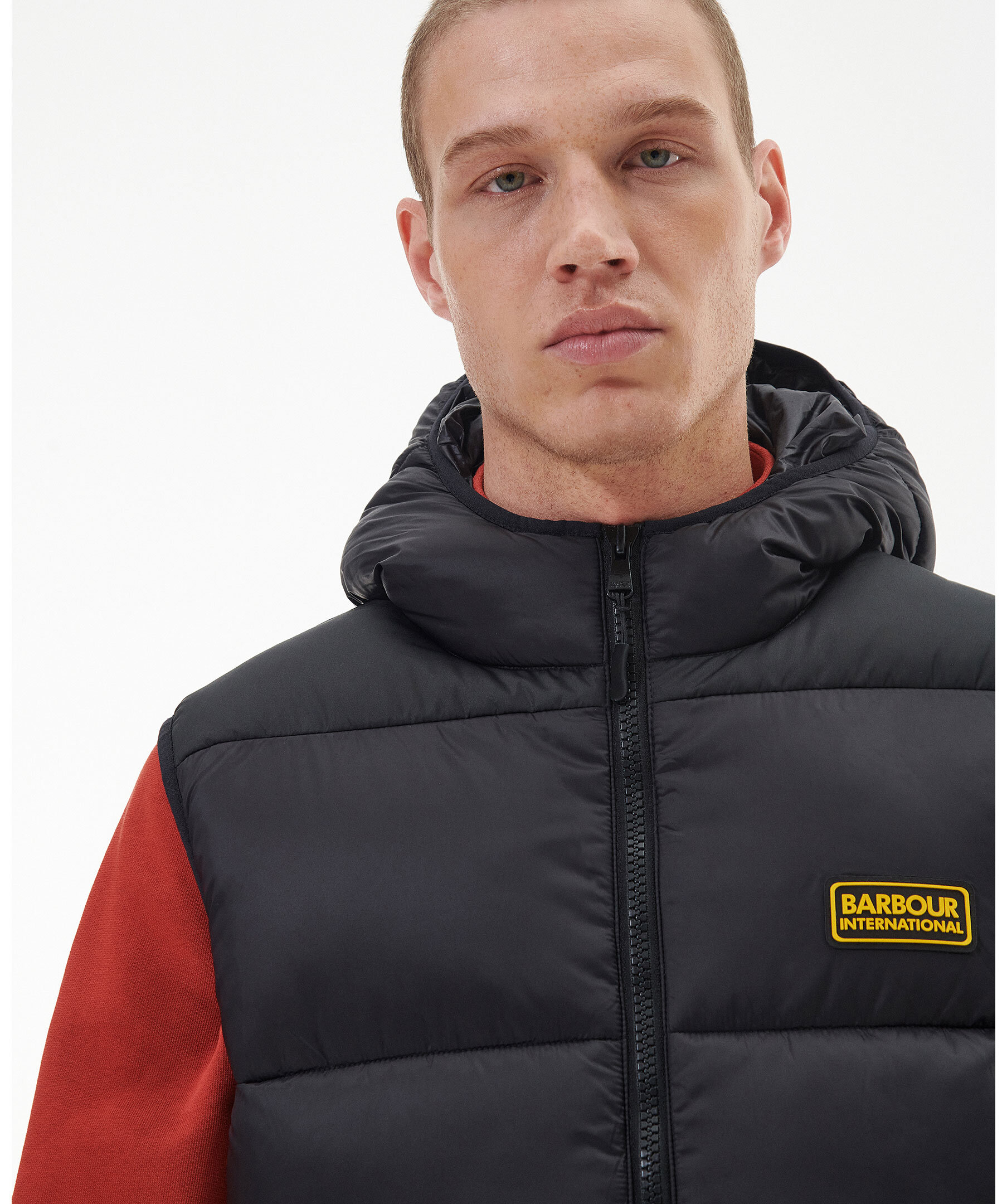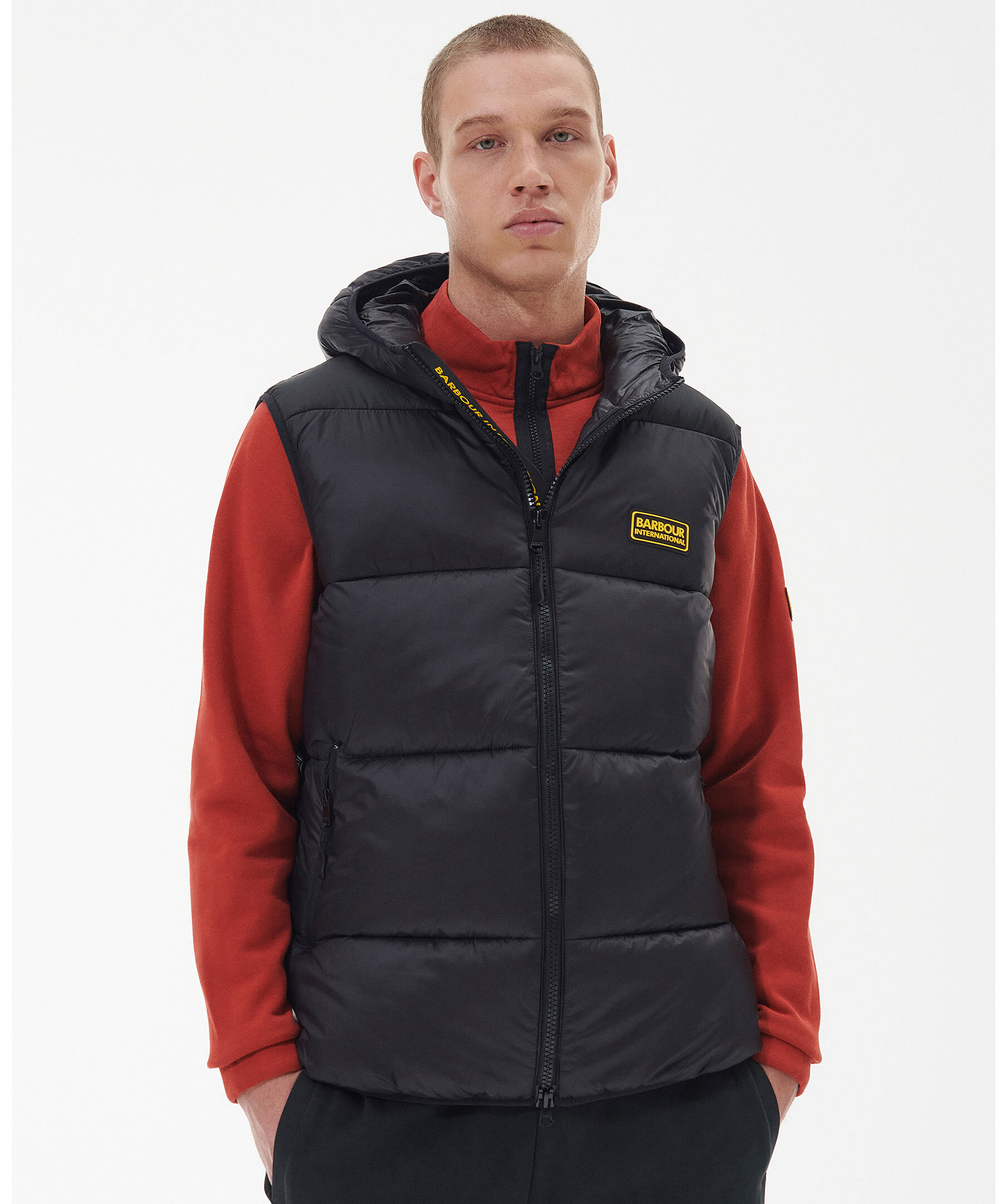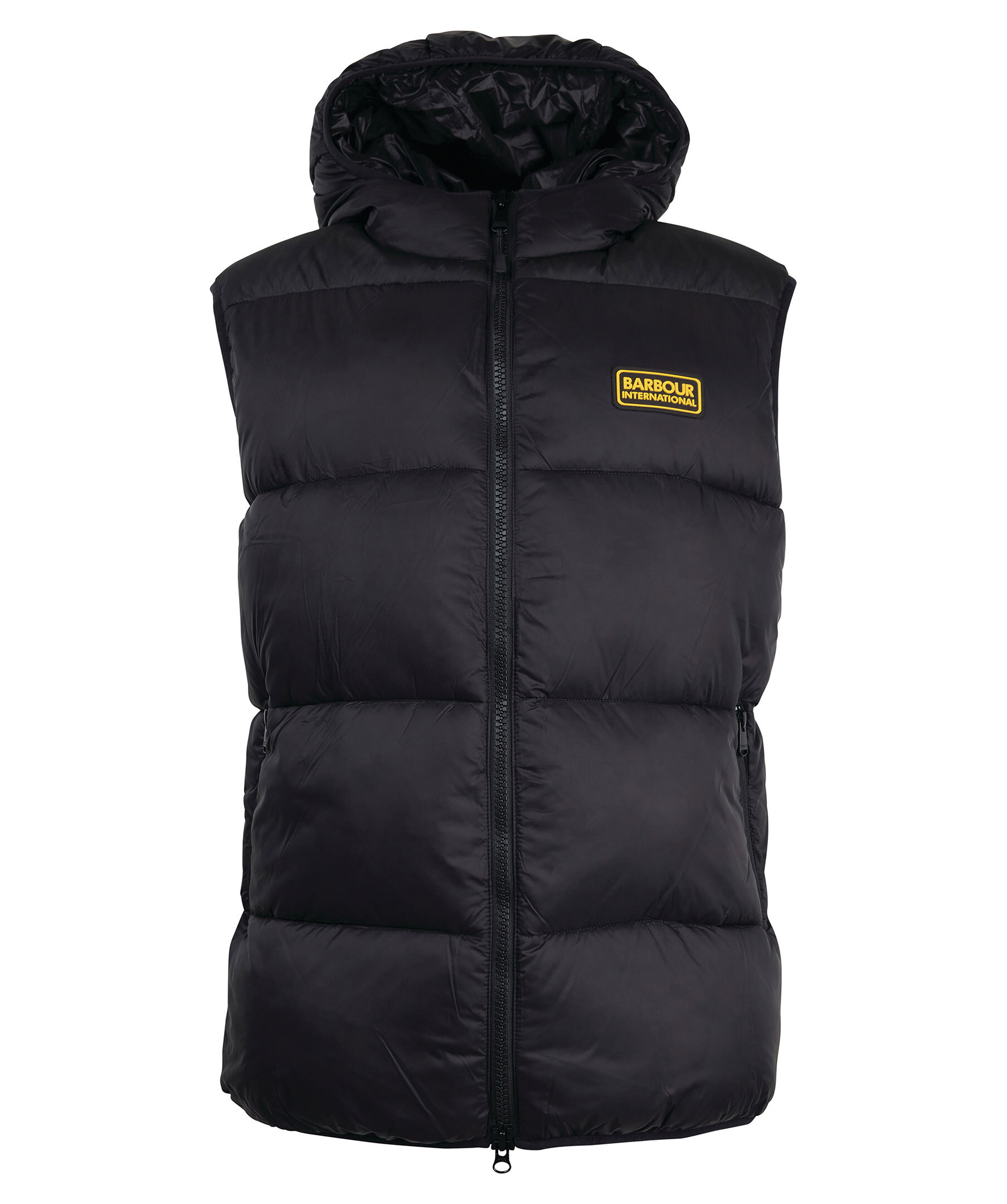 Svart vadderad quiltad väst från Barbour. Stängs framtill med tvåvägsdragkedja. Två fickor framtill som stängs med dragkedja. Gummerad patch med logotyp på vänster bröst. Luva med smal elastisk resår.