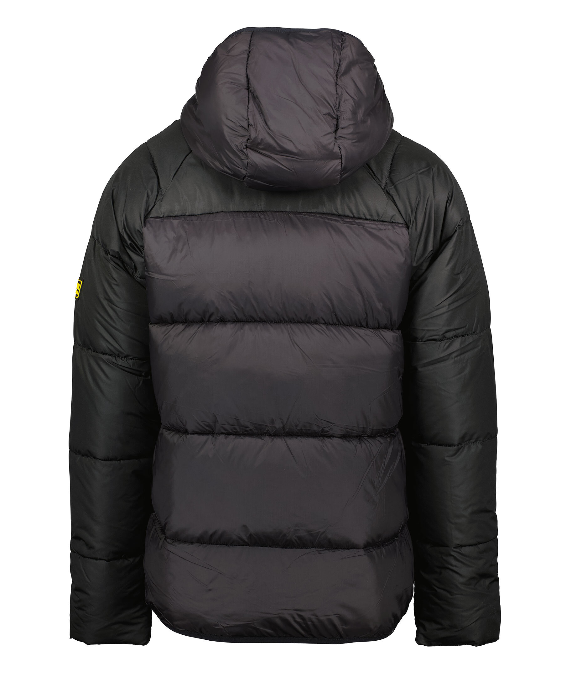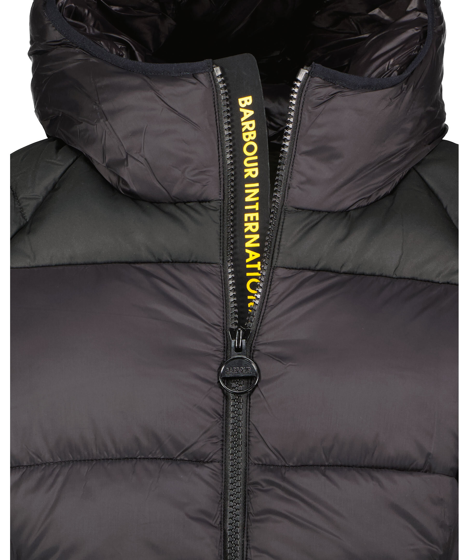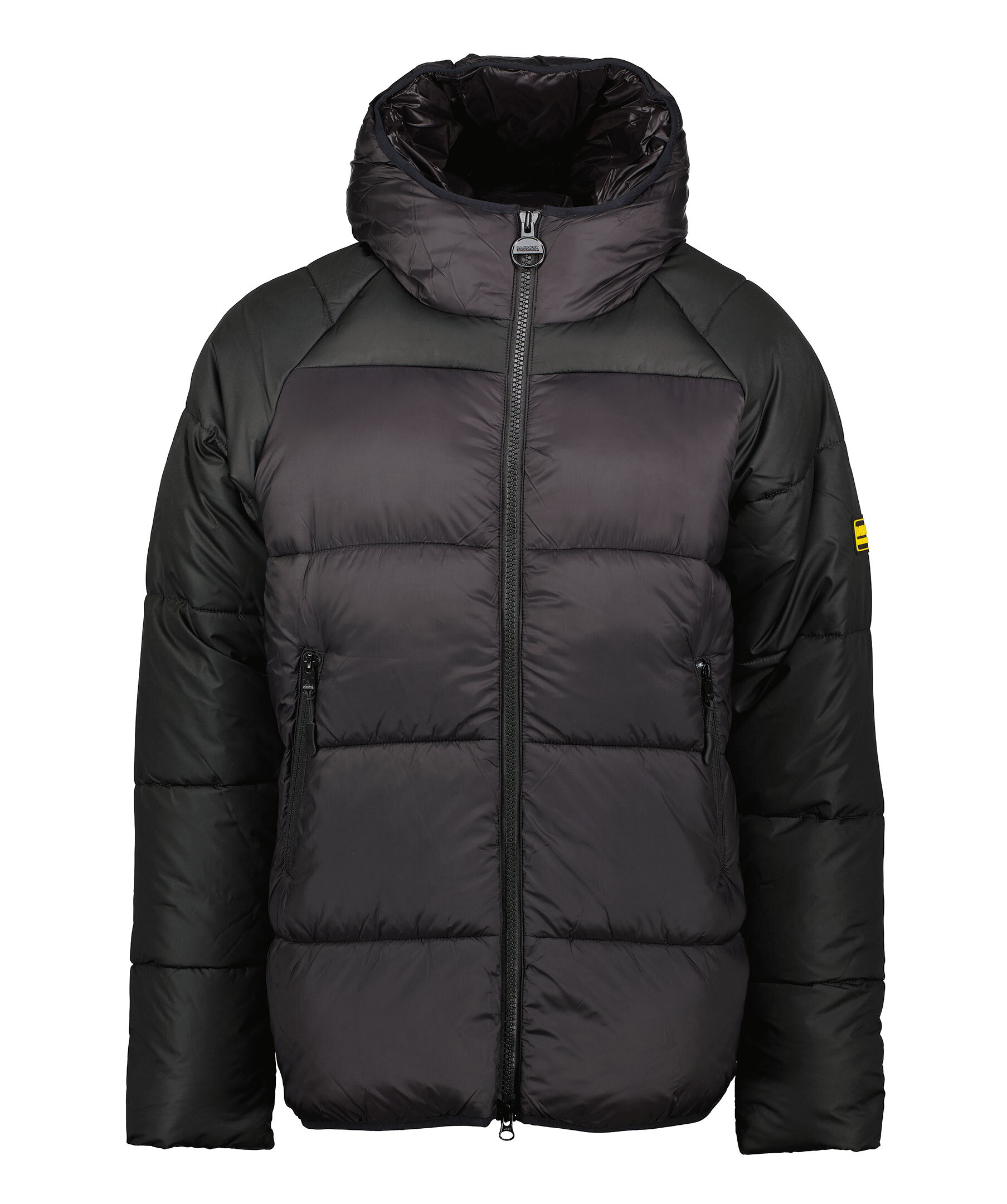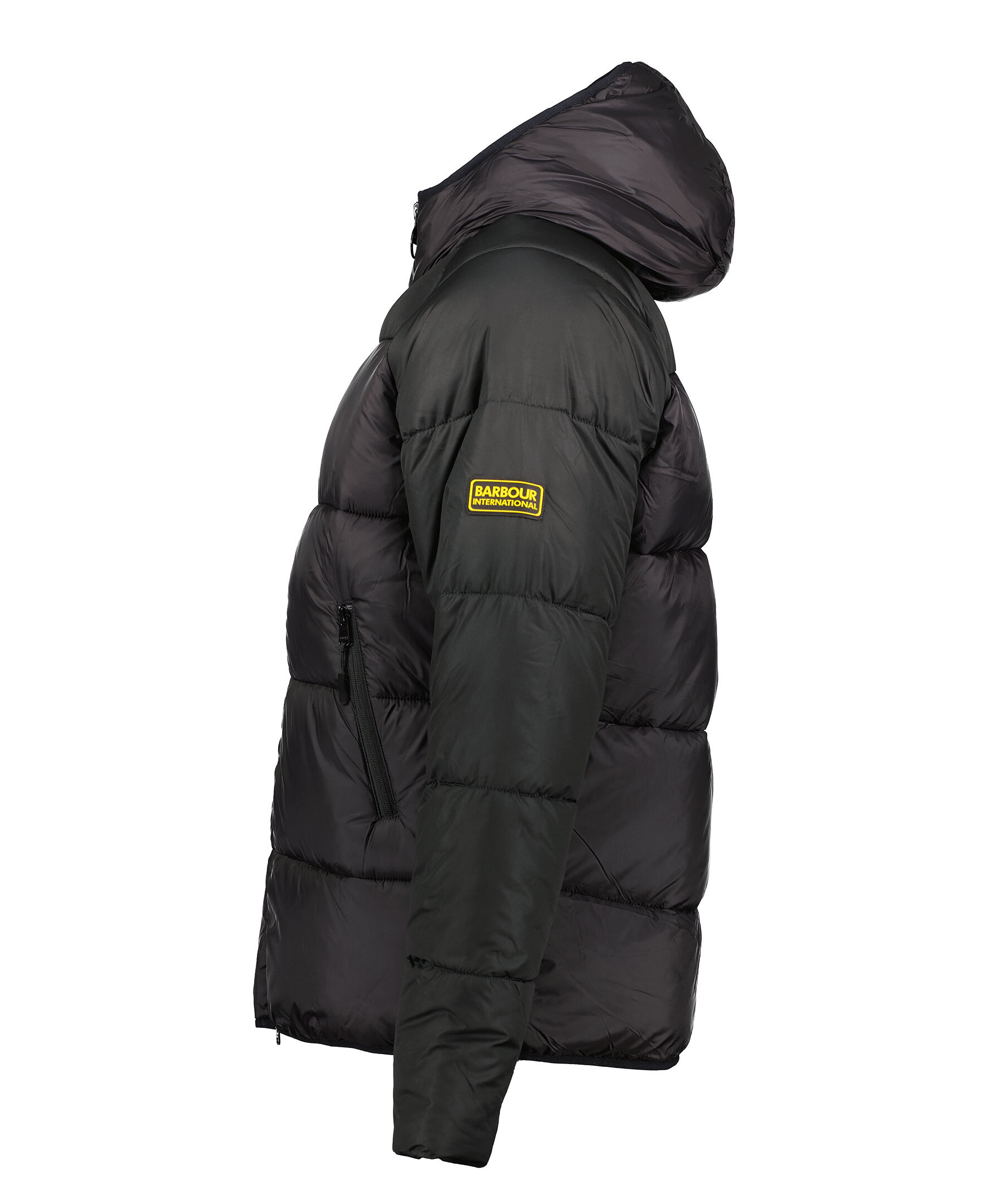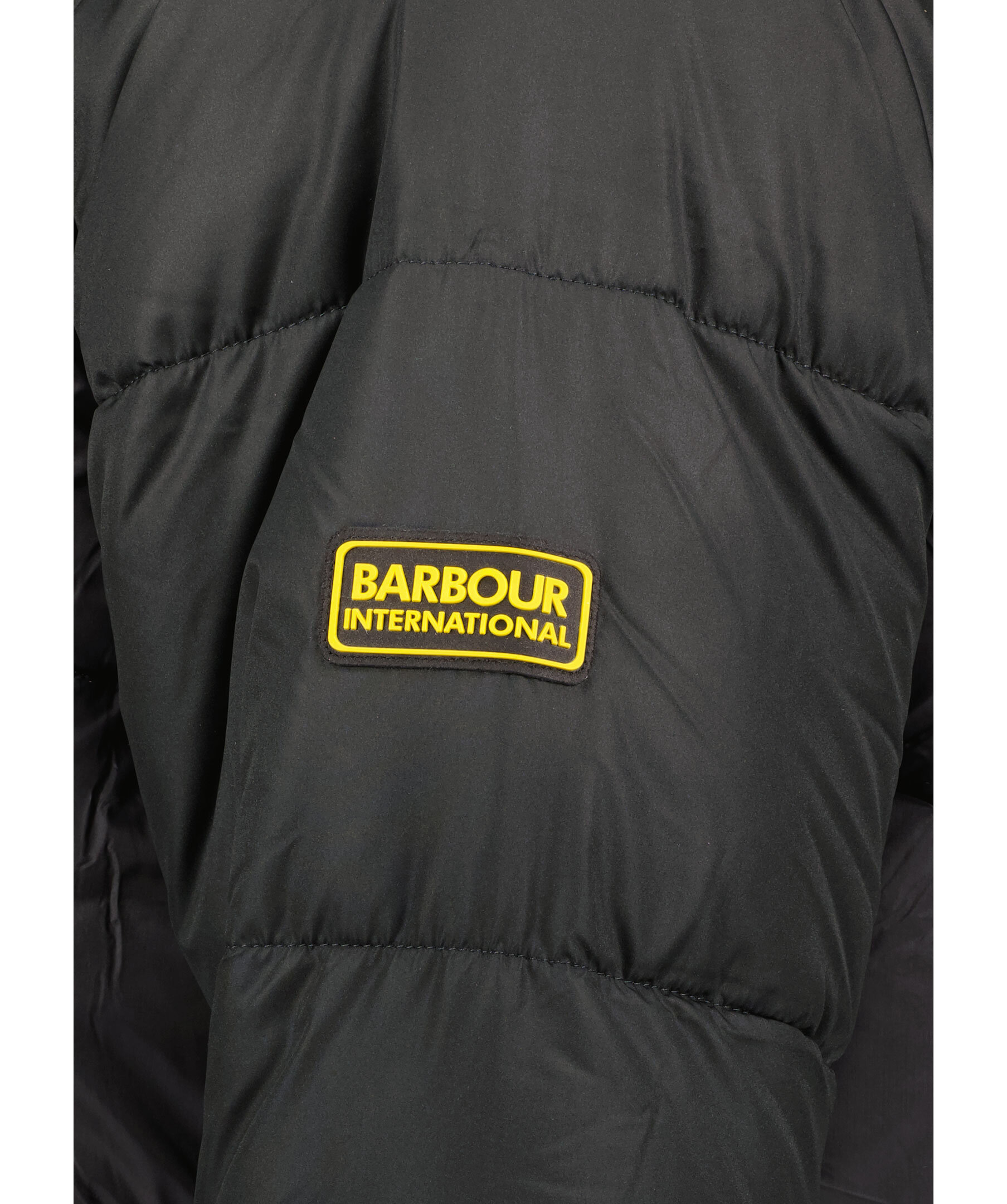 Svart pufferjacka med huva från Barbour International. Jackan stängs med dragkedja framtill och har två sidfickor med dragkedja samt en innerficka som stängs med en knapp. Tillverkad av 100% Polyamide. Gummerad logotyp på vänster arm samt innanför dragkedjan.