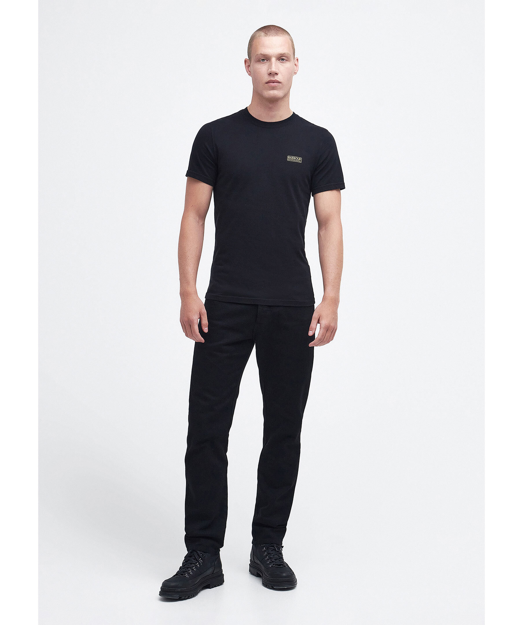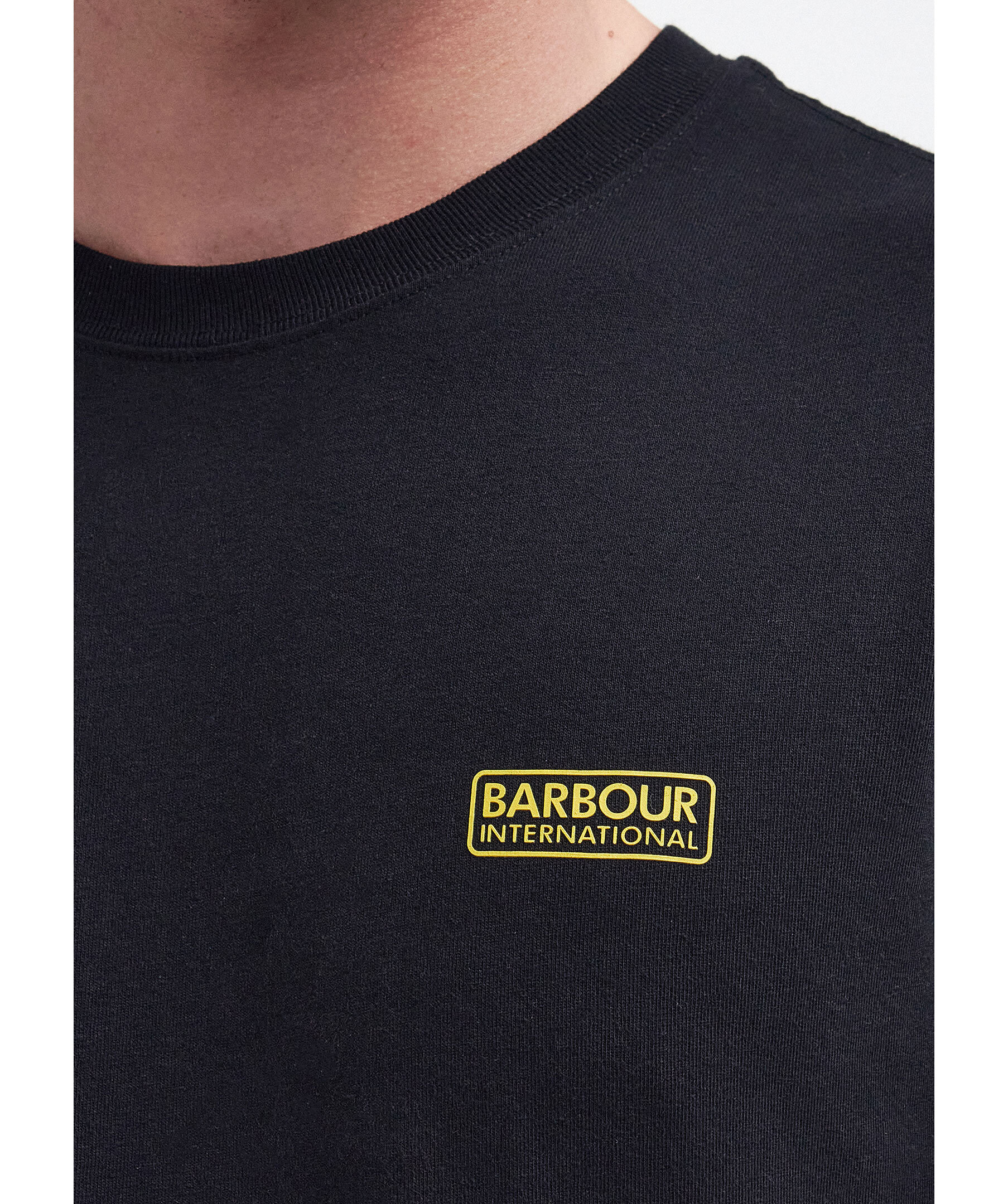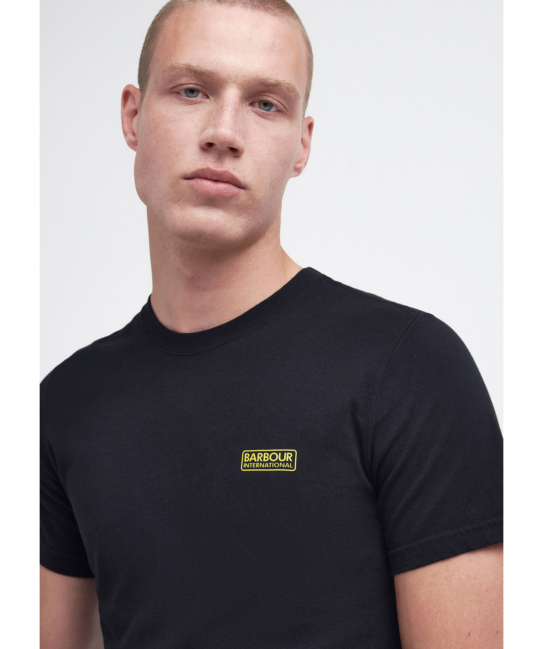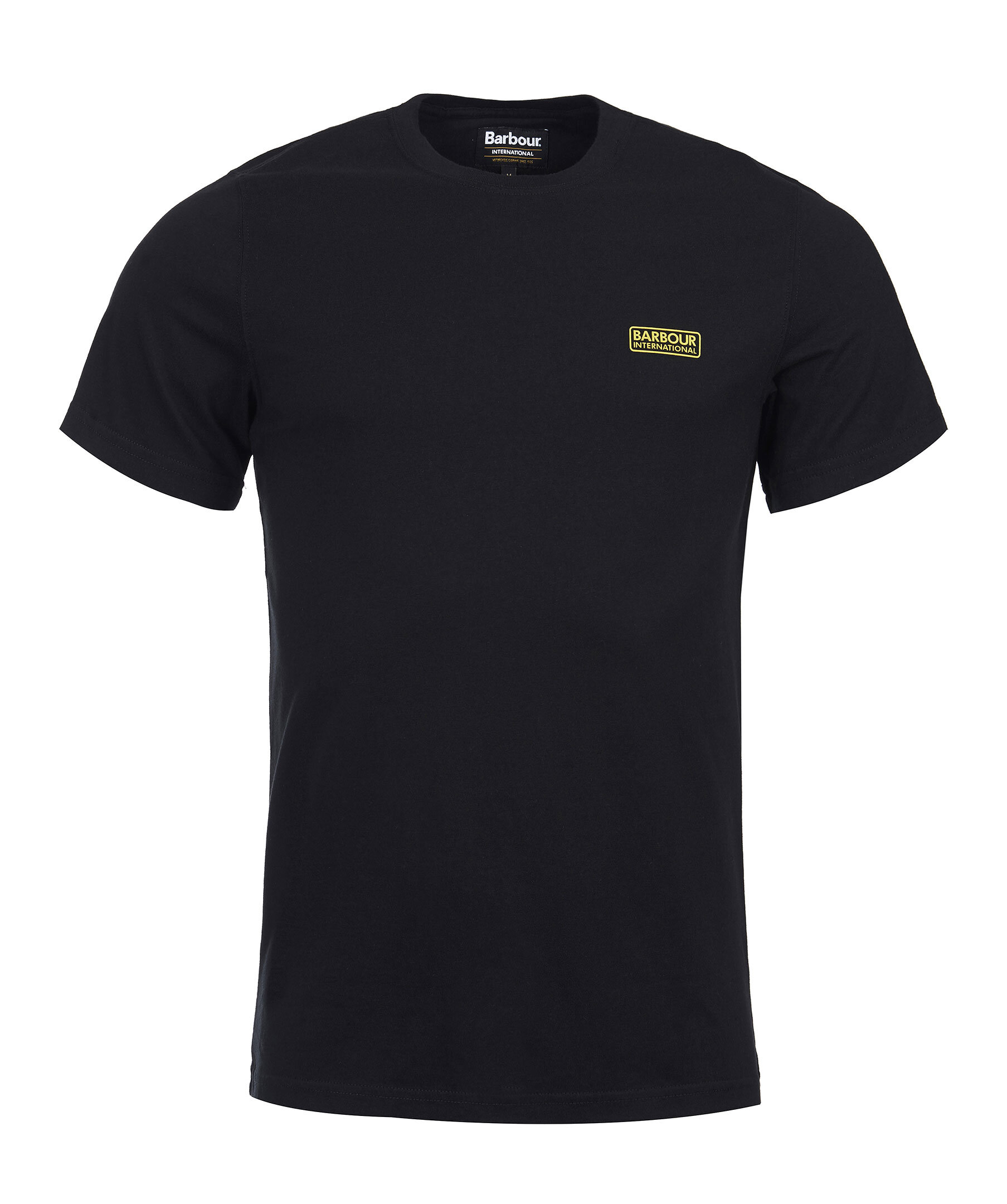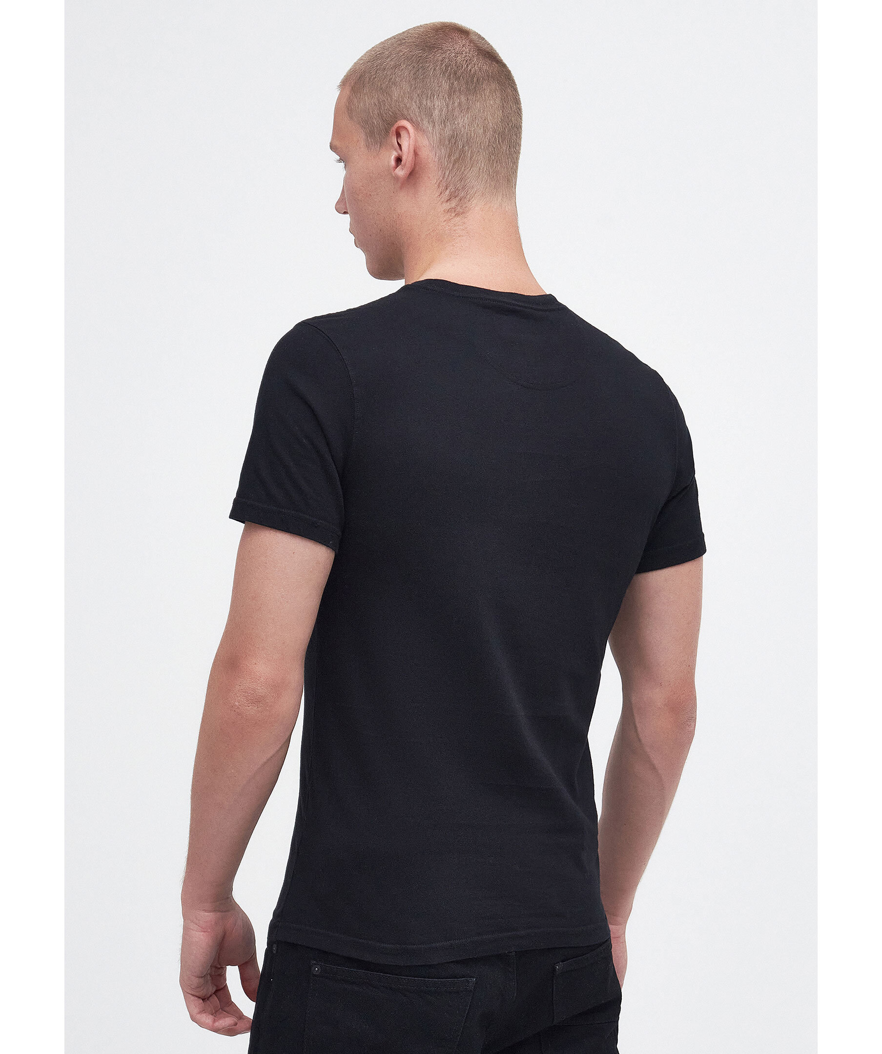 Svart T-shirt från Barbour. Rundad halsringning. Tryckt logotyp i vitt på vänster bröst. Tillverkad i 100% Bomull. Figurnära passform.