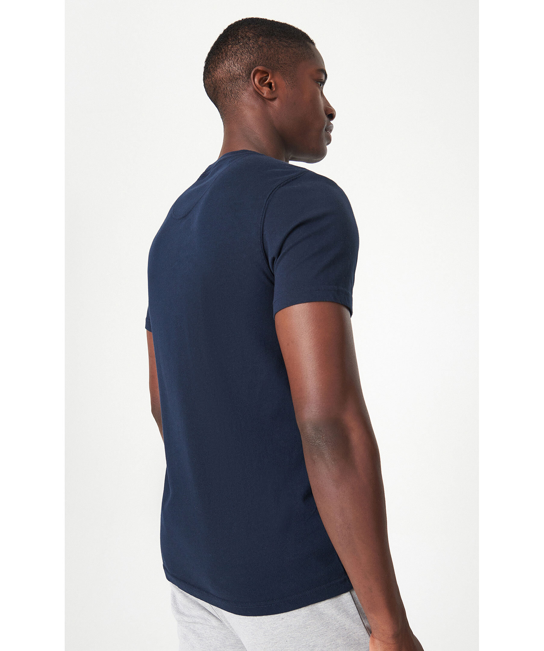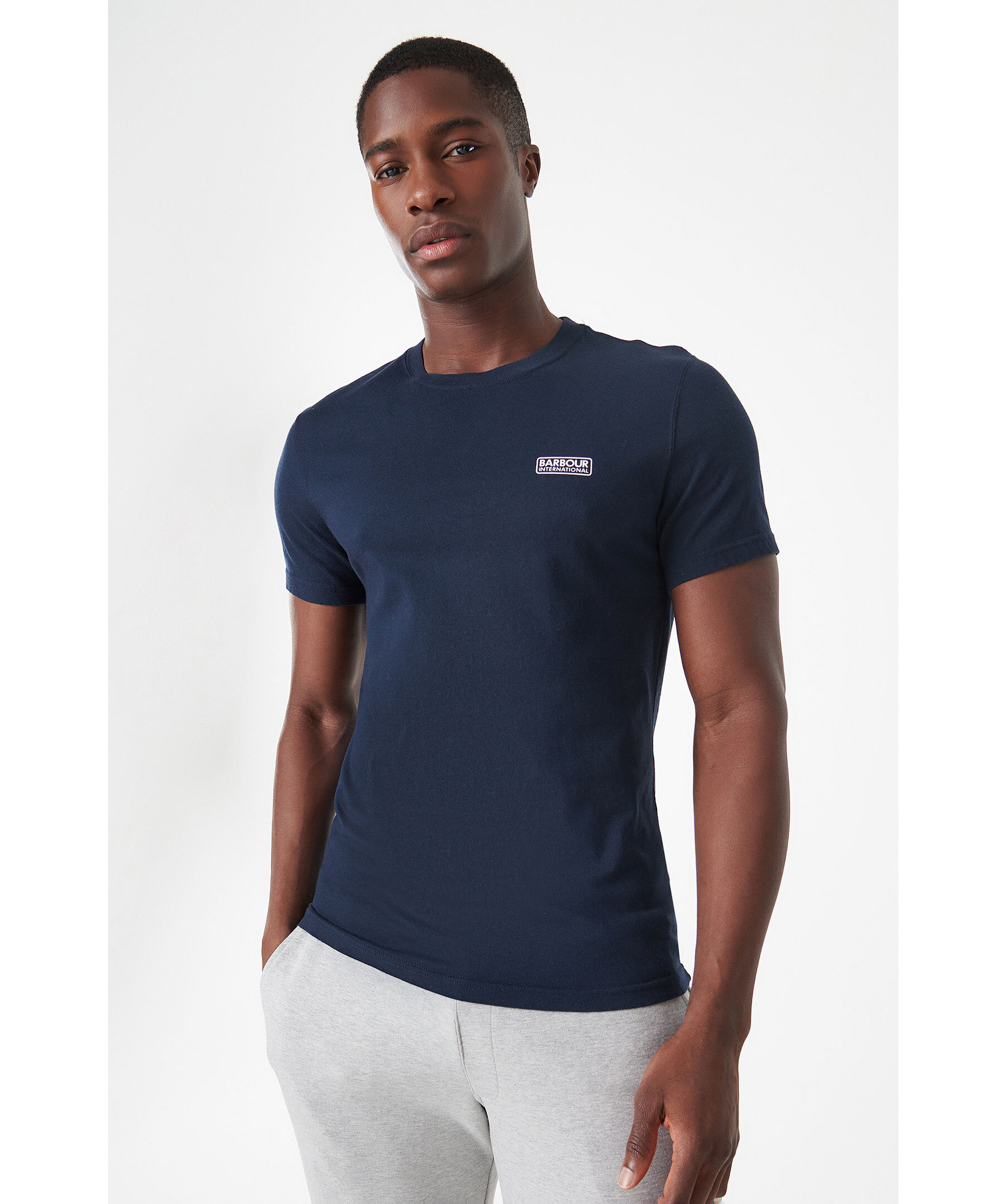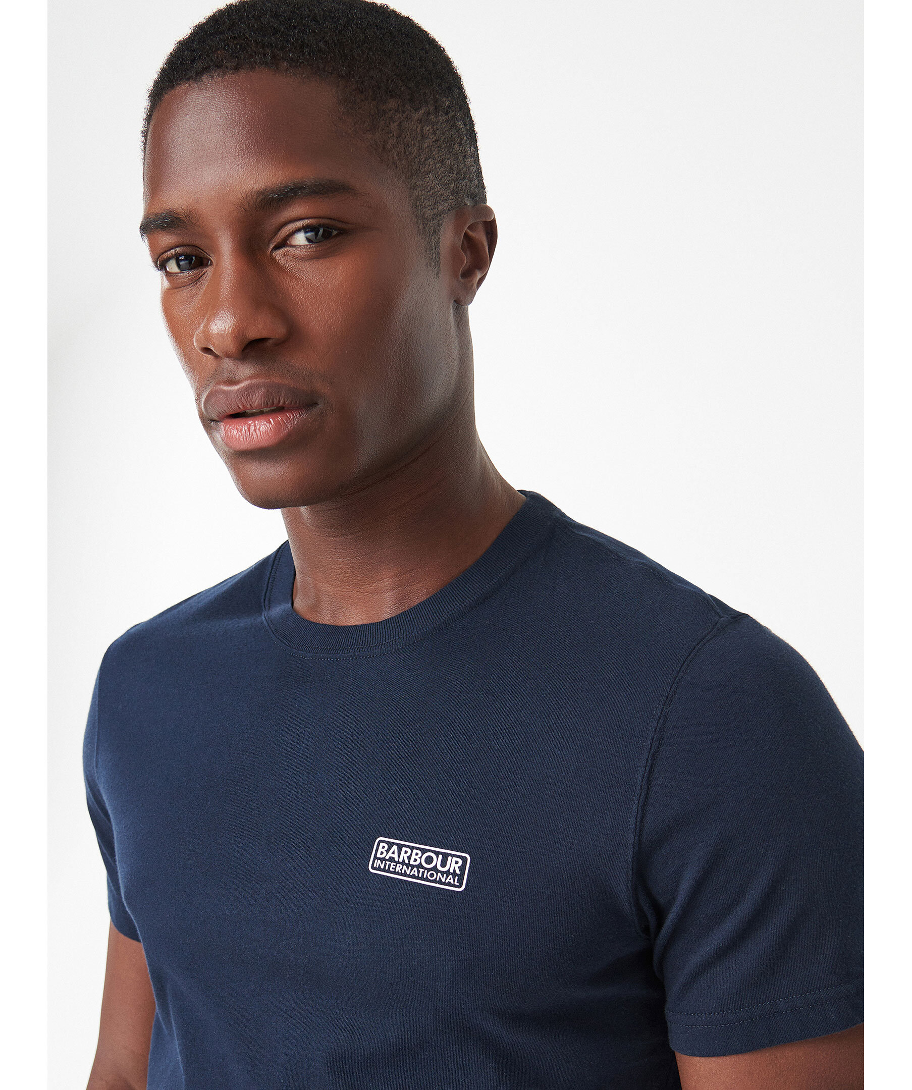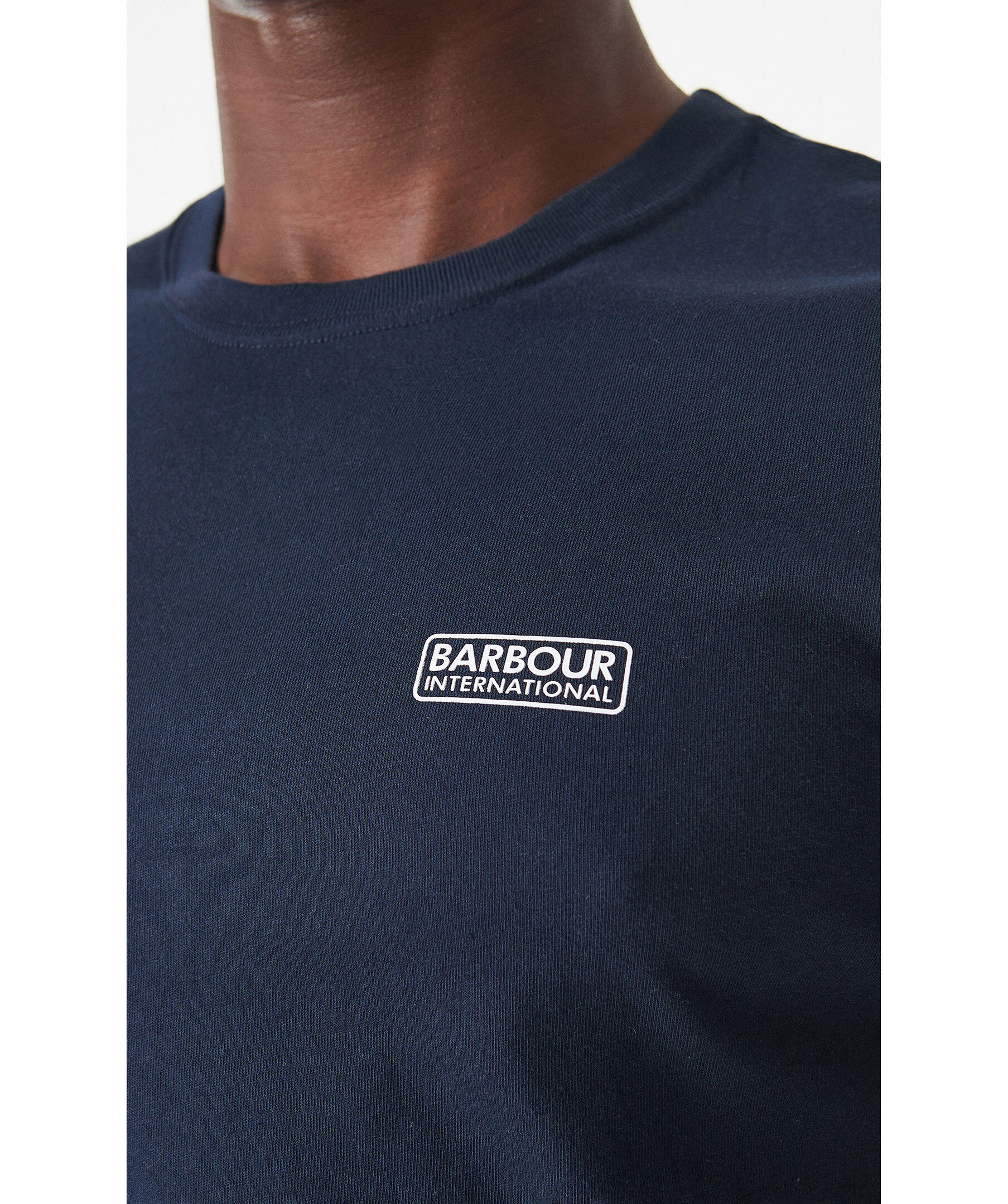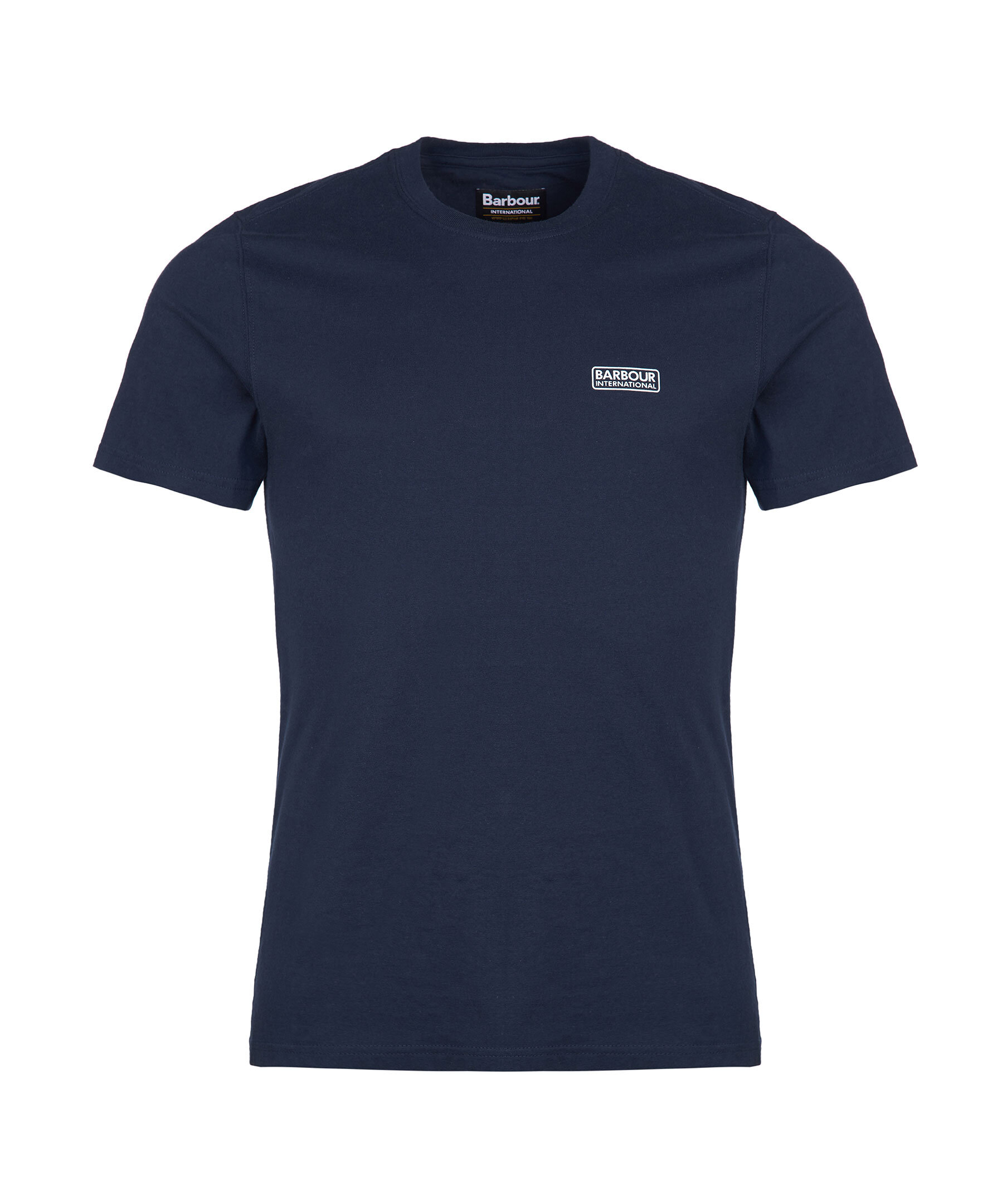 Mörkblå T-shirt från Barbour. Rundad halsringning. Tryckt logotyp i vitt på vänster bröst. Tillverkad i 100% Bomull. Figurnära passform.