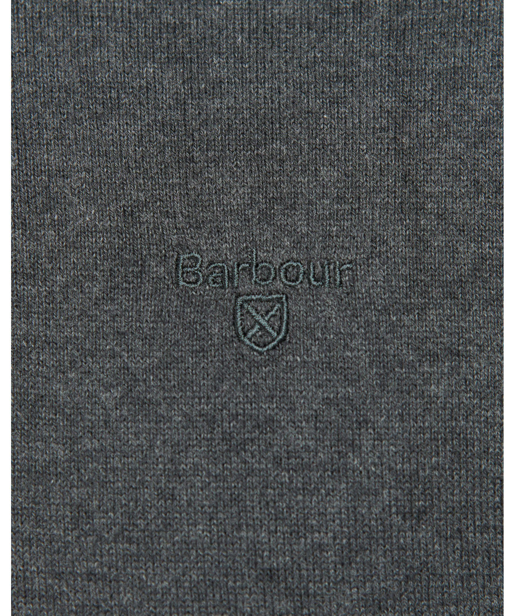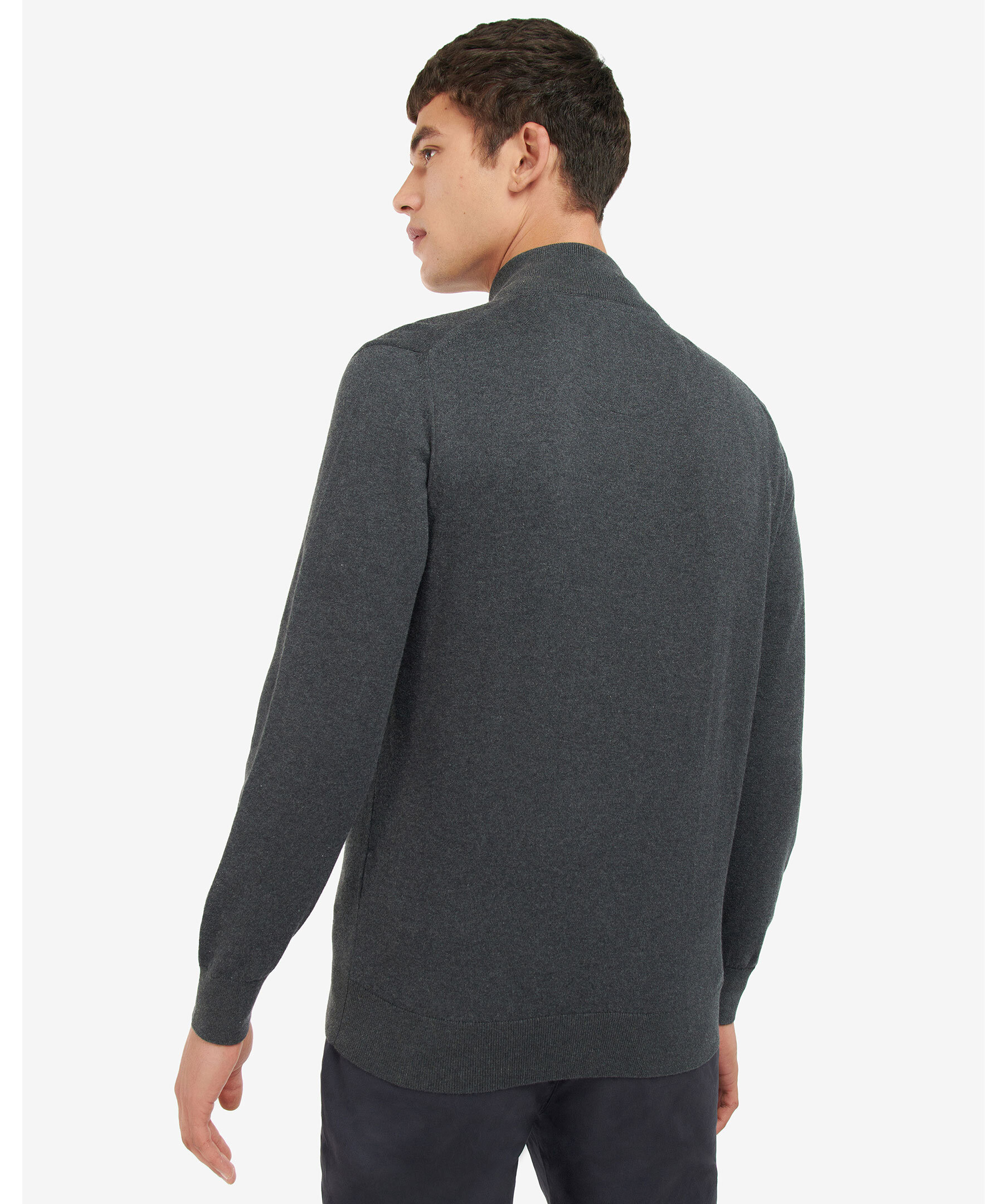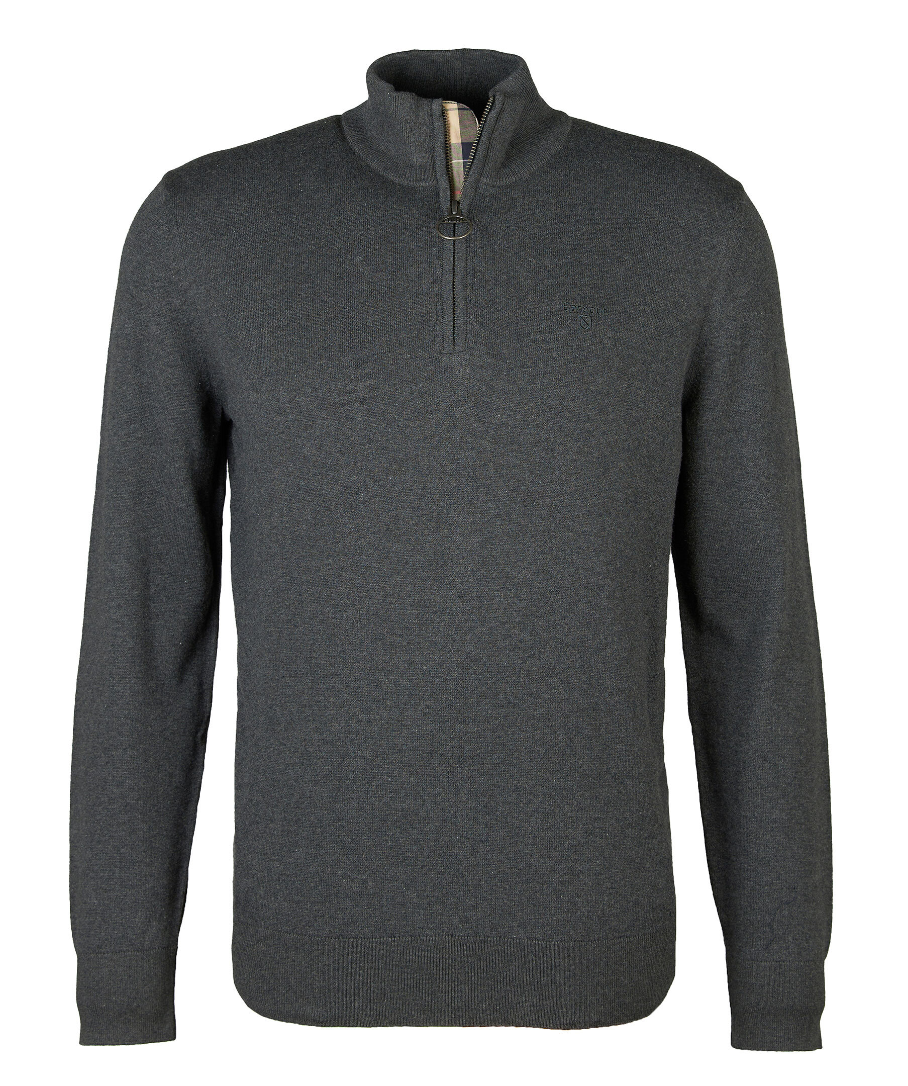 Mörkgrån, finstickad tröja med half-zip krage från Barbour. Vävt i 100% bomull för komfort och hållbarhet. Halv dragkedja med en tartan-mönstrad kant under som en fin detalj. Broderad ton-i-ton logga på bröstet och ribbade muddar i ärmslut, på kragen och i plaggslut.