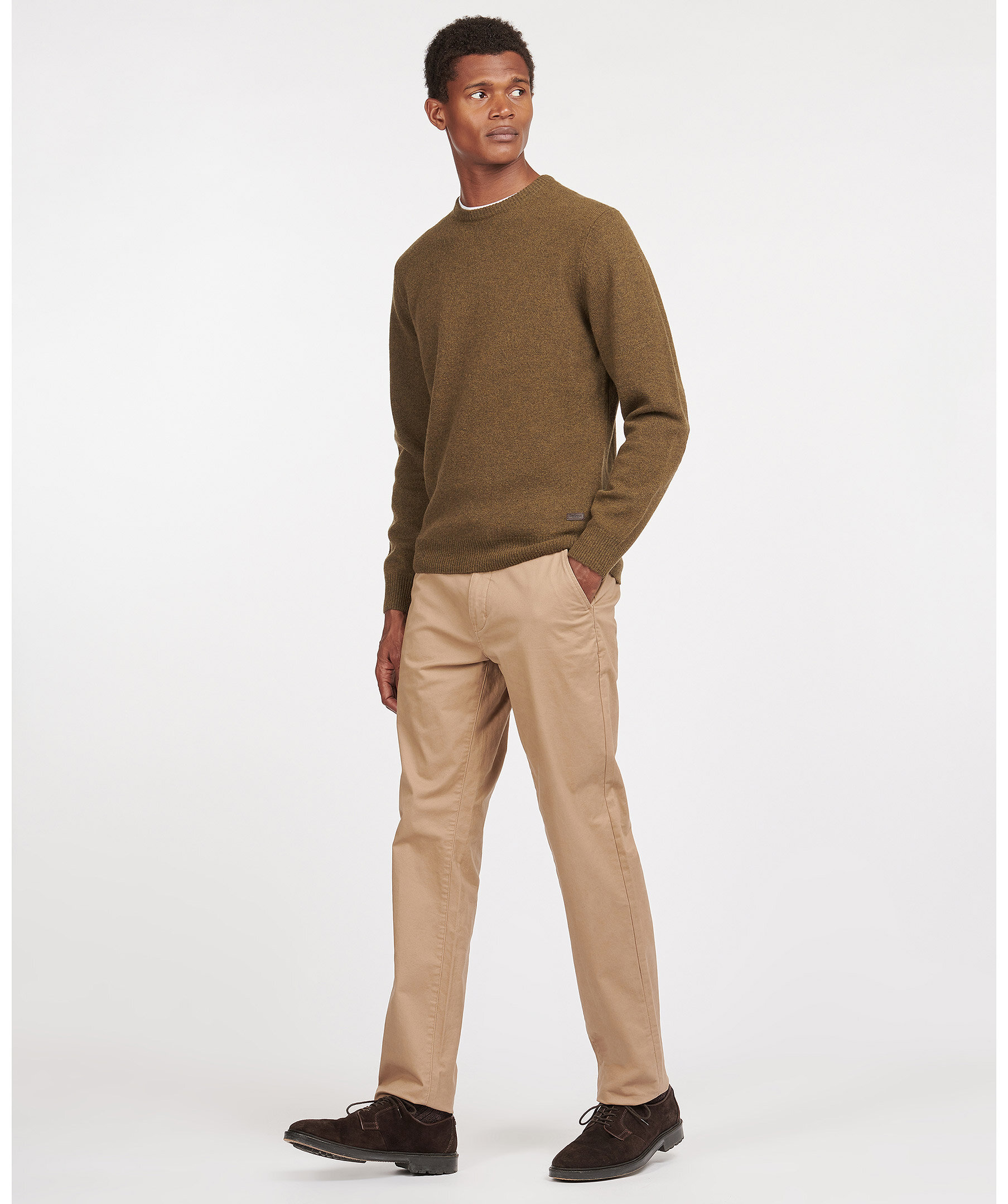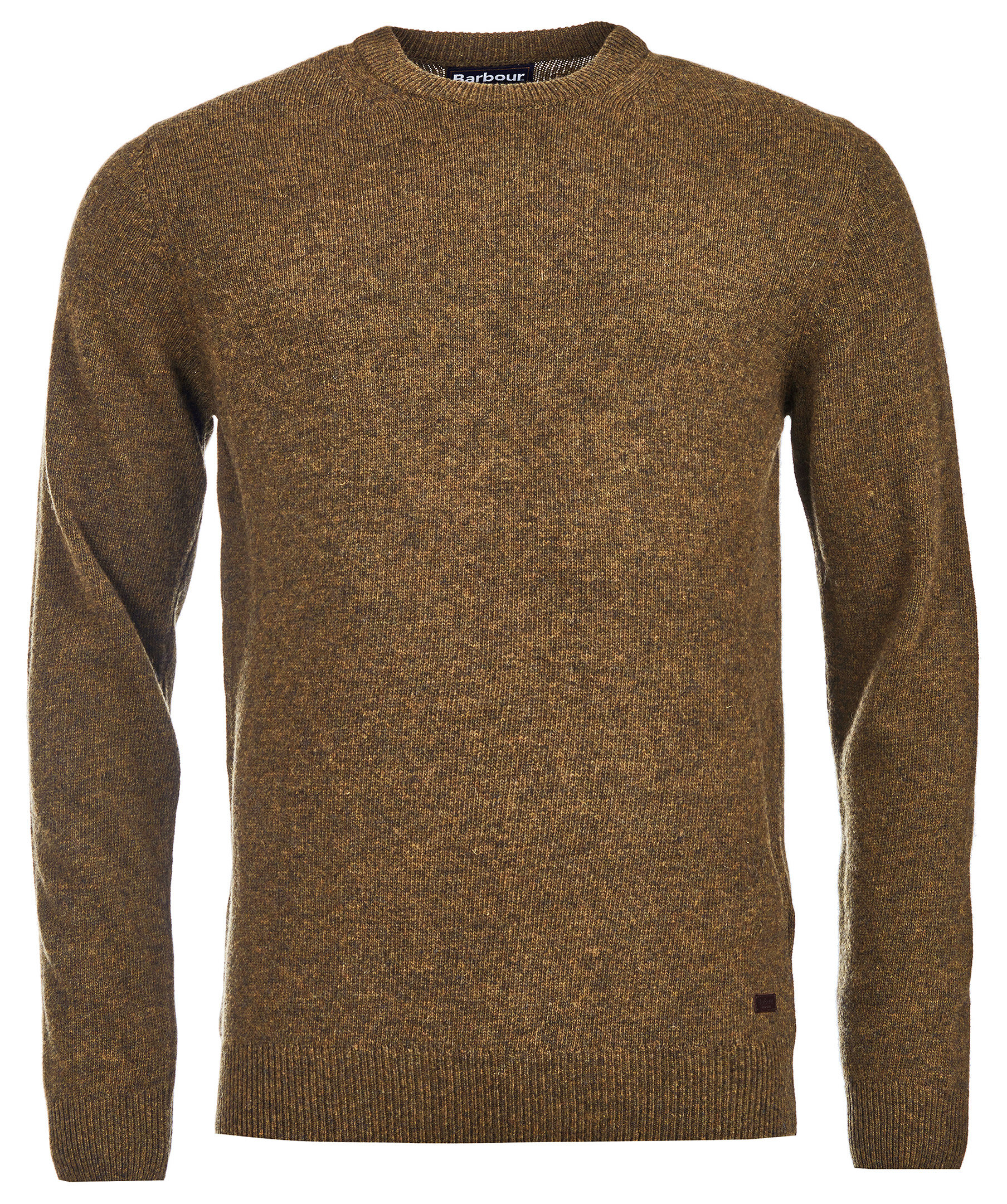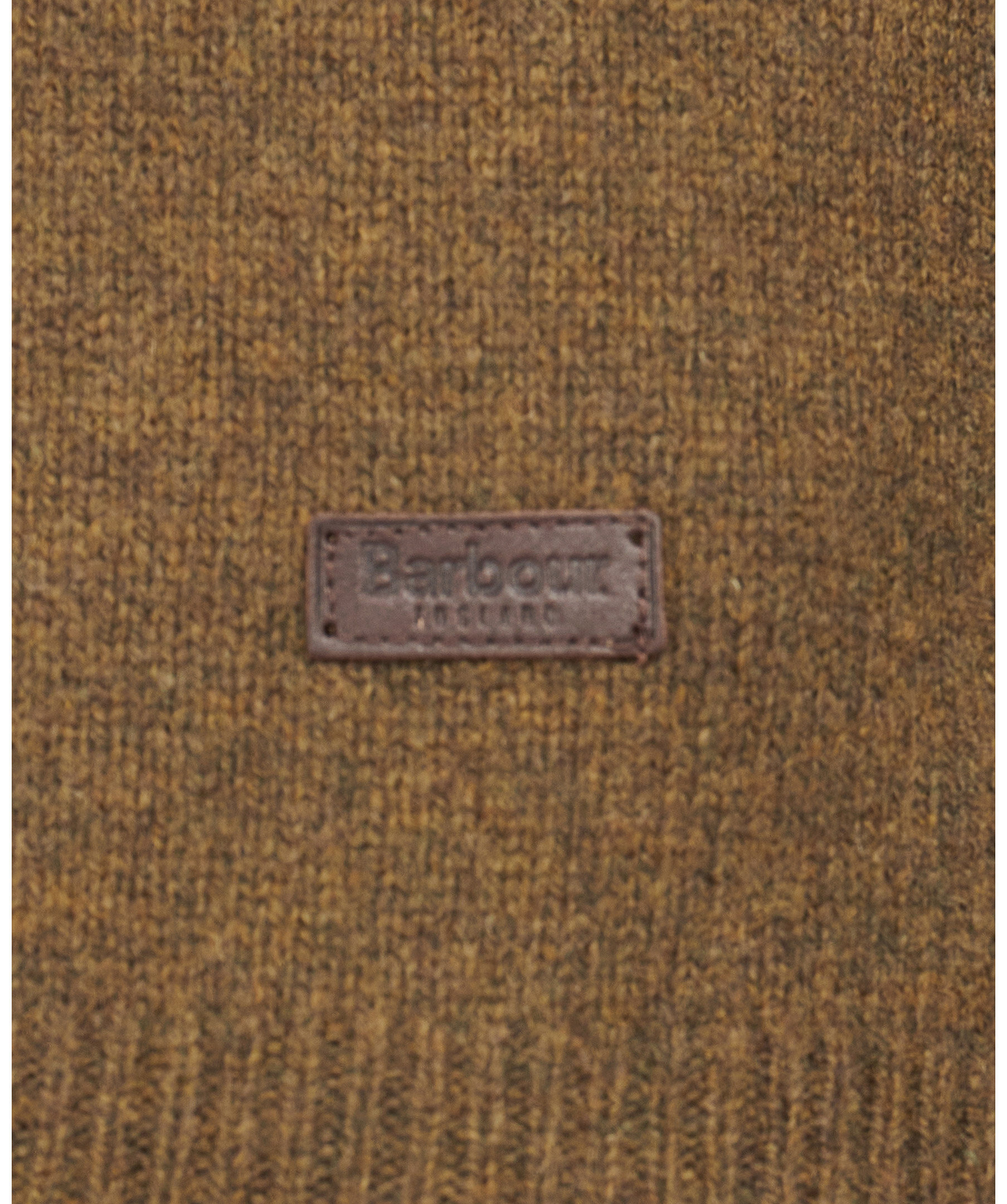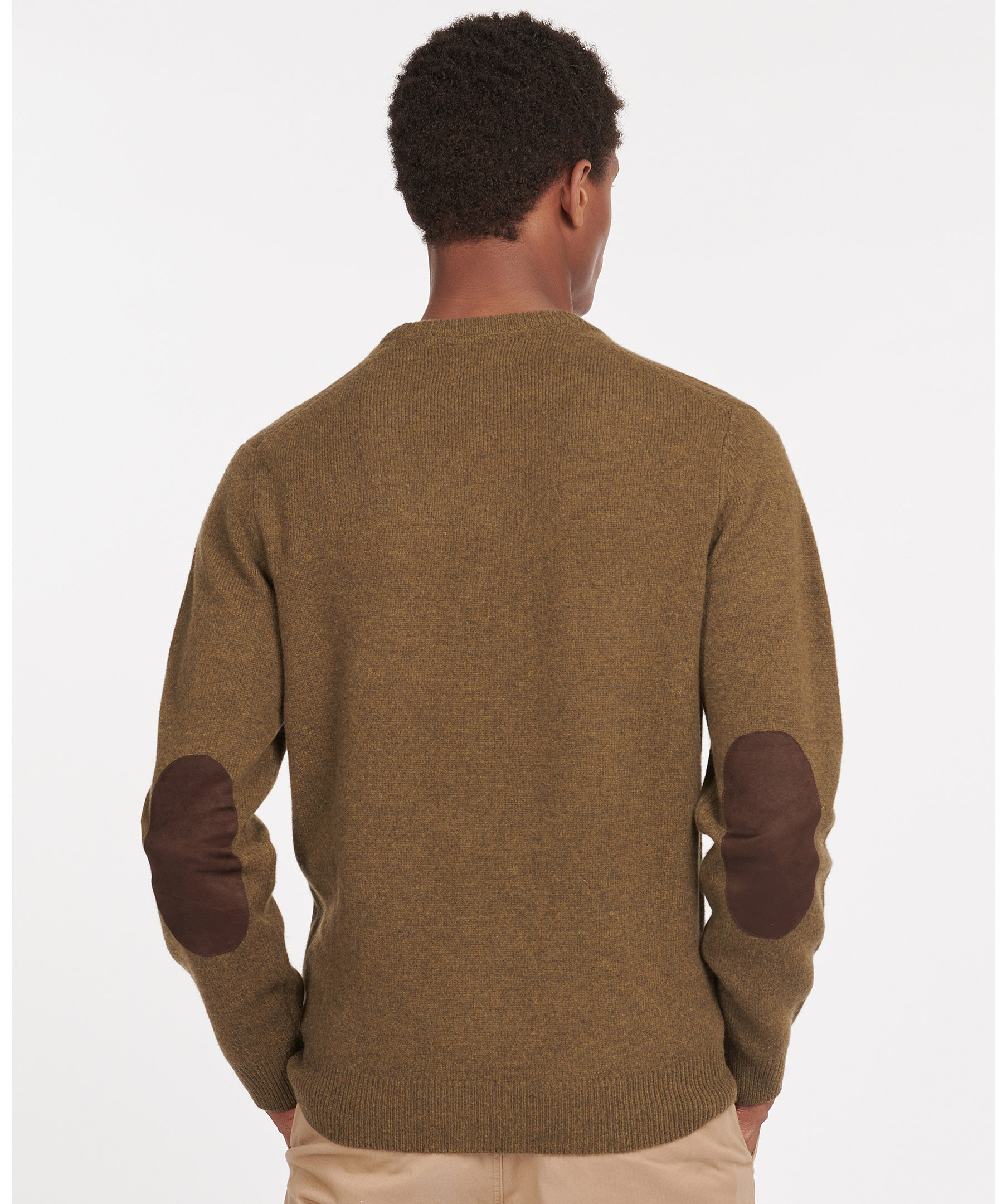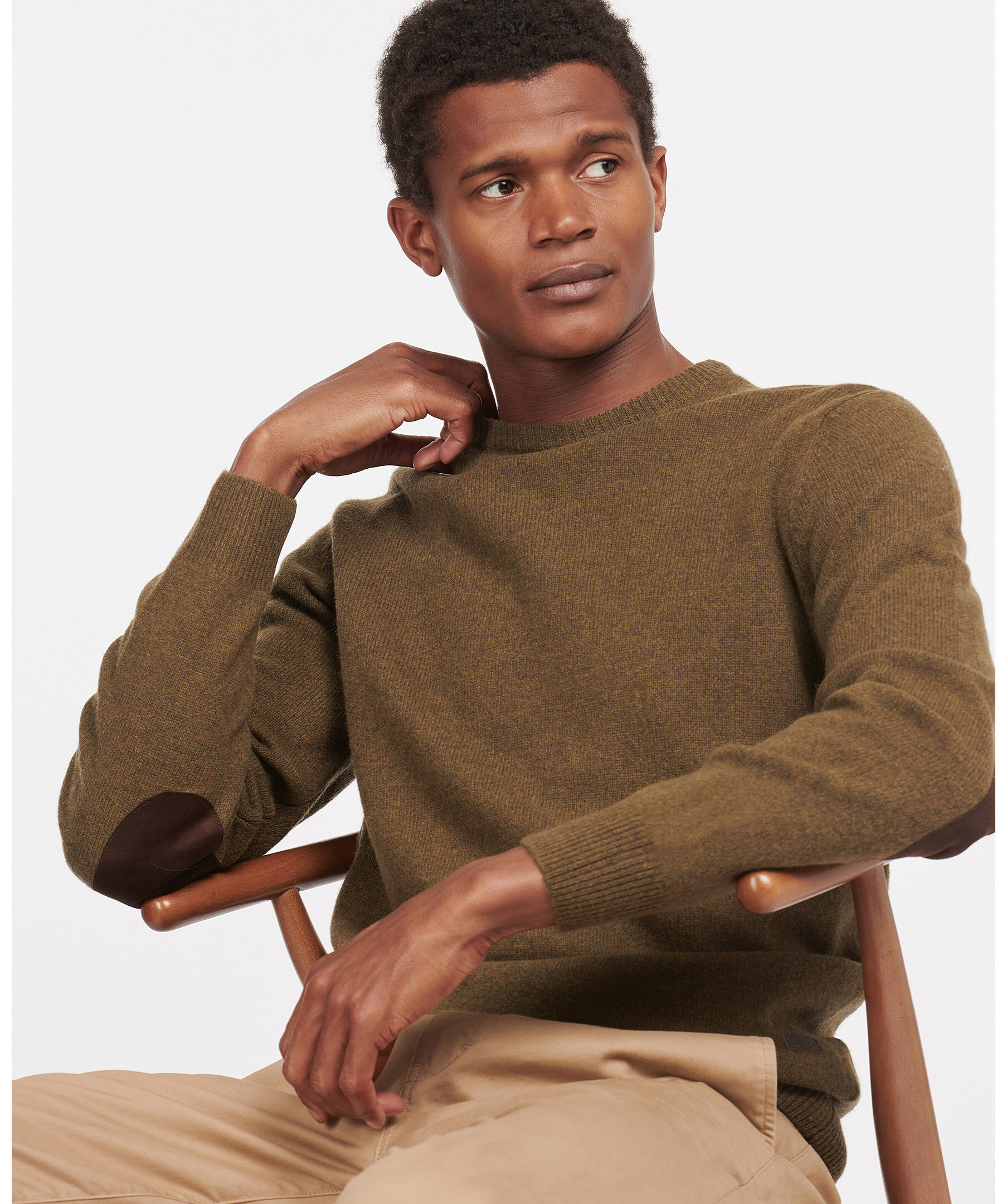 Mossgrön stickad tröja från Barbour. Tillverkad i 100% ull. Tröjan har en rundad halsringning, ribbade muddar vid ärm och plaggslut. Tygpatch på armbågarna och liten patch i brunt läder med logotyp på i nedre kanten av tröjan.