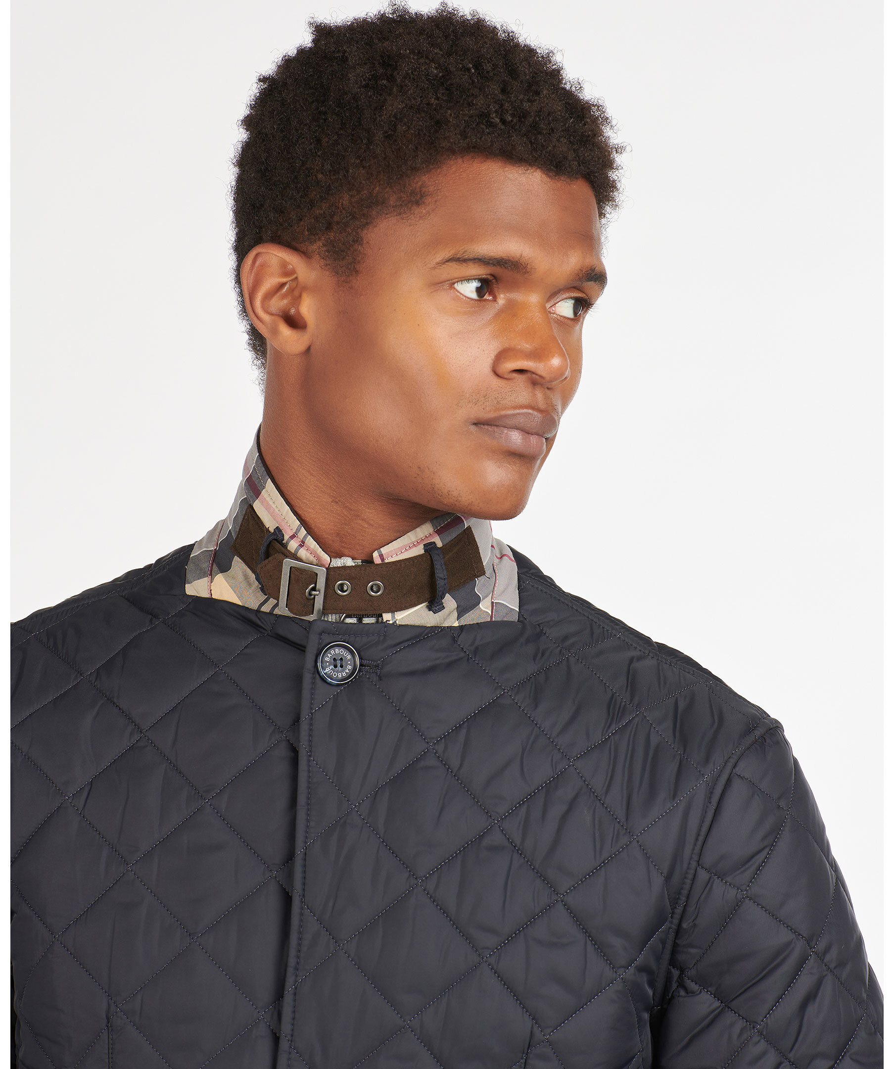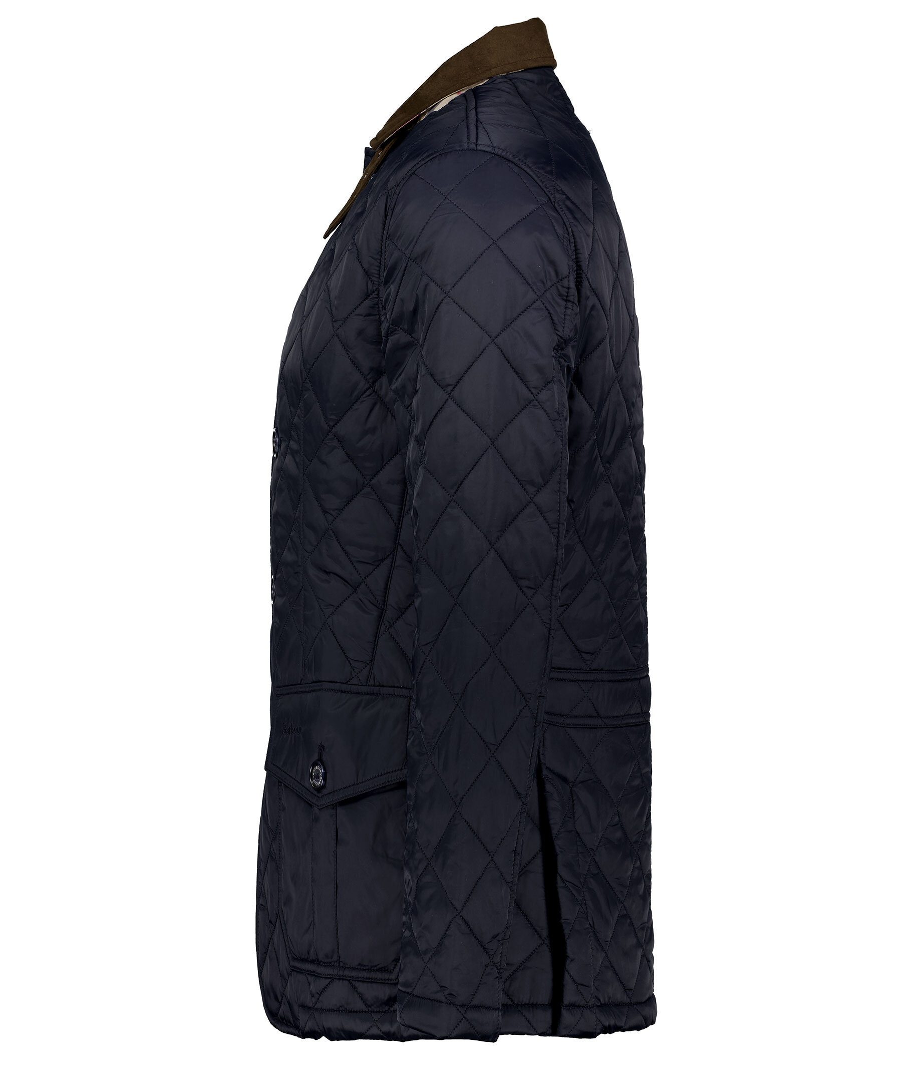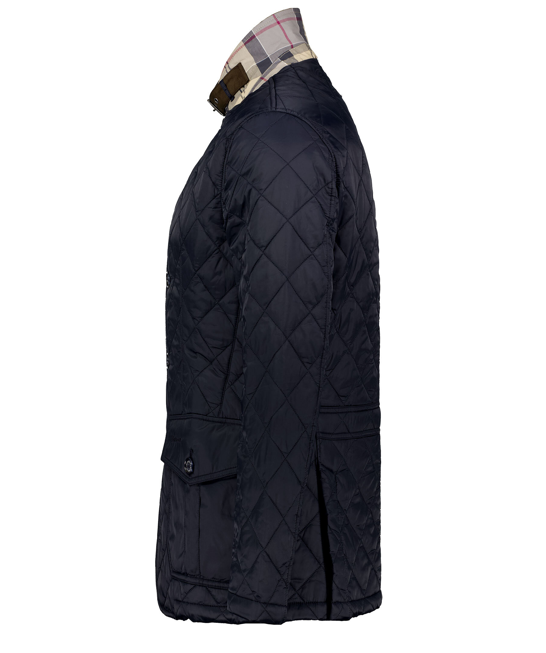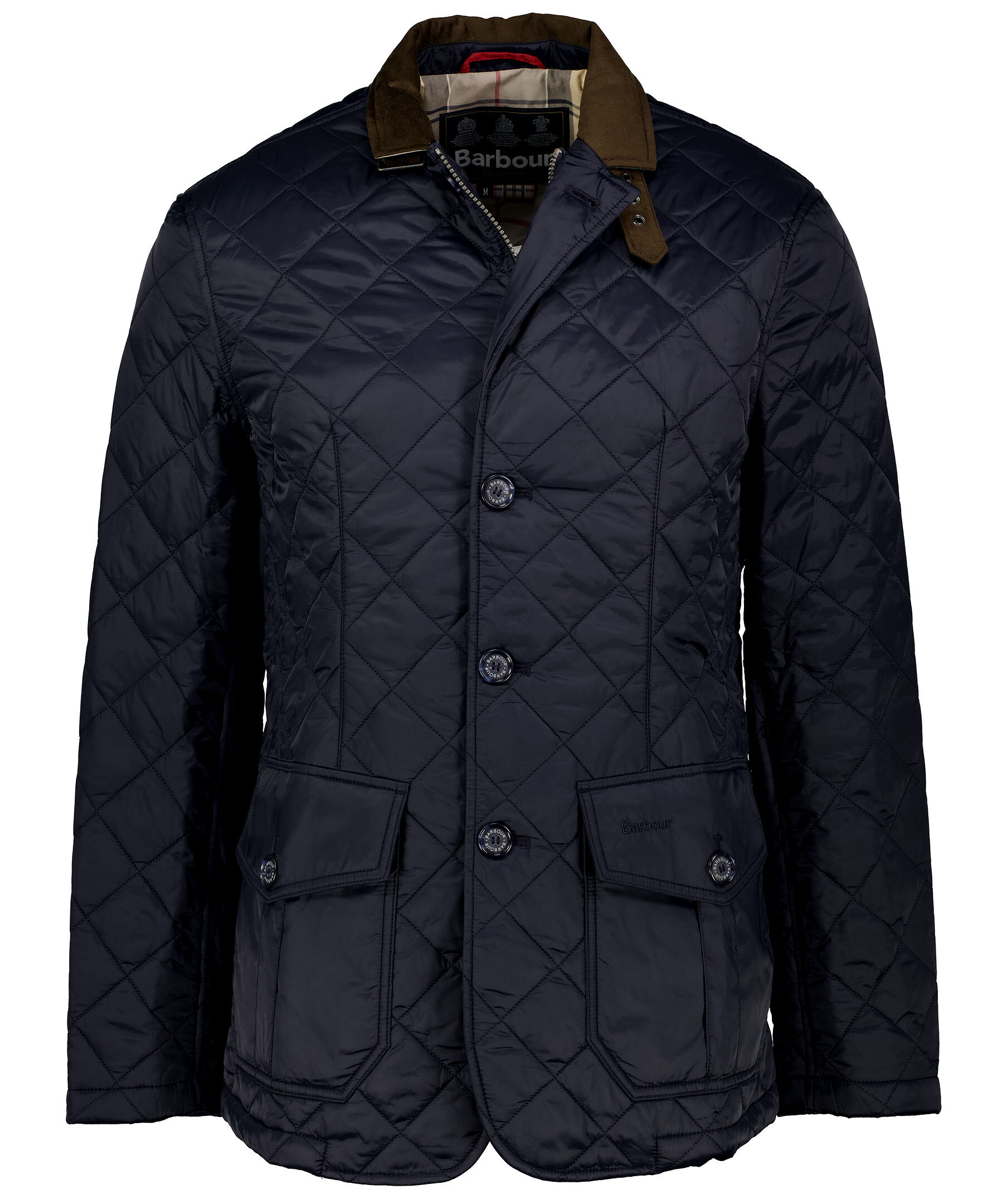 Marinblå quiltad jacka i 100% polyamid från Barbour. Fodrad i polyester, har en krage med brunt foder och rutig baksida samt ett spänne fram. Två fickor fram med ficklock och knapp, diskret logga på vänster ficklock och två innerfickor med dragkedja. Dubbla sprund bak med tryckknappar. Stängs med dold tvåvägsdragkedja och knappar.
