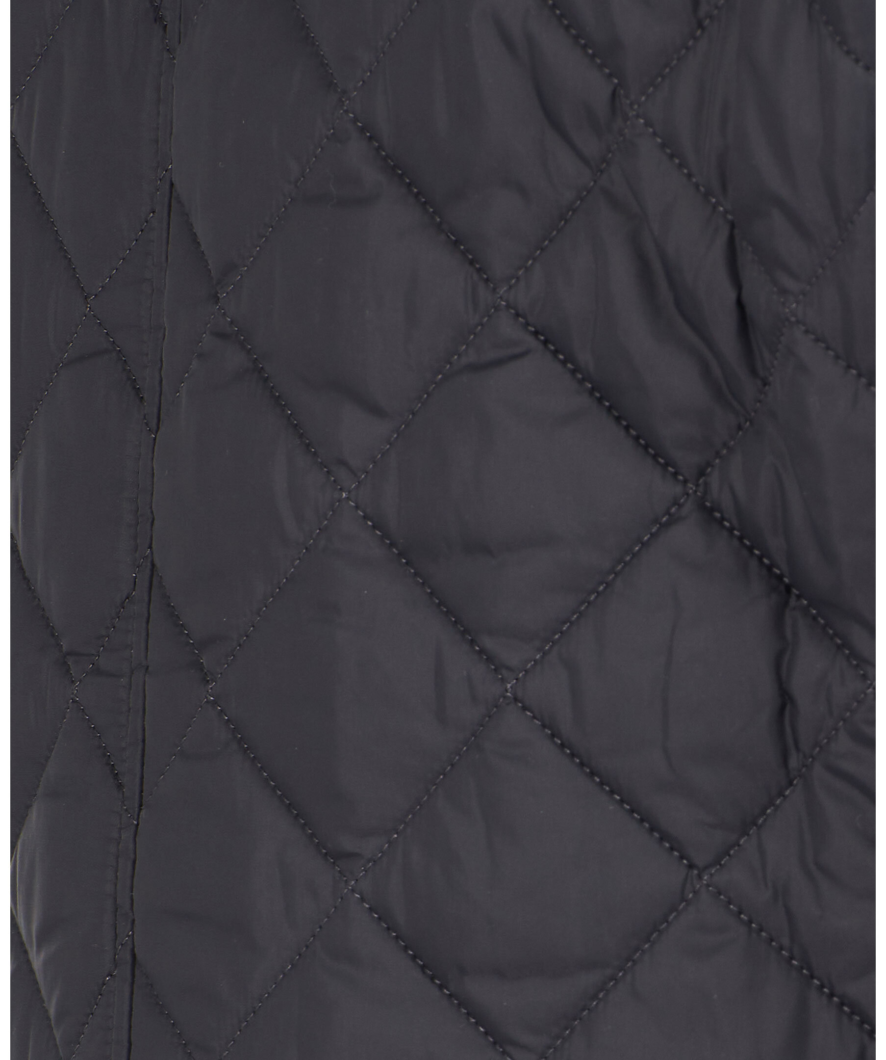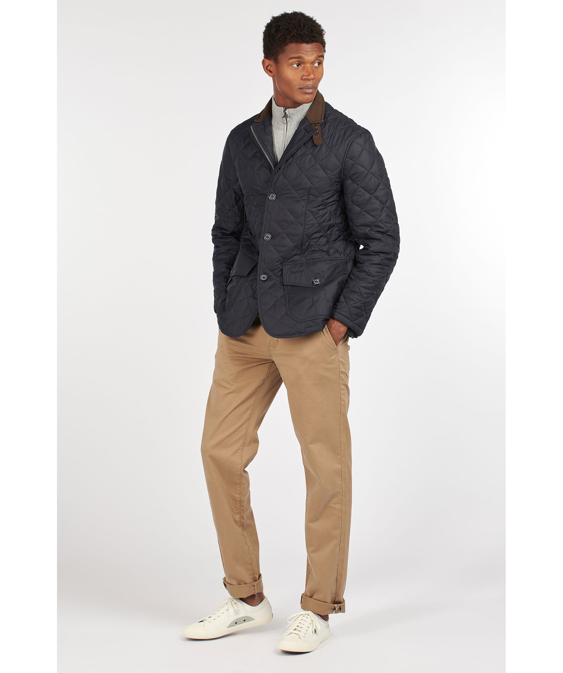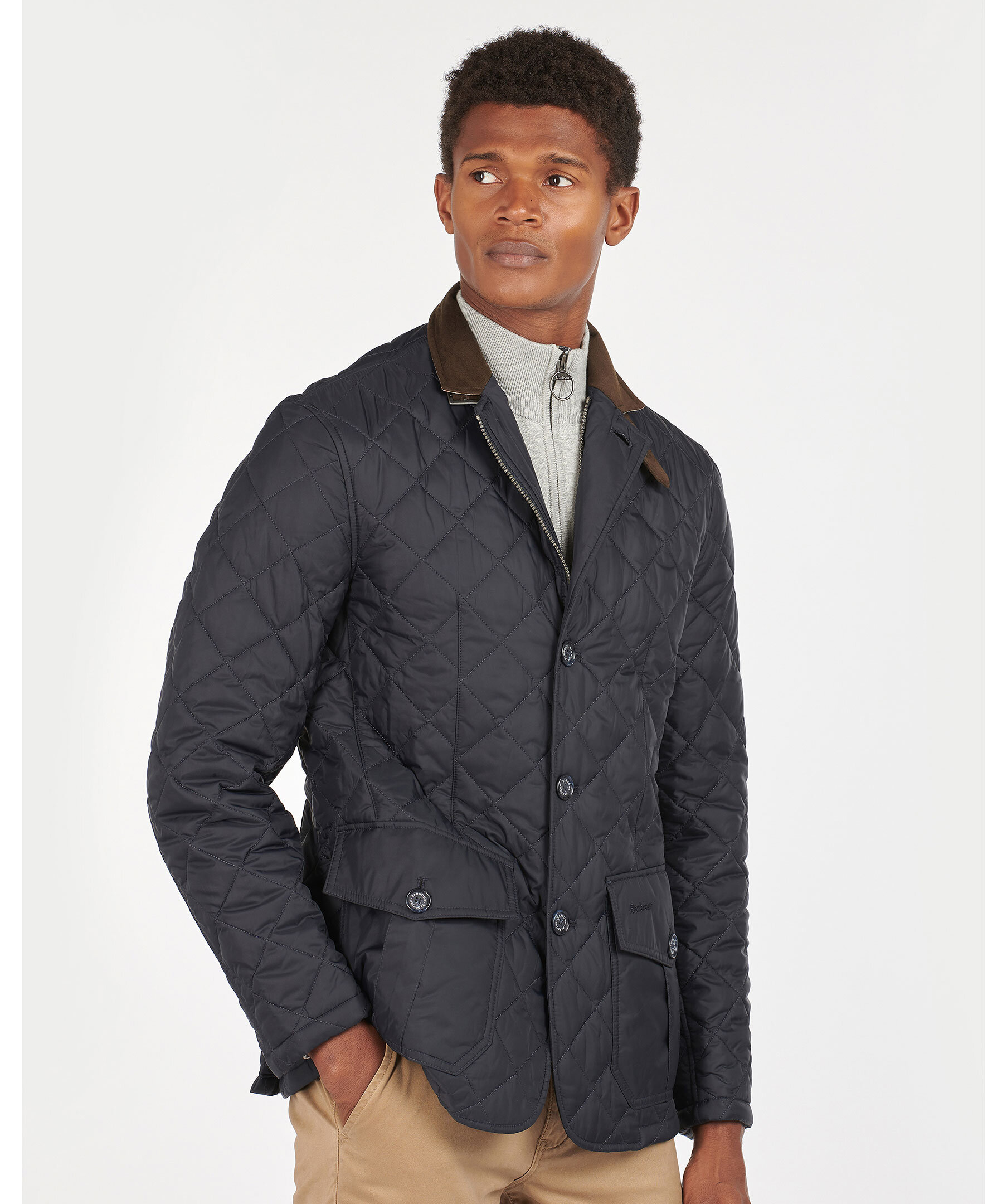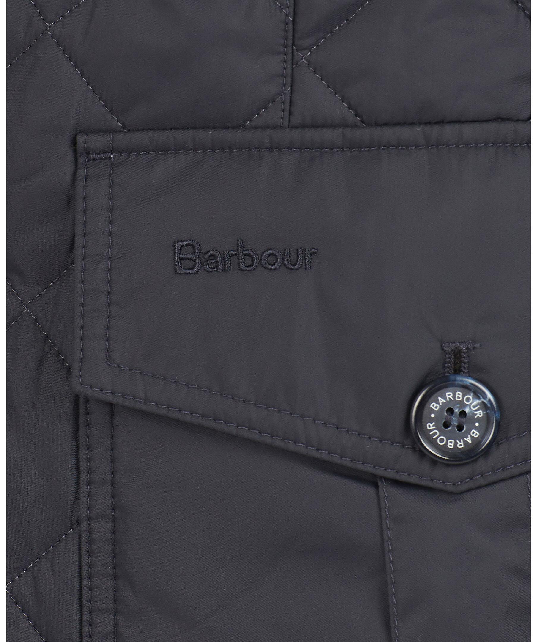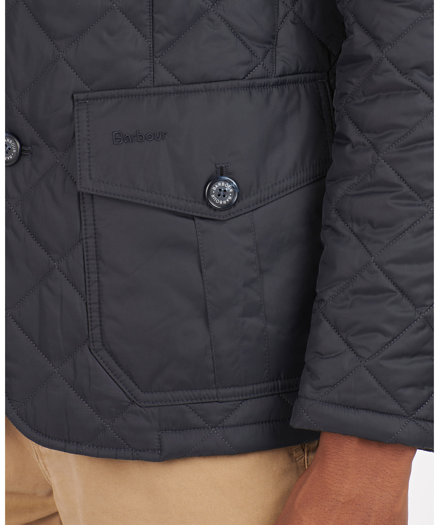 Marinblå quiltad jacka i 100% polyamid från Barbour. Fodrad i polyester, har en krage med brunt foder och rutig baksida samt ett spänne fram. Två fickor fram med ficklock och knapp, diskret logga på vänster ficklock och två innerfickor med dragkedja. Dubbla sprund bak med tryckknappar. Stängs med dold tvåvägsdragkedja och knappar.