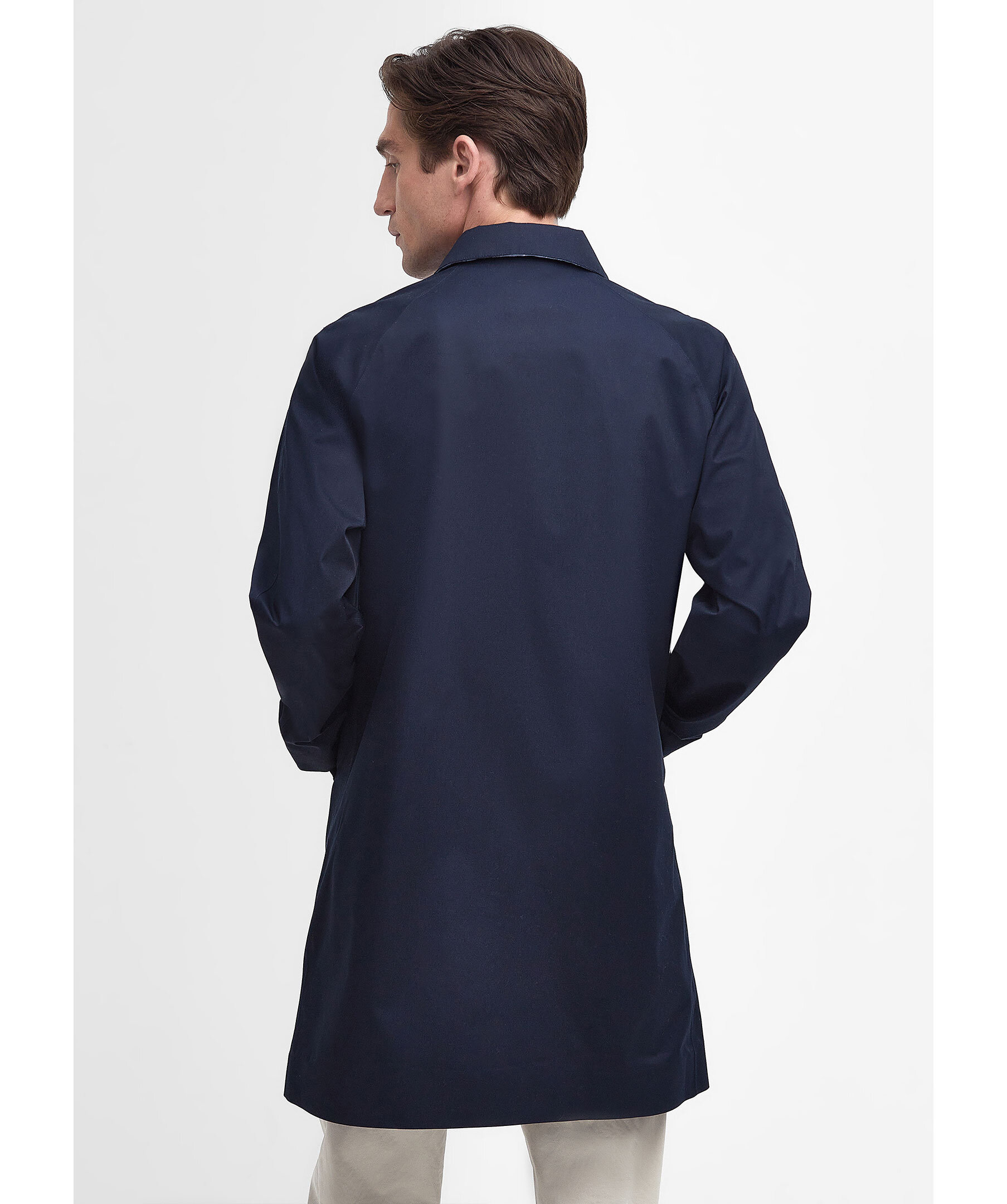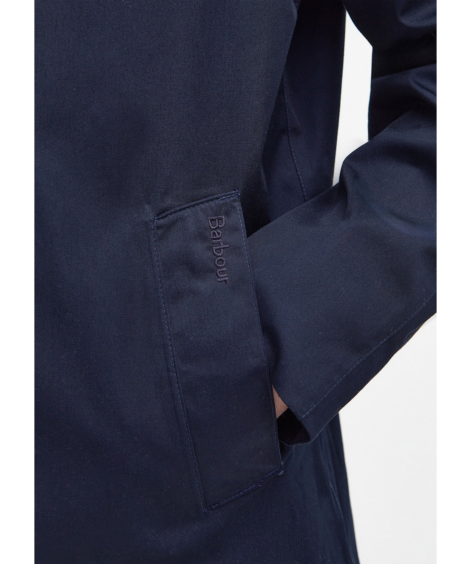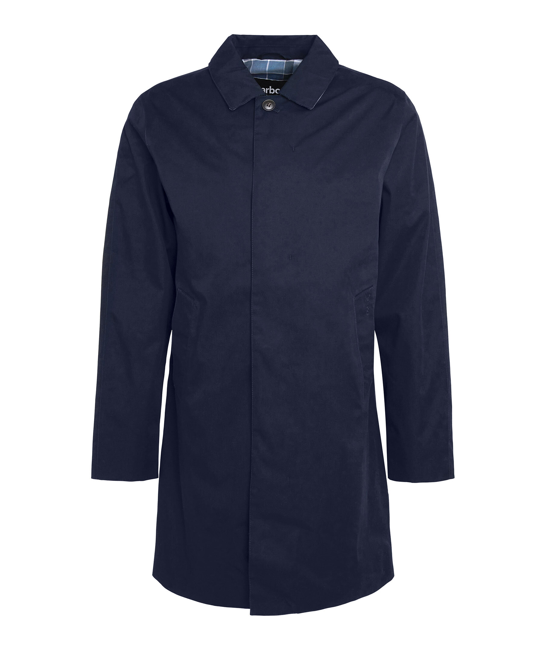 Marinblå rock från Barbour. Tillverkad av ett lätt vattentätt tyg för att hålla alla sommarduschar borta, den här jackan i mac-stil är perfekt att ta på sig över vilken avslappnad look som helst. Skär till en medellängd med dubbla passpoalfickor, den är avslutad med tartan och meshfoder på insidan. Skräddarsydd passform.