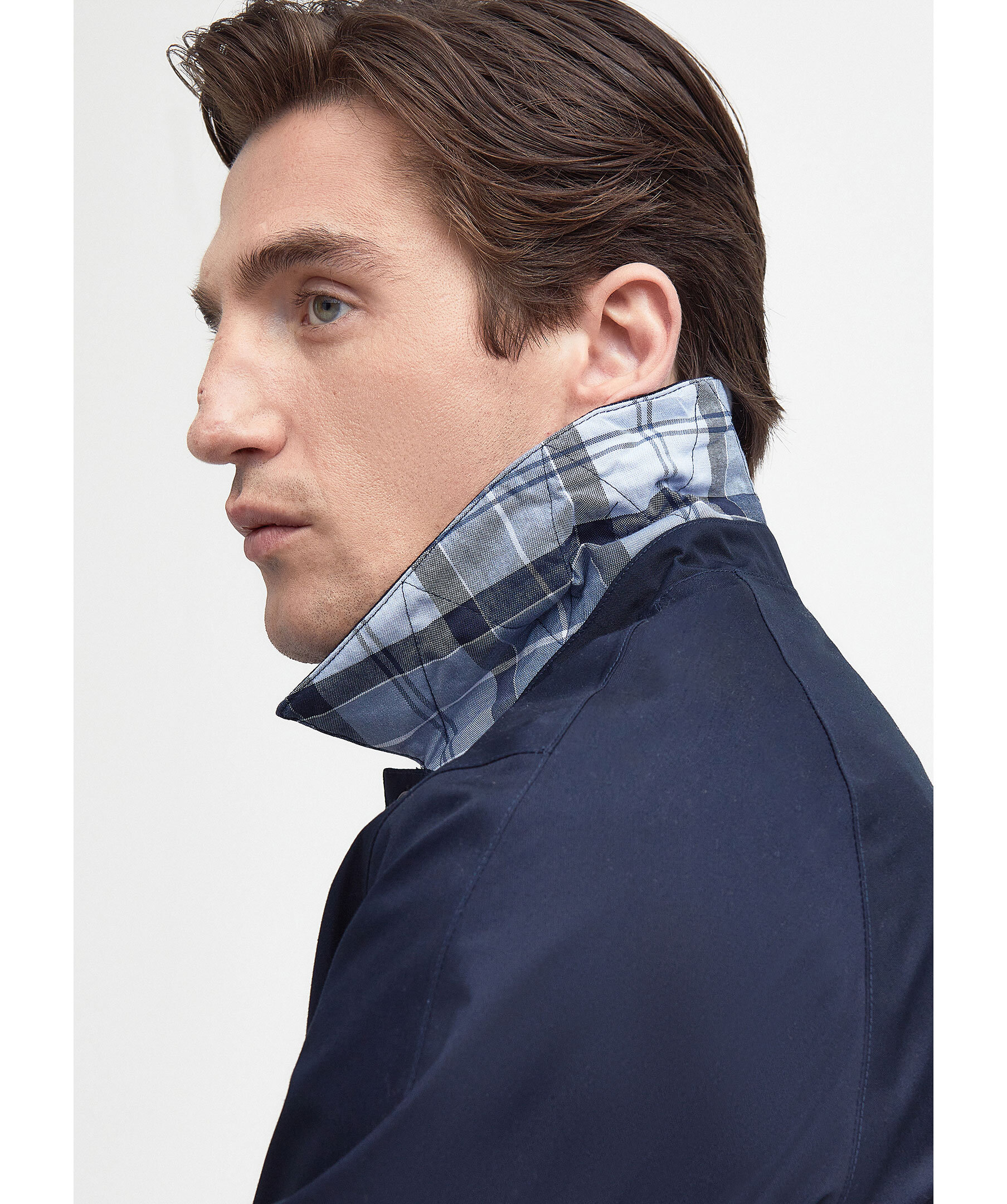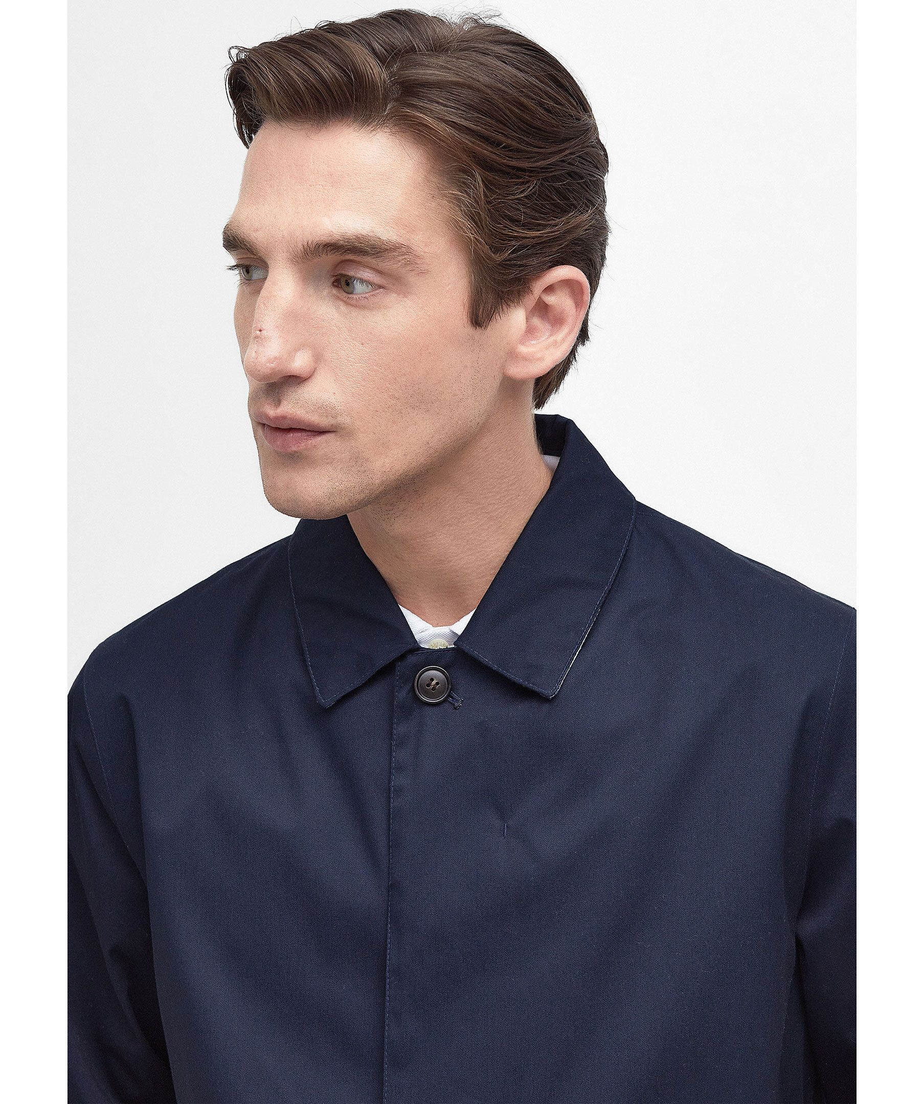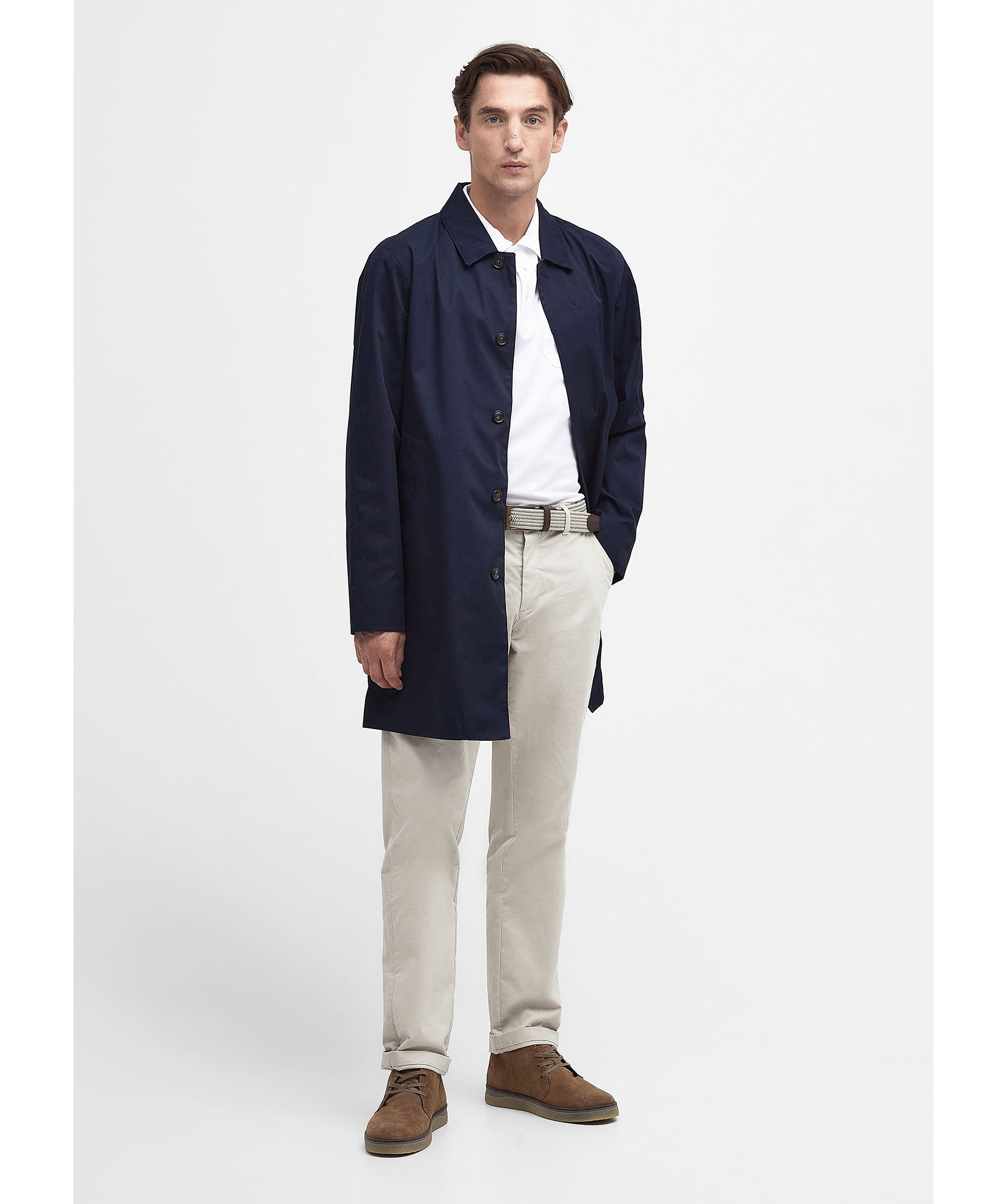 Marinblå rock från Barbour. Tillverkad av ett lätt vattentätt tyg för att hålla alla sommarduschar borta, den här jackan i mac-stil är perfekt att ta på sig över vilken avslappnad look som helst. Skär till en medellängd med dubbla passpoalfickor, den är avslutad med tartan och meshfoder på insidan. Skräddarsydd passform.