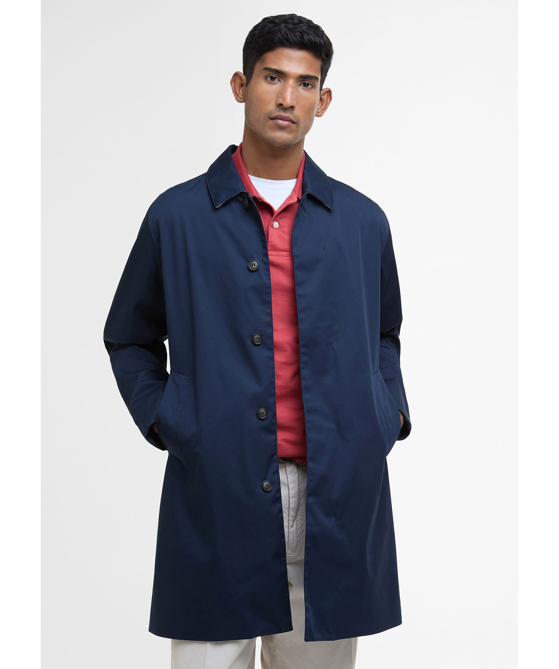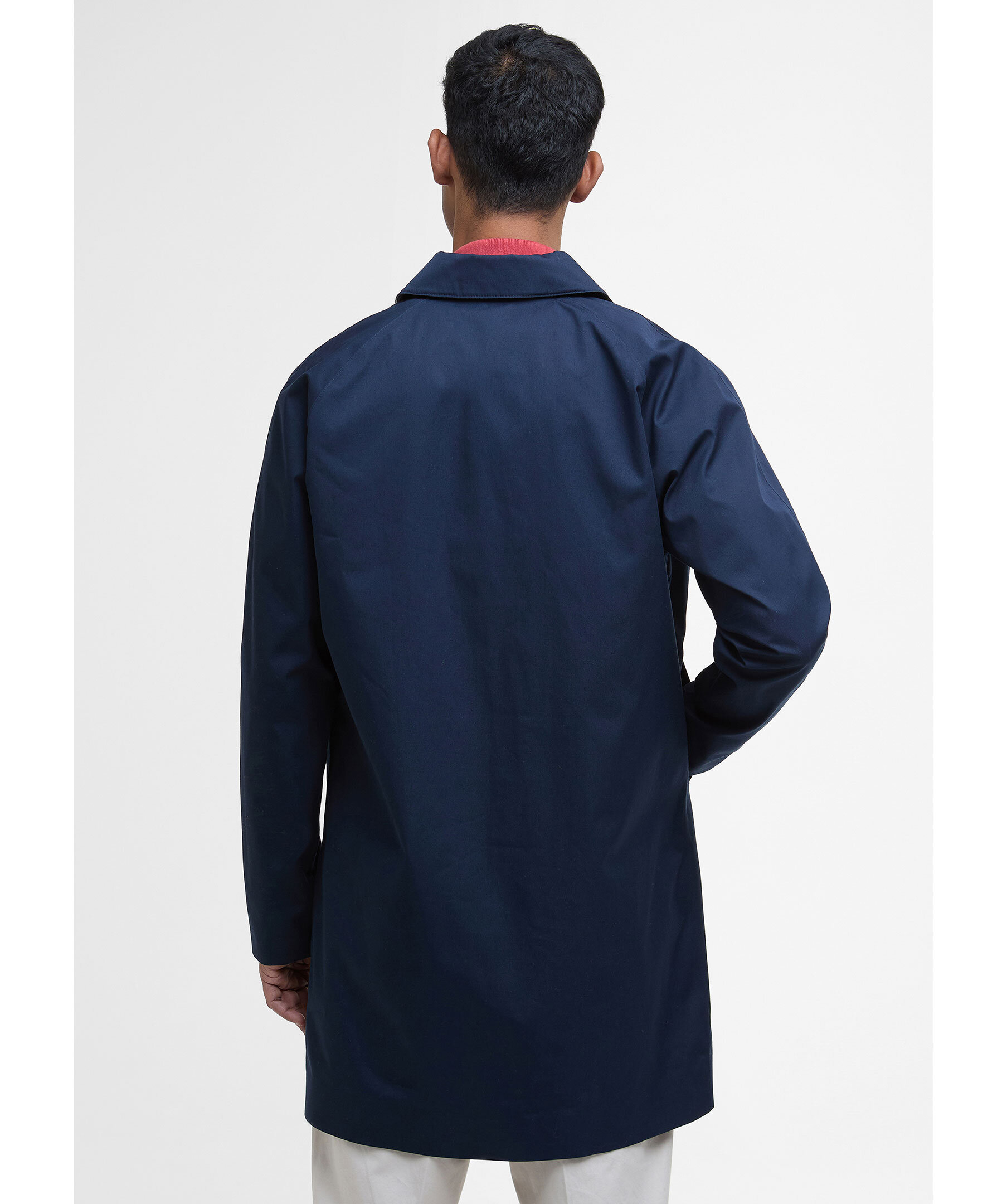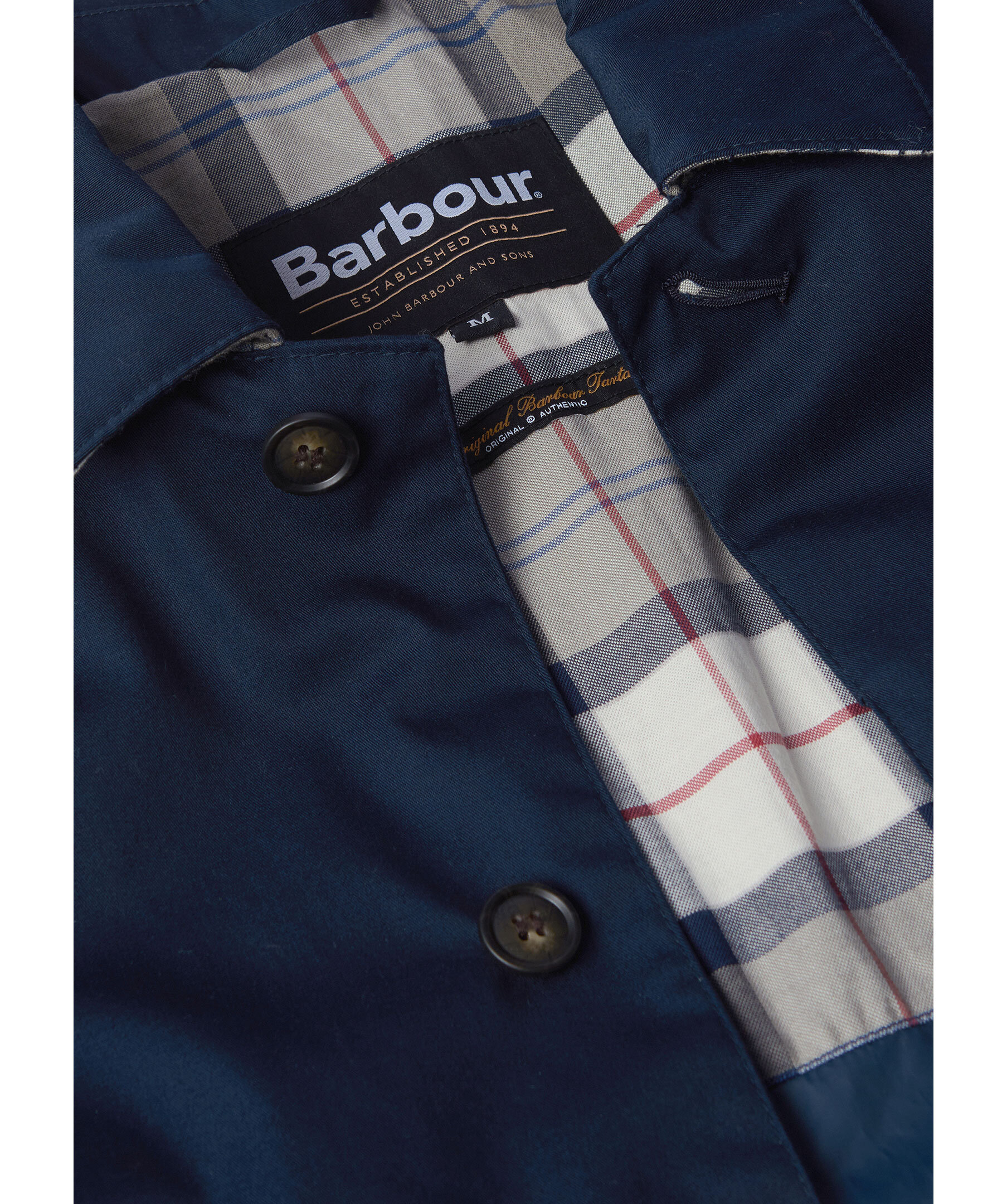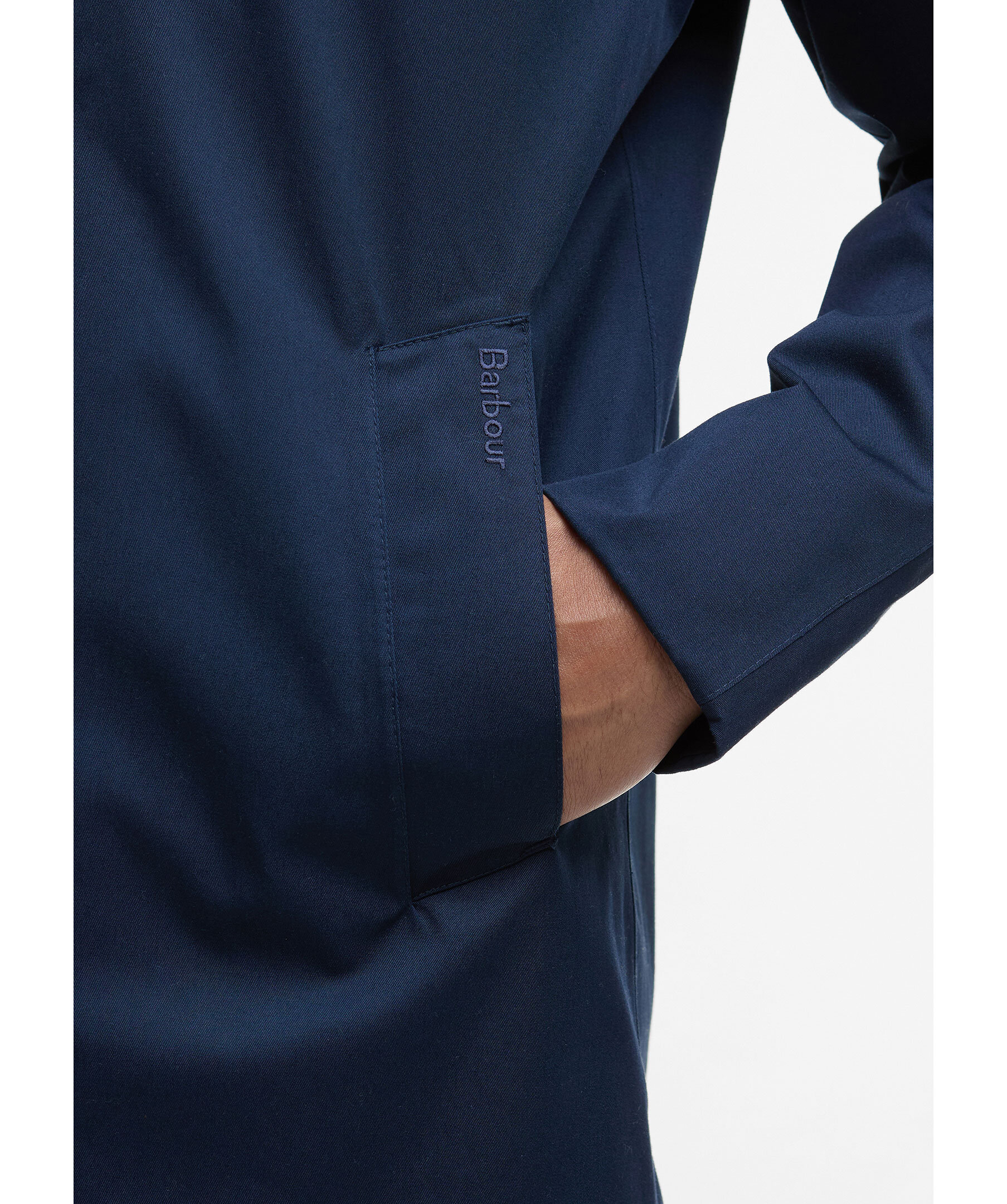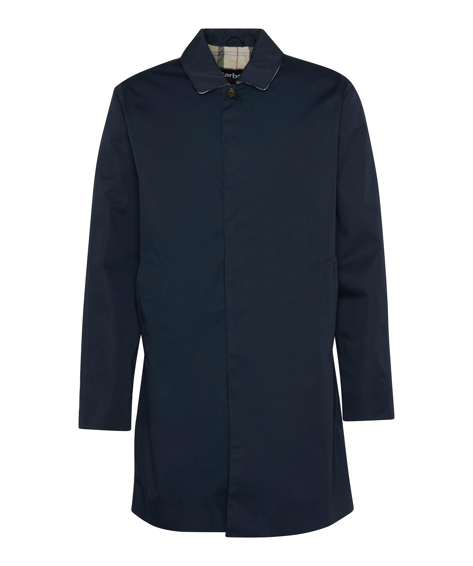 Marinblå rock från Barbour. Tillverkad av ett lätt vattentätt tyg för att hålla alla sommarduschar borta, den här jackan i mac-stil är perfekt att ta på sig över vilken avslappnad look som helst. Skär till en medellängd med dubbla passpoalfickor, den är avslutad med tartan och meshfoder på insidan. Skräddarsydd passform.