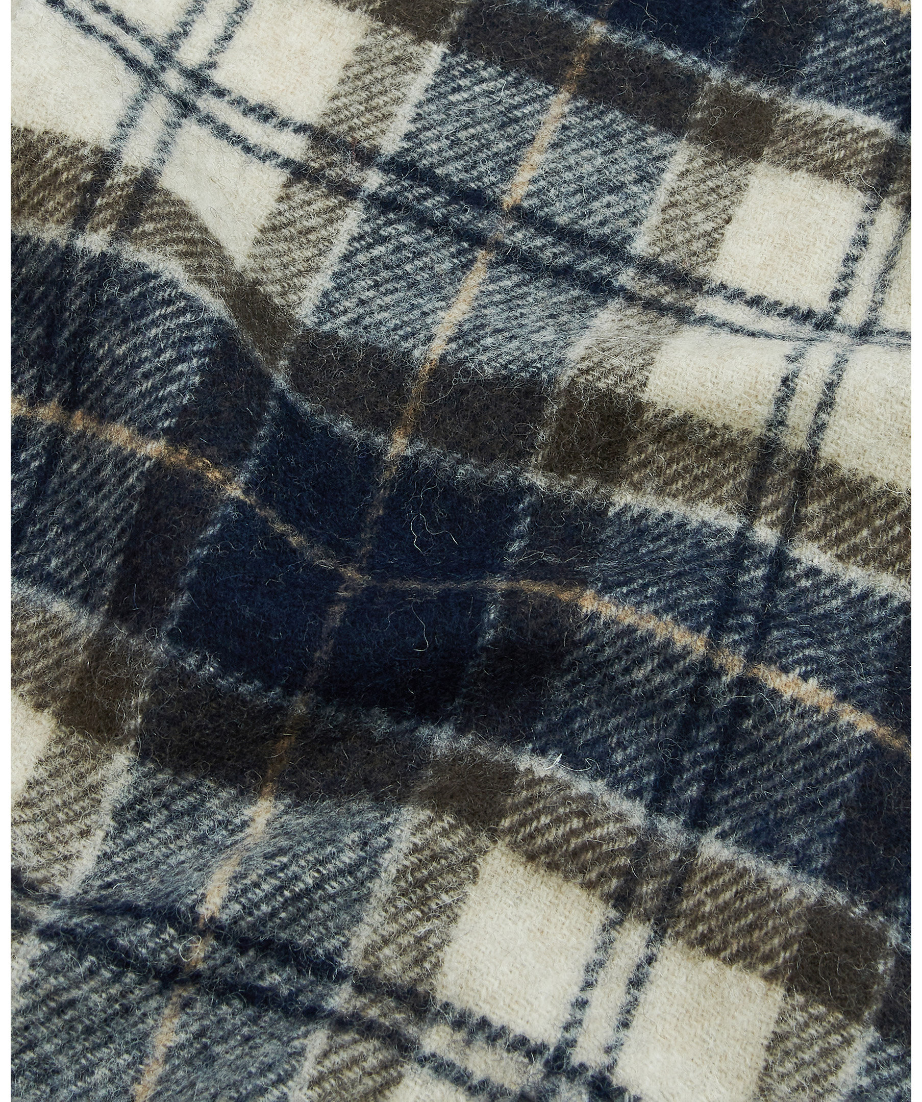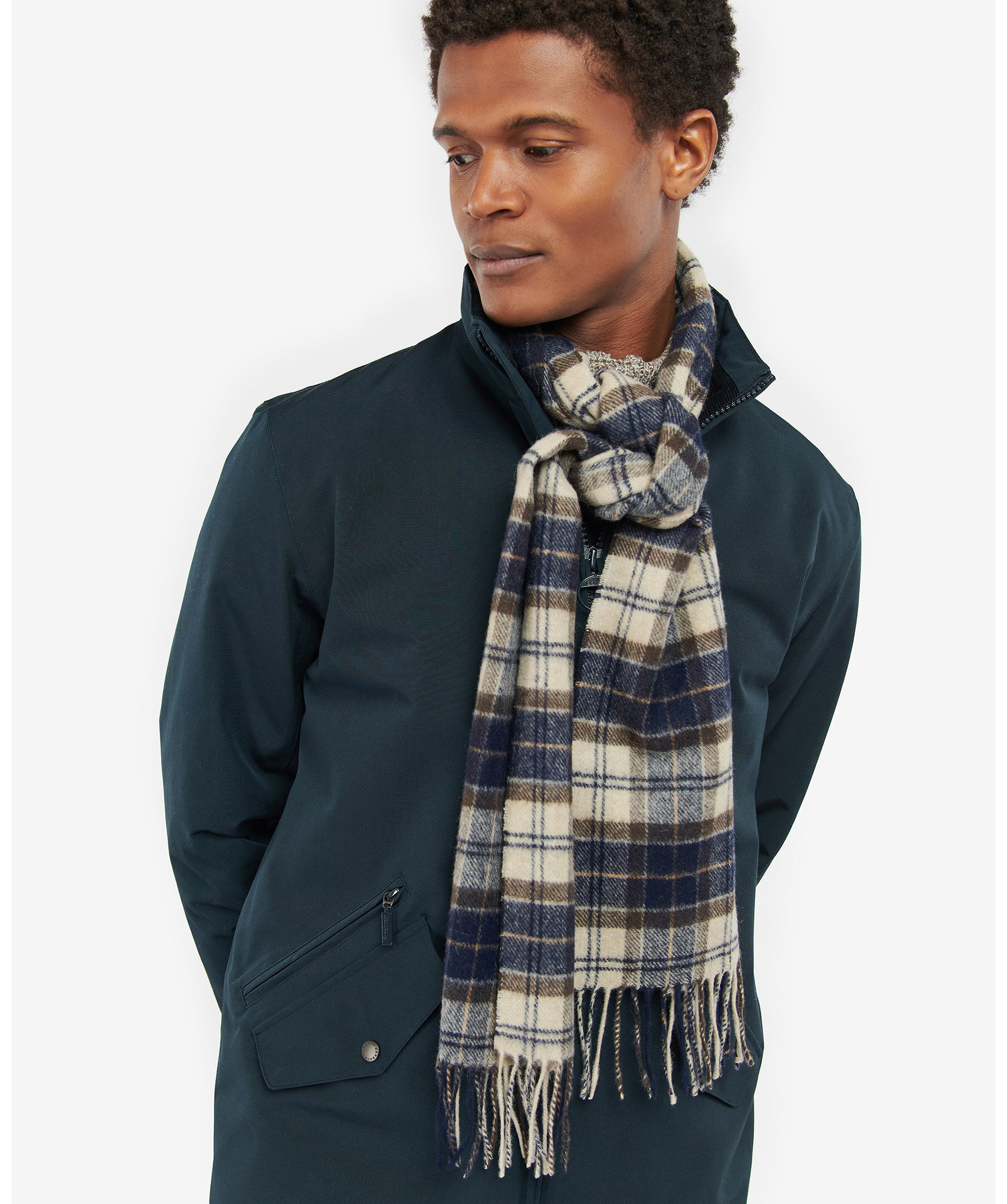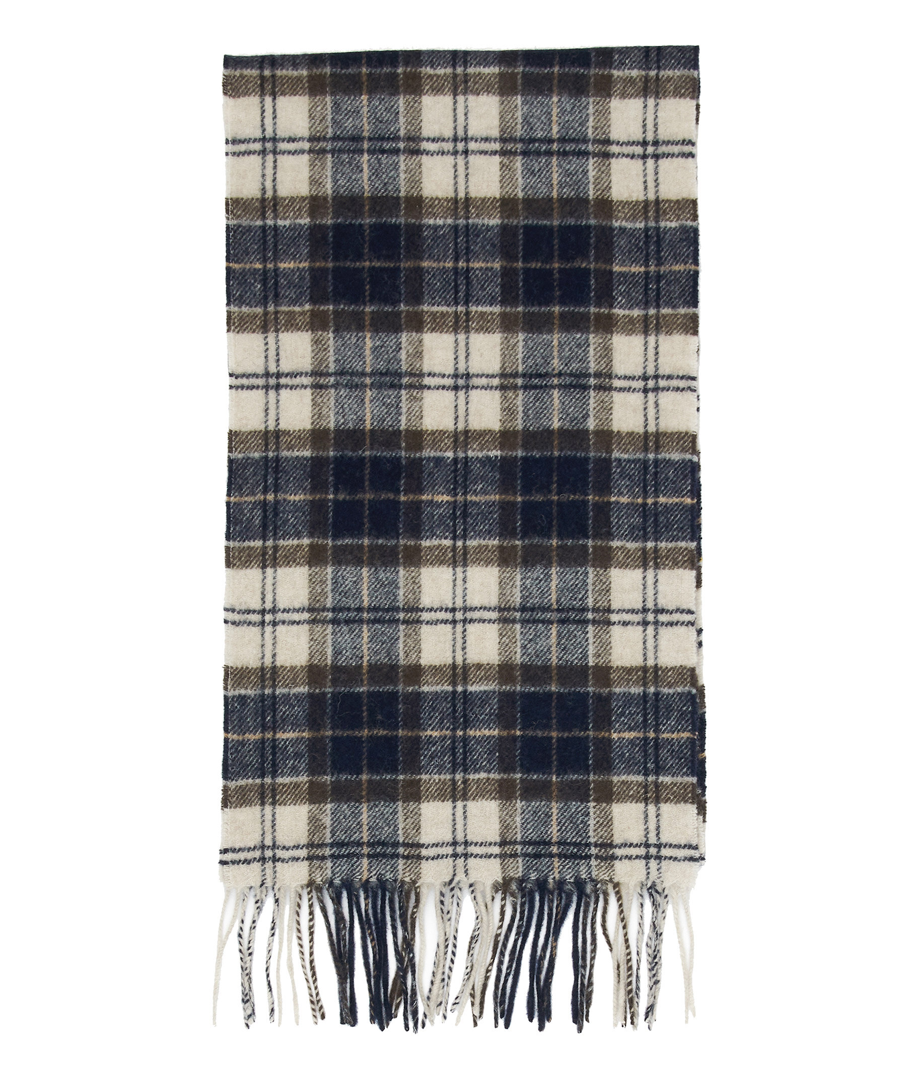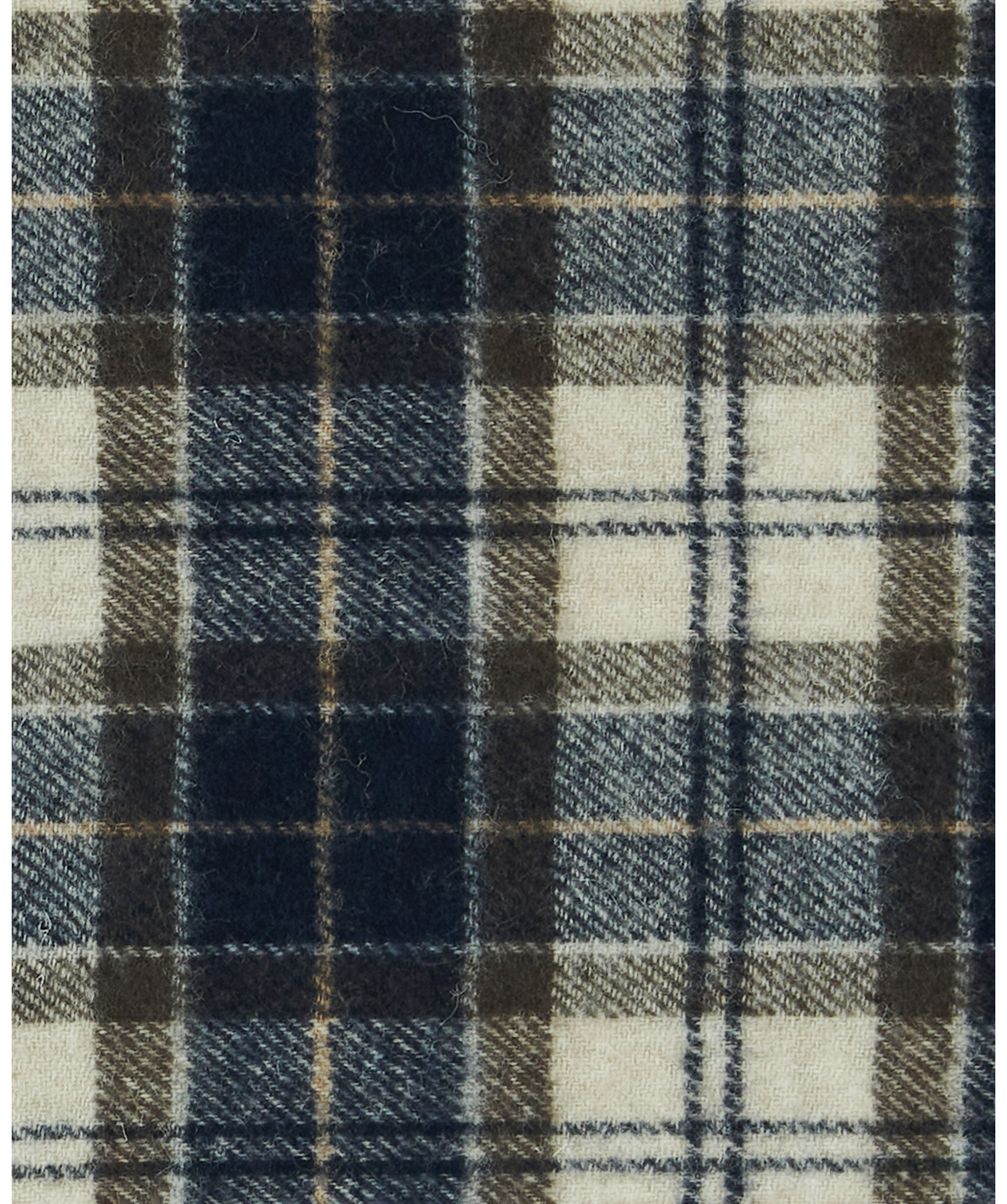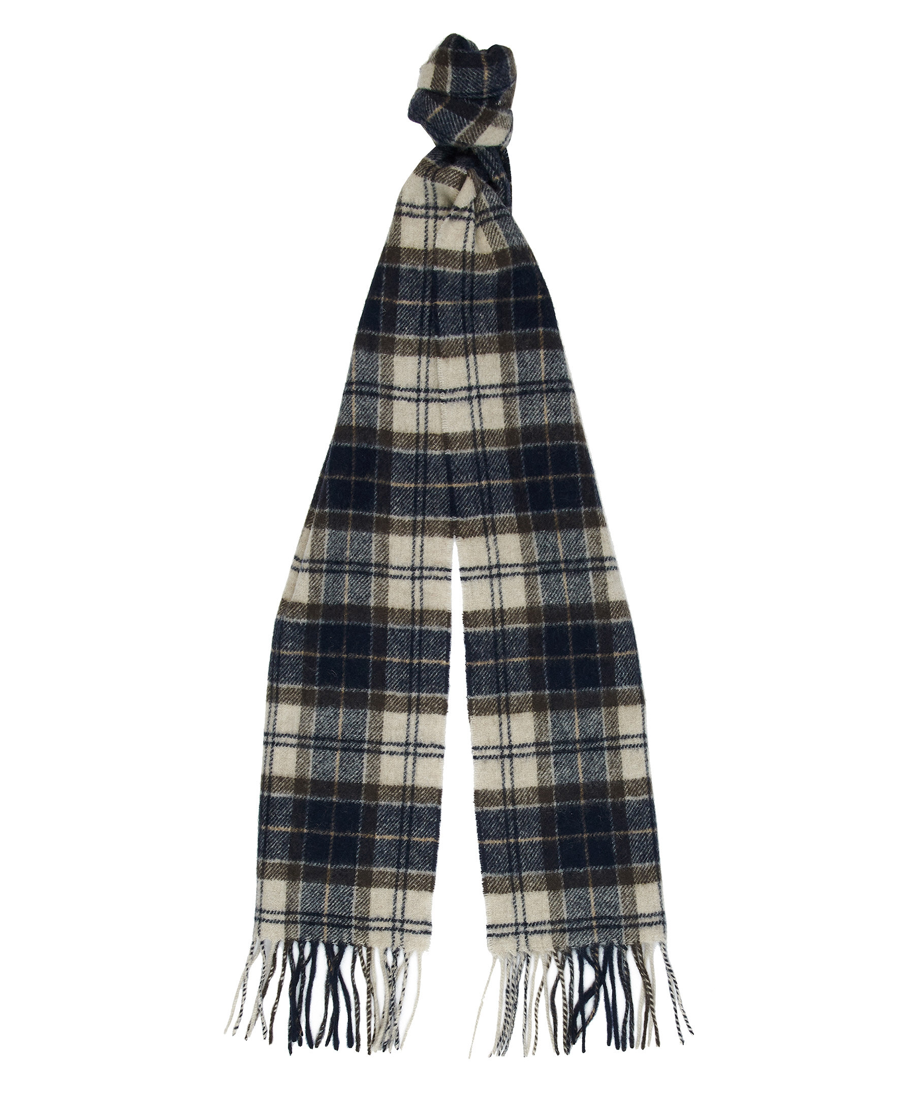 Klassiskt rutig halsduk i ull från Barbour i Marinblåt och krämvitt med bruna tunna streck. Fransar i kanterna. Tillverkad i 100% ull. Mått: 27 cm bredd, 184 cm längd.