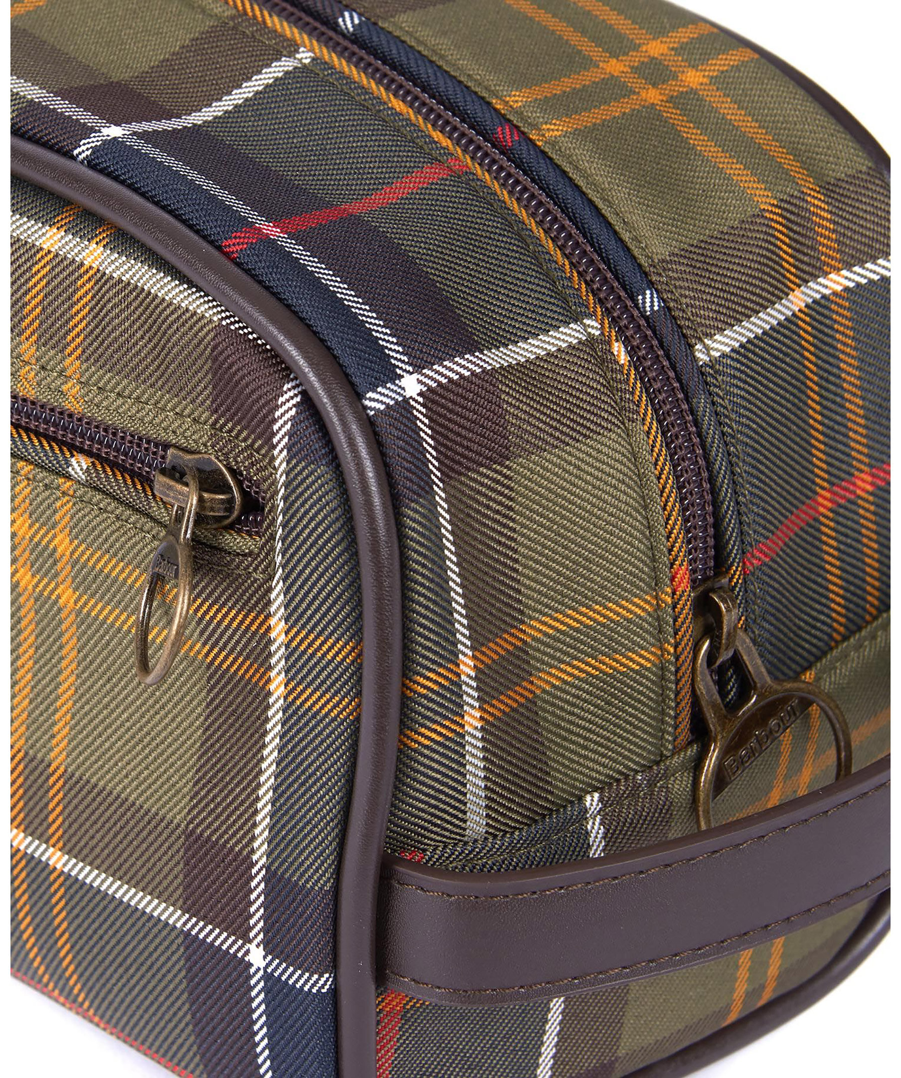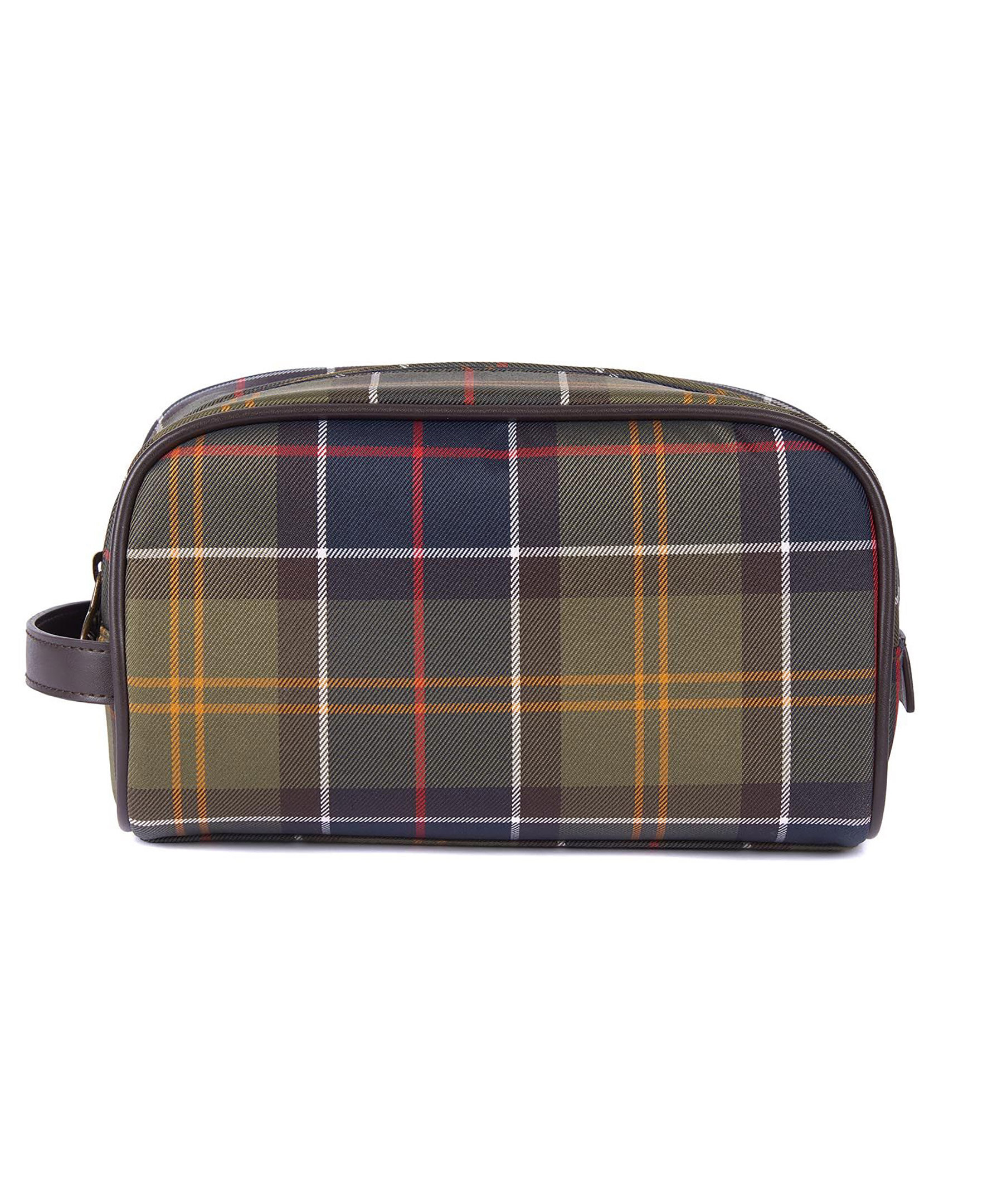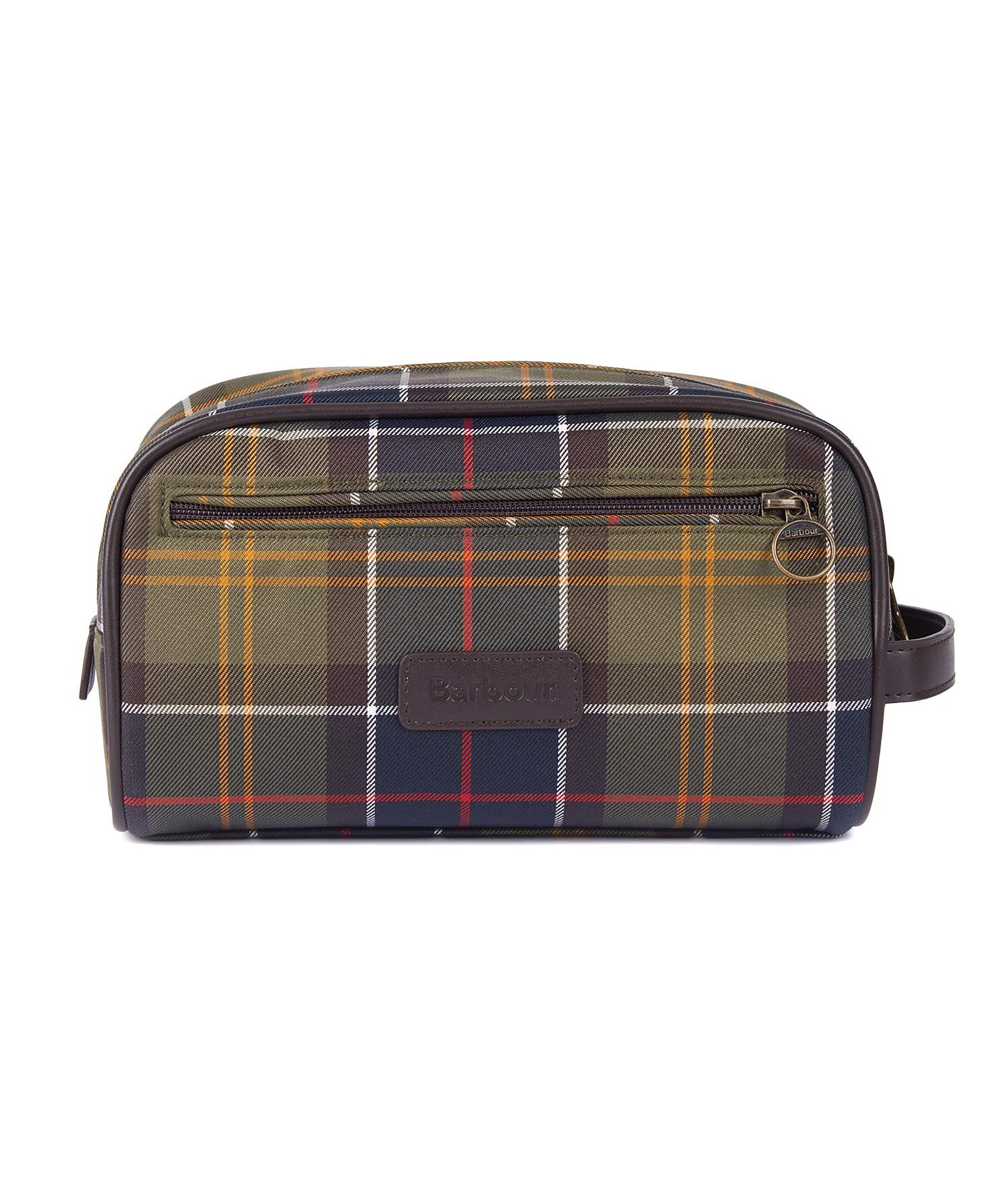 Mossgrön, rutig necessär från Barbour. Har tillräckligt med utrymme för alla dina badrumsartiklar. Yttersida och foder i 100% polyester, detaljer i konstläder och logotyp framtill. Stängs med dragkedja upptill, har en ficka på framsidan som stängs med dragkedja och ett handtag på sidan för att bära eller hänga upp necessären i.
