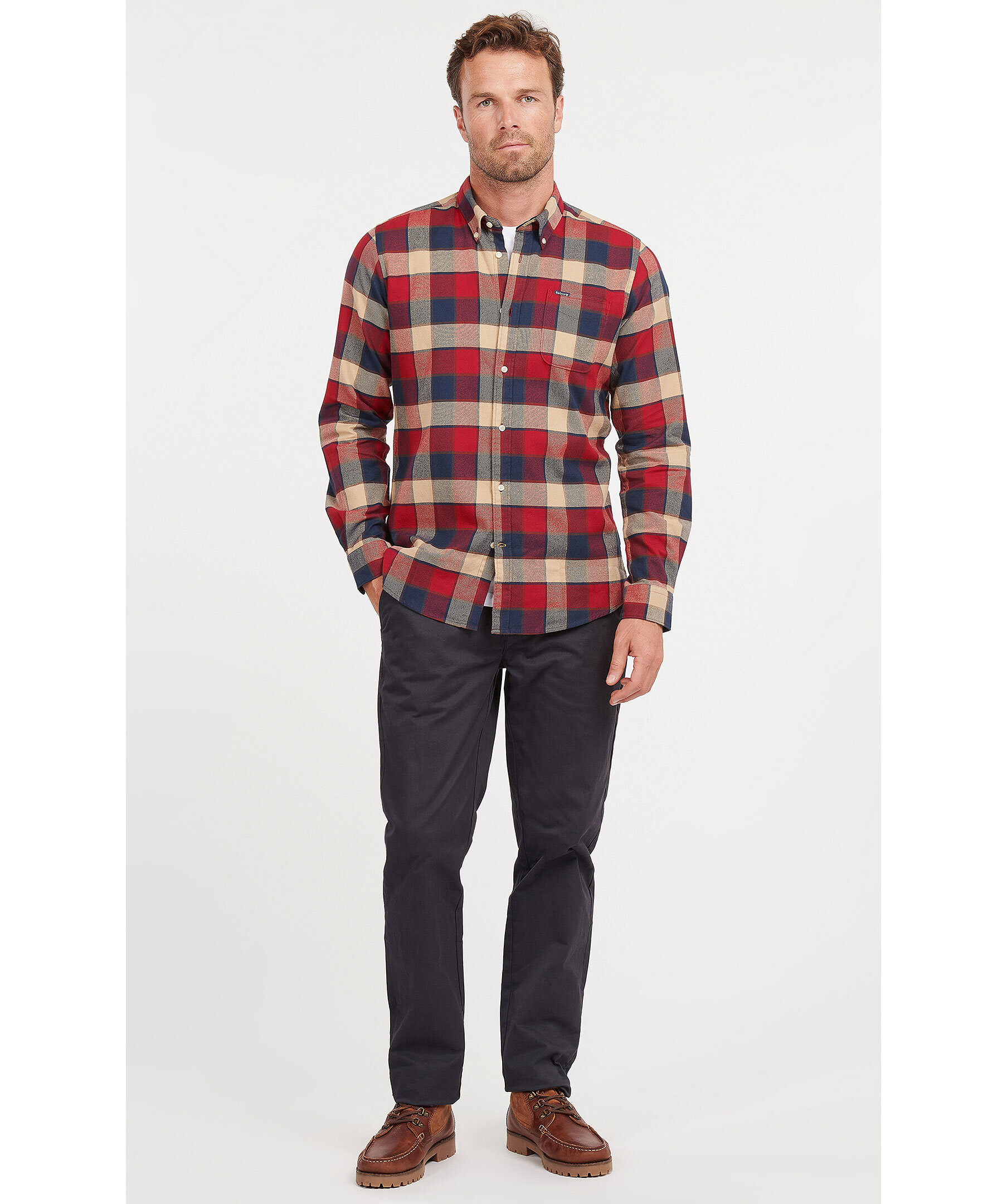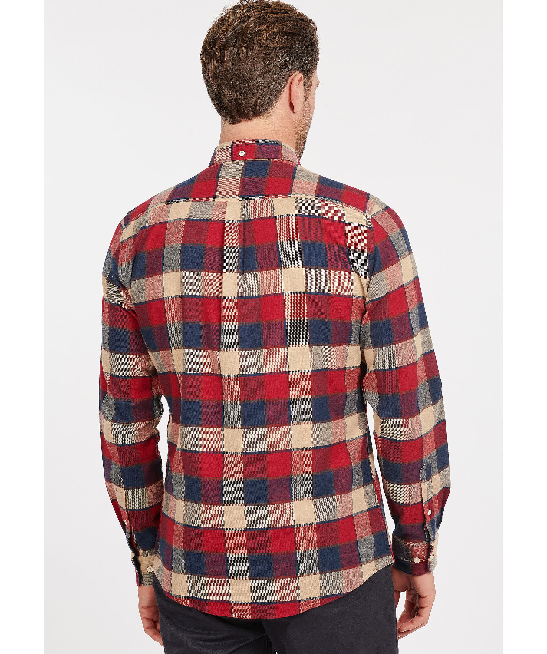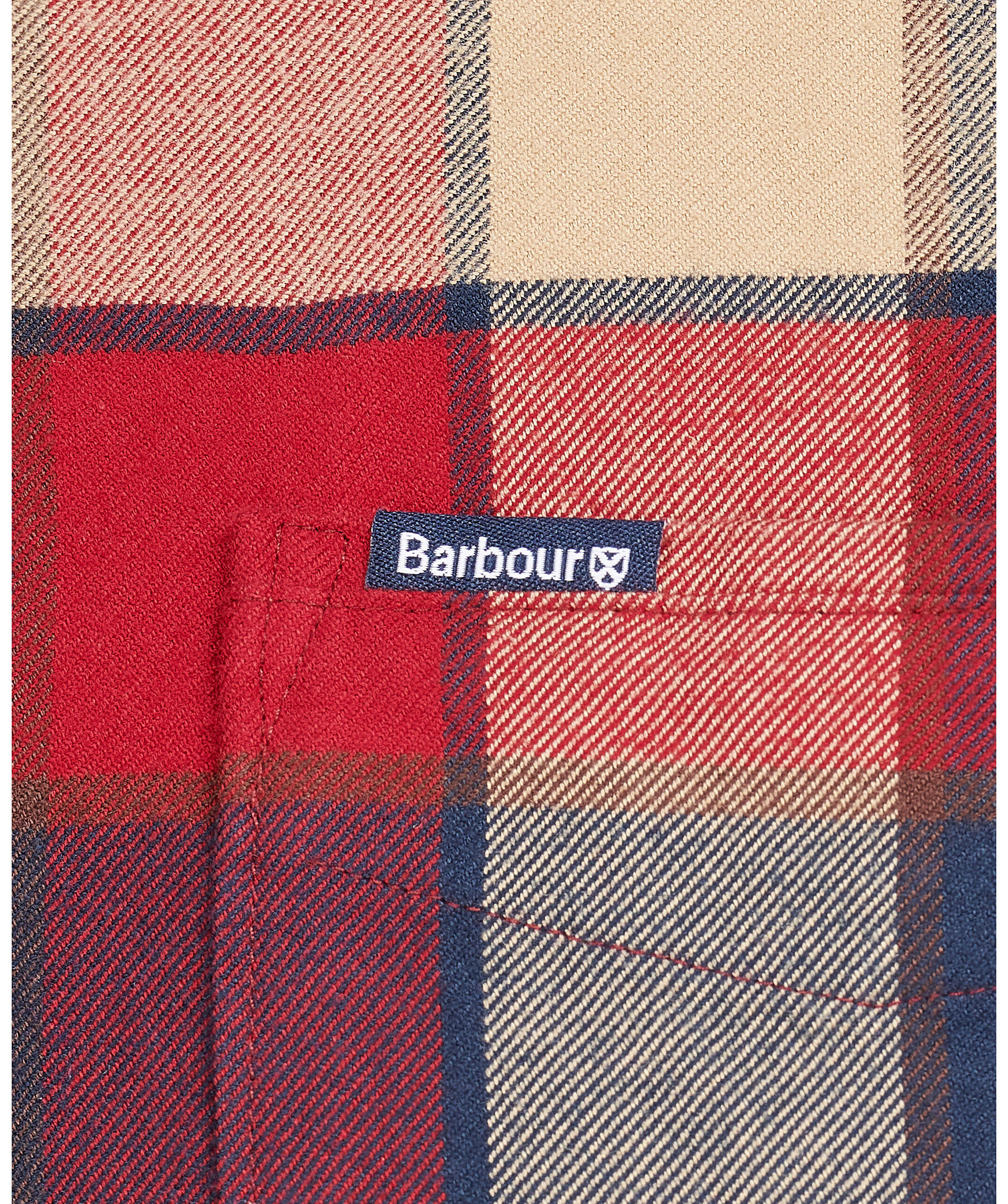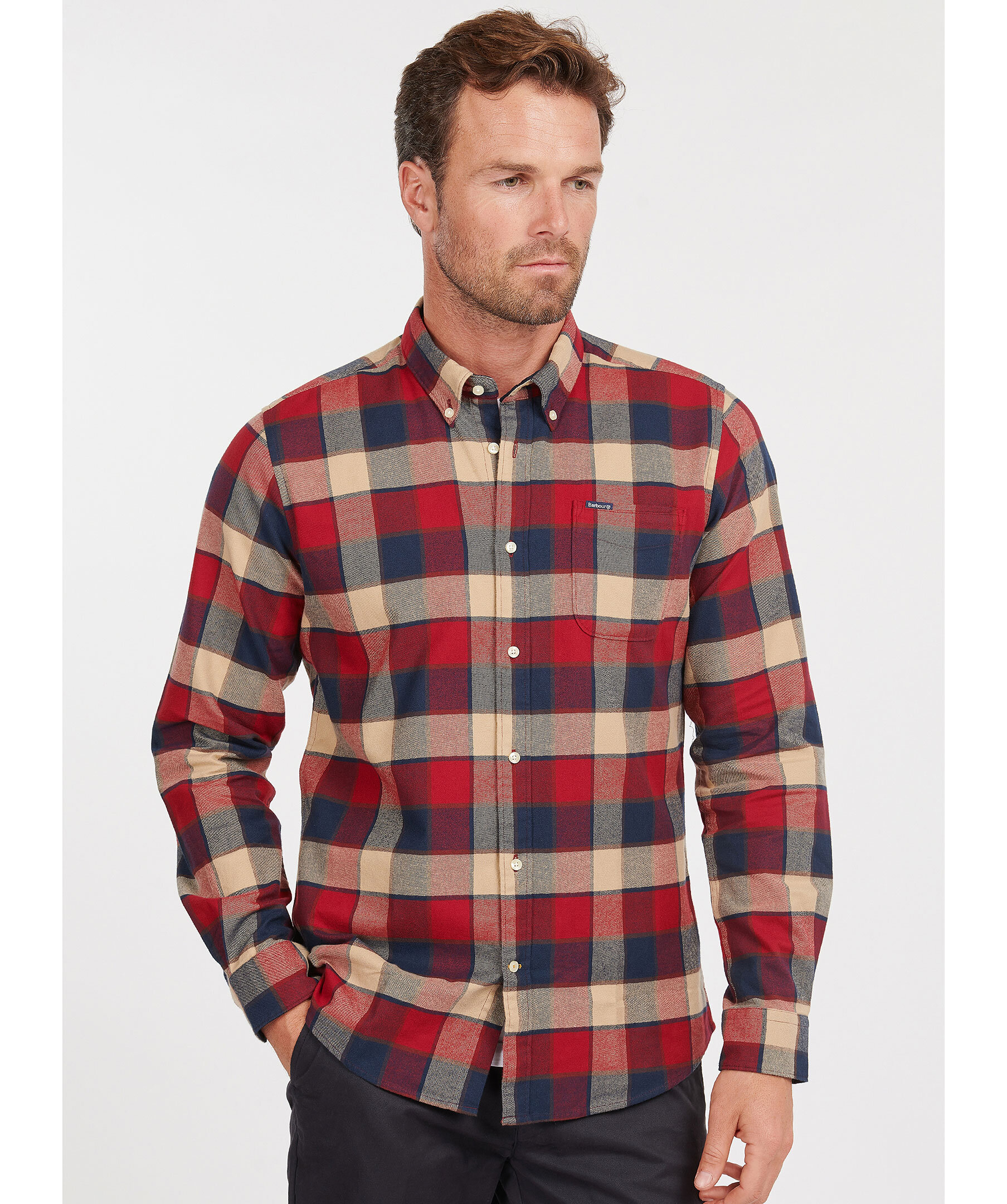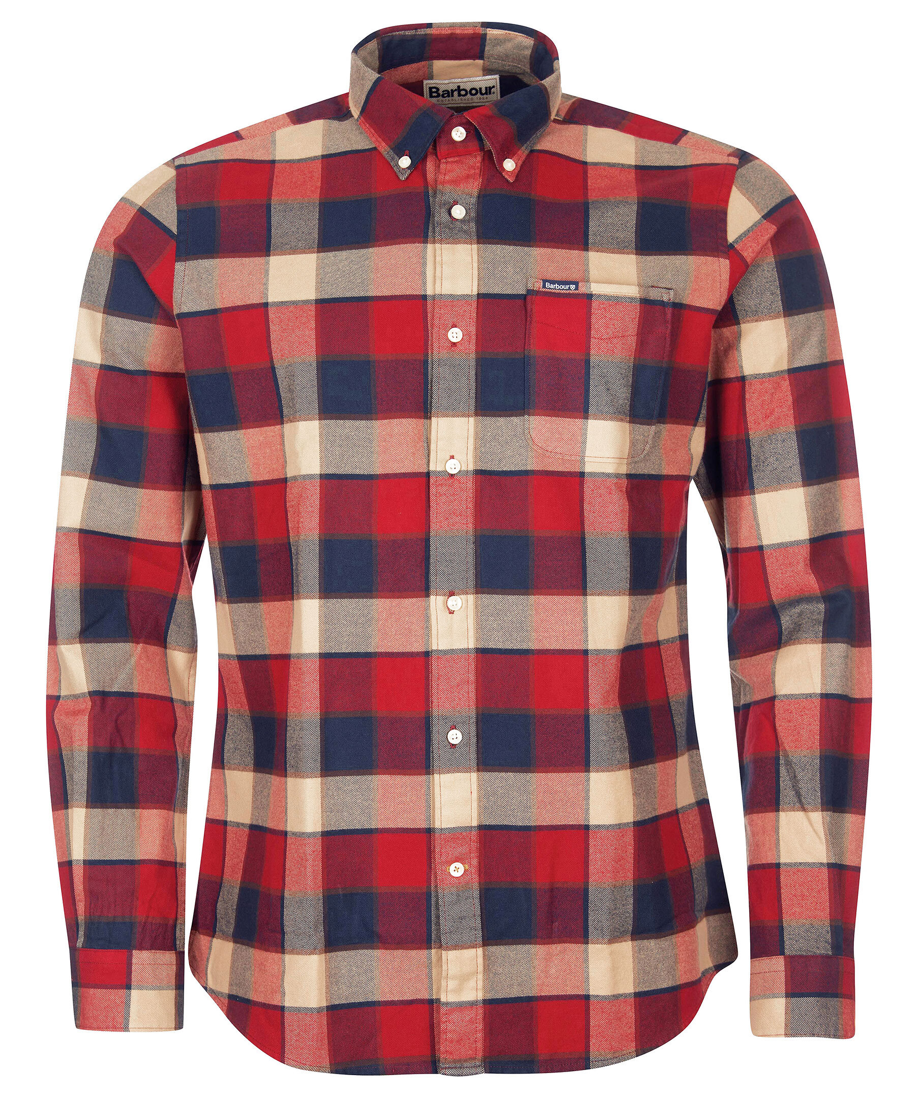 Röd, beige och blårutig flanellskjorta från Barbour. Tillverkad i mjuk bomull. Button down krage, tailored fit, bröstficka med liten logotyp i tyg. Vita knappar fram och i ärmslut.