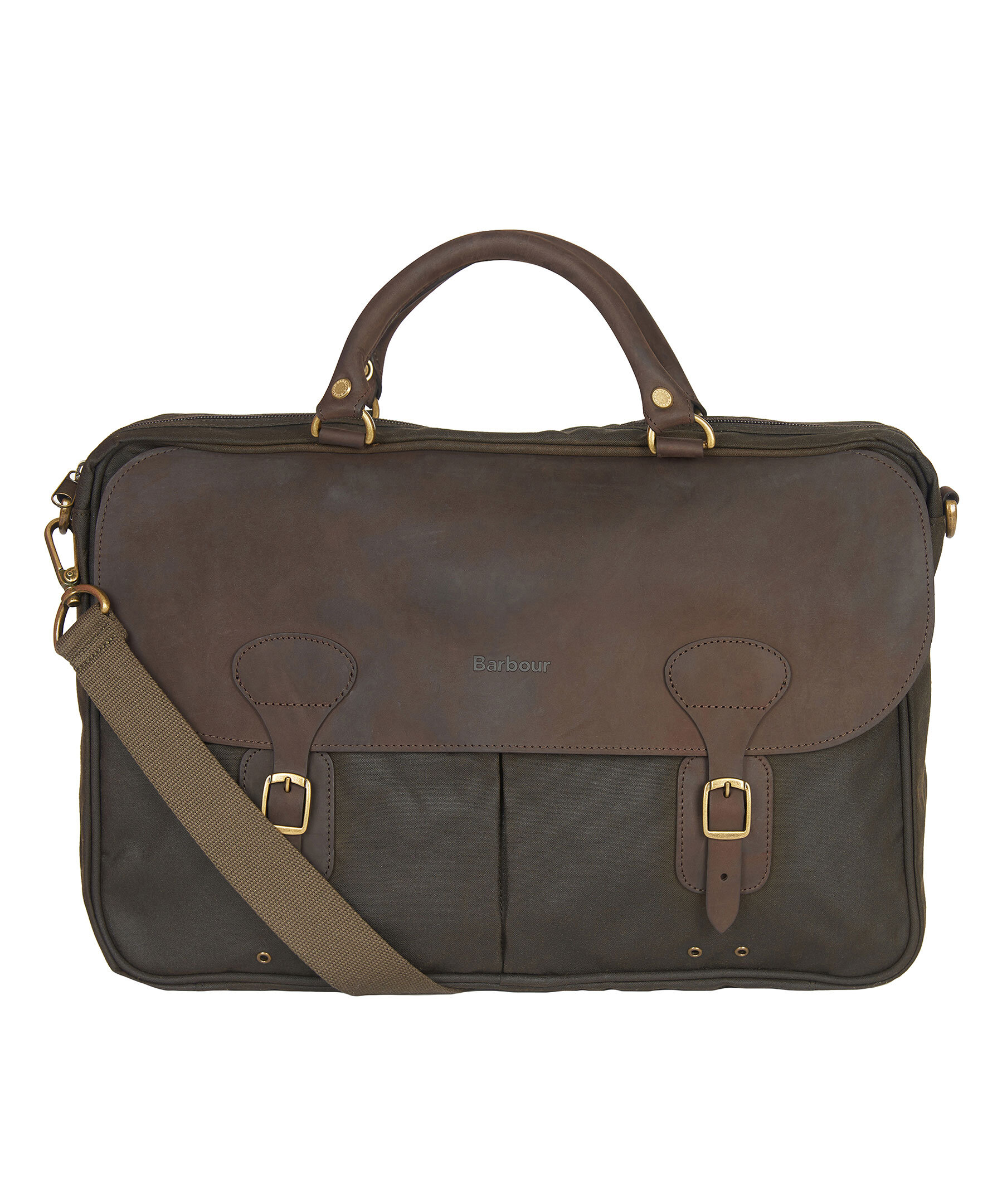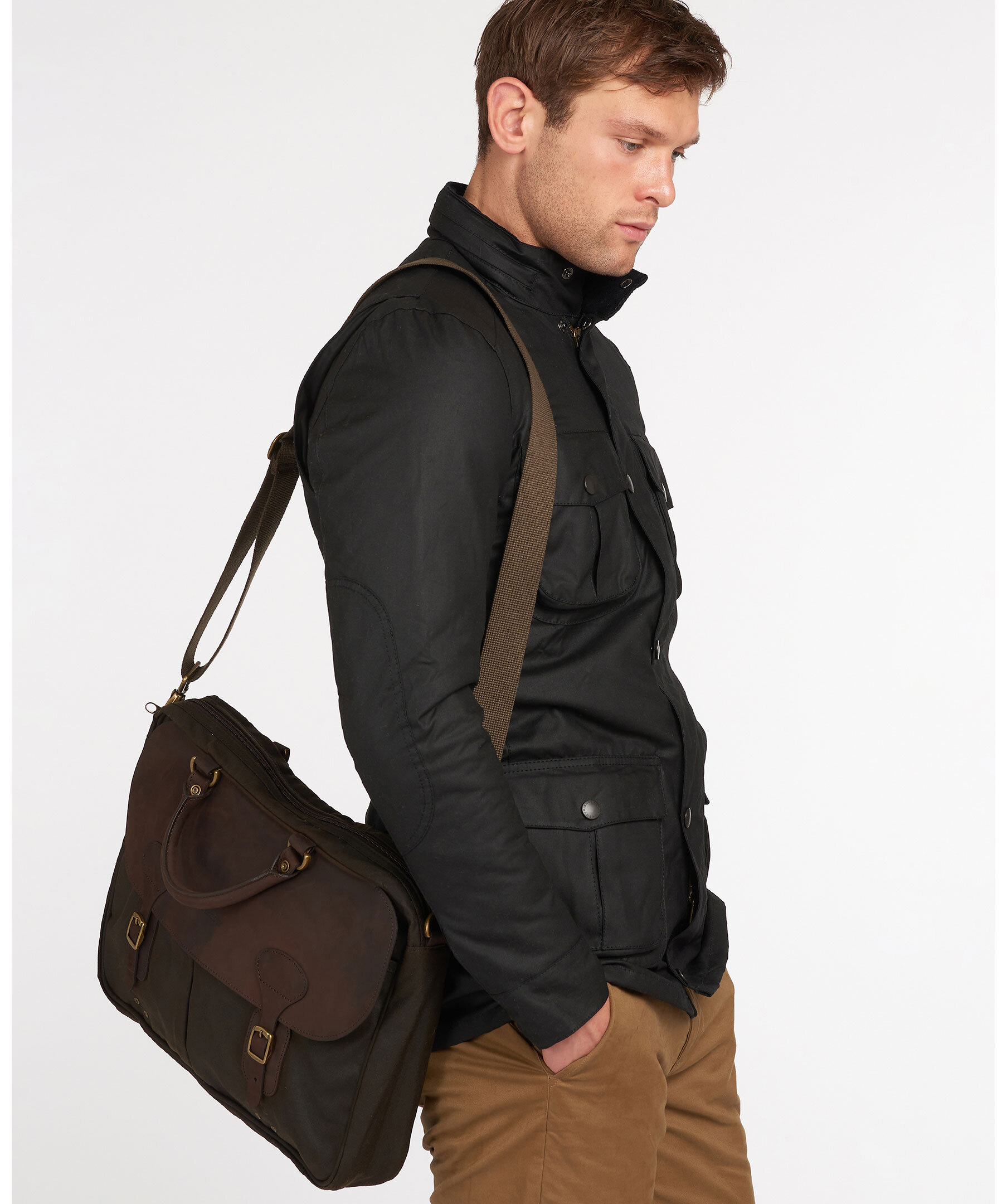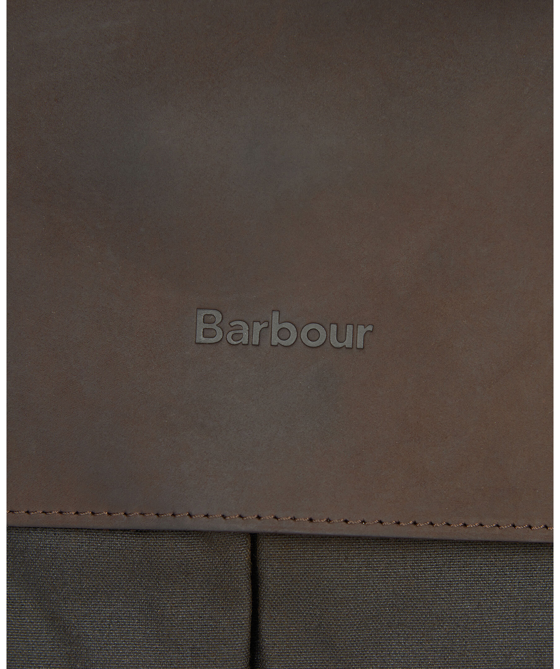 Olivgrön väska i vaxad bomull och skinn. Barbour-logga framtill, löstagbart axelband medföljer, metalldetaljer i mässing. Storlek: 31 x 43 x 10 cm.
