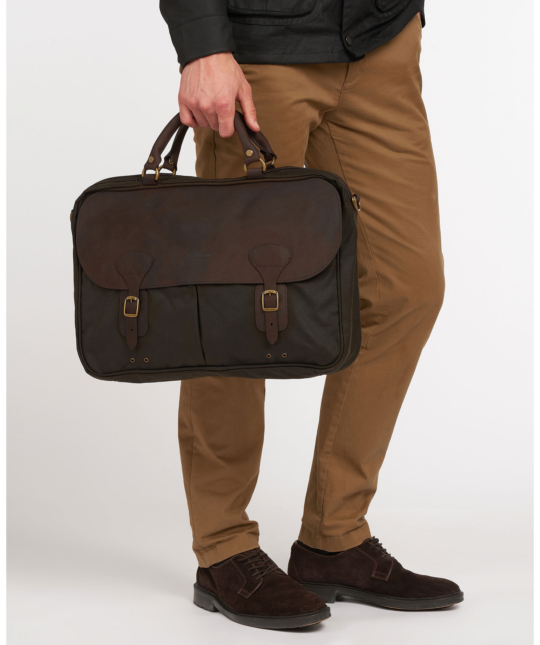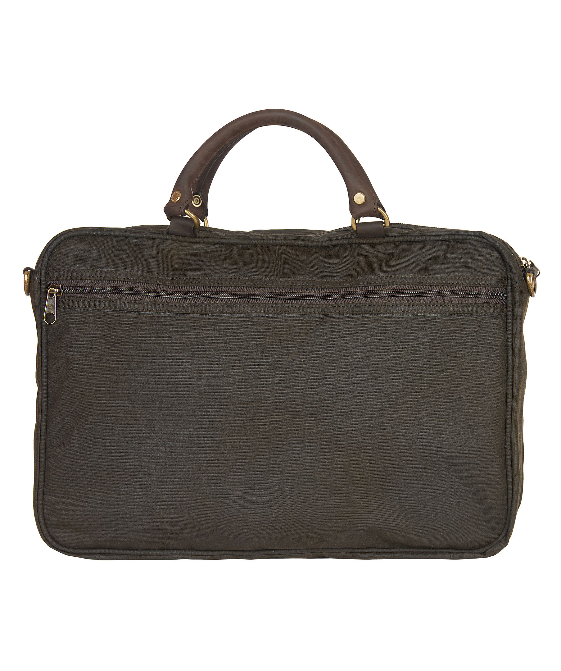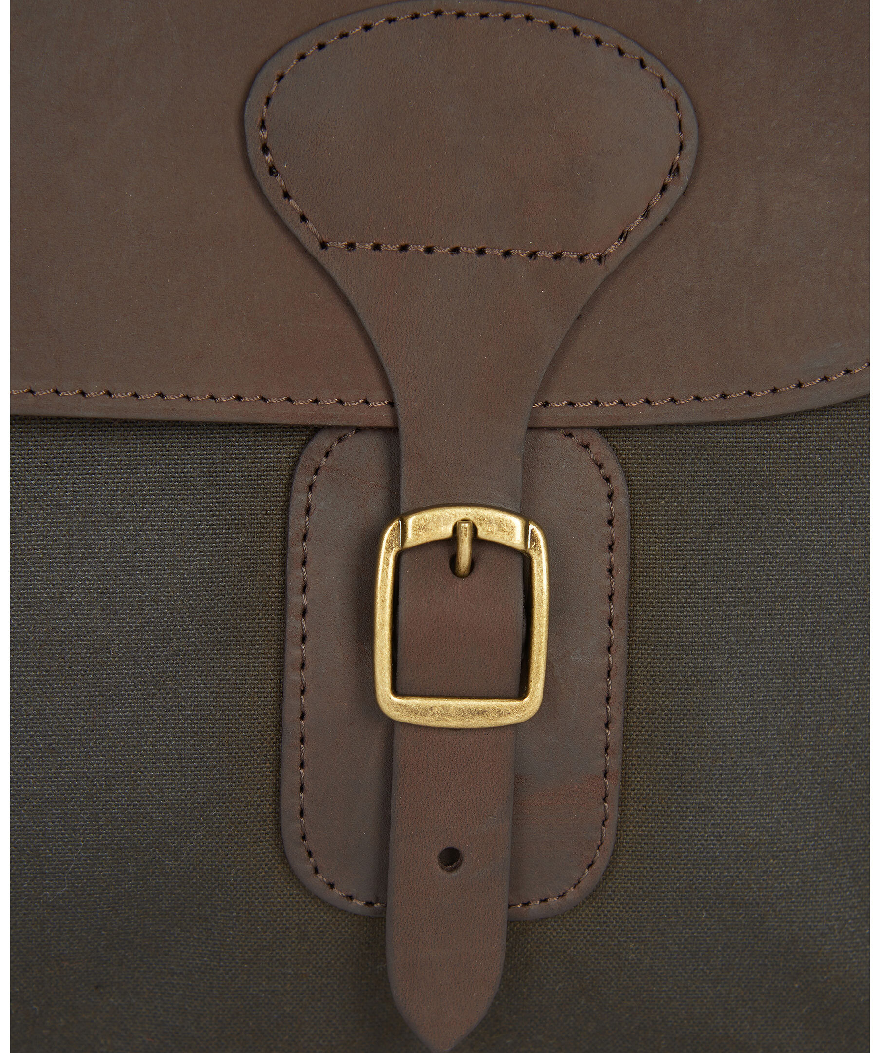 Olivgrön väska i vaxad bomull och skinn. Barbour-logga framtill, löstagbart axelband medföljer, metalldetaljer i mässing. Storlek: 31 x 43 x 10 cm.