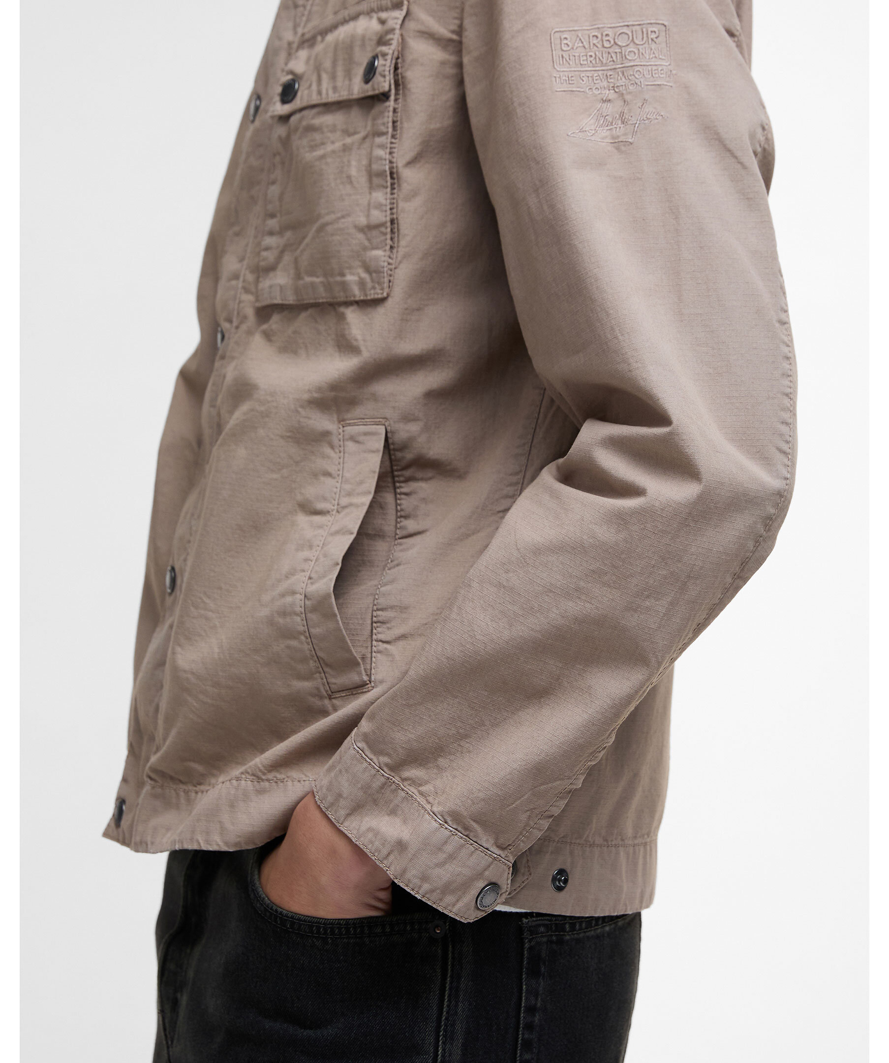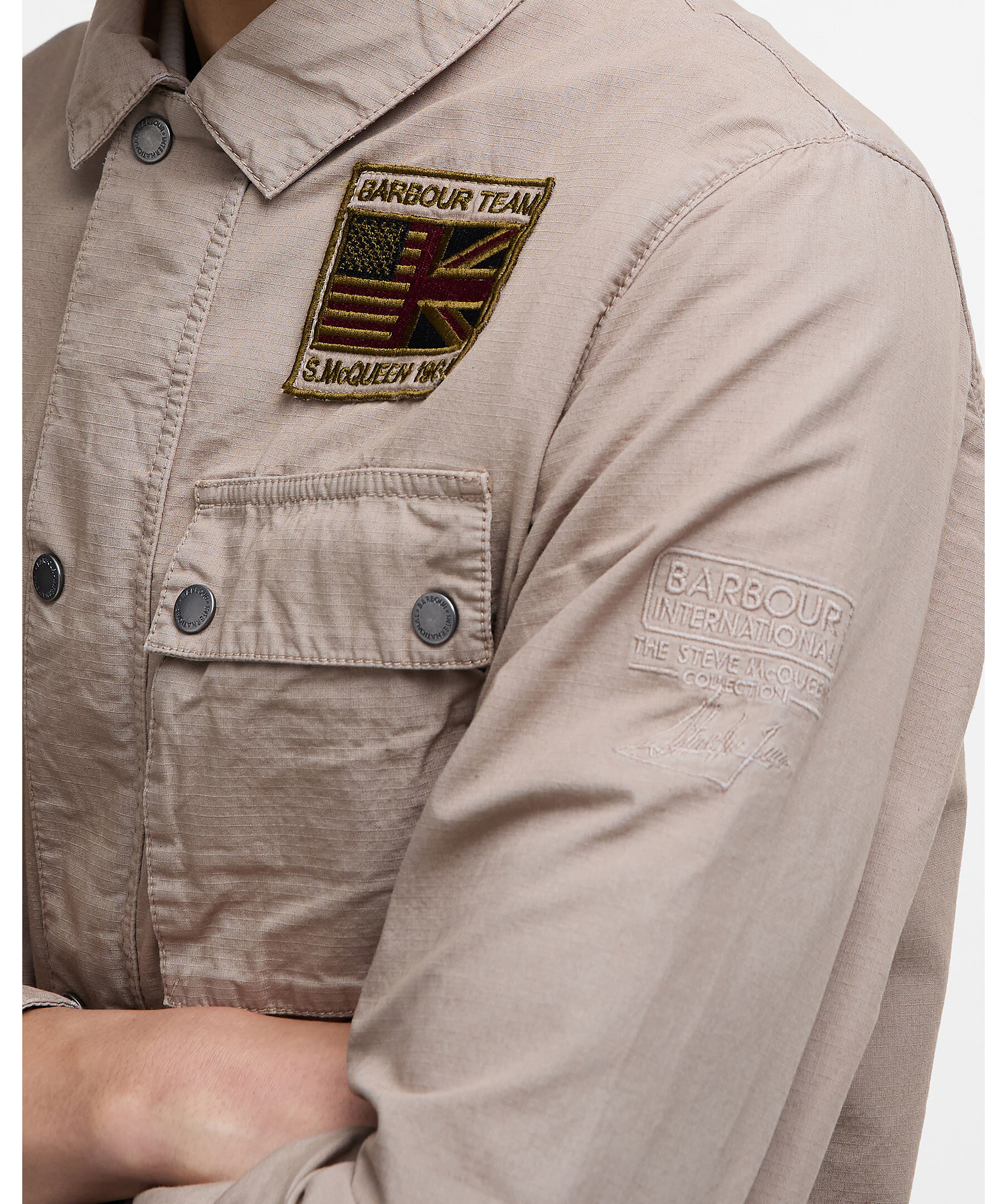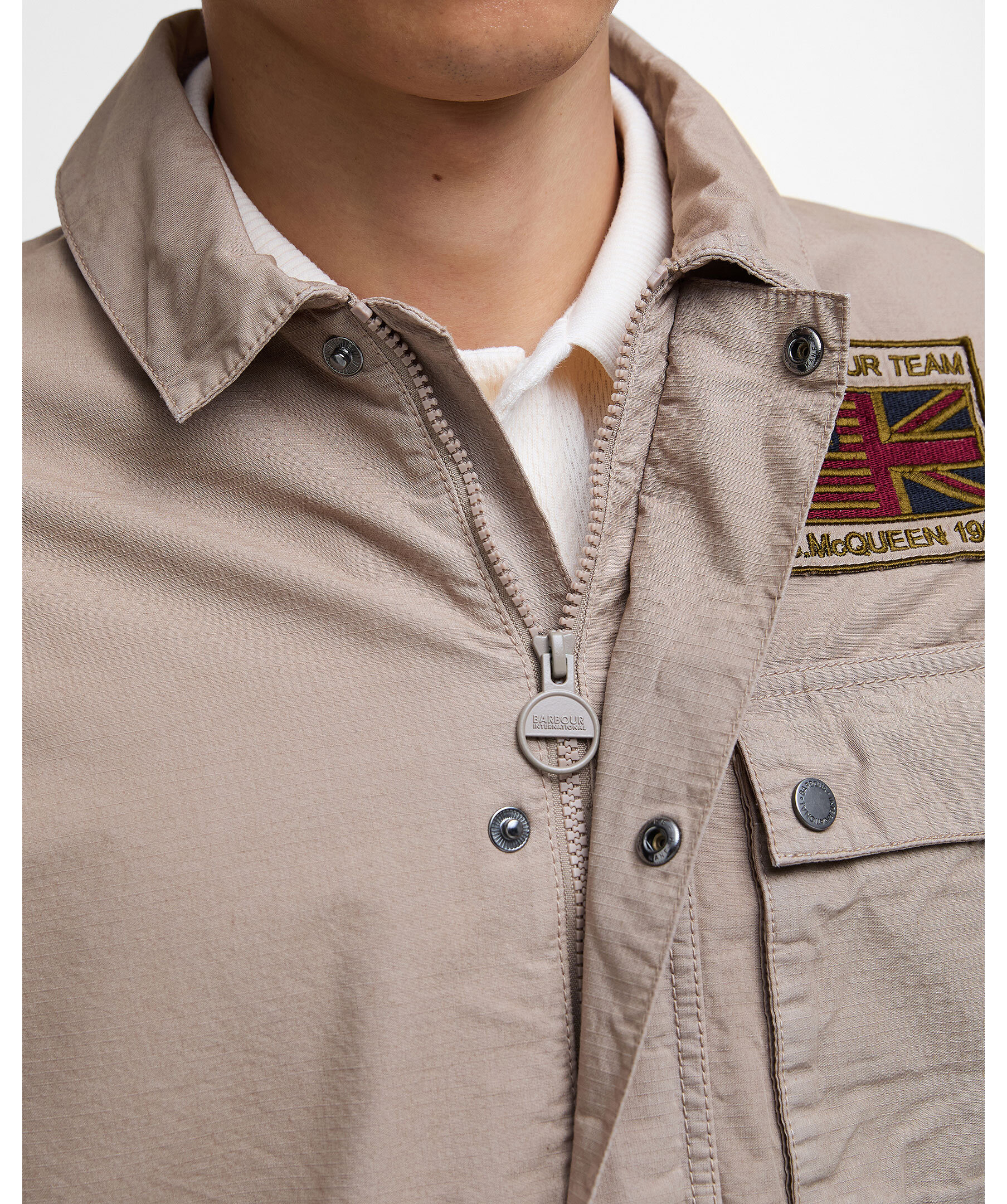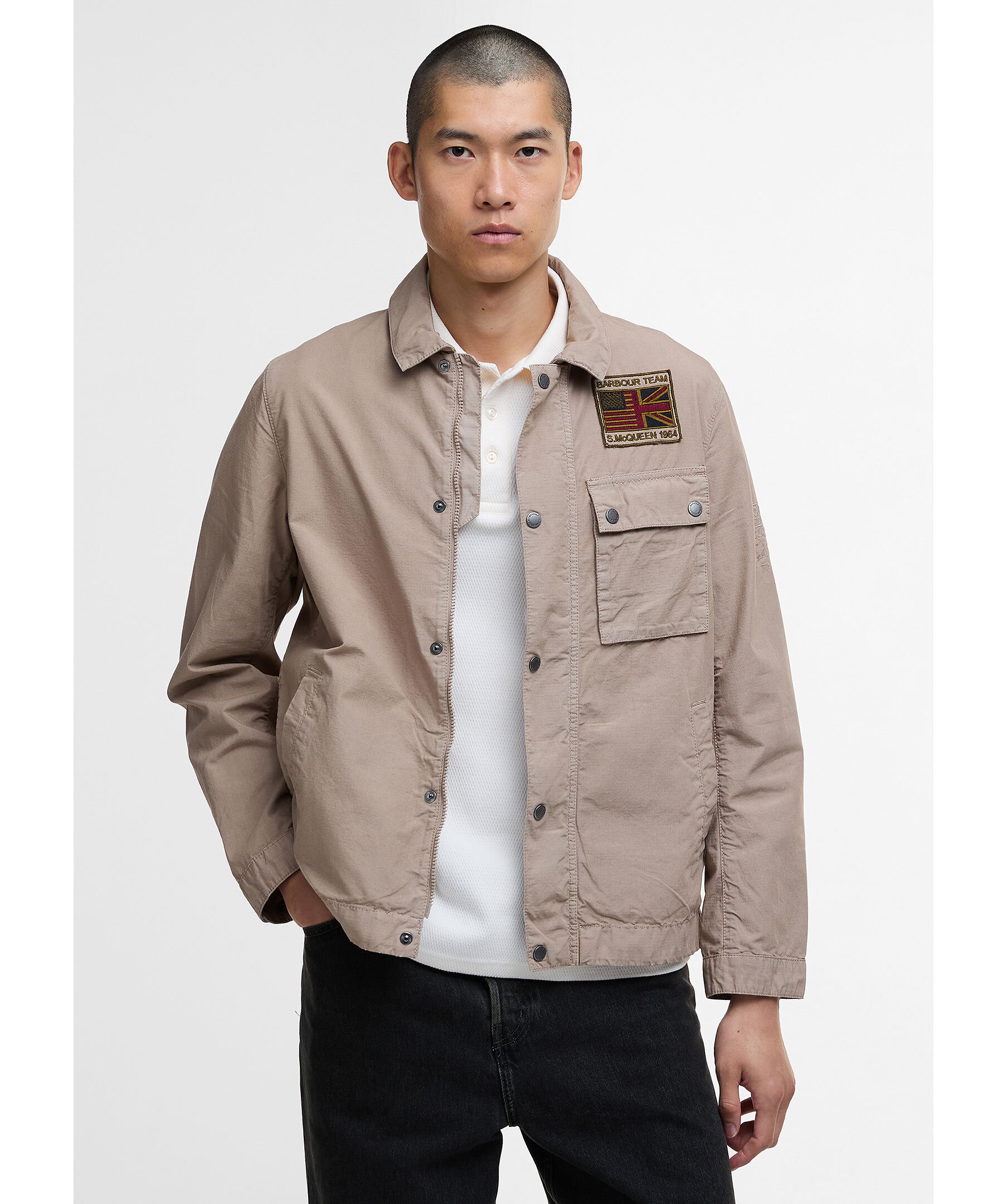 Beige vårjacka från Barbour. Jackan stängs med dold dragkedja och tryckknappar och har justerbara ärmslut och fåll, två sidfickor samt en bröstficka. En Barbour International Steve McQueen broderilapp finns på jackans vänstra bröst. Tillverkad i bomull.