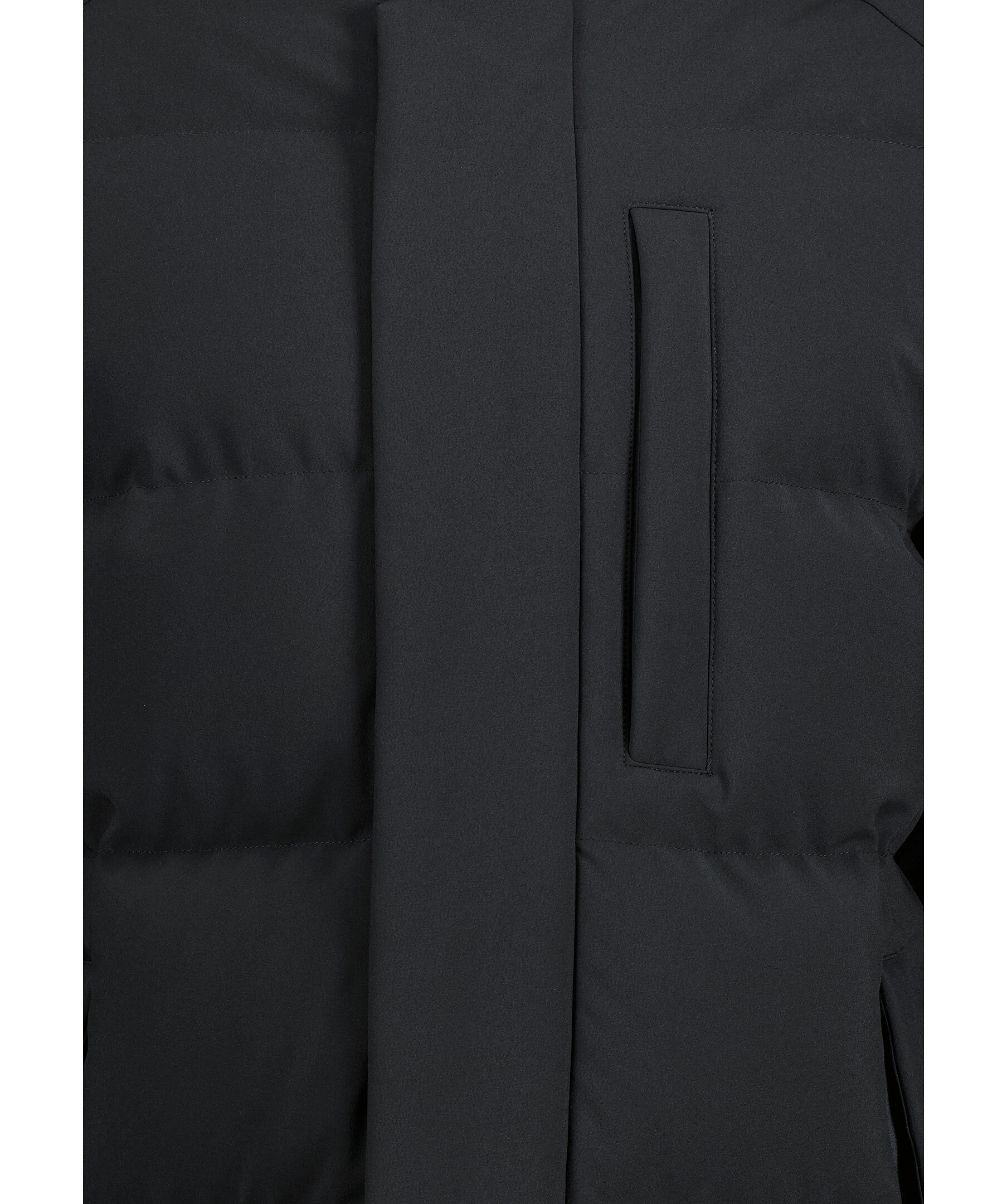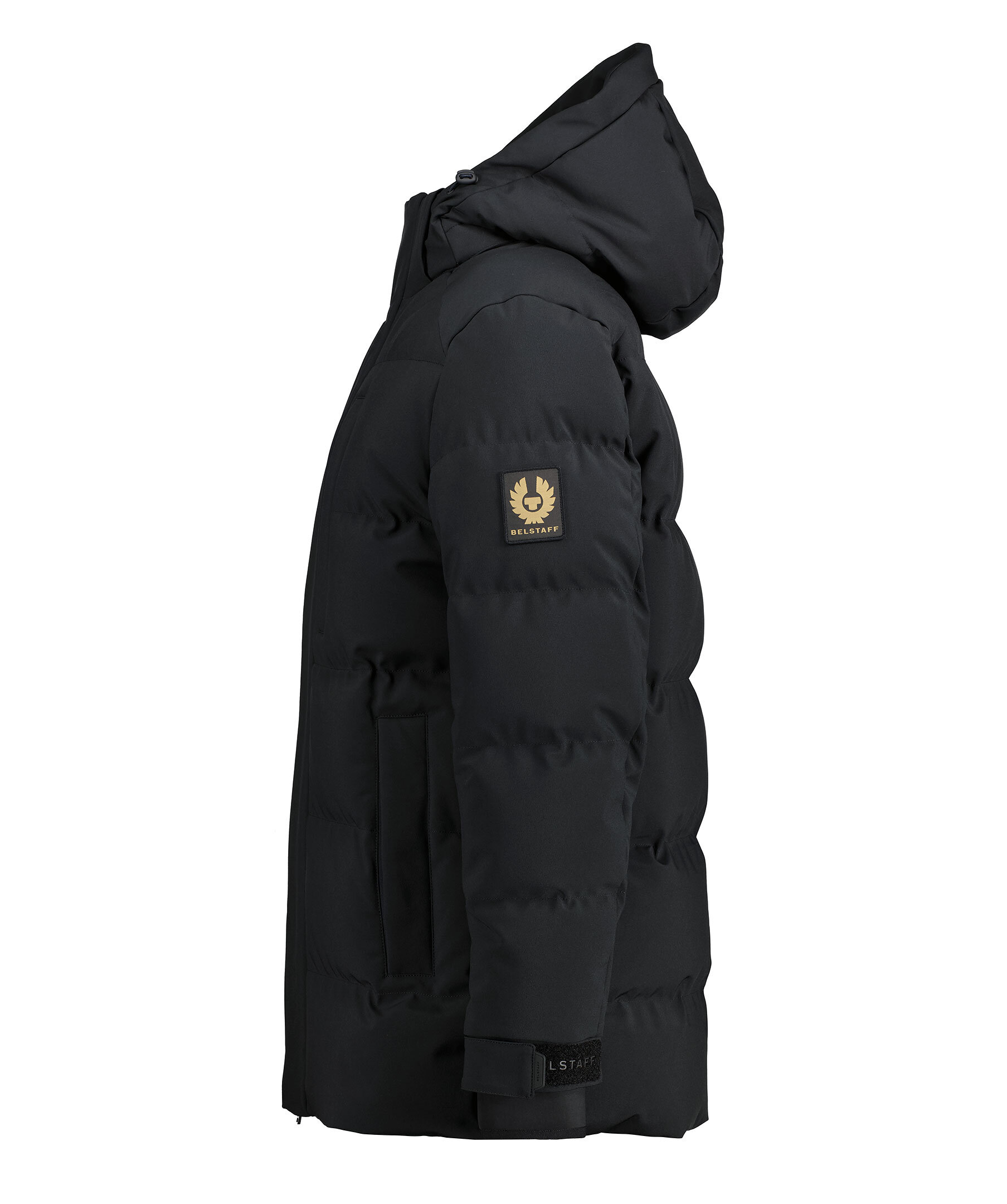 Svart quiltad dunjacka från Belstaff. Stängs framtill med dragkedja och tryckknappar. Två fickor framtill, en bröstficka som stängs med dragkedja. Luva med dragsko och tryckknappar framtill. Justerbara ärmslut med kardborrar. Elastisk mudd vid ärmslut. Patch med logotyp på vänster ärm.