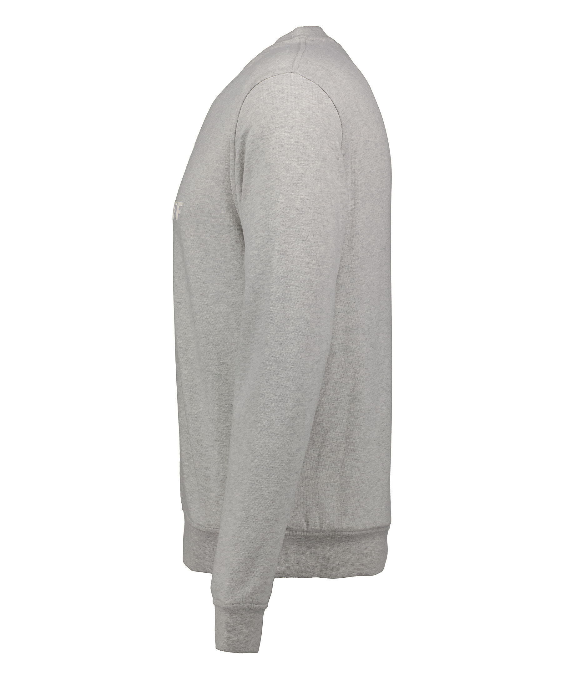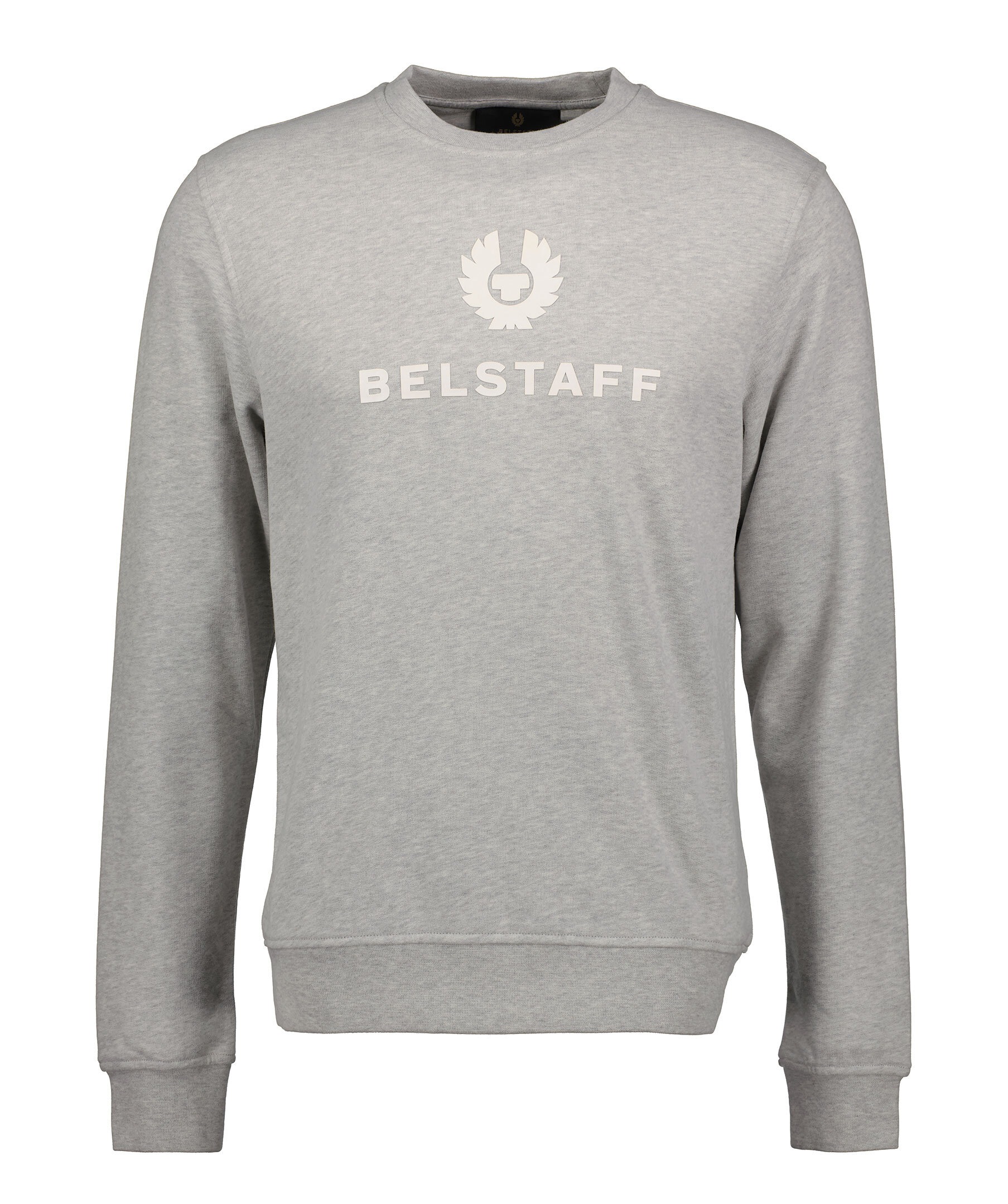 Ljusgrå sweatshirt från Belstaff. Vit gummerad logotyp över bröstet. Ribbstickad mudd vid halsringningen, ärm- och plaggslut. Tillverkad i bomull.