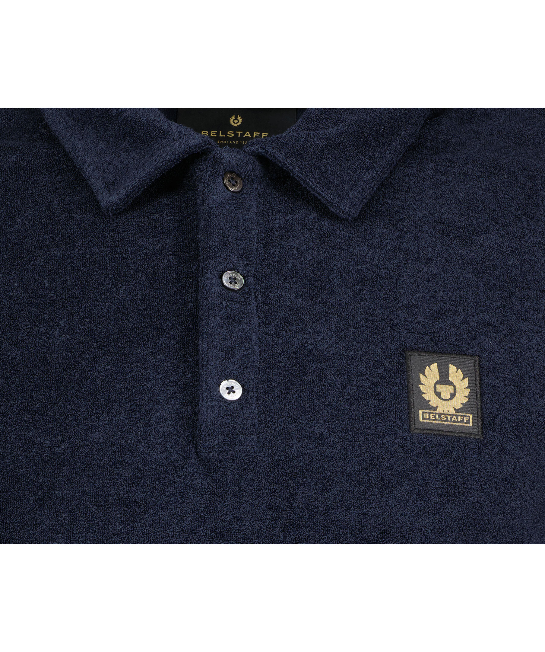 Marinblå pikétröja i mjuk bomullsfrotté från Belstaff. Tillverkade i en bomullsblandning. Tre knappar vid kragen. Patch-logotyp på bröstet. Normal passform.