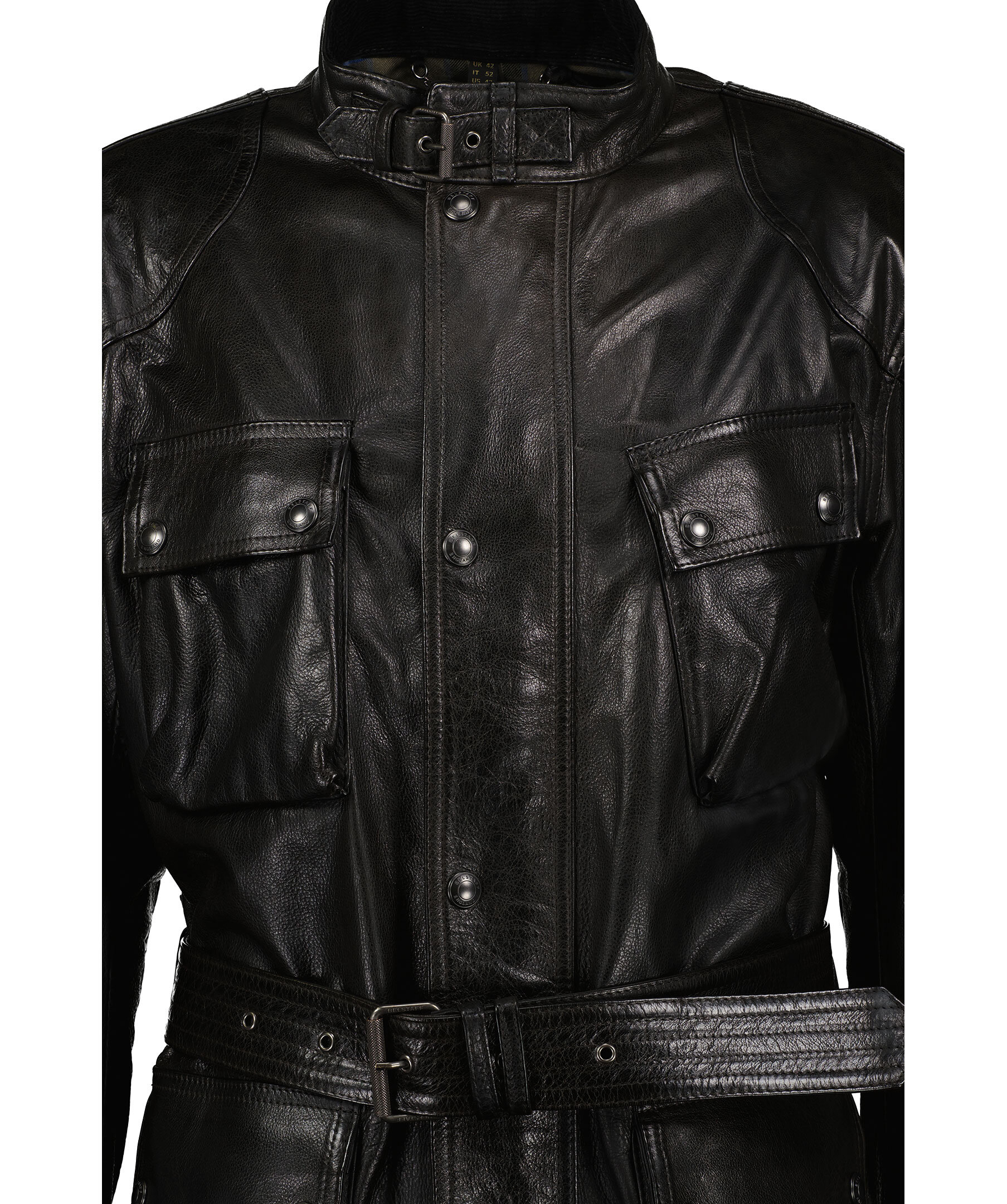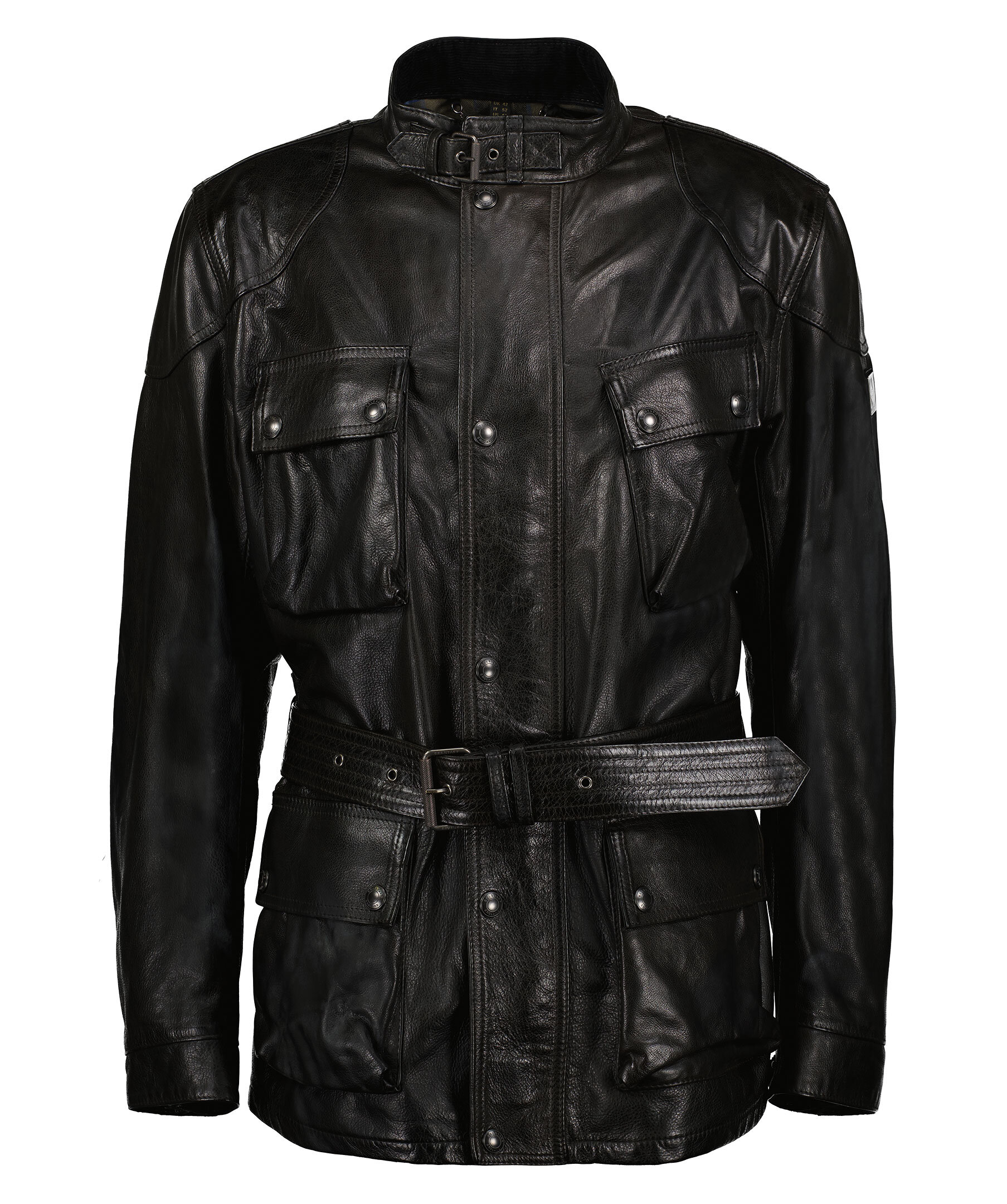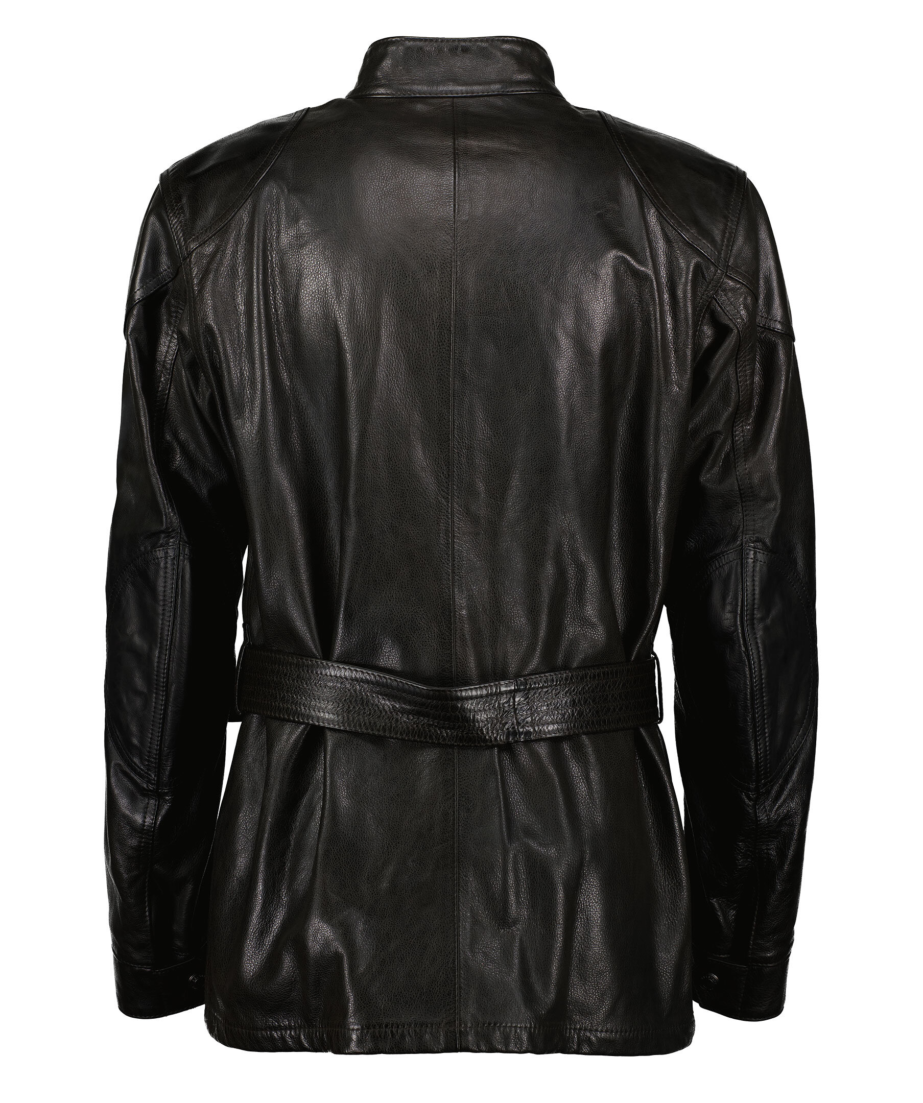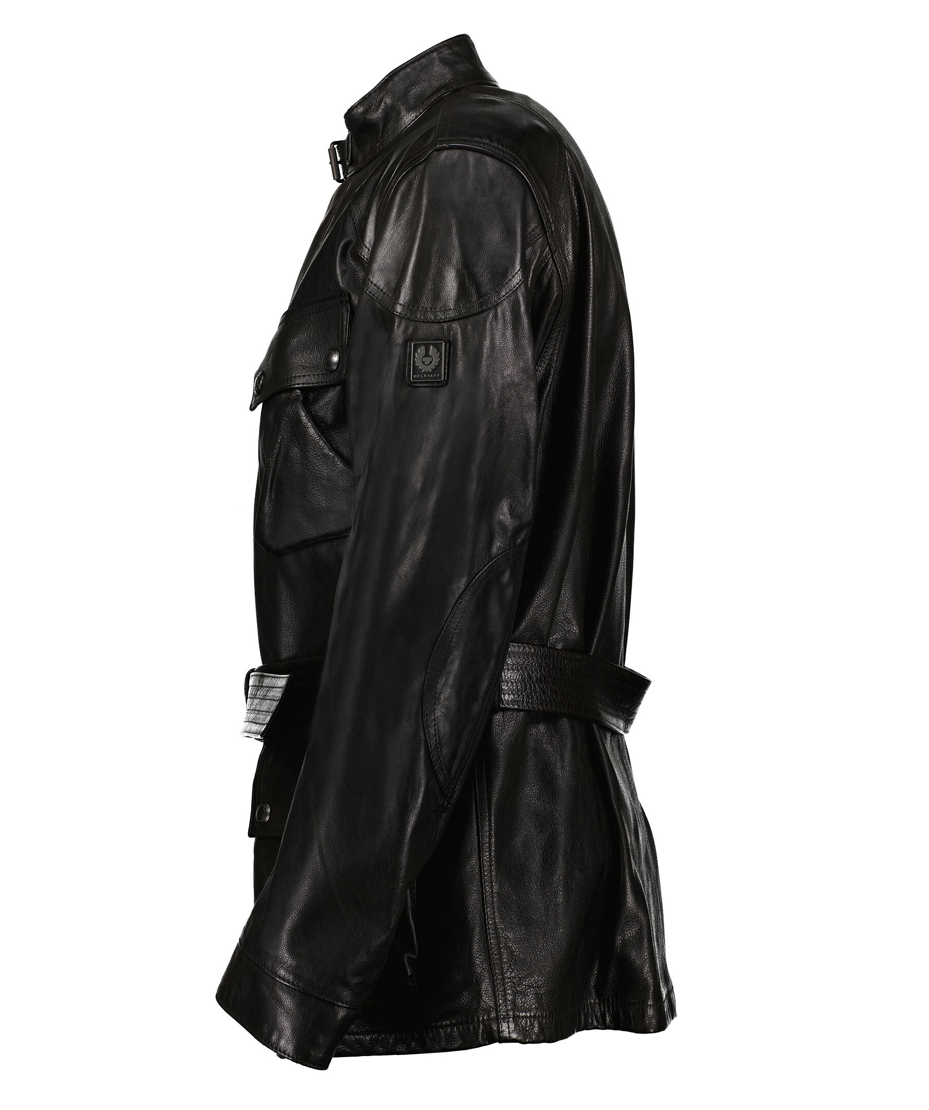 Läderjacka från Belstaff. Jackan är gjord i svart handvaxat kalvskinn. Fyra bälgframfickor och en innerficka. Knappslå framtill och dragkedja. Signature Belstaff rutig bomullsfoder. Ståkrage med justerbar halsspärr. Förstärkta axel- och armbågspaneler samt ventilation under armarna. På grund av handvaxprocessen som används är varje enhet något annorlunda. Variationer i färgintensitet och textur är en integrerad del av designen. Jackans hantverksmässiga handfinish ger en unik patina och ger lädret en vattenavvisande egenskap. Patinan mörknar och blir rikare med ökad ålder och slitage.