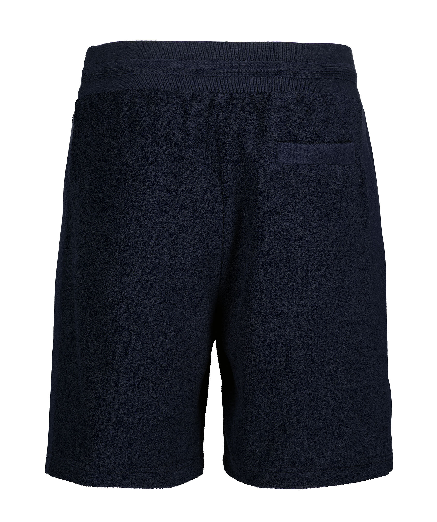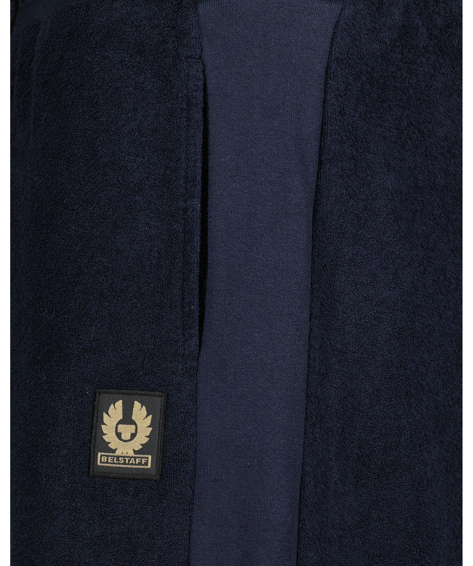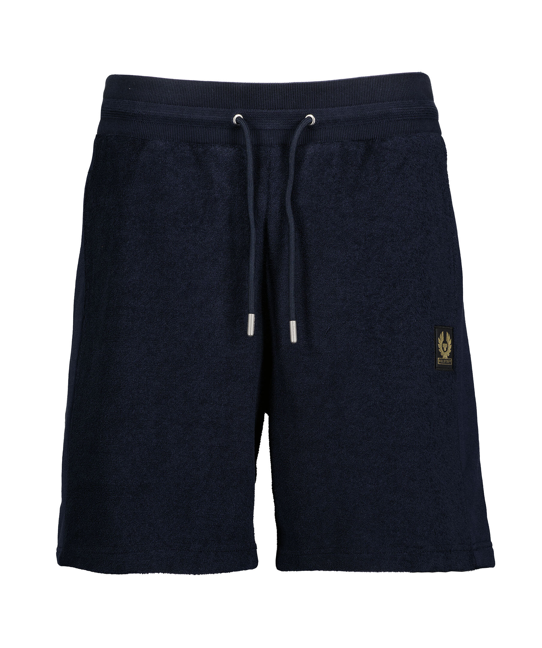 Marinblåa shorts i mjuk bomullfrotté från Belstaff. Tilllverkade i en bomullsblandning. Dragsko i midjan, två sidfickor samt en passpoalbakficka. Patch-logotyp på sidan. Normal passform.