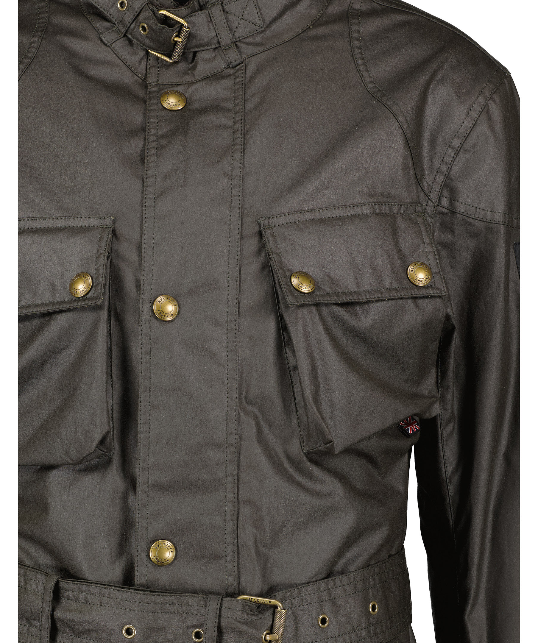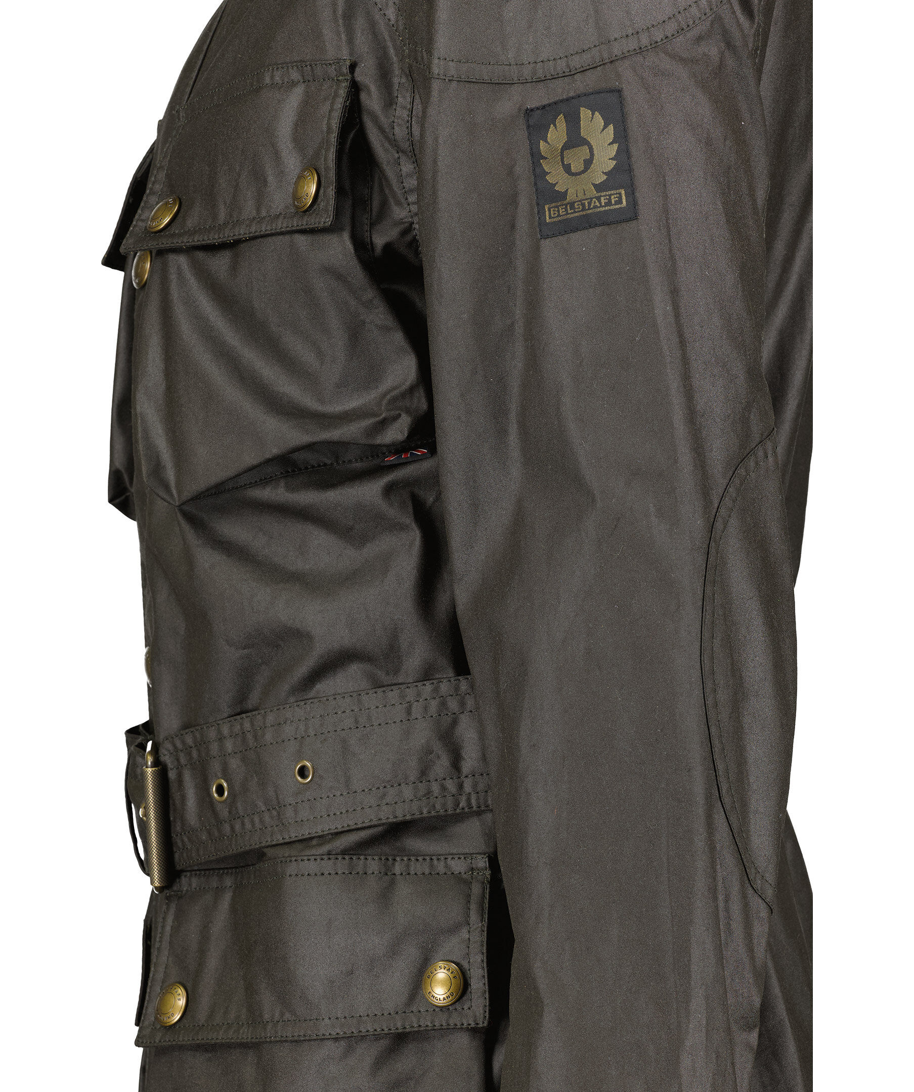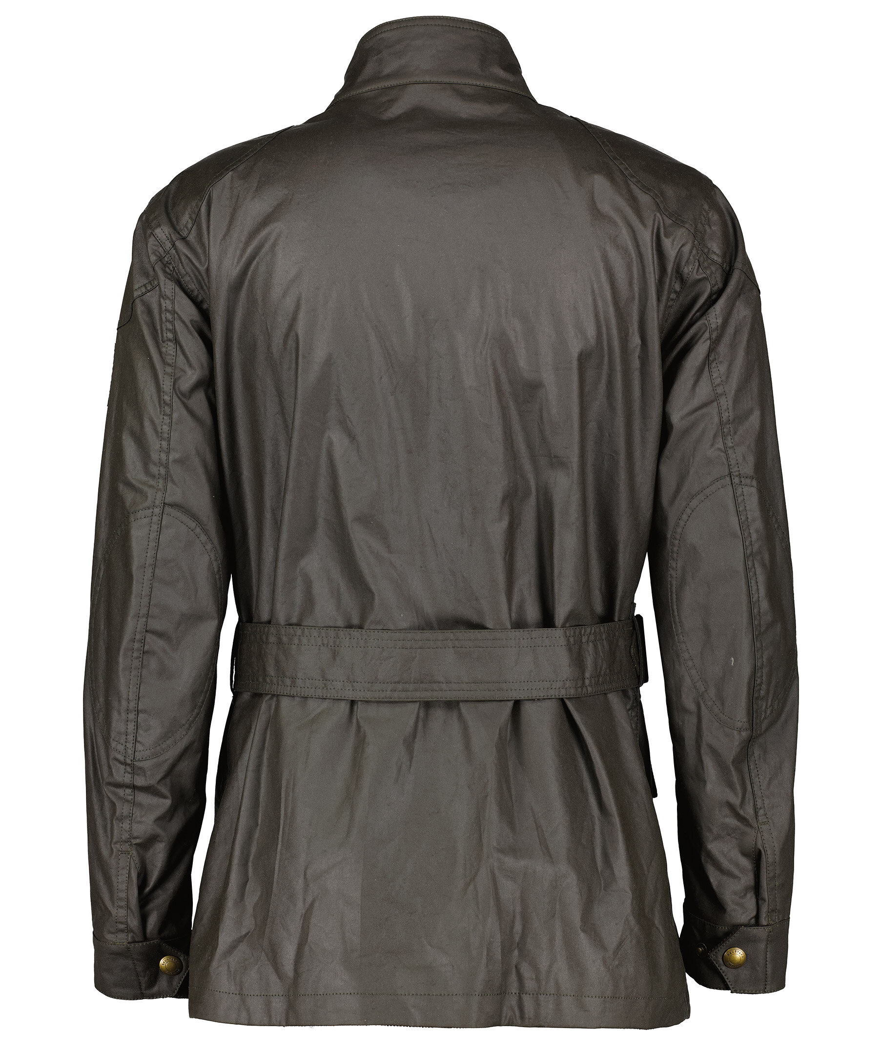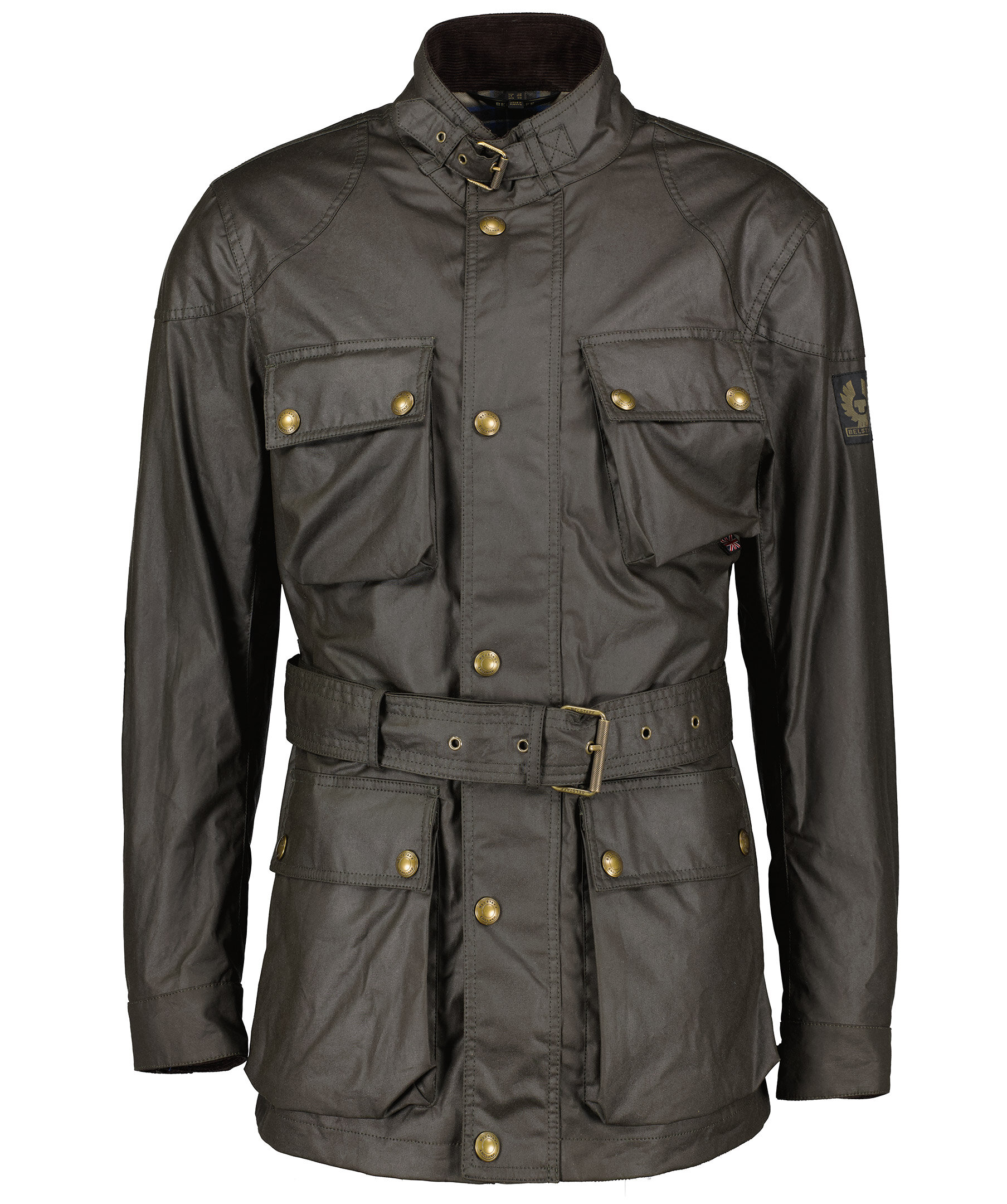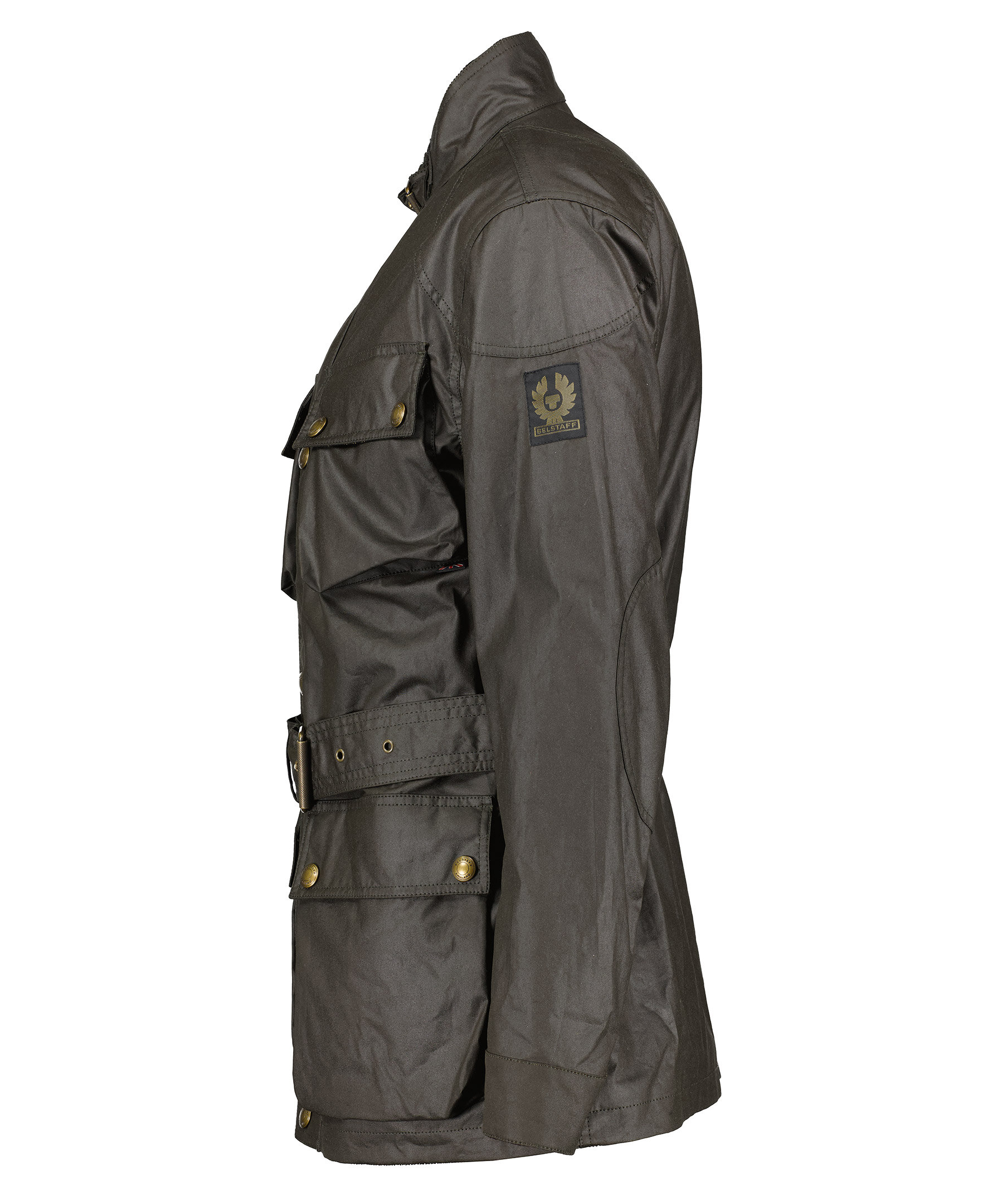 Mörkbrun jacka i vaxad bomull, från Belstaff. Stängs med tryckknappar och dragkedja framtill. Fyra fickor framtill som stängs med tryckknappar och lock. avtagbart bälte i midjan. Spänne vid kragen. Justerbara ärmslut med tryckknapp. Patch med logotyp på vänster ärm. Går att knäppa fast fodret Waistcoat Gilet som säljes separat.