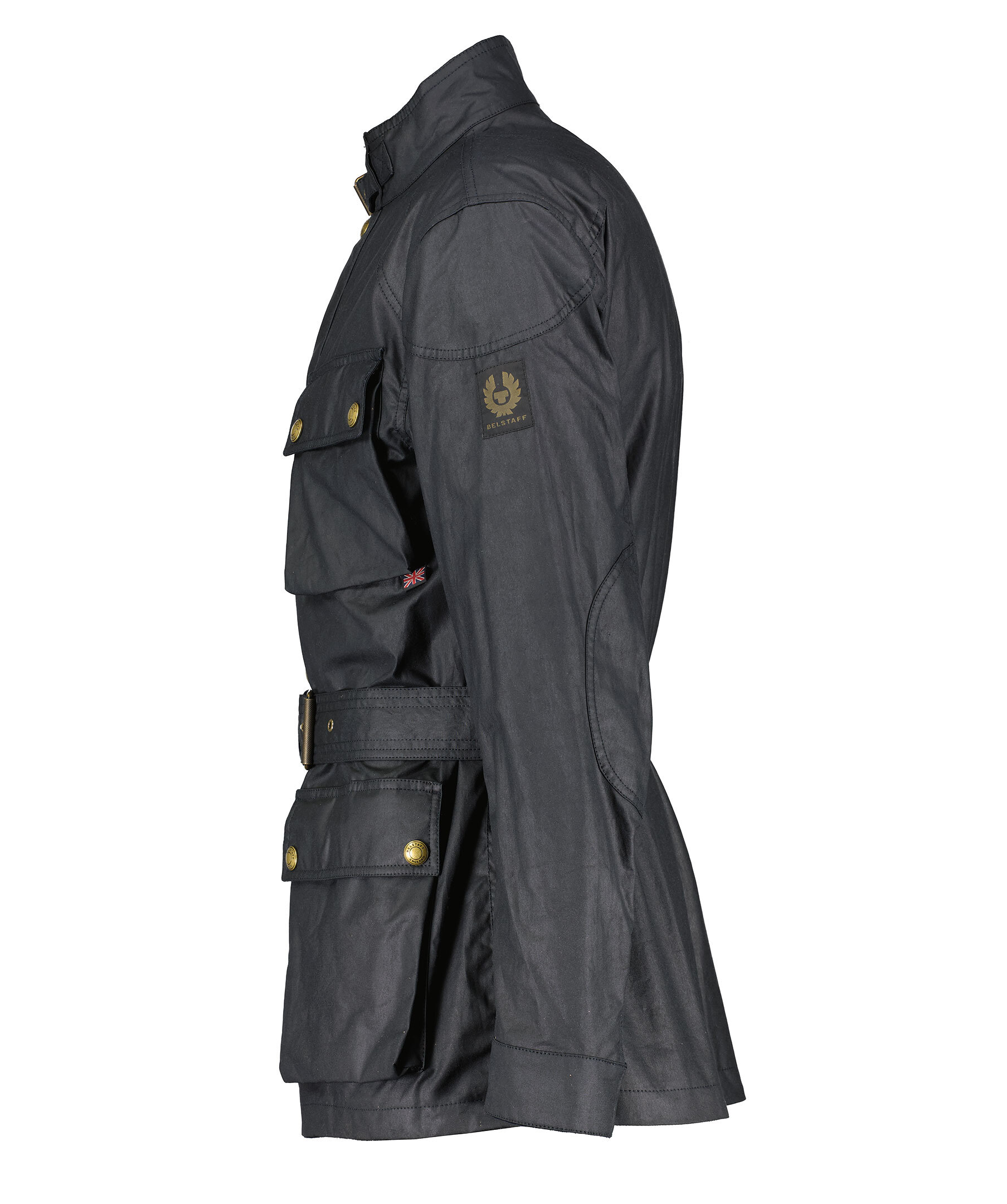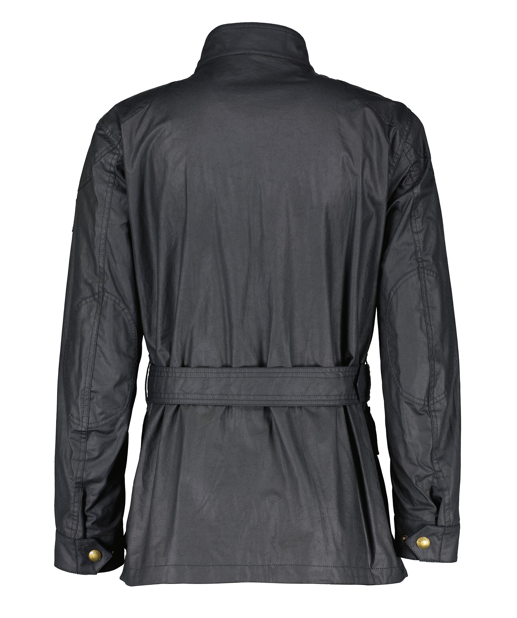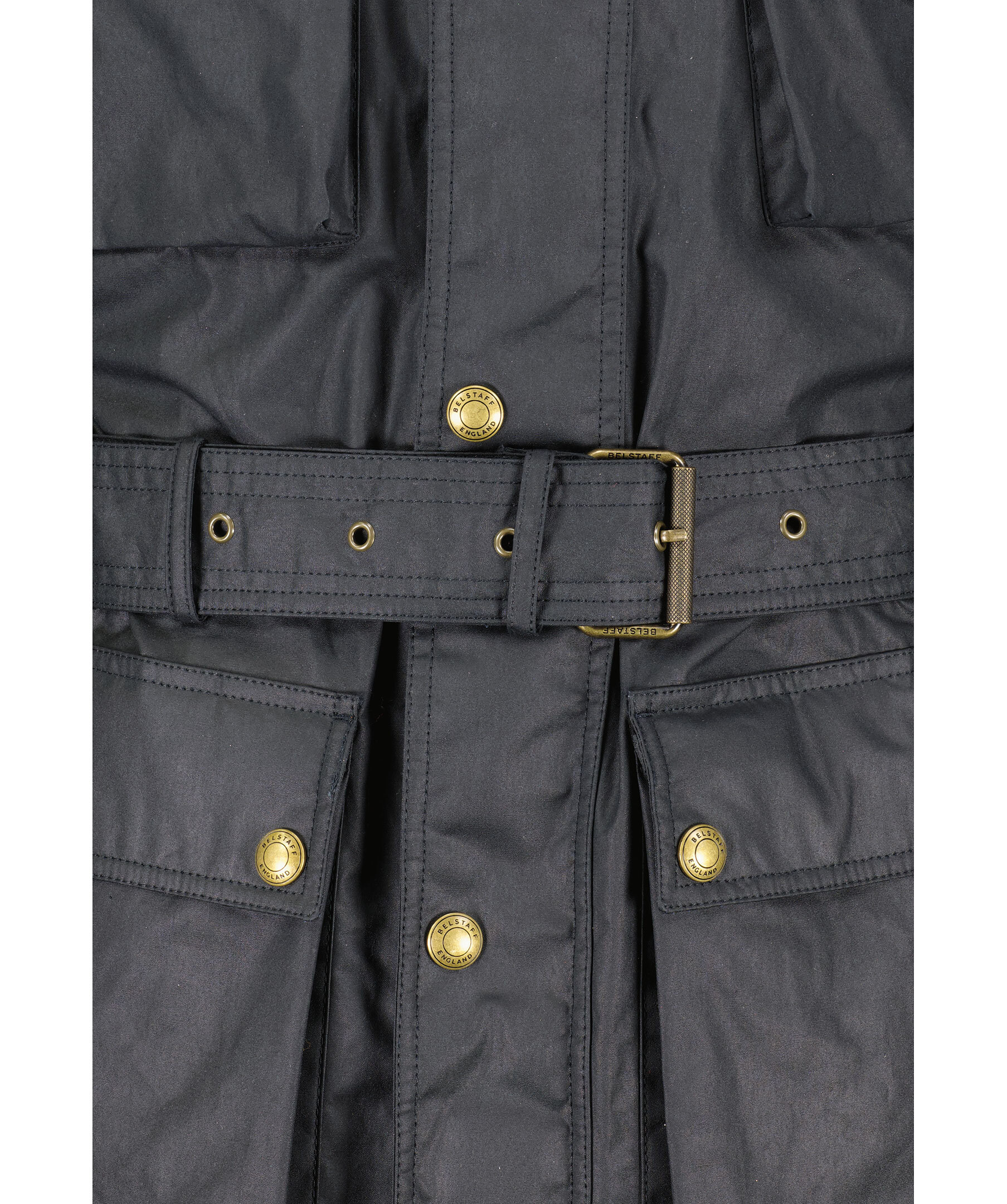 Mörkblå jacka i vaxad bomull, från Belstaff. Stängs framtill med dragkedja och tryckknappar. Fyra fickor framtill som stängs med lock och tryckknappar. Innerficka som stängs med lock och tryckknapp. Avtagbart bälte i midjan. Krage som stängs med spänne, fodrad med manchester. Patch med logotyp på vänster ärm. Justerbara ärmslut med tryckknappar.