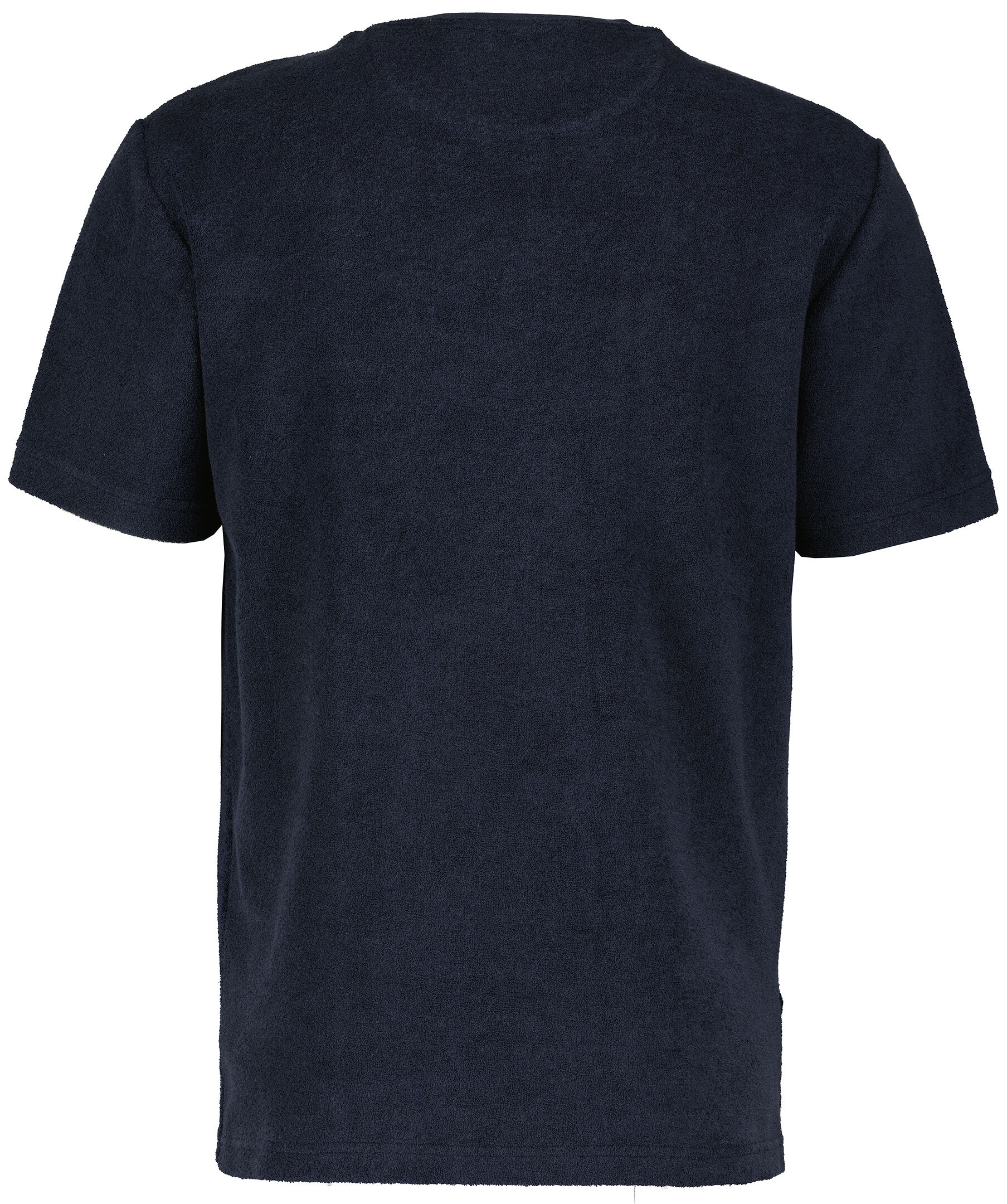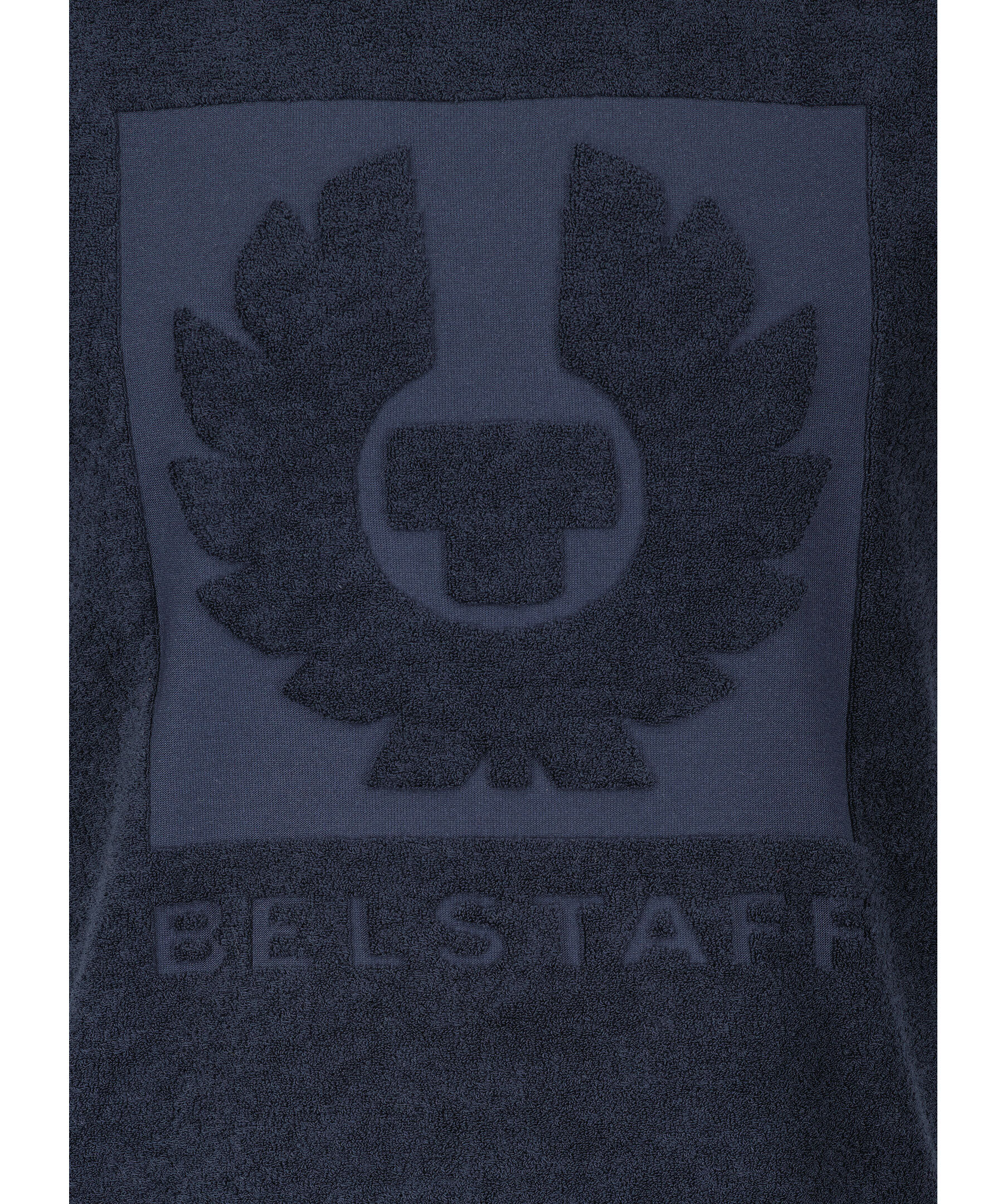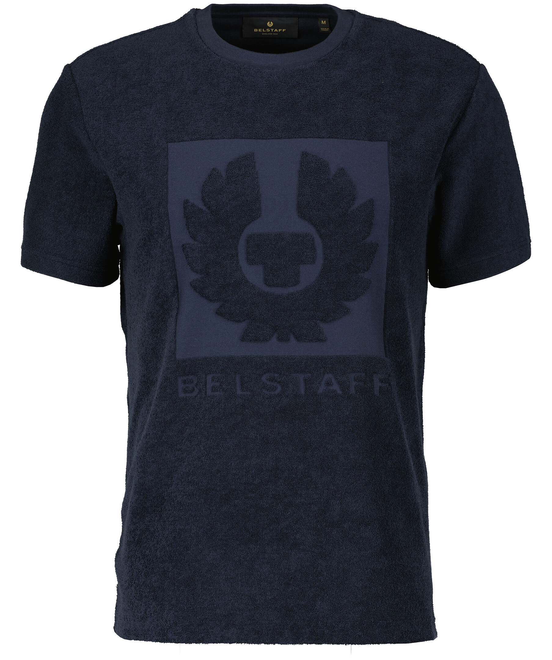 Mörkblå T-shirt i frotté från Belstaff. Stor logotyp mitt på magen. Rundad halsringning med ribbstickad mudd. Korta slitsor i sidorna. Tillverkad i bomullsblandning.