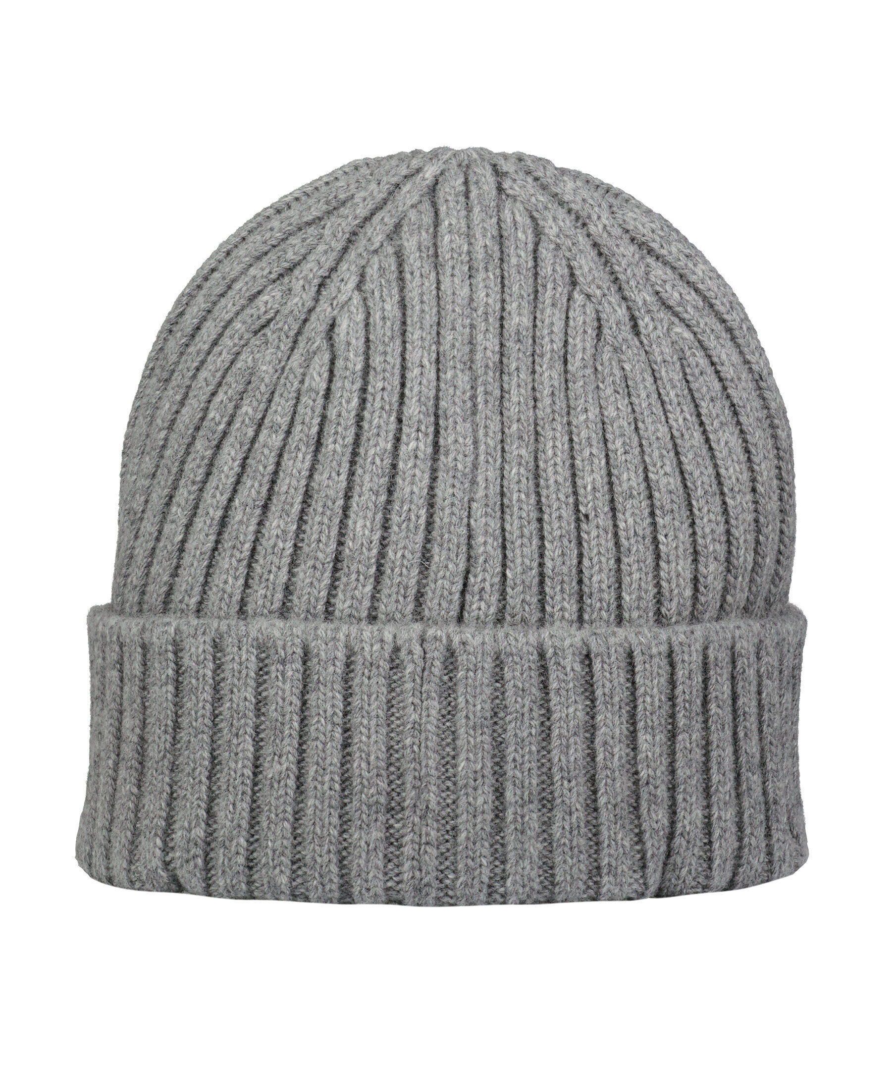 Grå ribbstickad mössa i ull från Belstaff. Fyrkantig patch med logga på framsidan och uppvikt kant.