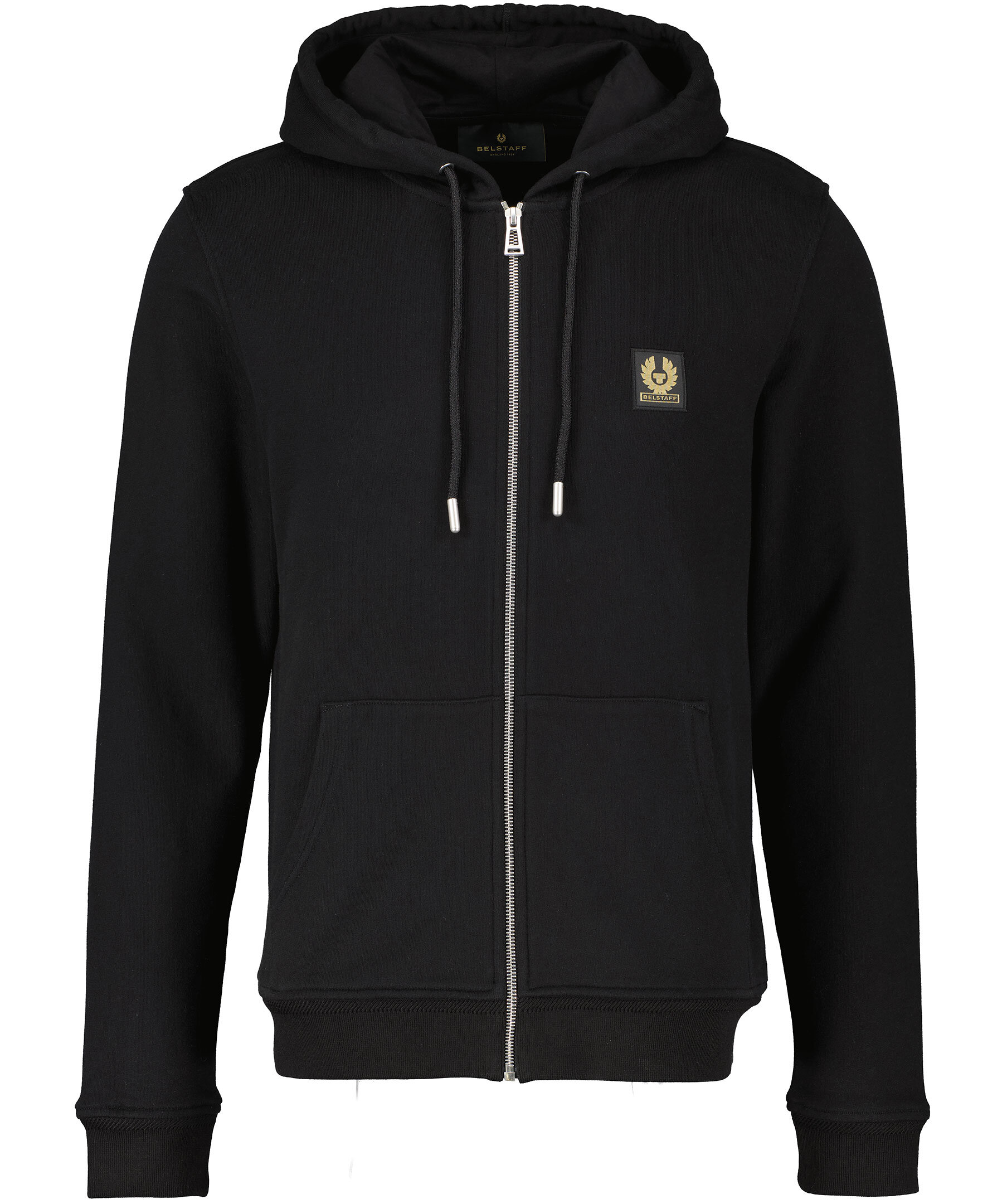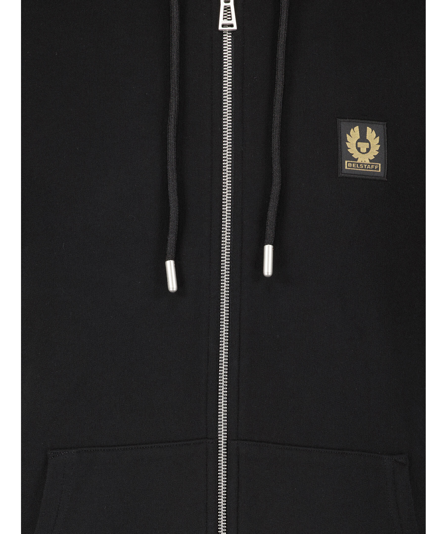 Svart hoodie från Belstaff. Stängs med dragkedja framtill. Luva med dragsko. Patch med logotyp på vänster bröst. Ficka på magen. Ribbstickade muddar vid ärm- och plaggslut. Tillverkad i 100% bomull.
