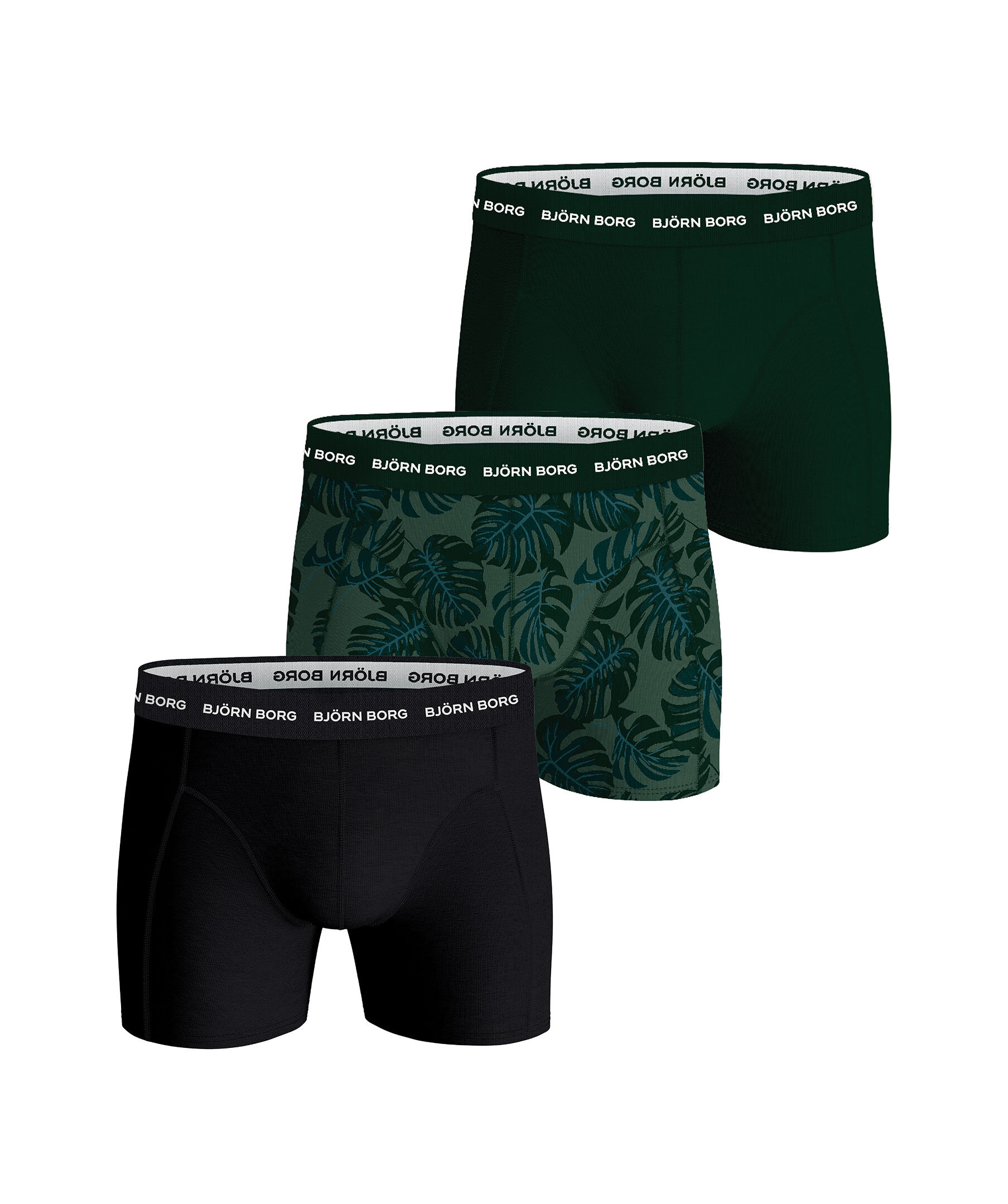 3-pack kalsonger från Björn Borg i färgerna svart och grönt samt ett par mönstrade. Kalsongerna har medelhög midja med resår och logotyp. Tillverkade i en stretchig bomullsblandning.