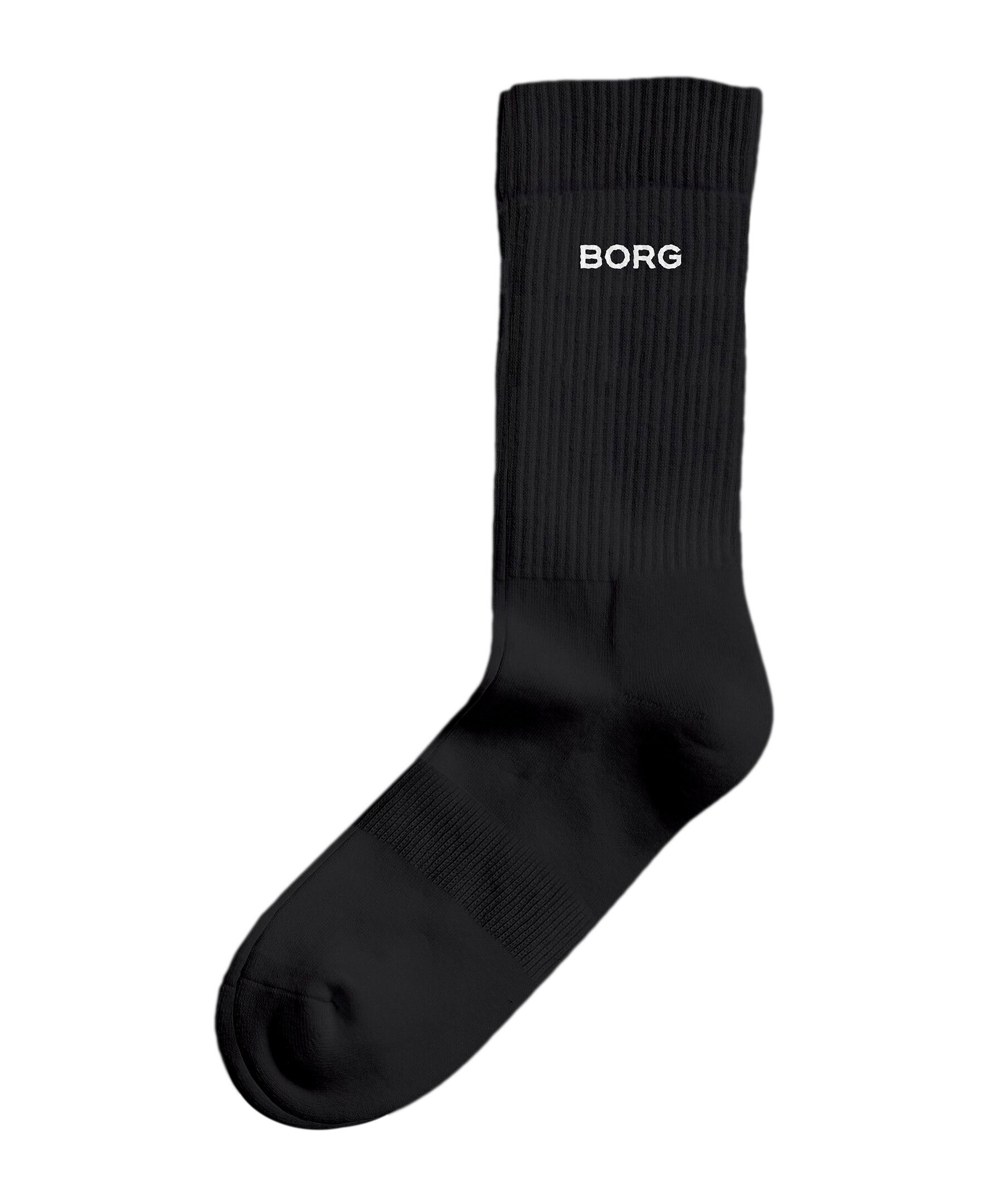 3-pack svarta, ribbstickade strumpor från Björn Borg. Logotyp vid kant. Tillverkade av en blandning av mjukstickad bomull och återvunnen polyester i stretchkvalitet.