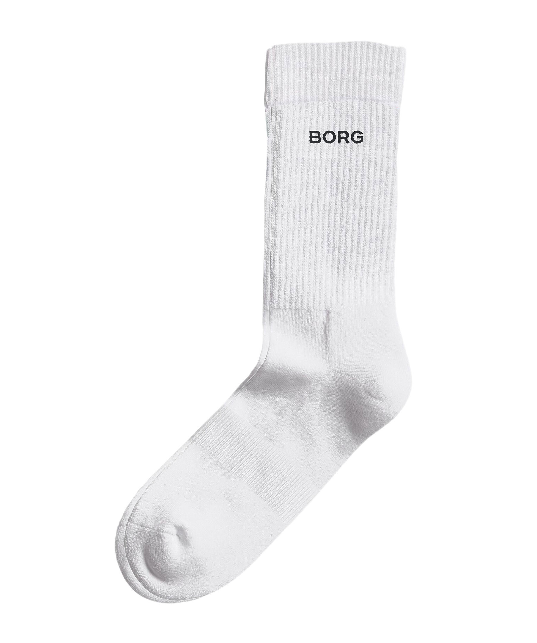 3-pack vita, ribbstickade strumpor från Björn Borg. Logotyp vid kant. Tillverkade av en blandning av mjukstickad bomull och återvunnen polyester i stretchkvalitet.