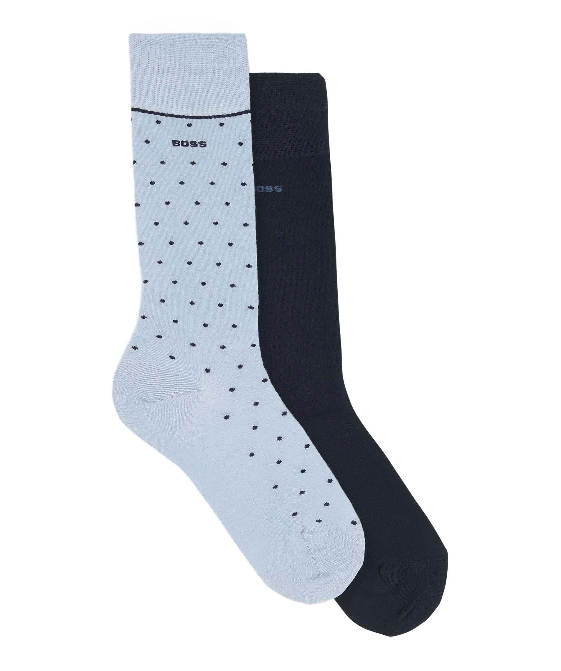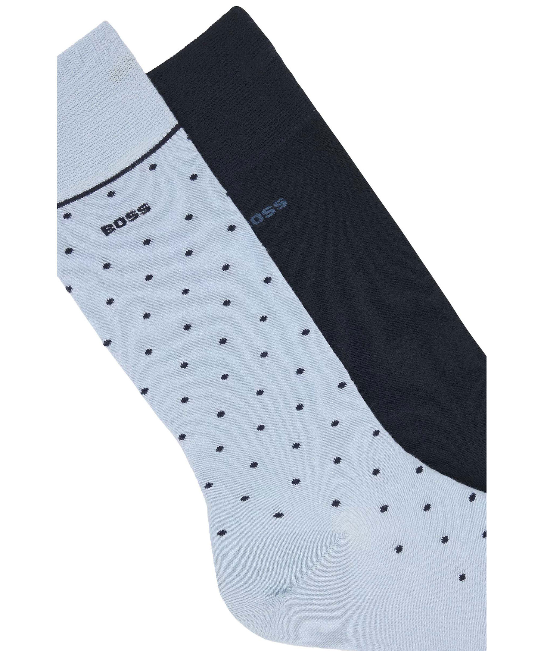2-pack strumpor från BOSS Black. Ett par enfärgade i mörkblått samt ett par med prickigt mönster i ljusblått. Logotyp på skaftet. Tillverkade i en mjuk viskosblandning.