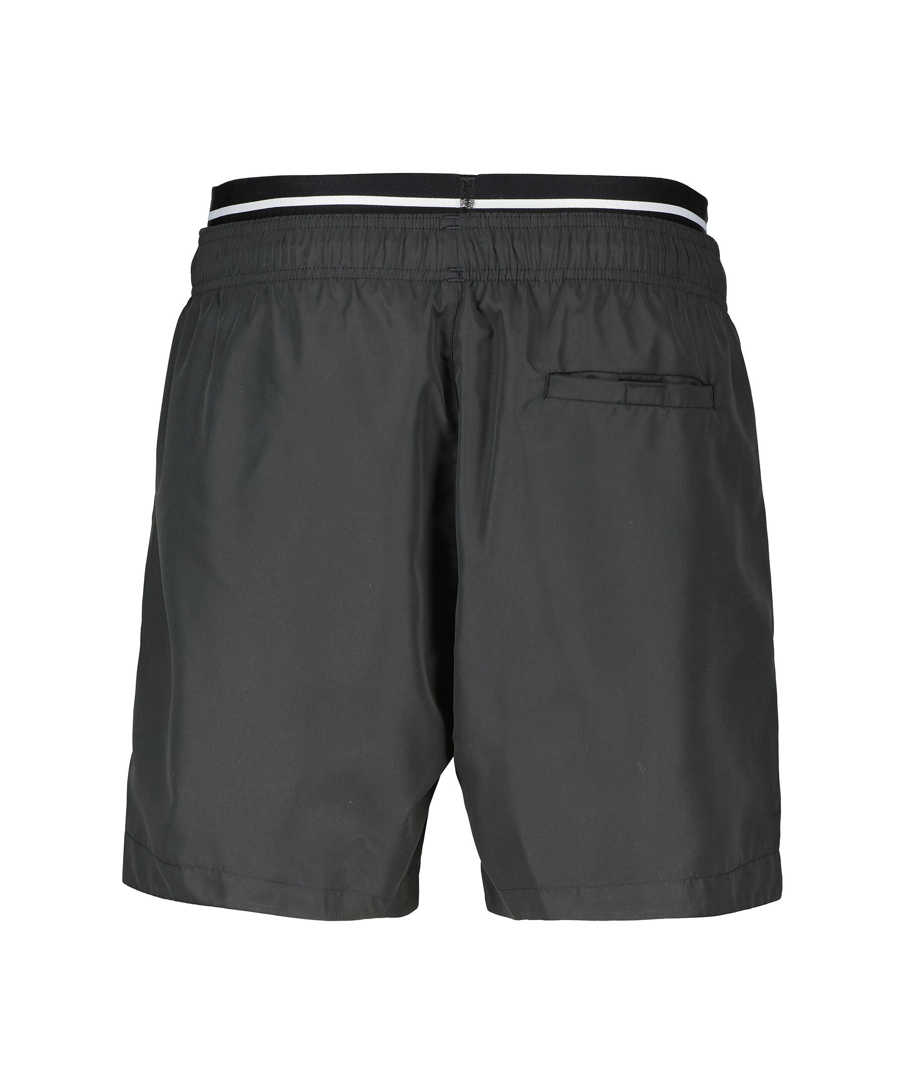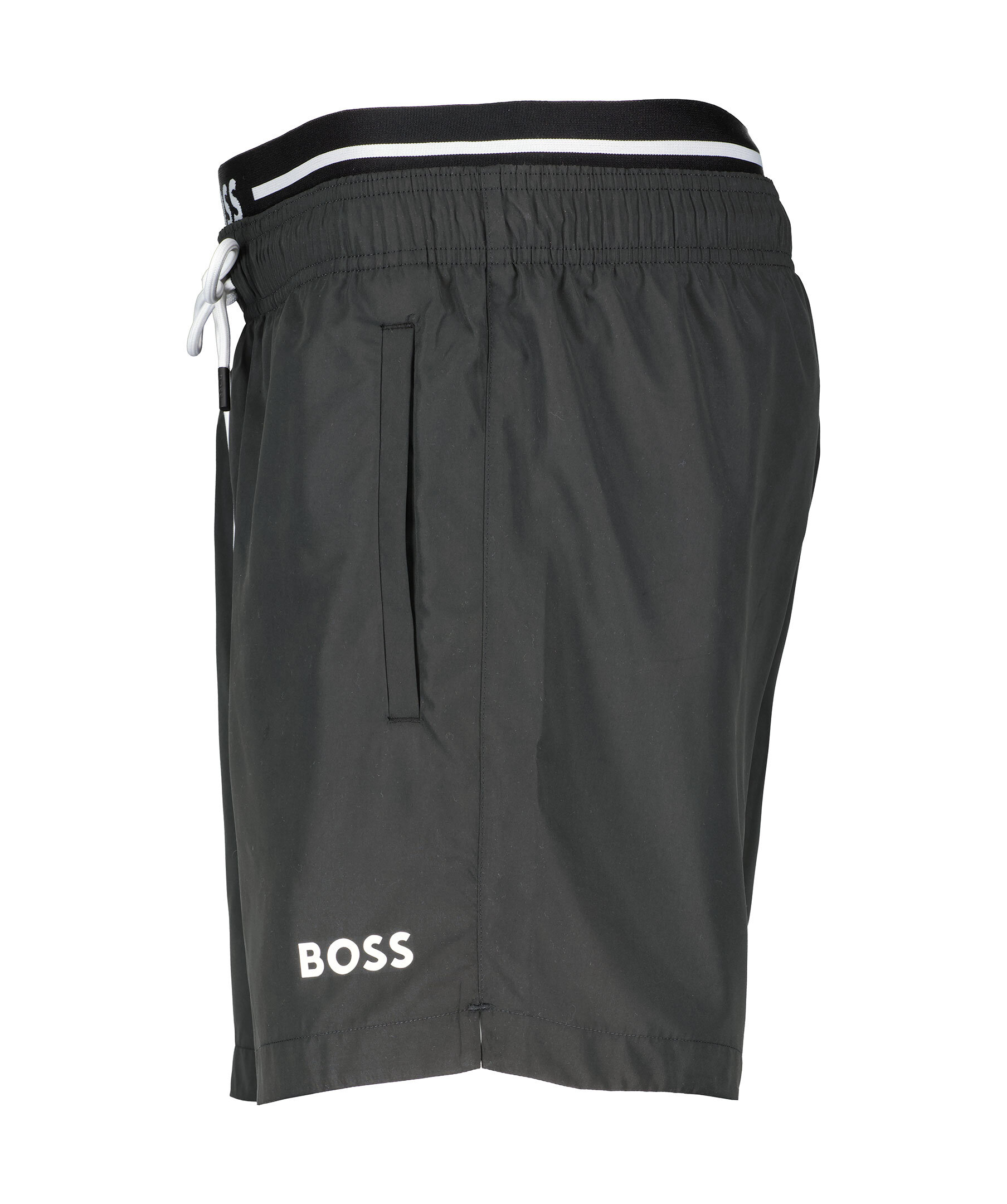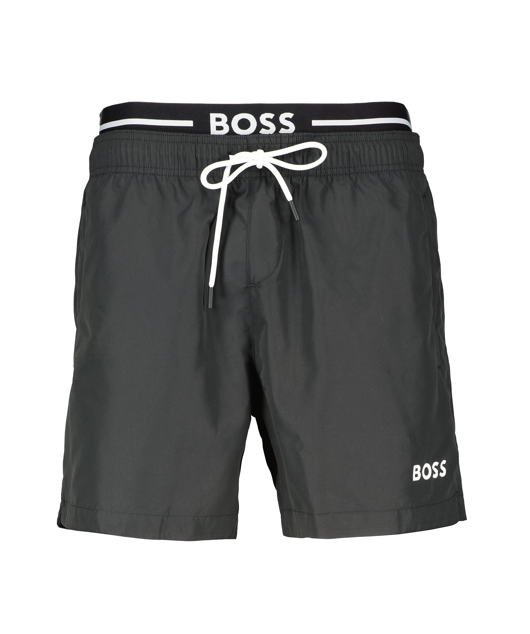 Svarta badshorts från BOSS Black. Logotyp i midjan samt på vänster ben. Två sidfickor samt en bakficka som stängs med resår. Elastisk midja med snörning. Normal passform.