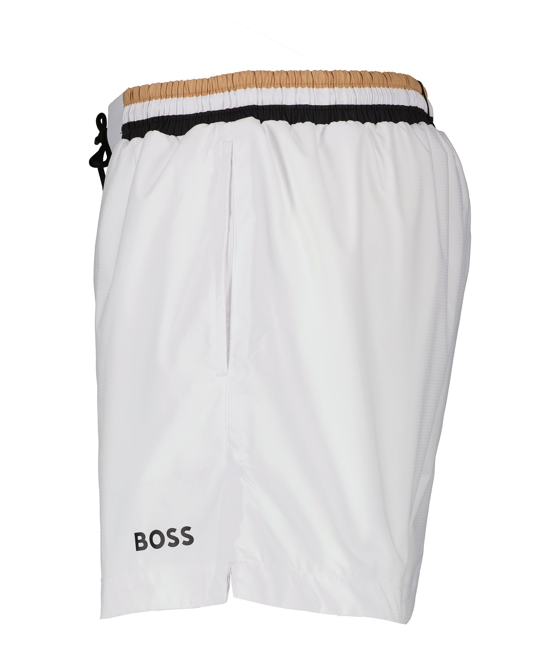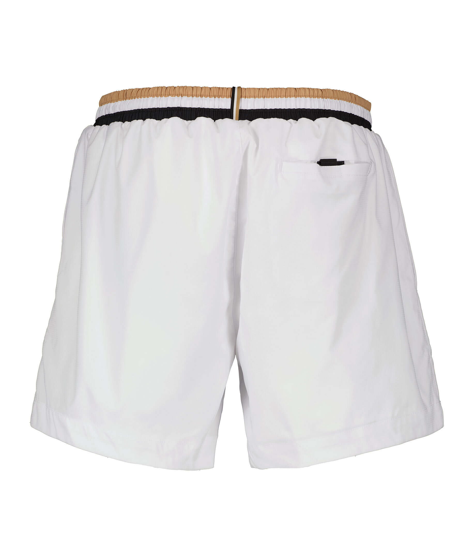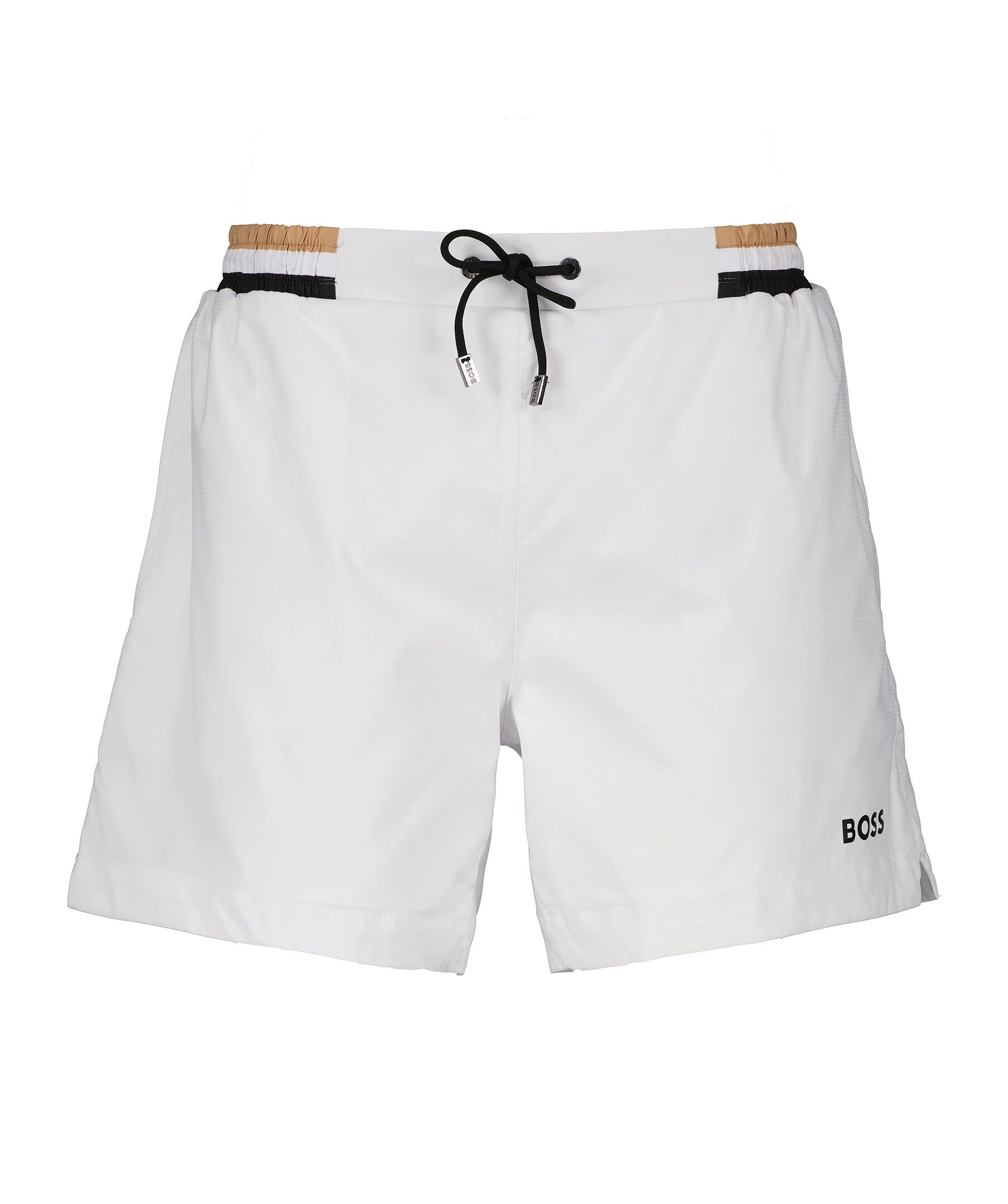 Vita badshorts från BOSS Black. Dragsko och beigea och svarta ränder i midjan. Tryckt logotyp på vänster lår. Två sidfickor samt en bakficka som stängs med resår. Tillverkade i 100% polyester.