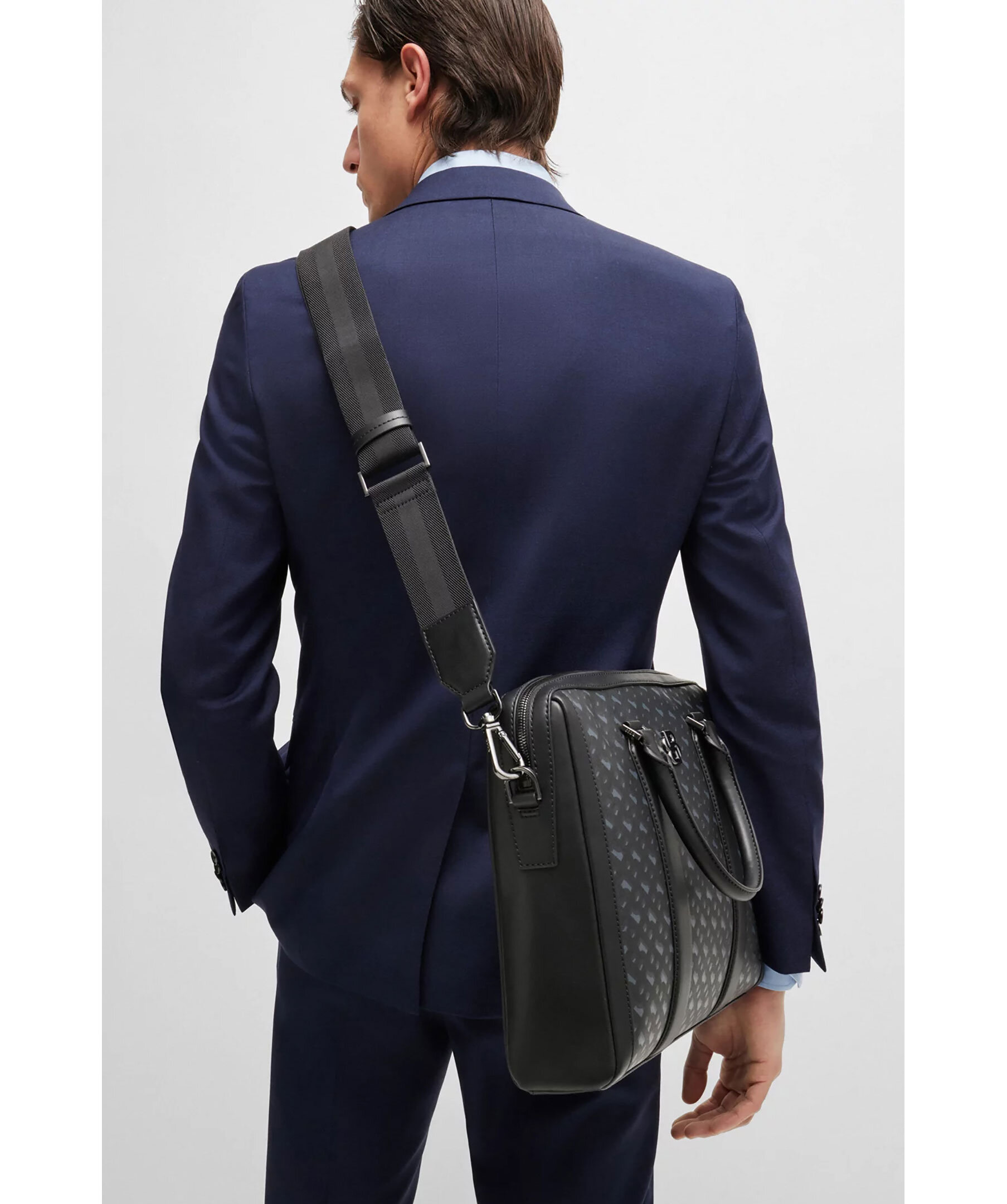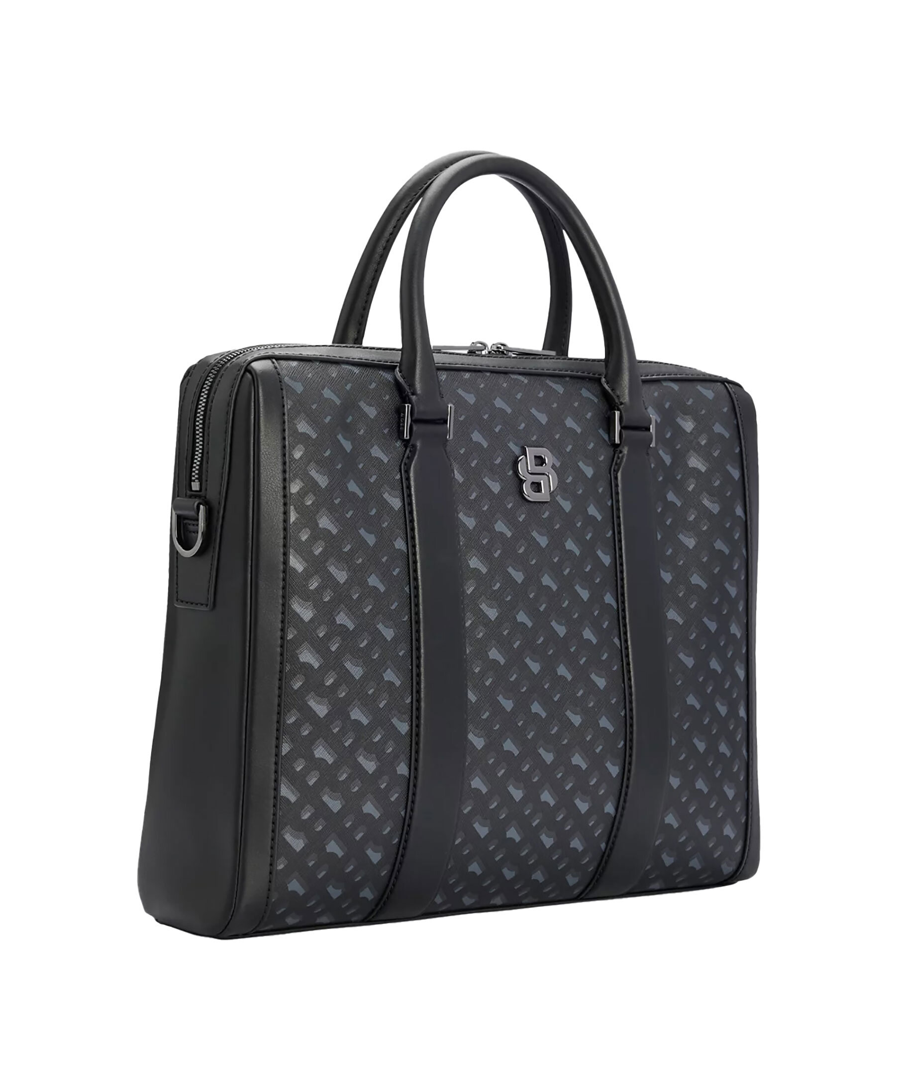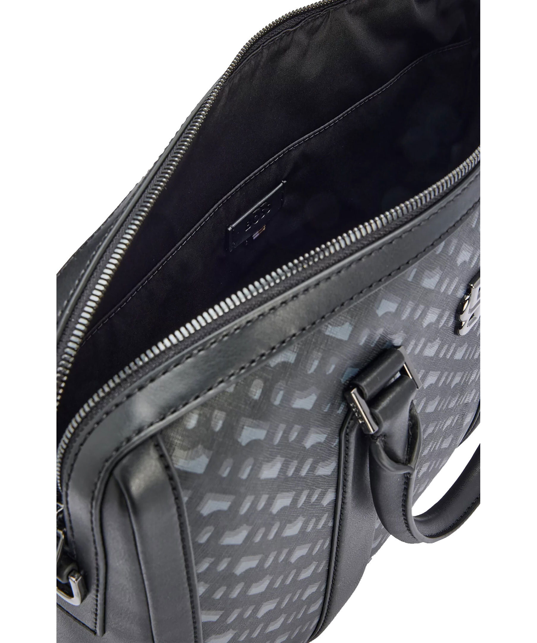 Svart datorväska från BOSS Black. Väskan har ett elegant monogrammönstrat material, avtagbar axelrem och Double B-detalj. Stängs med tvåvägsdragkedja och har dubbelhandtag. Tillverkad i läder. Mått: 28 x 36 x 6,5 cm.