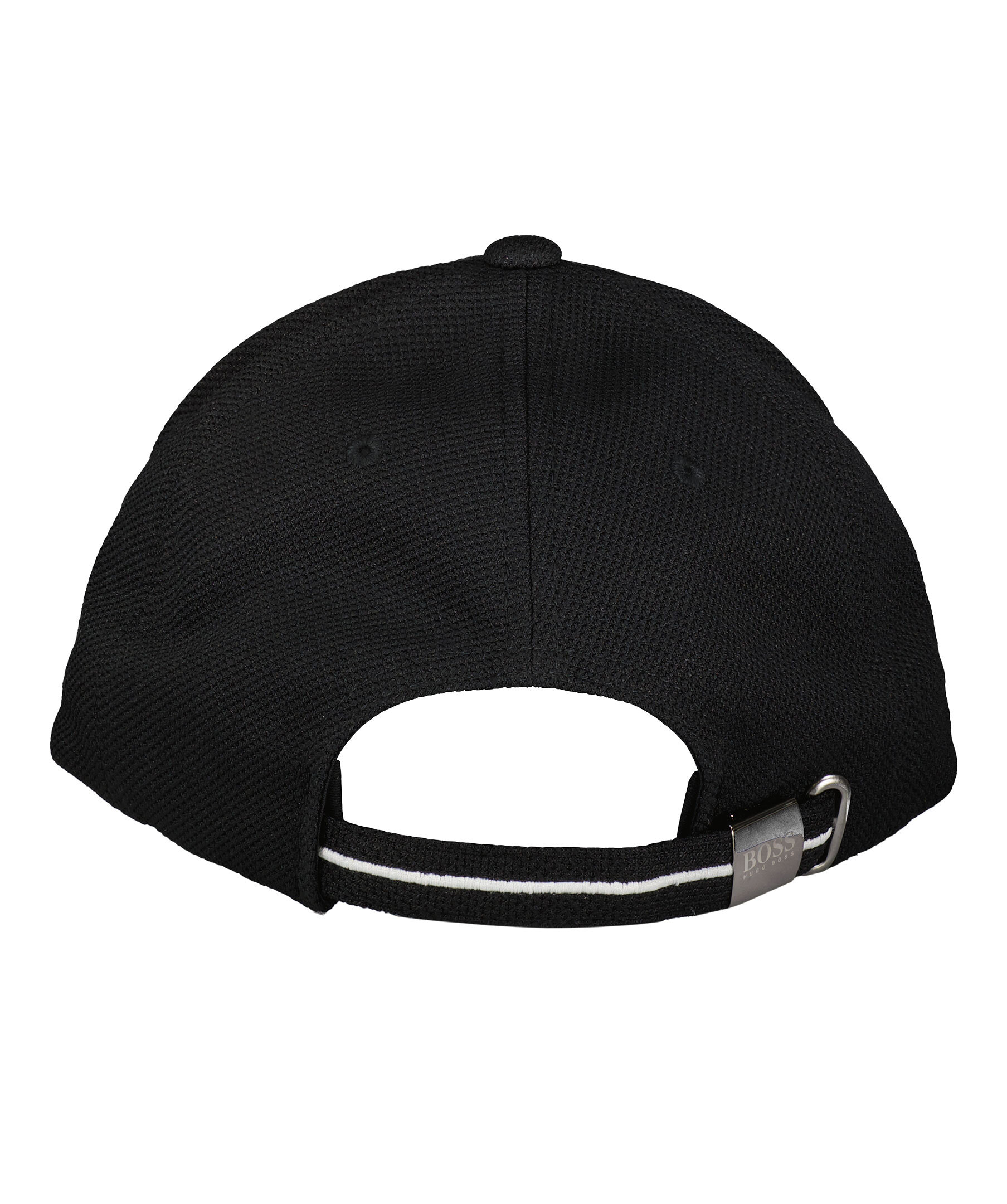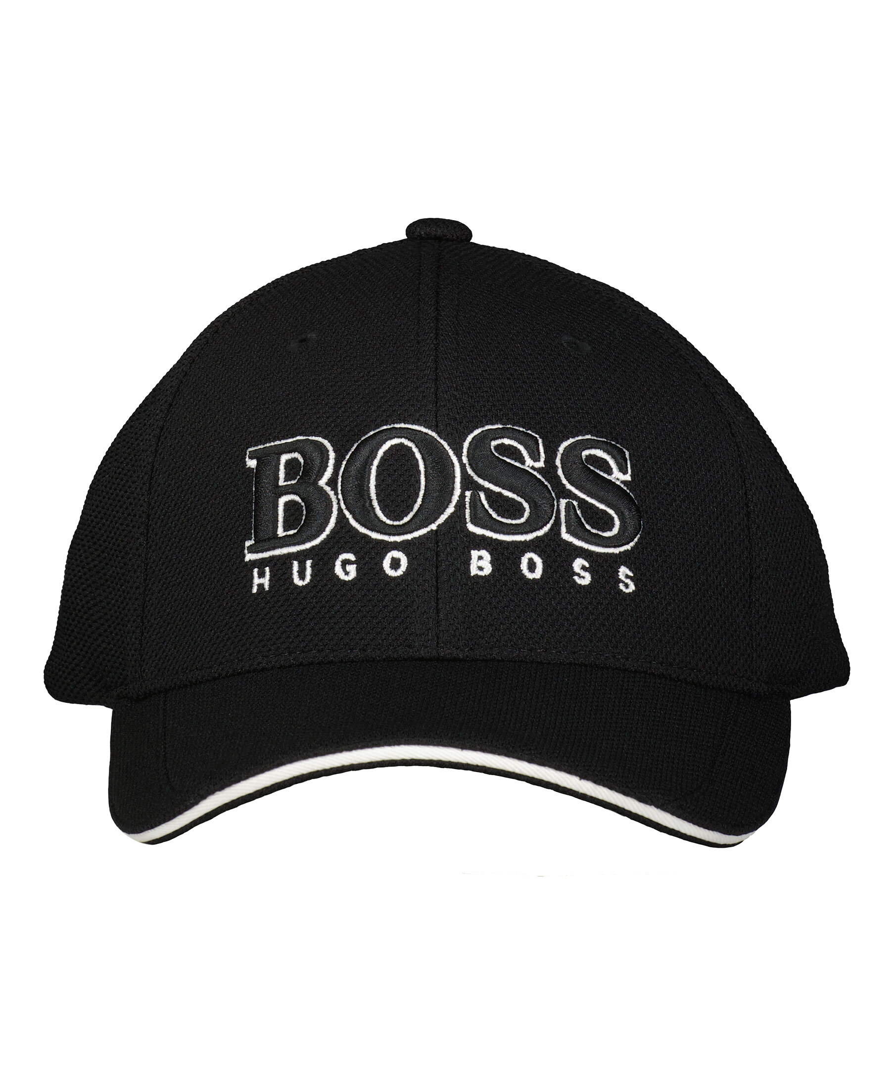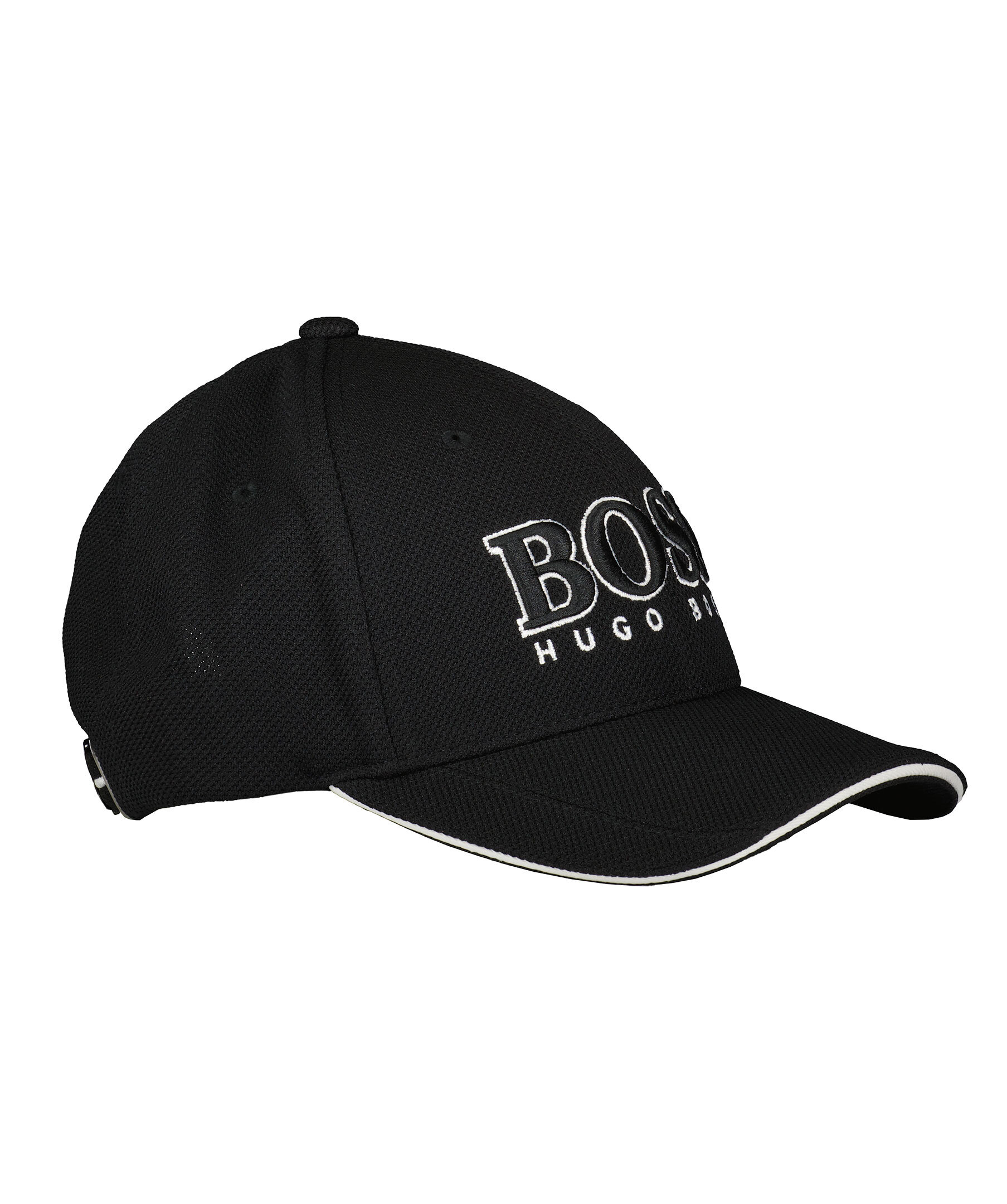 Svart keps från BOSS Green. Broderad logotyp fram som är svart med vita kanter. Hela kepsen är tillverkad i mesh i polyester och har ett justerbart spänne bak med en vit rand och en silverfärgad låsning med logotyp på. Böjd skärm med ett vitt sträck i mitten.