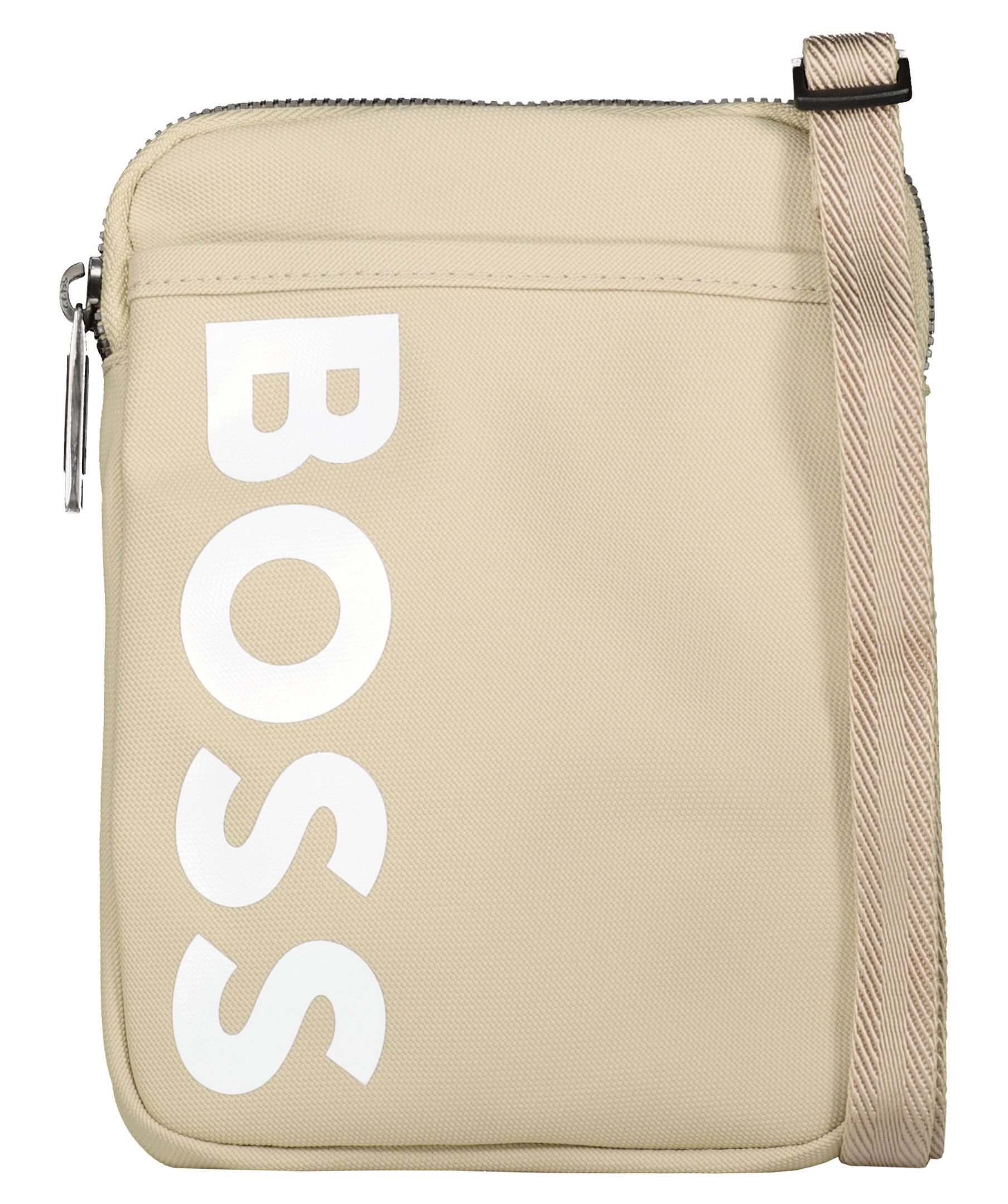 Beige liten väska från BOSS GREEN. Väskan är perfekt för att förvara telefonen, plånboken och nycklar. Öppen ficka framtill samt stor vit logotyp. Justerbar rem.