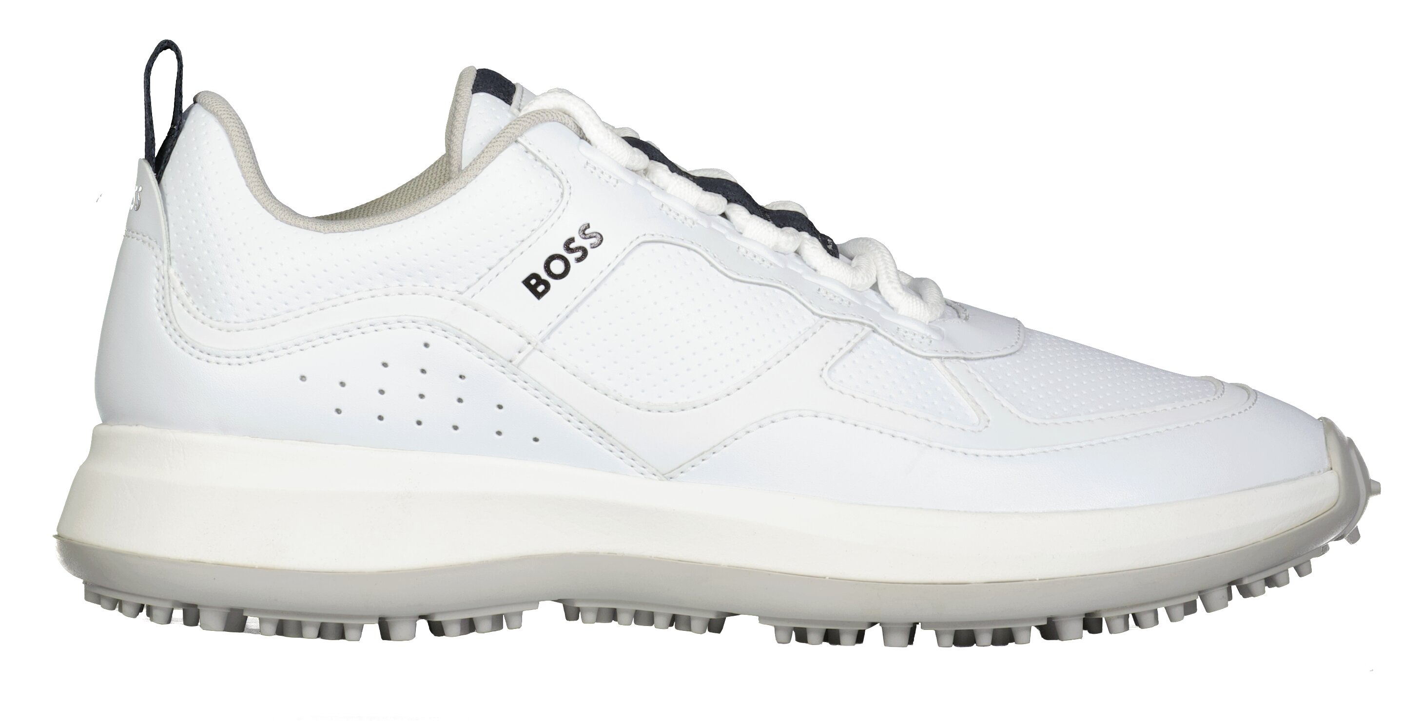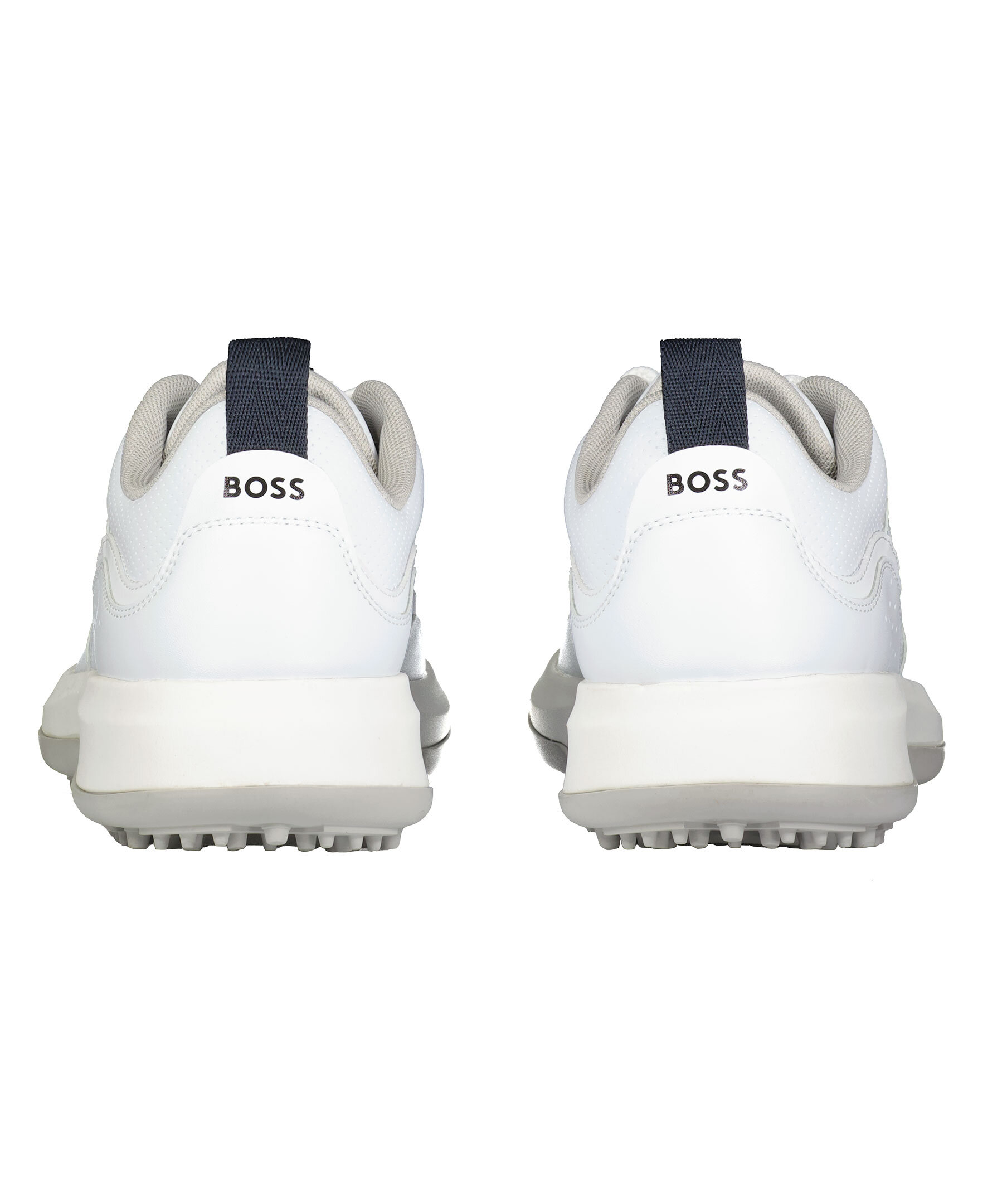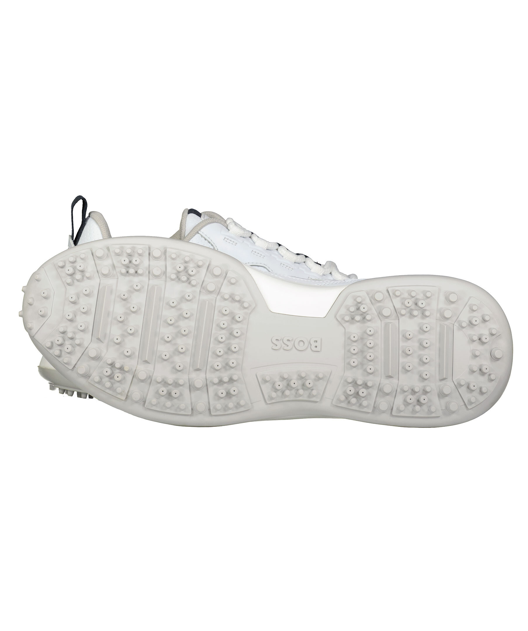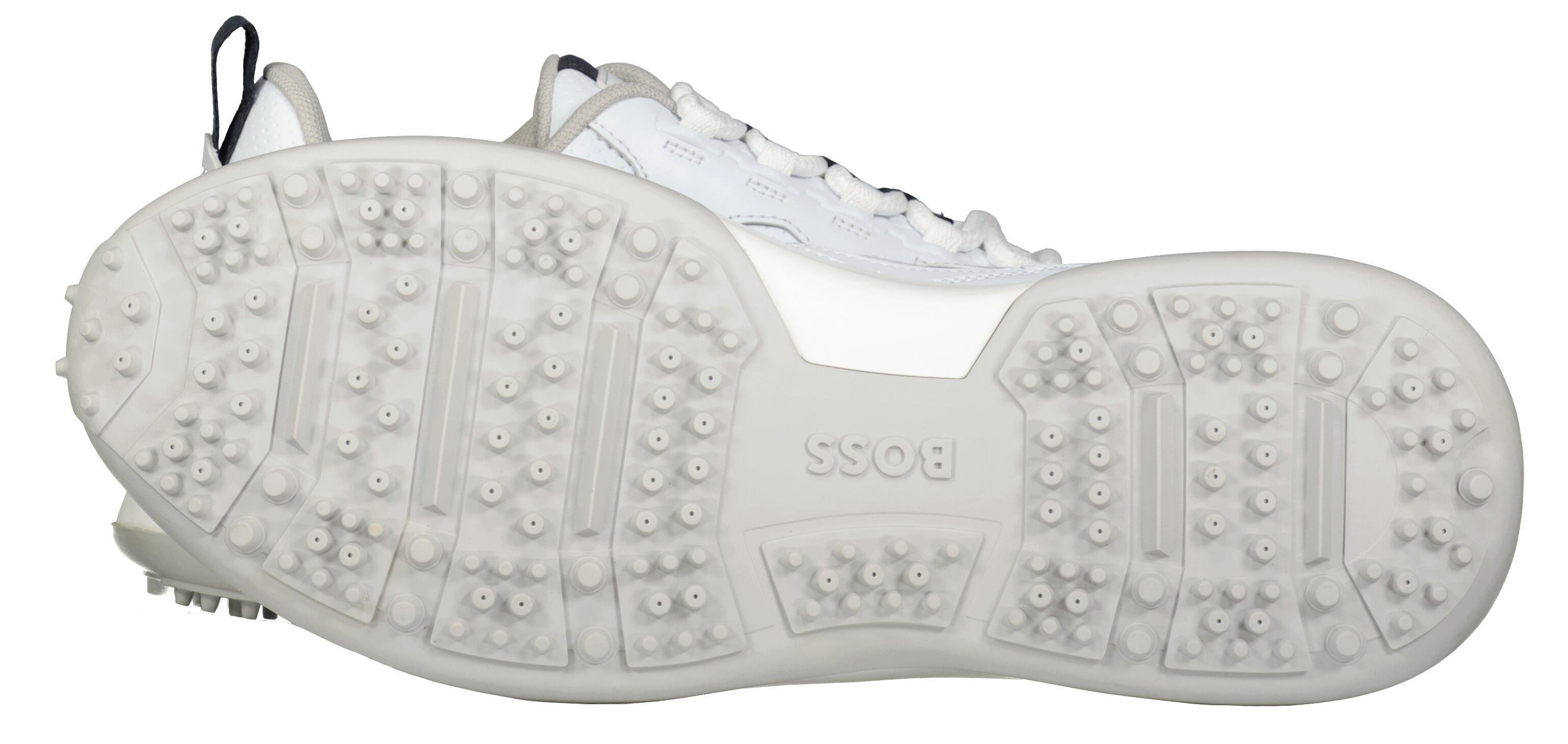 Vita golfskor i läder från BOSS Green. Runda skosnören. Embossad logotyp i svart på plösen och skons yttersida. Svart band på skons plös. Ögla på hälen i svart. Grå sula i gummi.