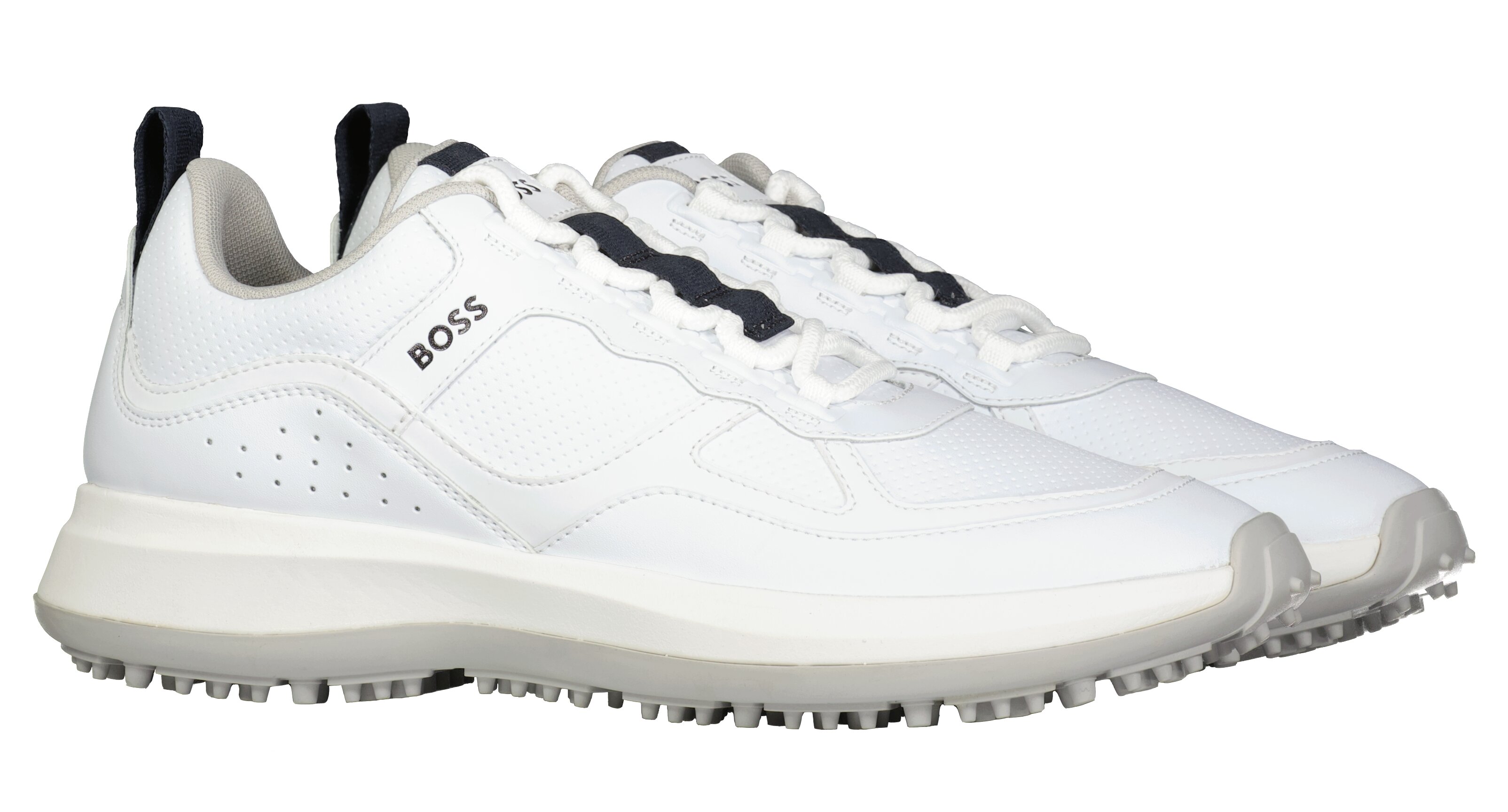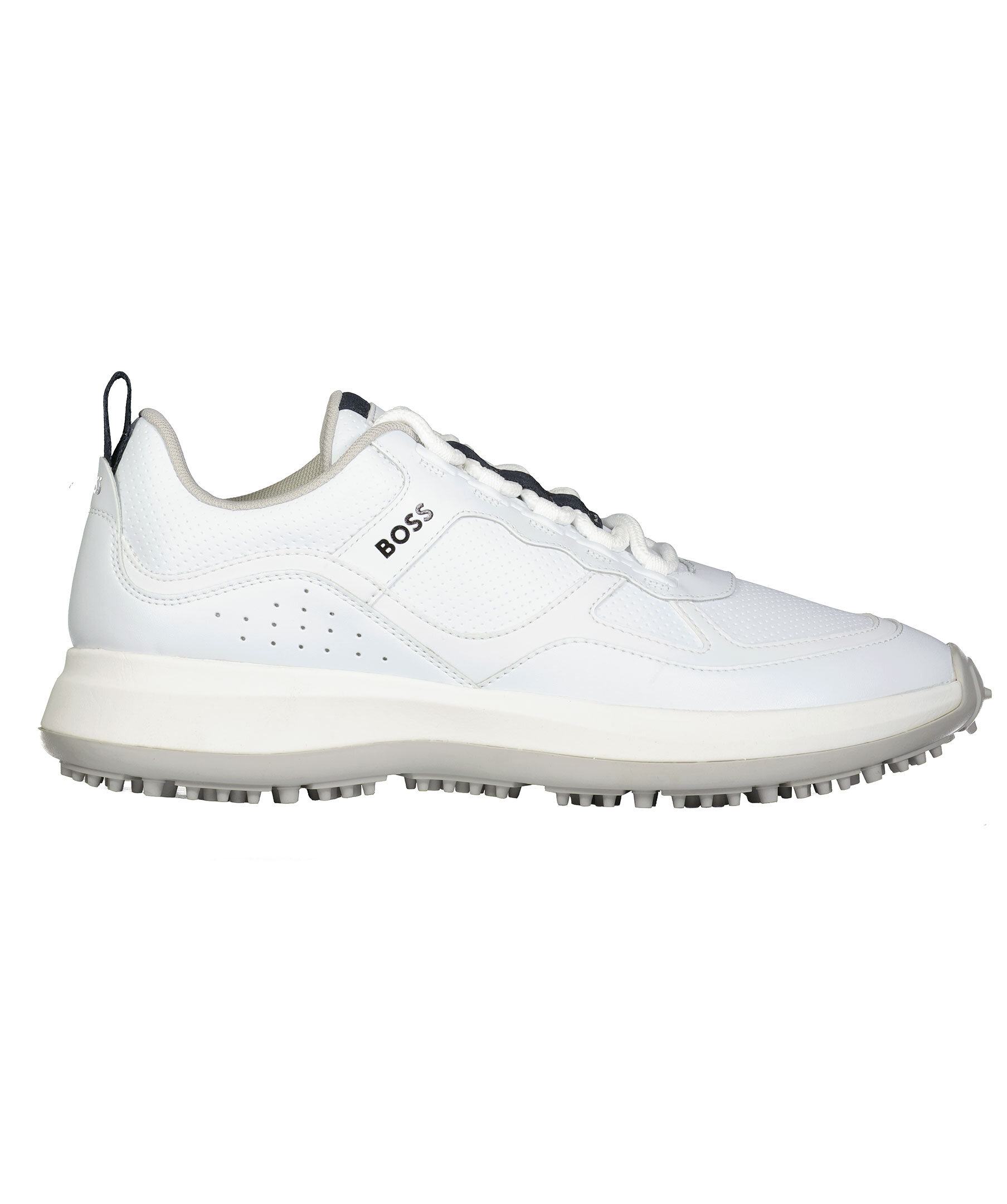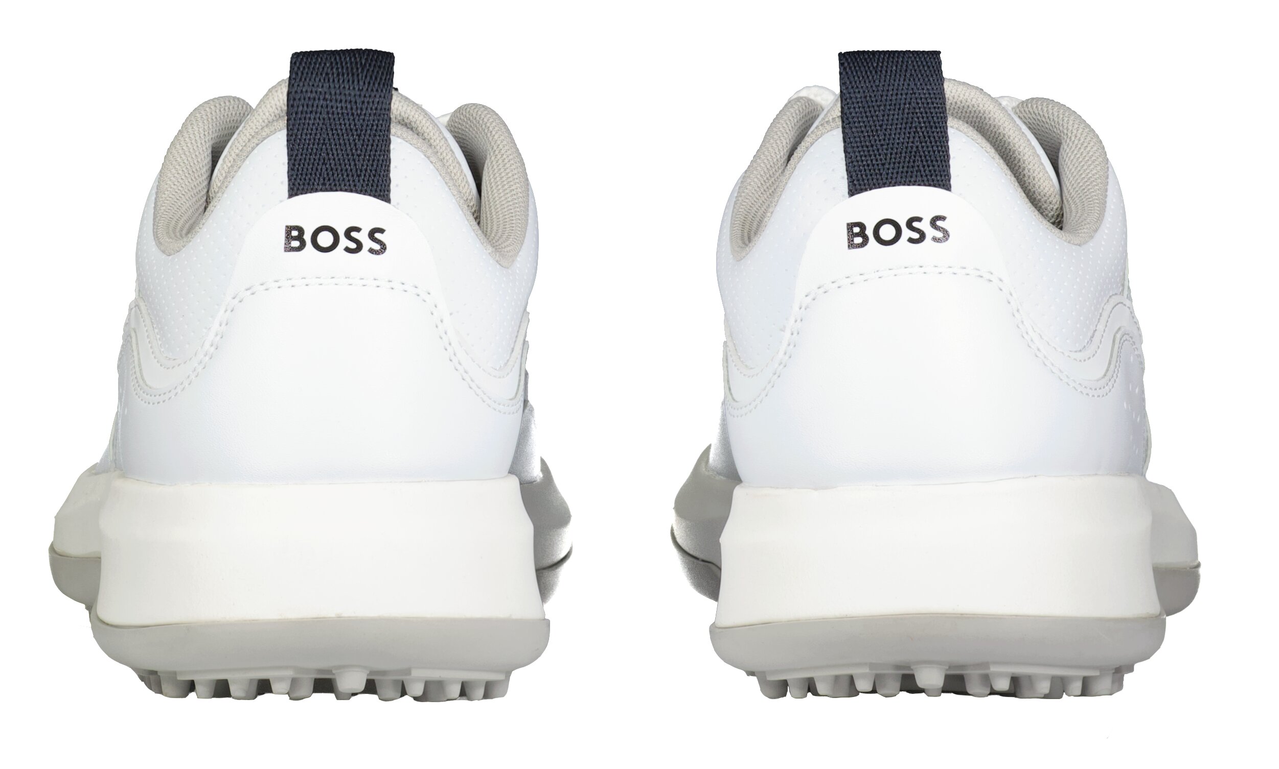 Vita golfskor i läder från BOSS Green. Runda skosnören. Embossad logotyp i svart på plösen och skons yttersida. Svart band på skons plös. Ögla på hälen i svart. Grå sula i gummi.