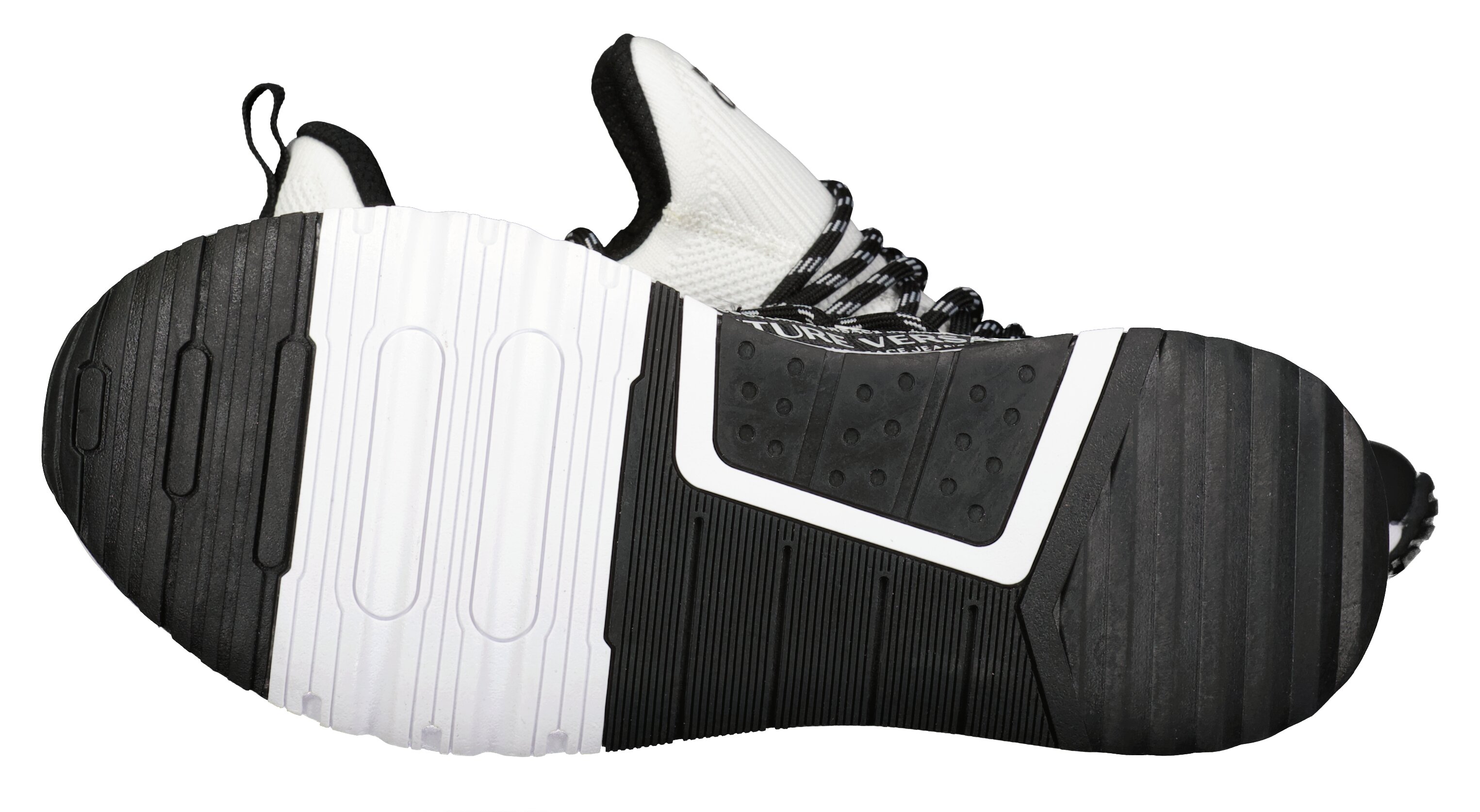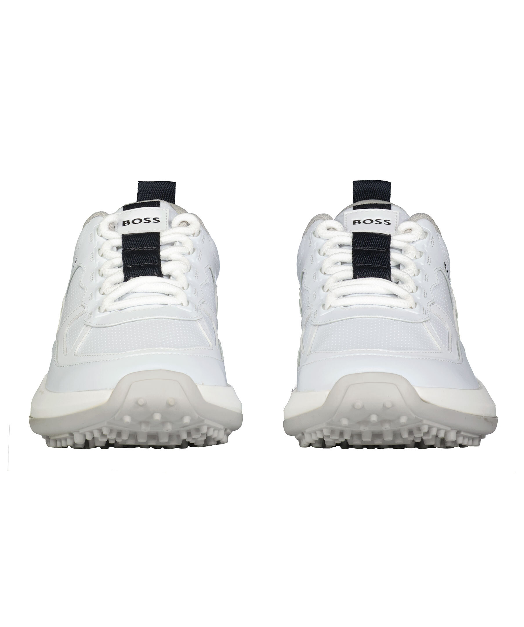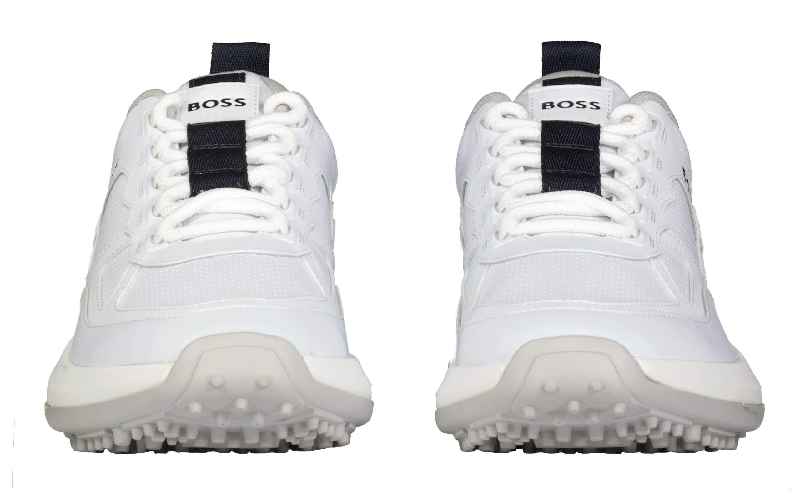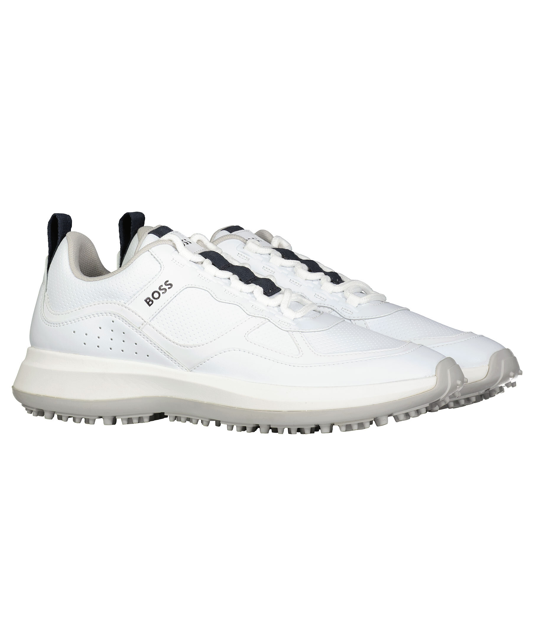 Vita golfskor i läder från BOSS Green. Runda skosnören. Embossad logotyp i svart på plösen och skons yttersida. Svart band på skons plös. Ögla på hälen i svart. Grå sula i gummi.