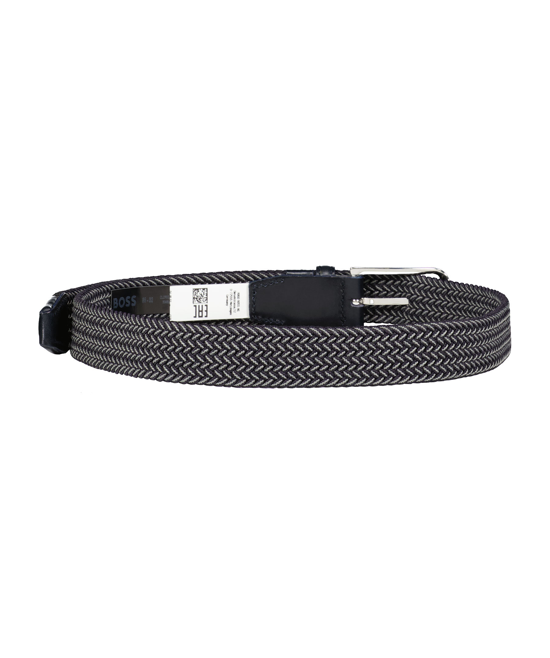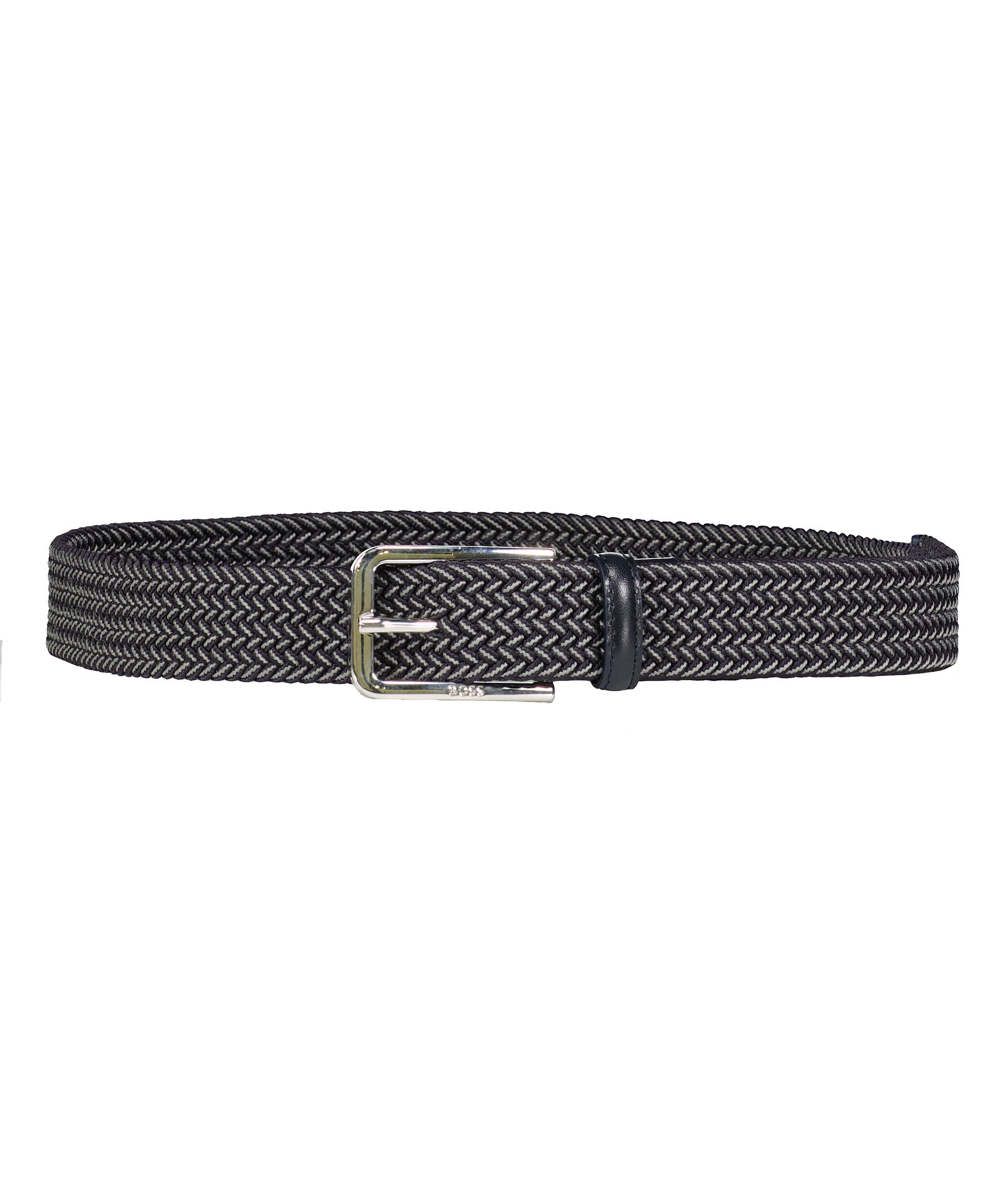 Flätat elegant bälte i svart och mörkgrått från BOSS. Polerat stiftspänne med ingraverad logotyp i en silverton, detta 3 cm bälte är tillverkat i vävd resår och kantad med läderdetaljer. För bästa passform rekommenderar vi att du beställer en storlek större än din midjestorlek.
