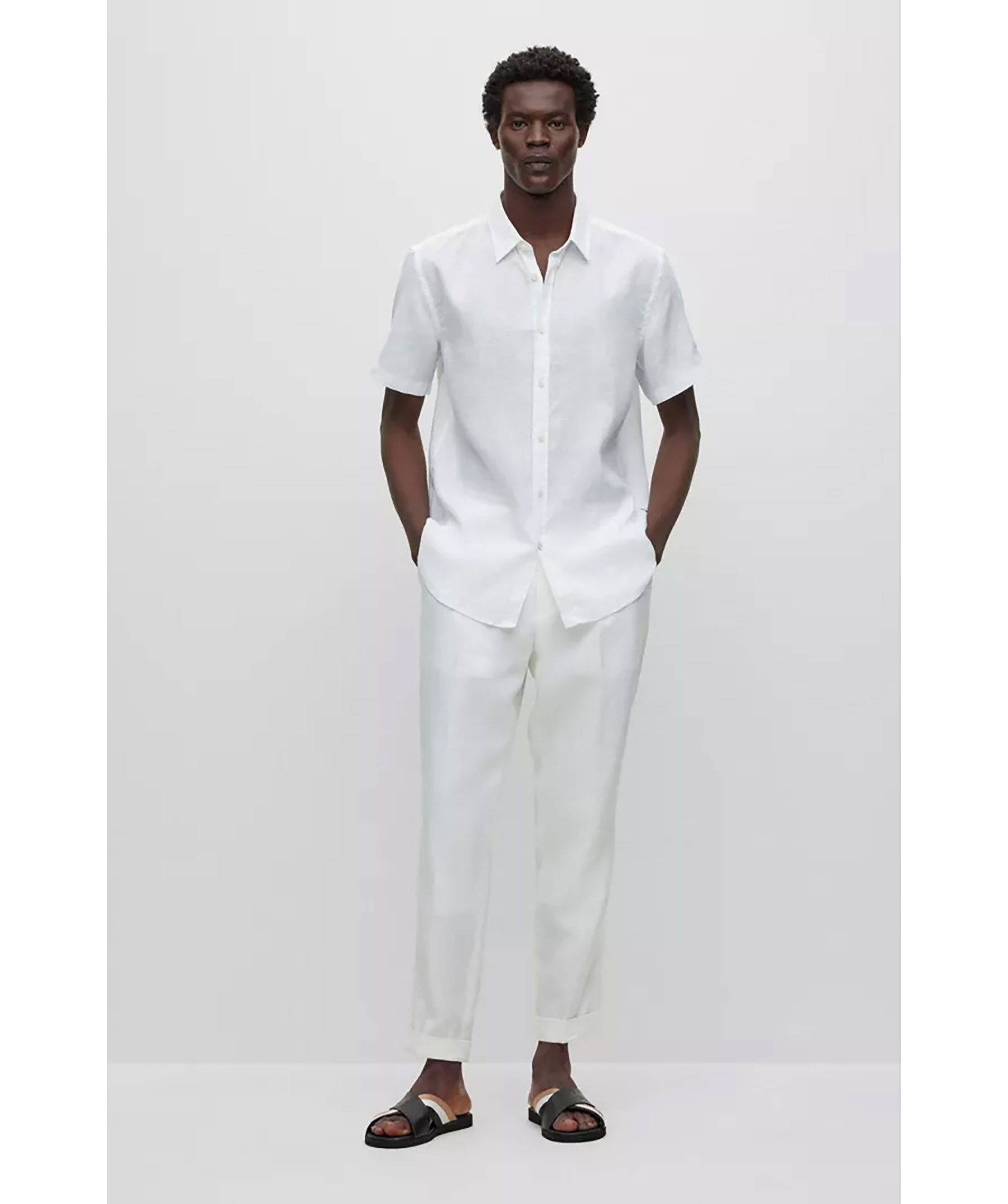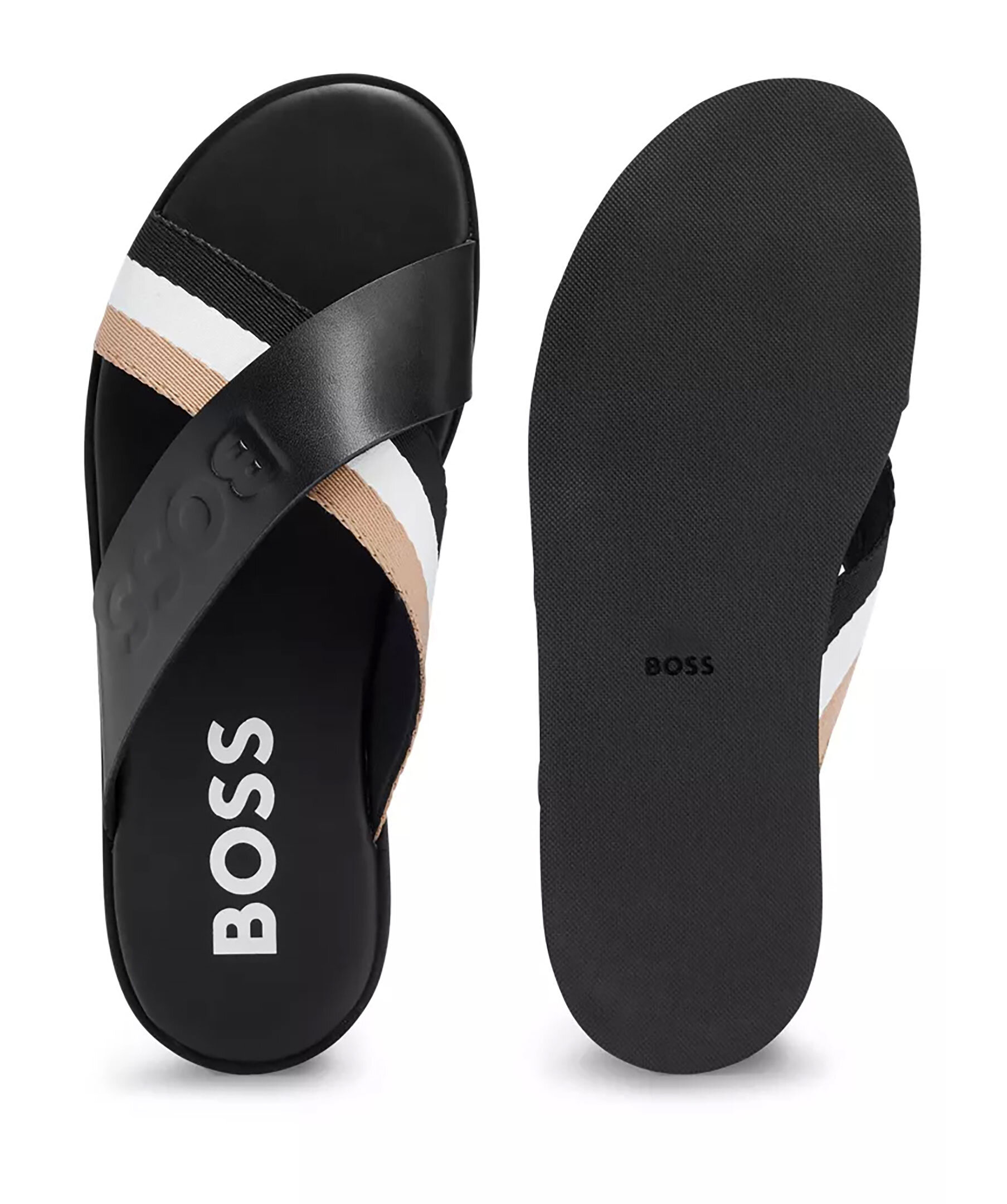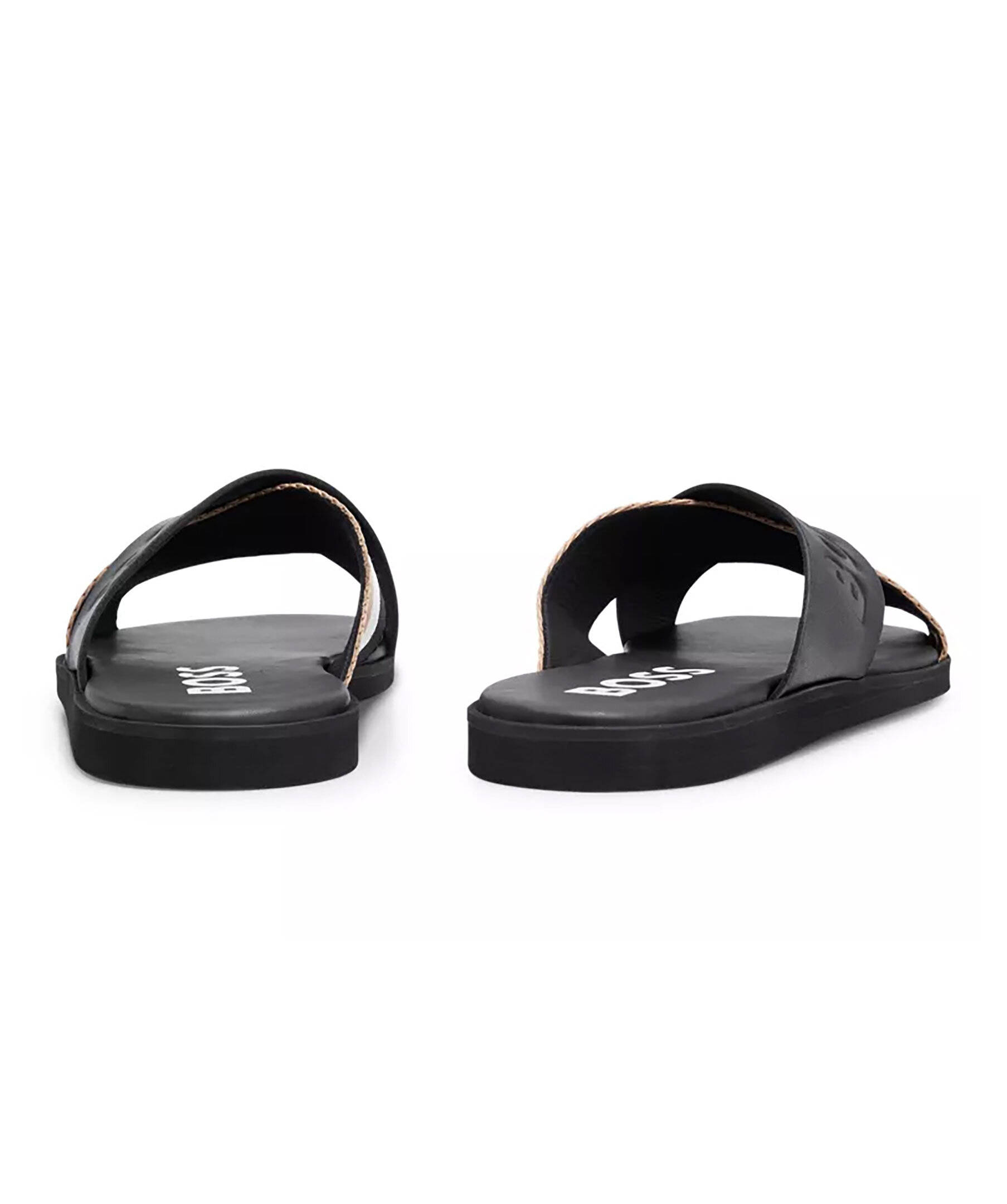 Svarta sandaler i slip in modell från BOSS Green. En läderrem och en trefärgad. Logotyp på läderremmen och sulan. Innersula i skinn.