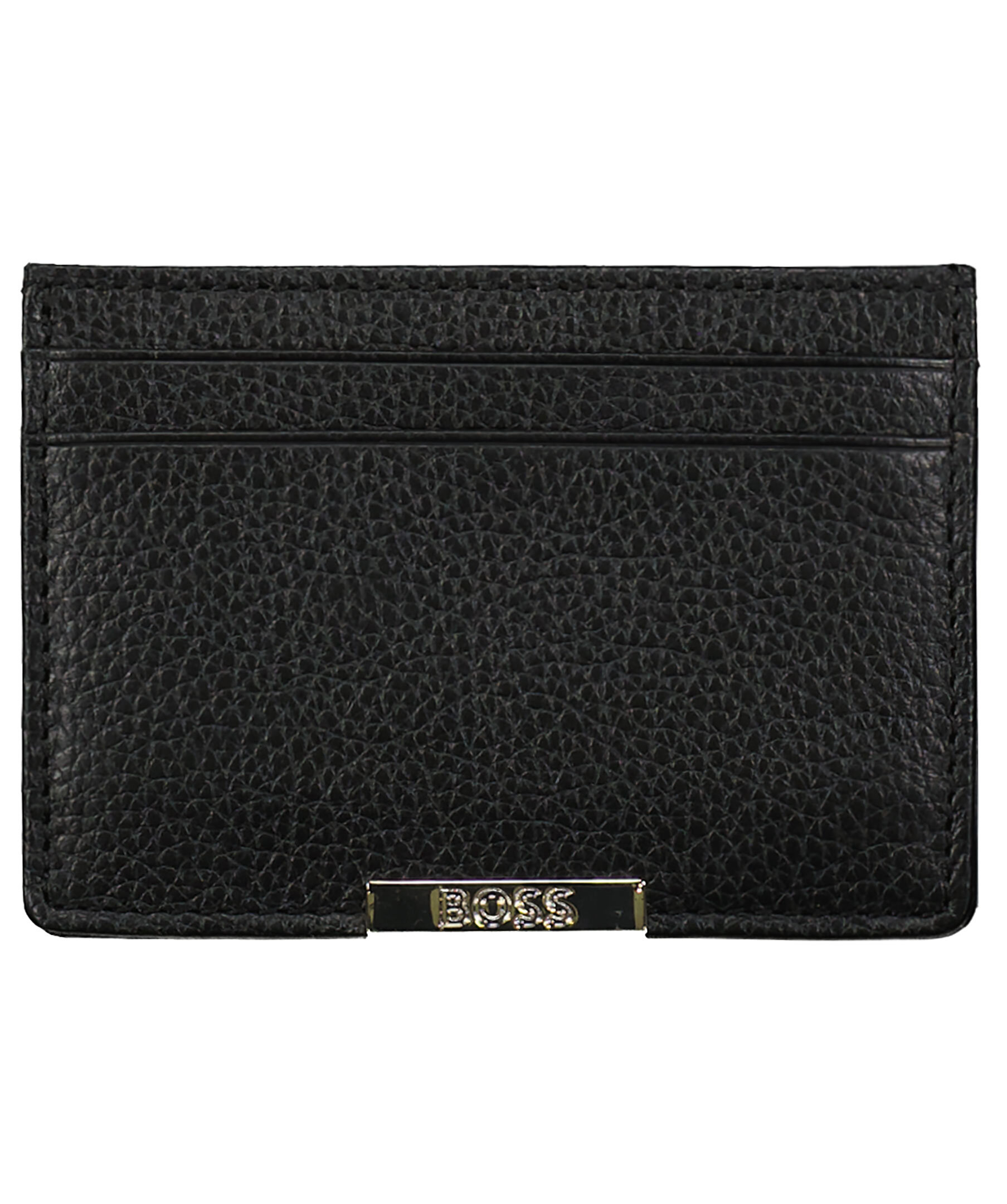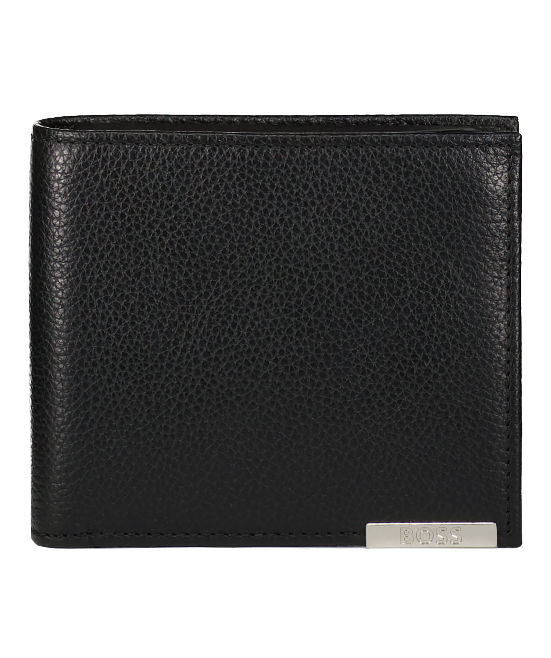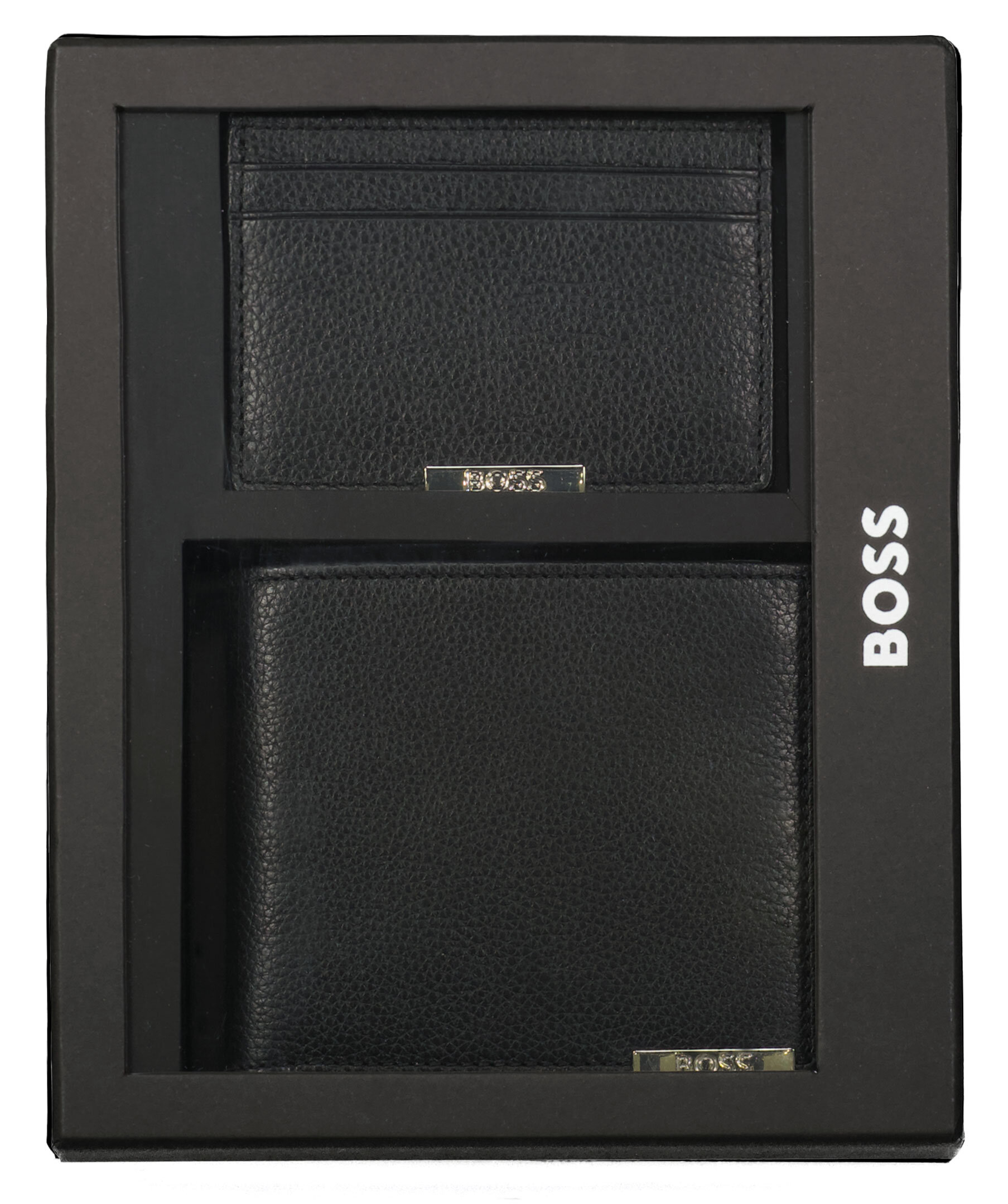 Svart kit med plånbok och korthållare från BOSS Green. Tillverkad i läder med en embossad metall bricka med logotyp. Korthållaren har två fack på vardera sida. Plånboken har fyra fack på vardera sida, samt ett huvudfack för sedlar.