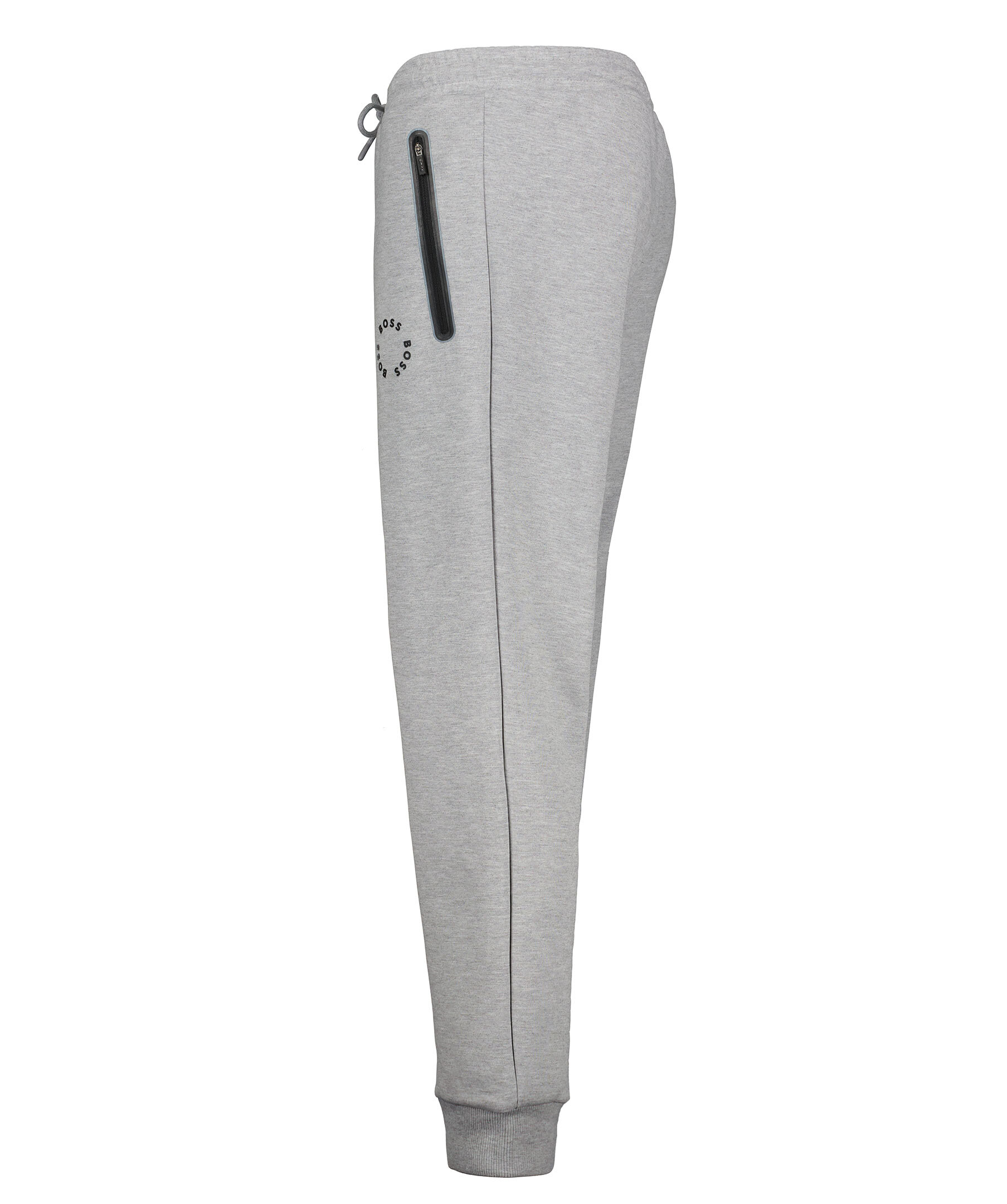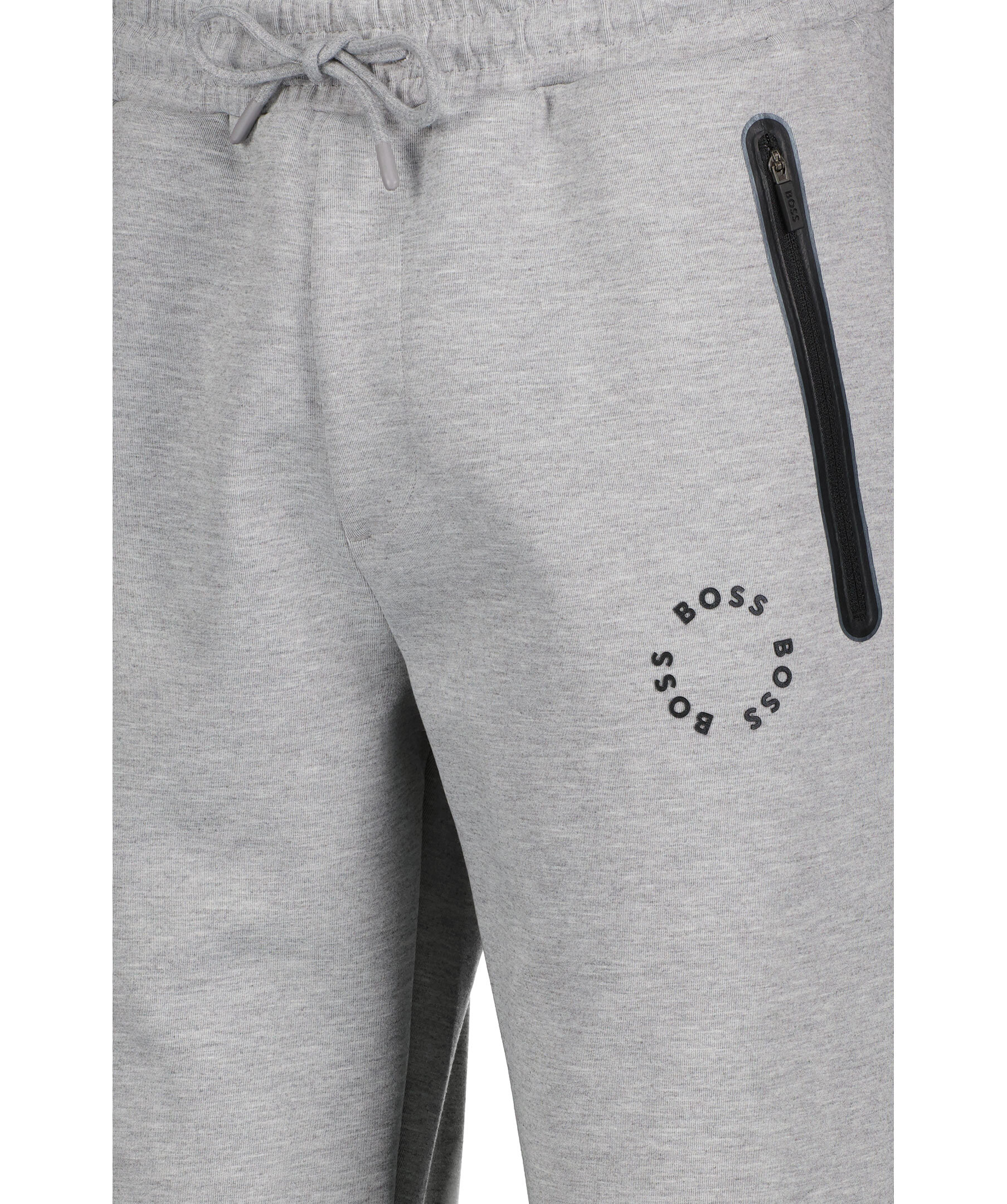Gråmelerade mjukisbyxor från BOSS Green. Avslappnad passform, dragsko i midjan, två fickor framtill som stängs med dragkedja och en passpoalficka baktill. Ribbstickade muddar vid benslut. Gummerad logotyp på vänster lår.
