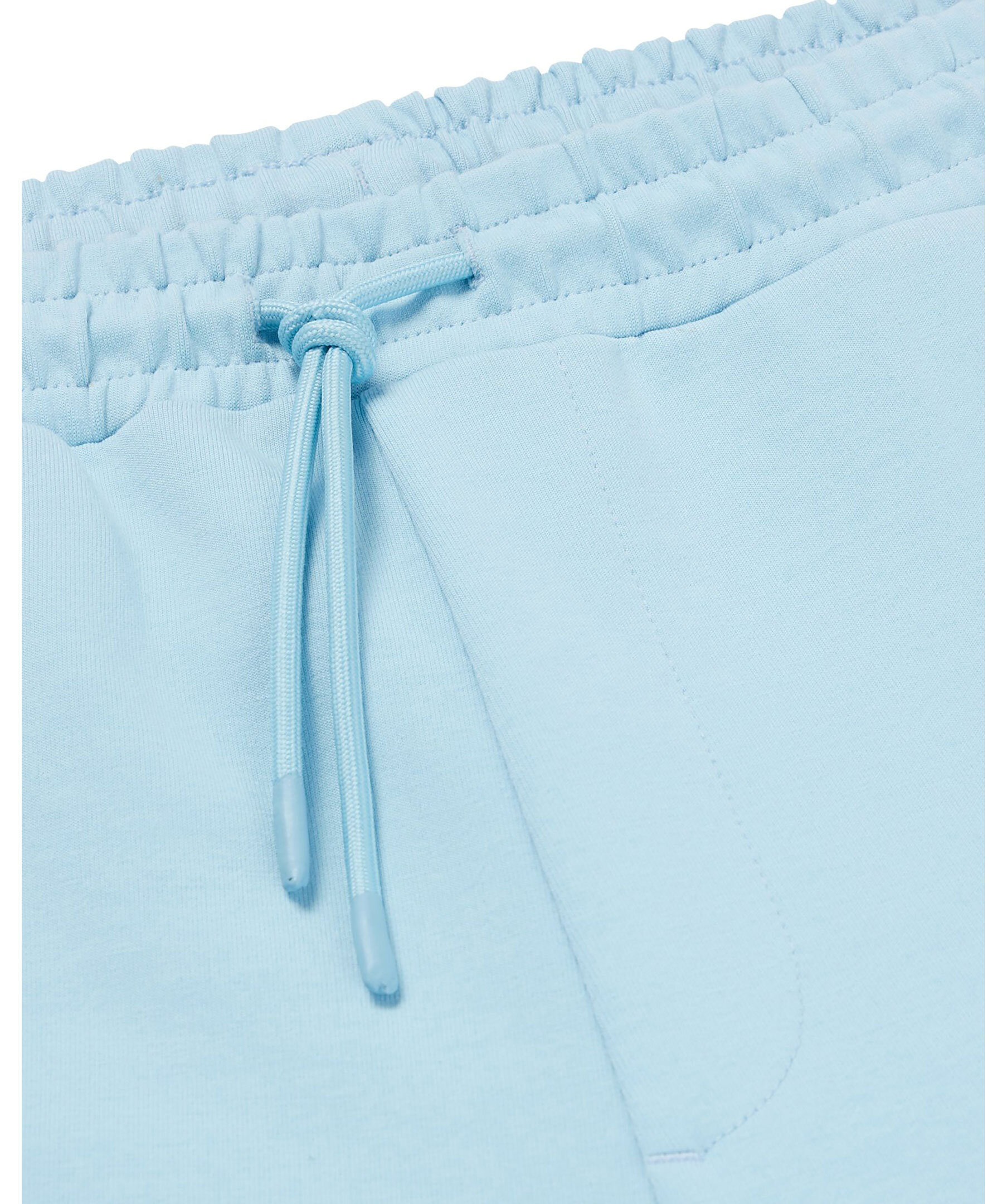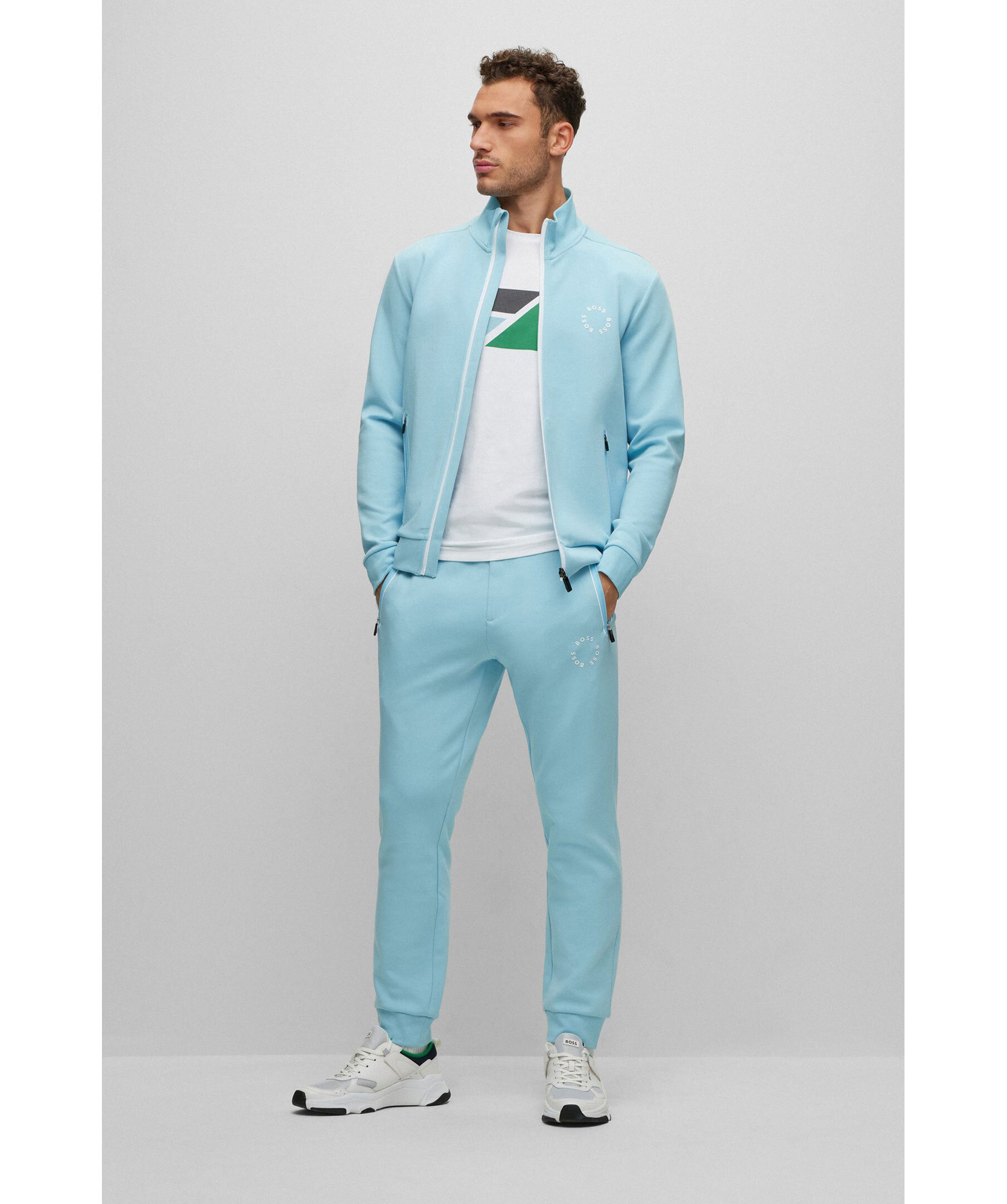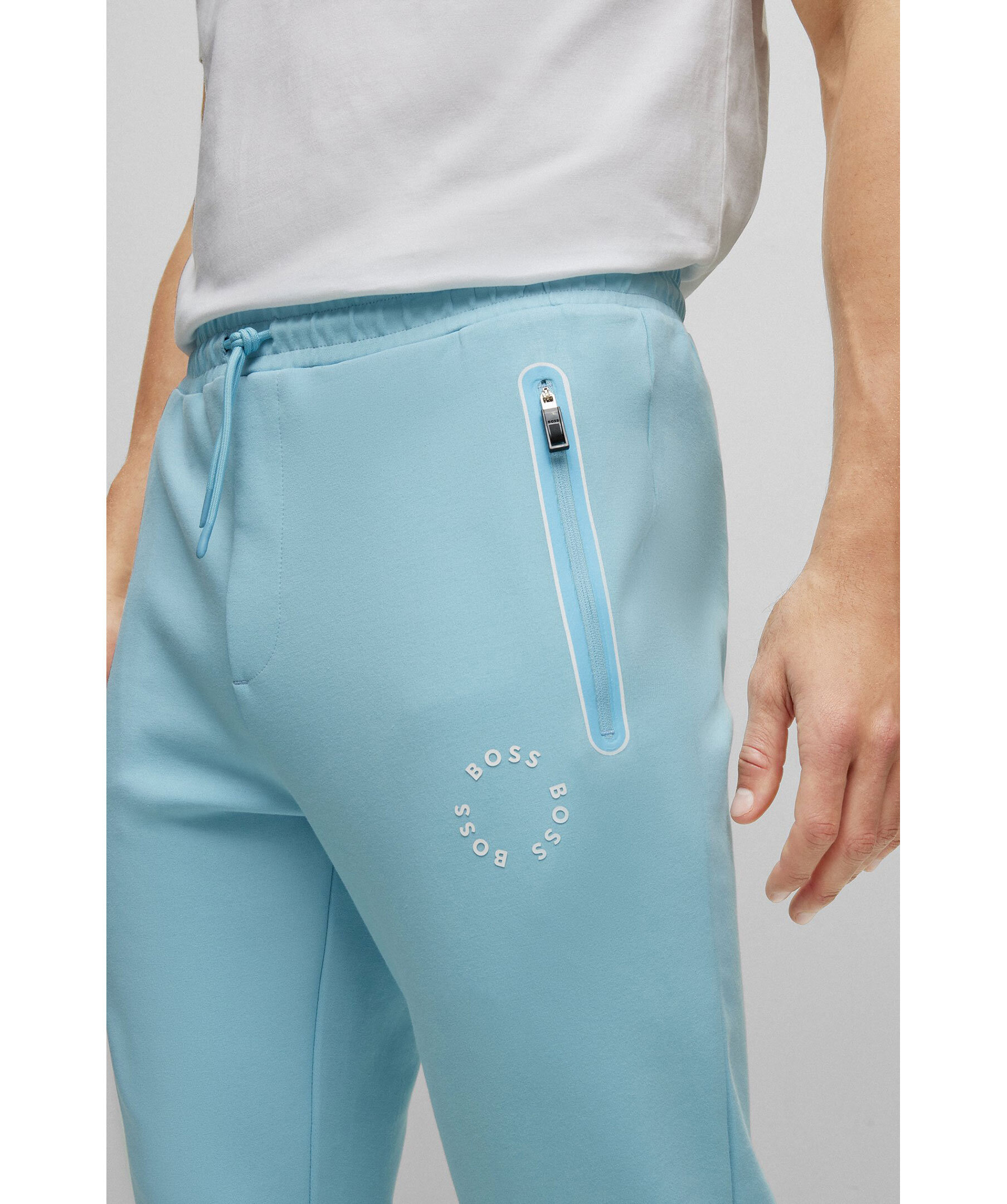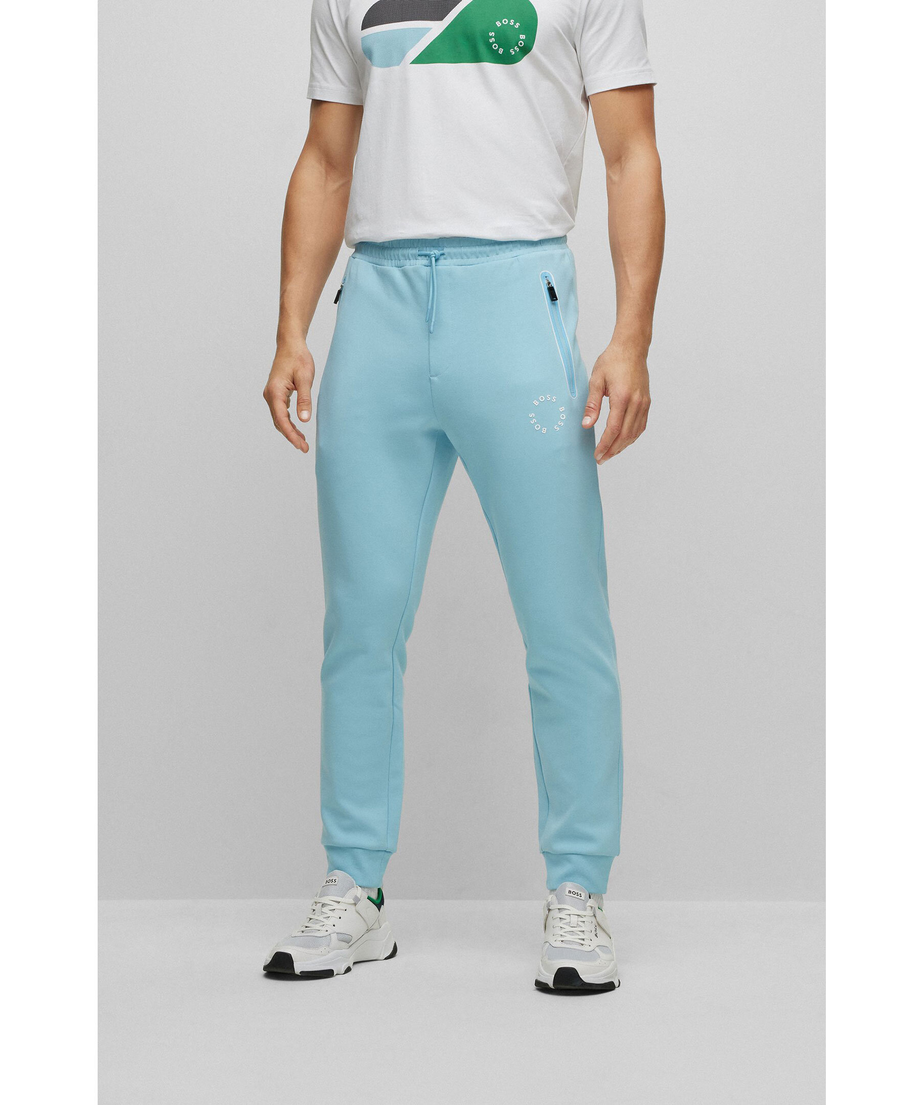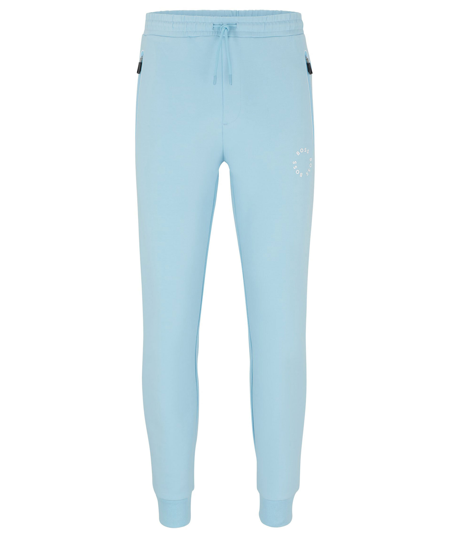 Ljusblåa mjukisbyxor från BOSS Green. Avslappnad passform, dragsko i midjan, två fickor framtill som stängs med dragkedja och en passpoalficka baktill. Ribbstickade muddar vid benslut. Gummerad logotyp på vänster lår.