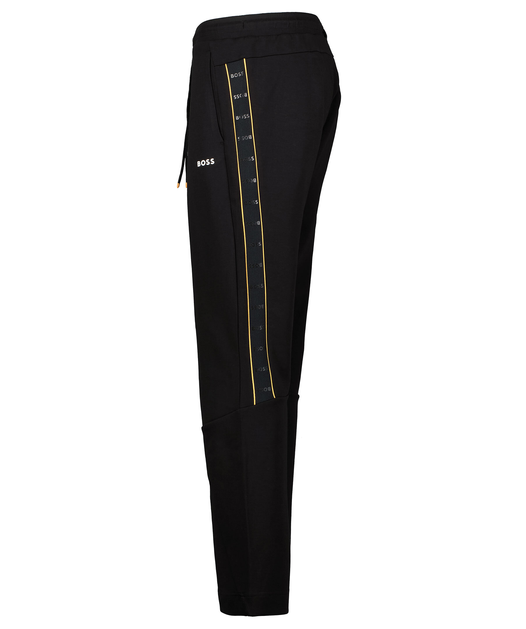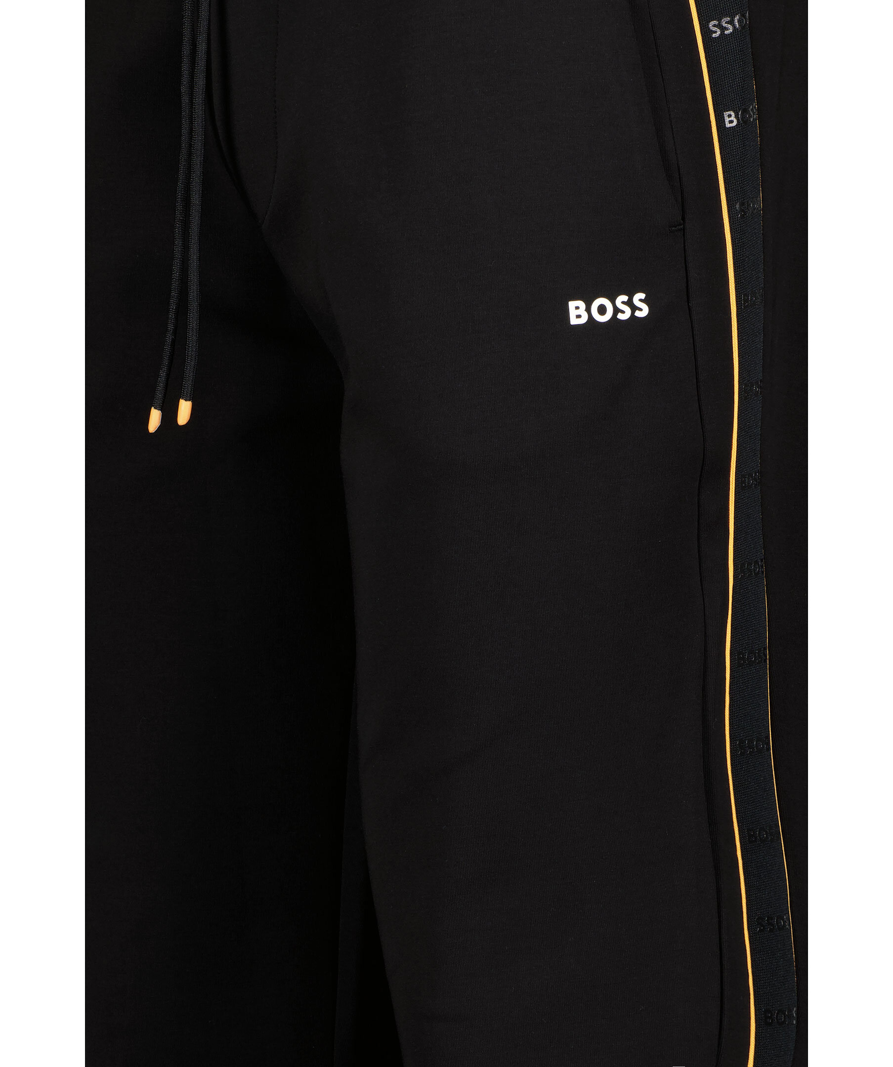 Svarta mjukisbyxor från BOSS Green. Byxorna är gjorda i ett stretchigt bomullstyg. Normal passform, revär med blanka logotyper i svart, dragsko i midjan och två framfickor en en bakficka. Muddar vid benslut.