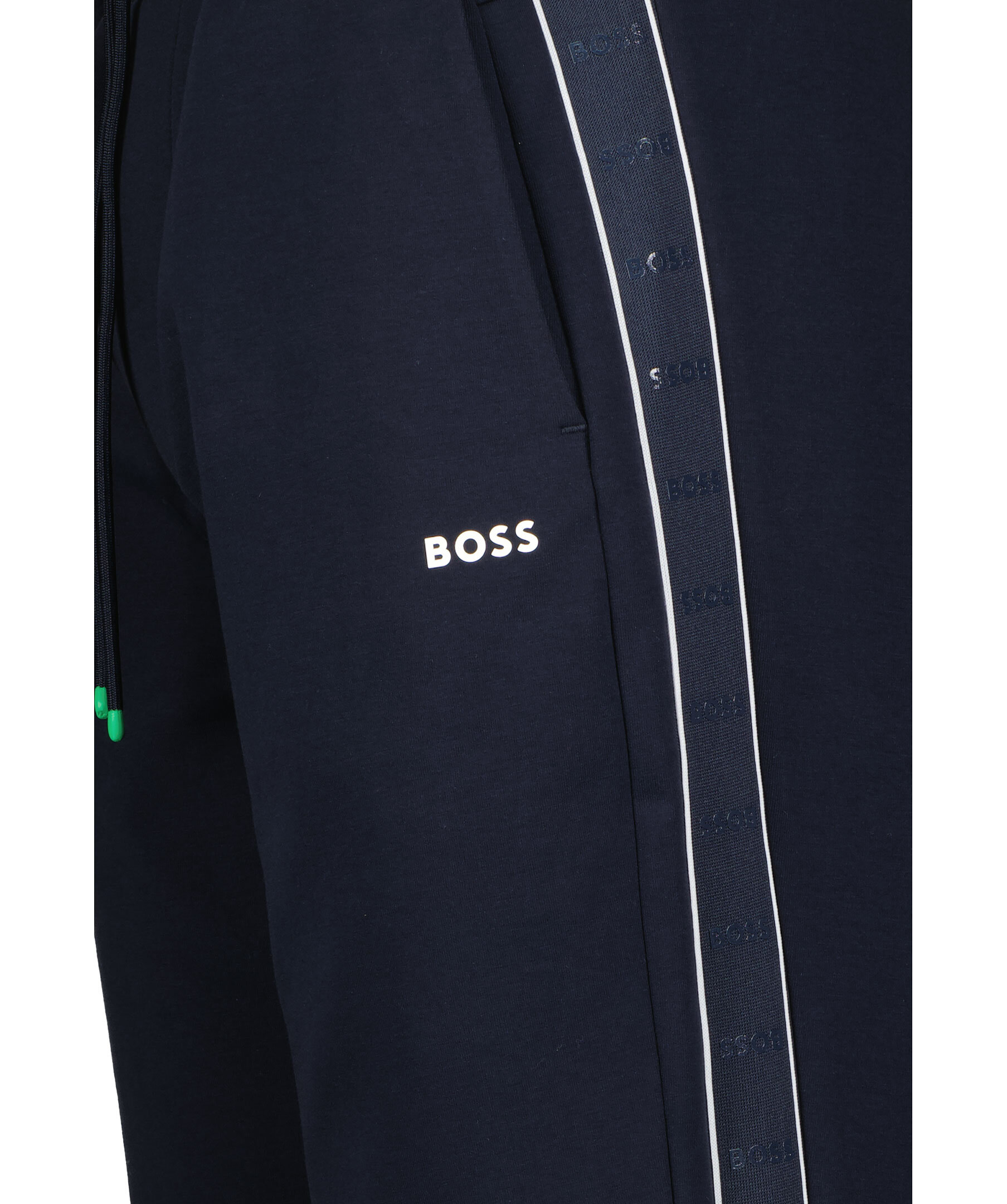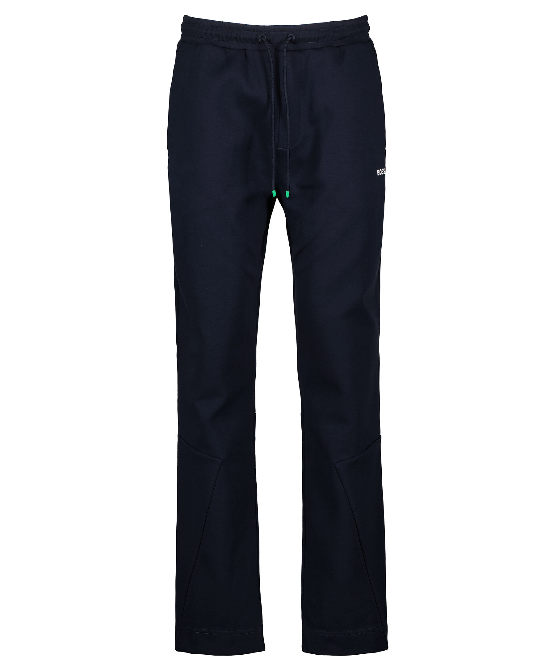 Marinblå mjukisbyxor från BOSS Green. Byxorna är gjorda i ett stretchigt bomullstyg. Normal passform, revär med blanka logotyper i blått, dragsko i midjan och två framfickor en en bakficka. Muddar vid benslut.