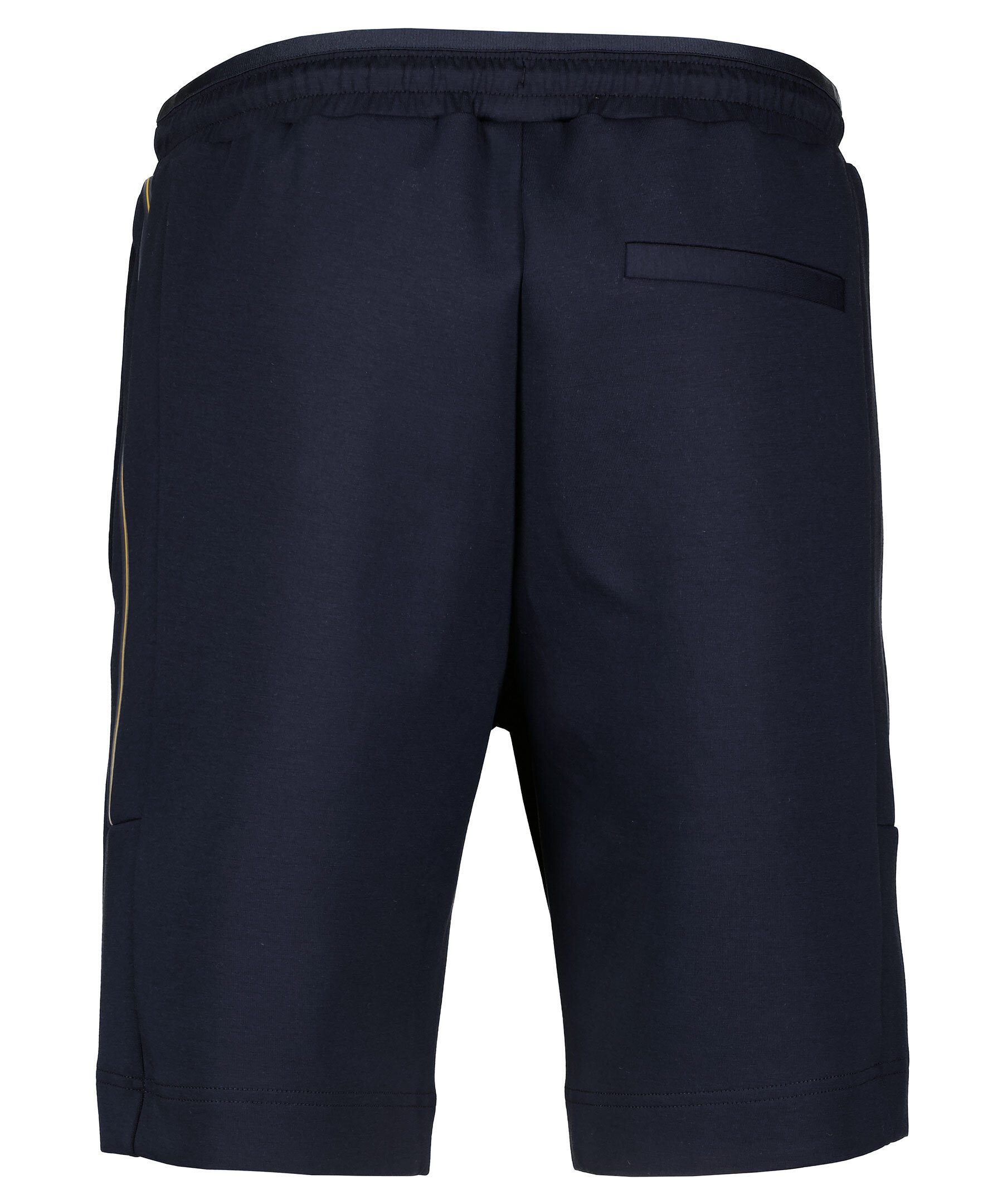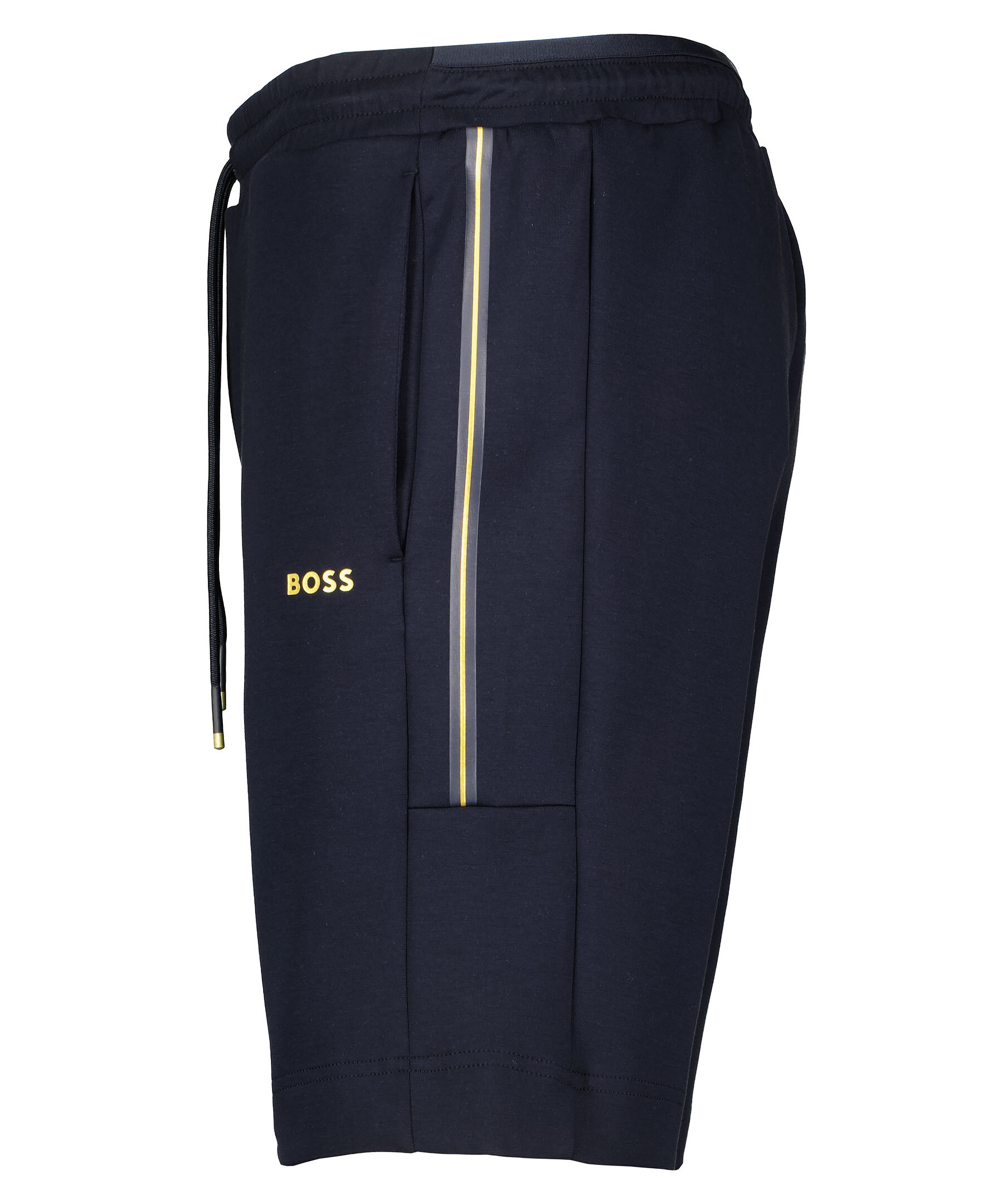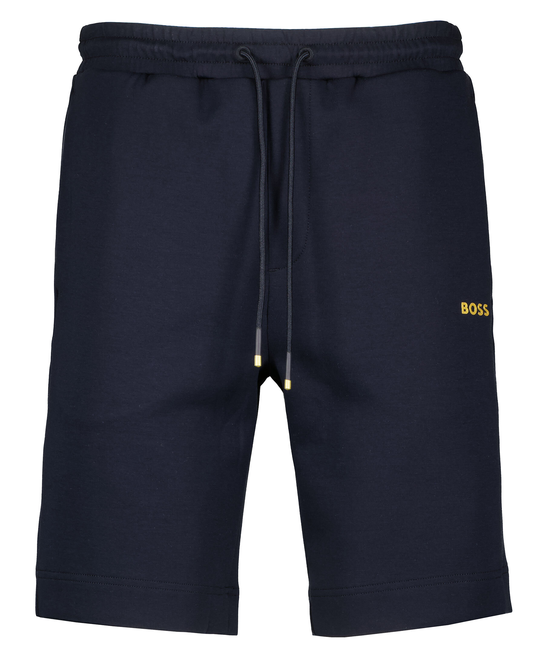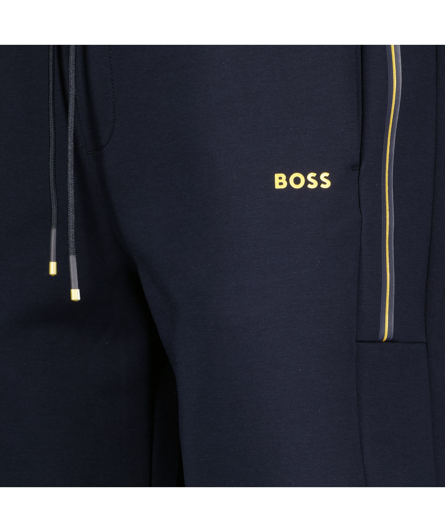 Marinblåa mjukisshorts från BOSS Green. Dragsko med snörning i midjan. Marinblåa, tryckta revärer med guldfärgad rand i mitten i sidorna och fickor i sidan samt en bakficka. Gummerad logotyp på vänster lår.